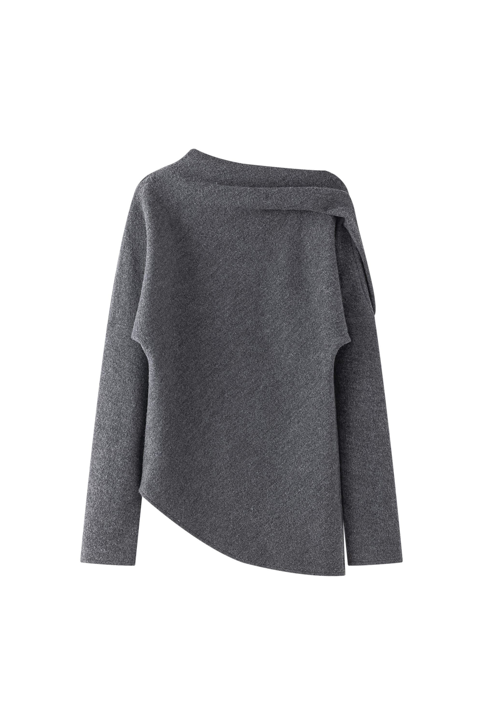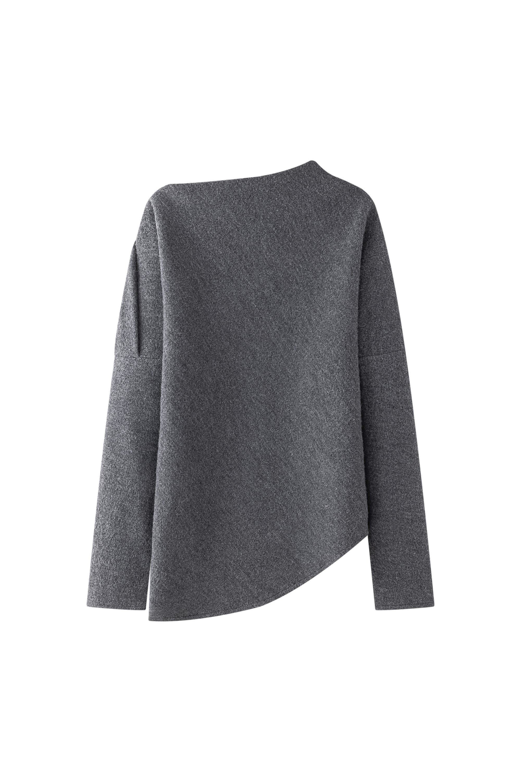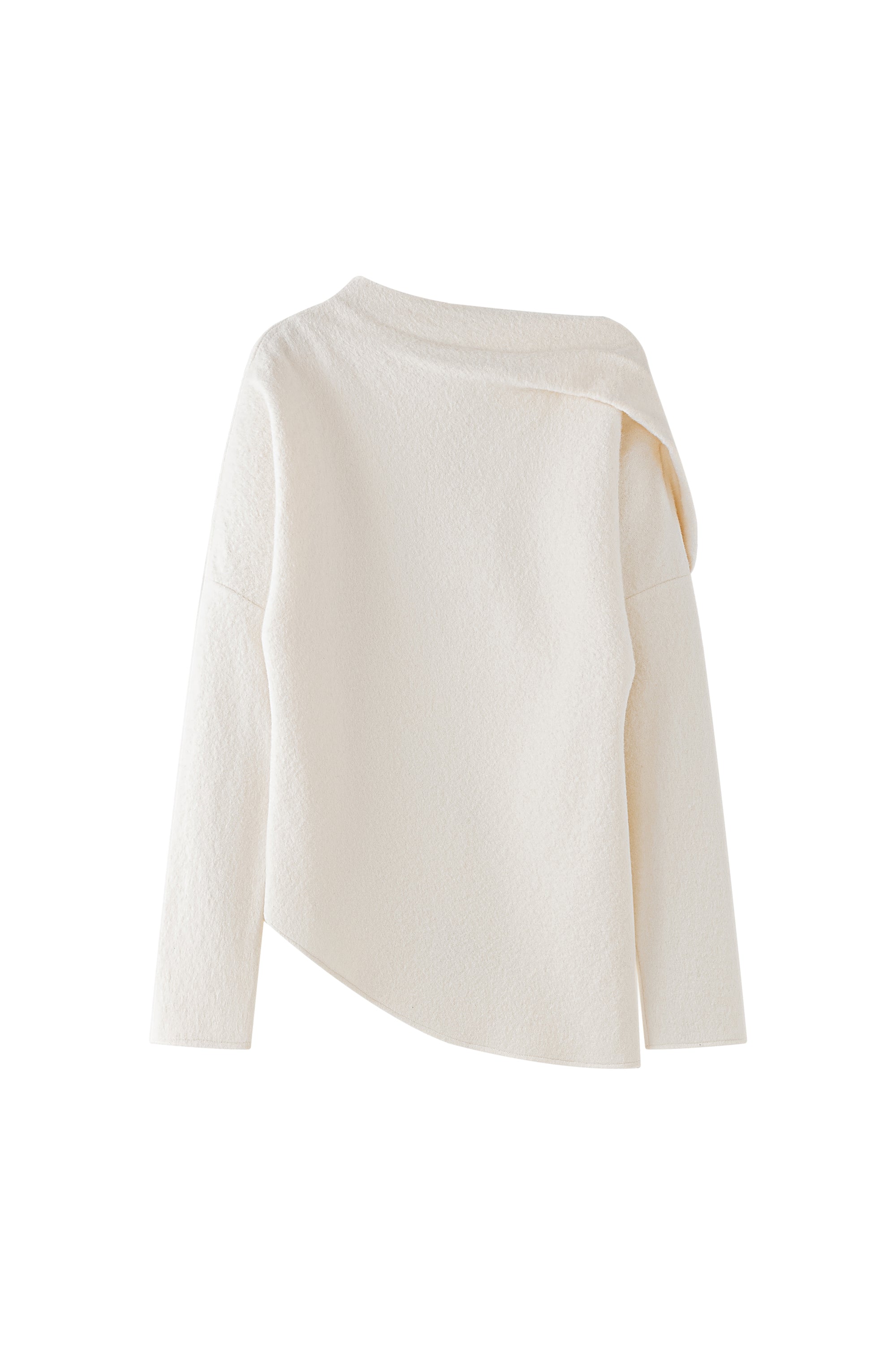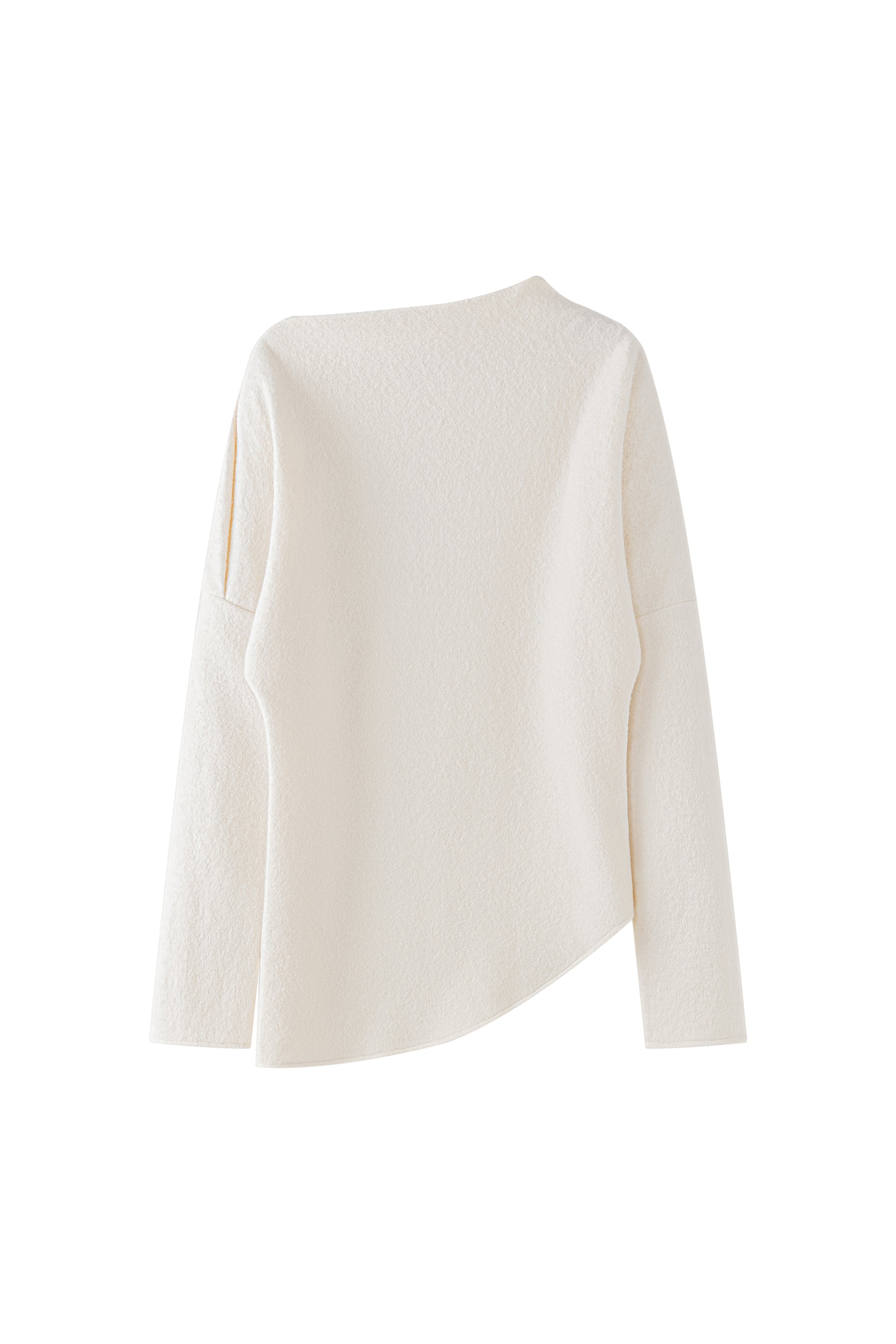Structured textured oversized long-sleeved top with asymmetrical neckline that reveals one shoulder. Asymmetrical hemline and dropped shoulders.