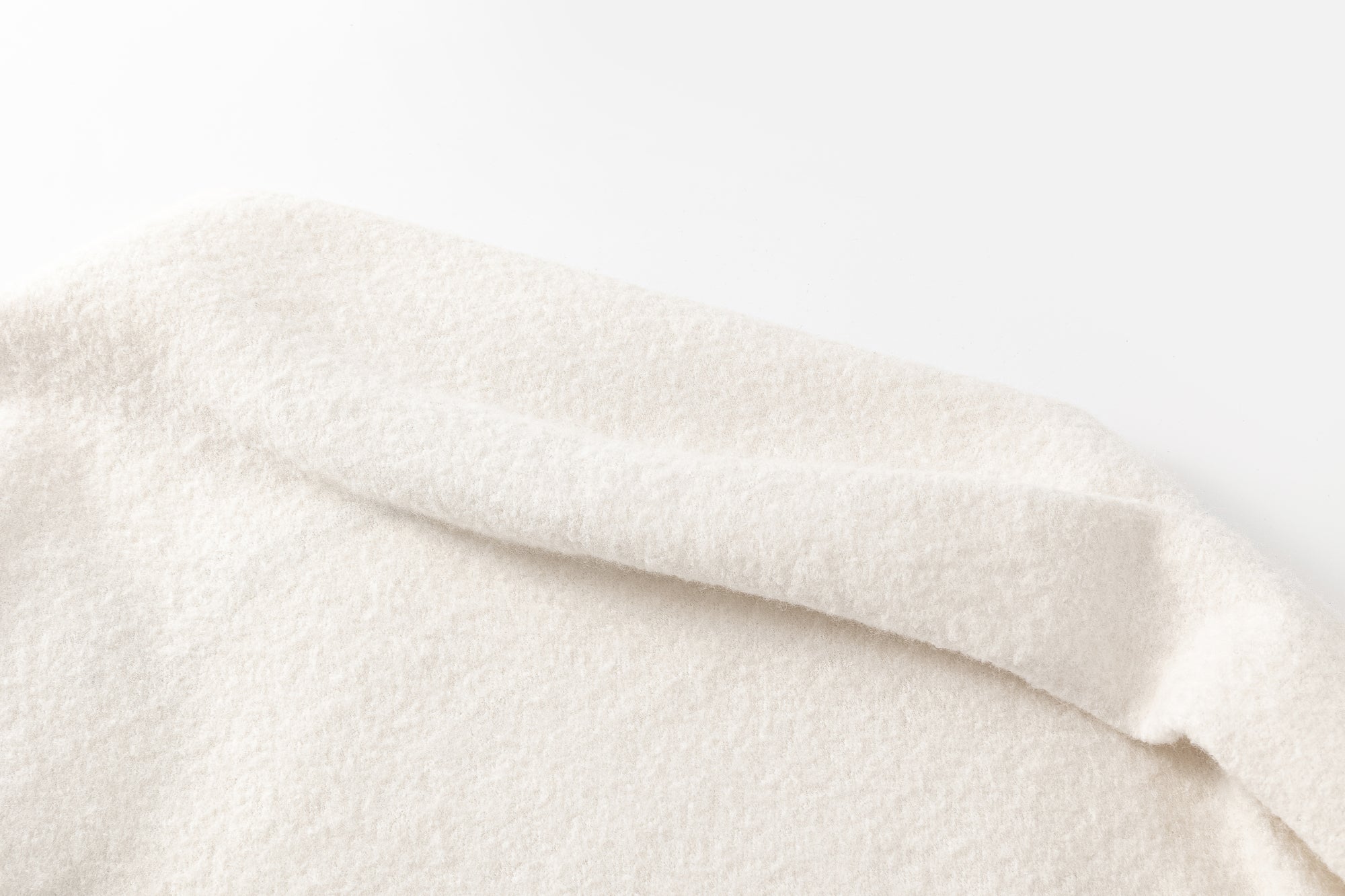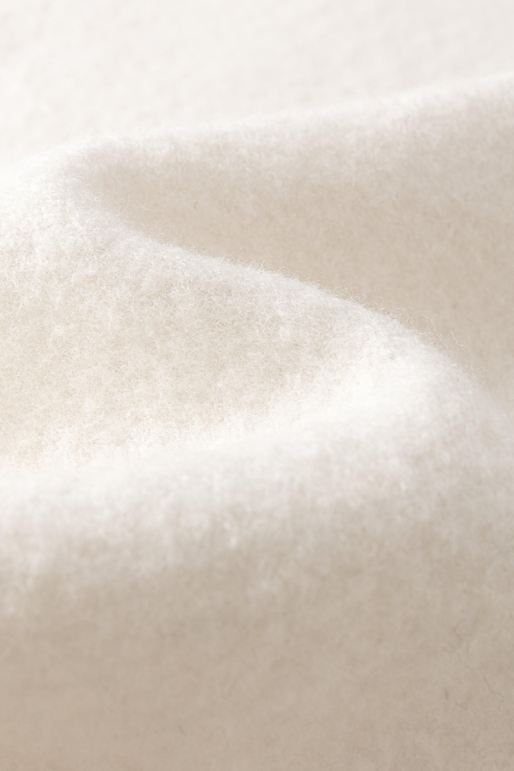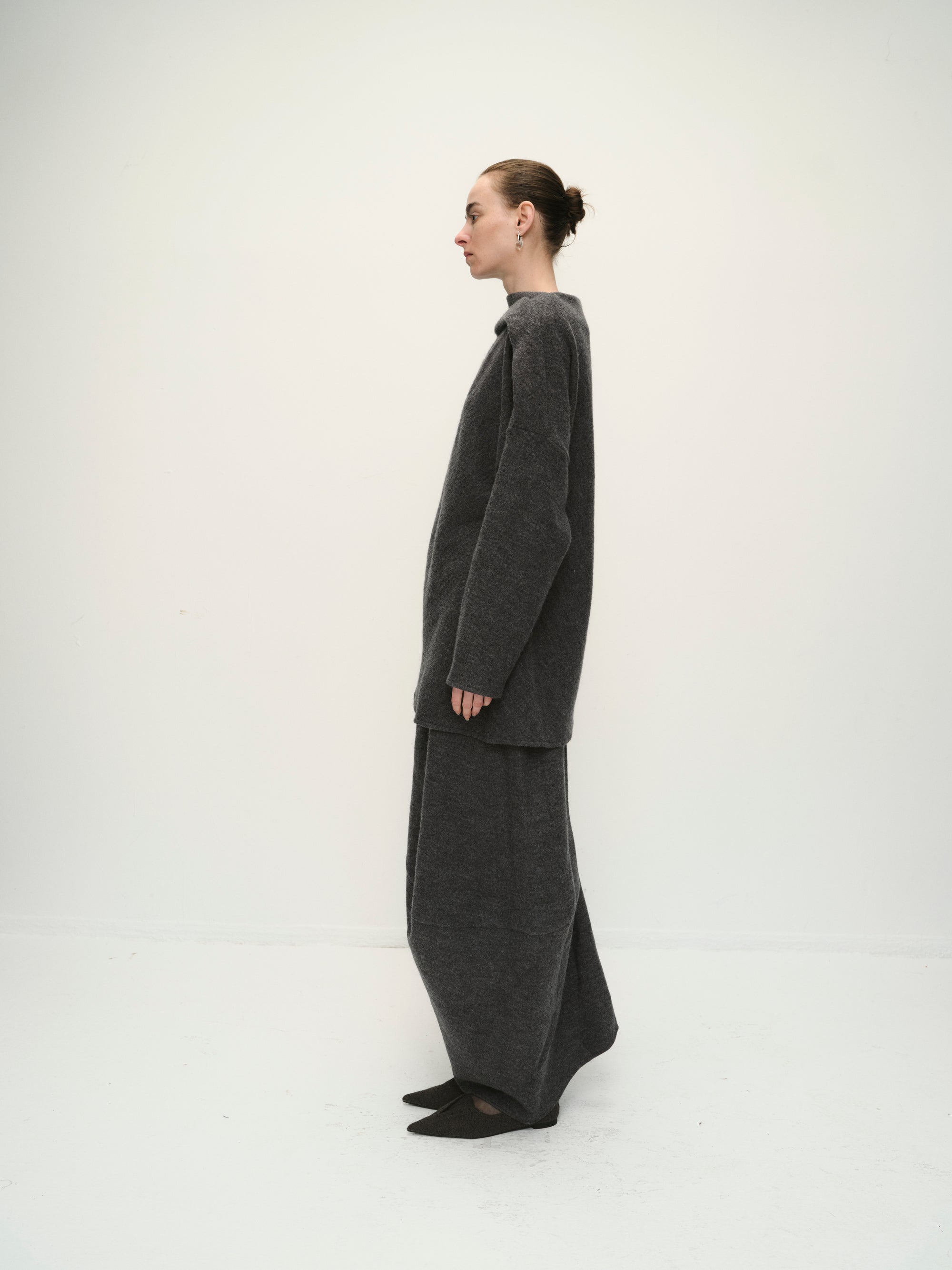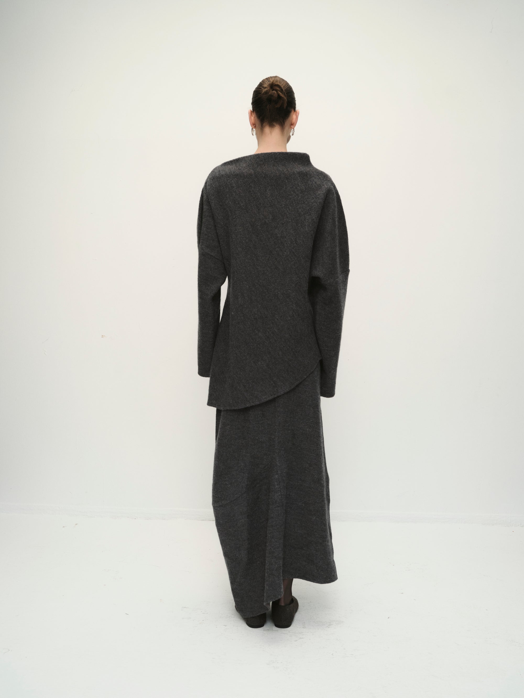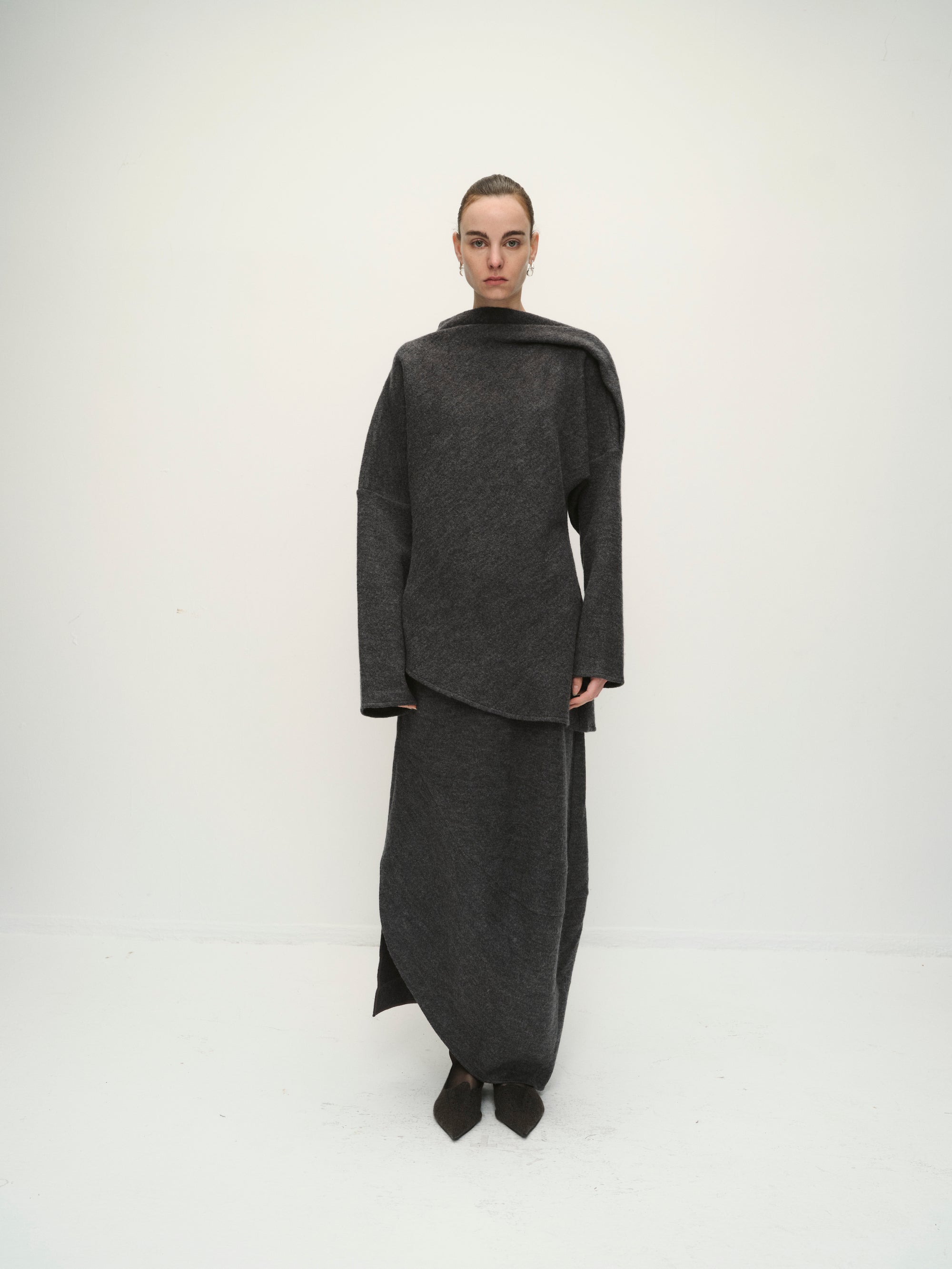 Structured textured oversized long-sleeved top with asymmetrical neckline that reveals one shoulder. Asymmetrical hemline and dropped shoulders.
