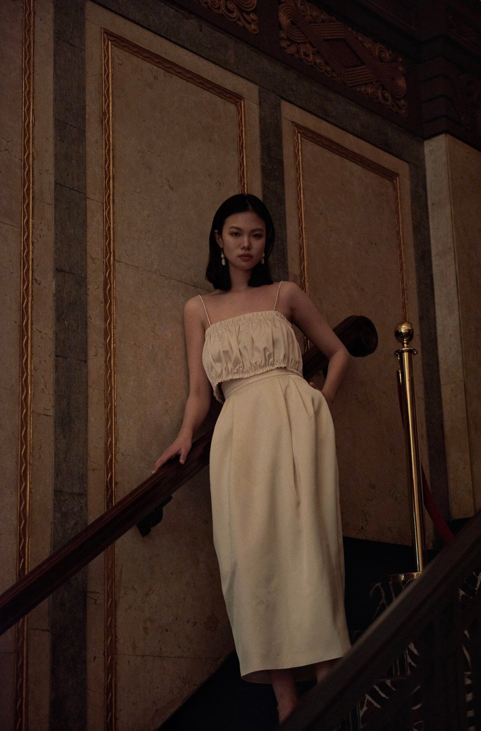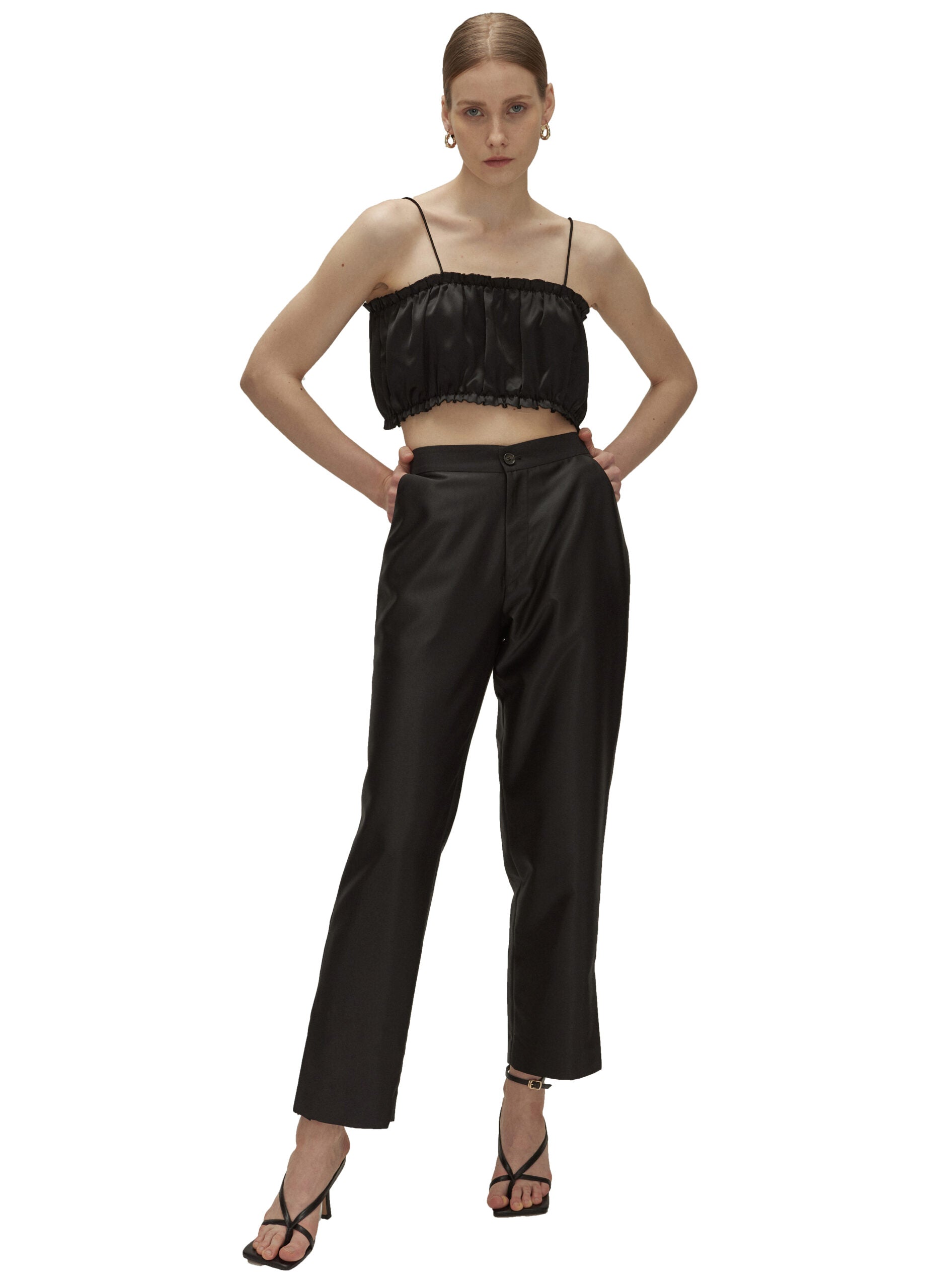 The Sandy gathered cropped top in thicker satin. Comes in powder and black. The perfect top for the more festive occasions. Wear it underneath a jacket or style with the matching skirt p...