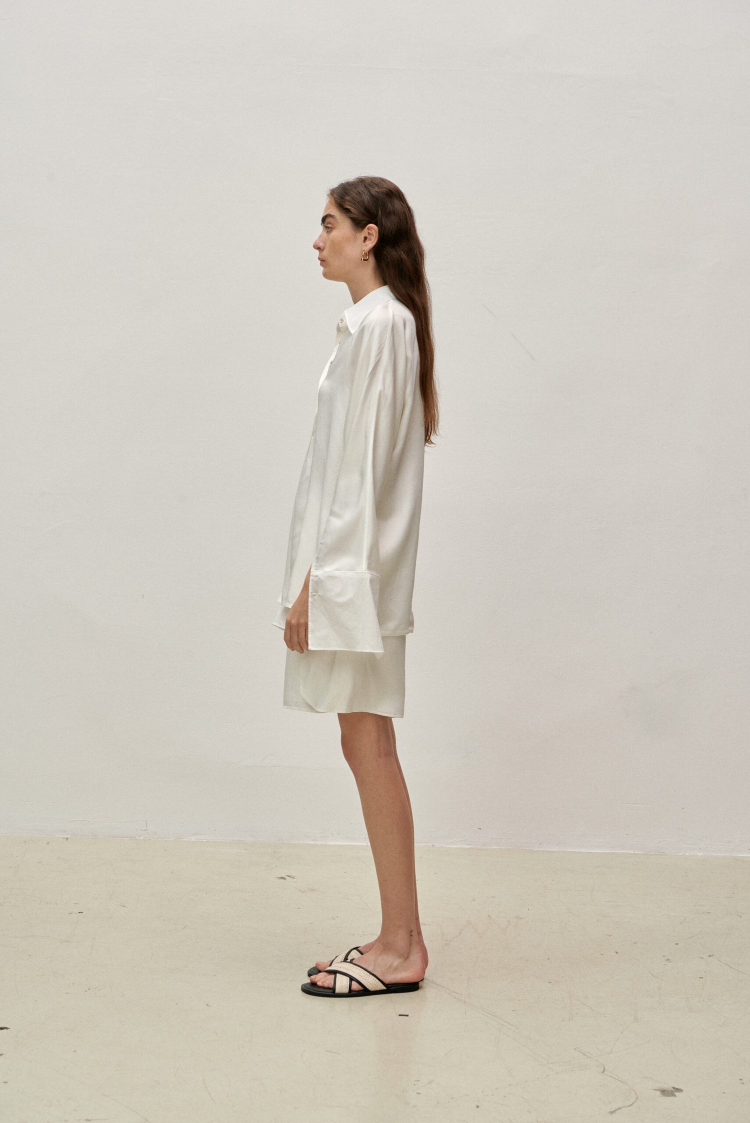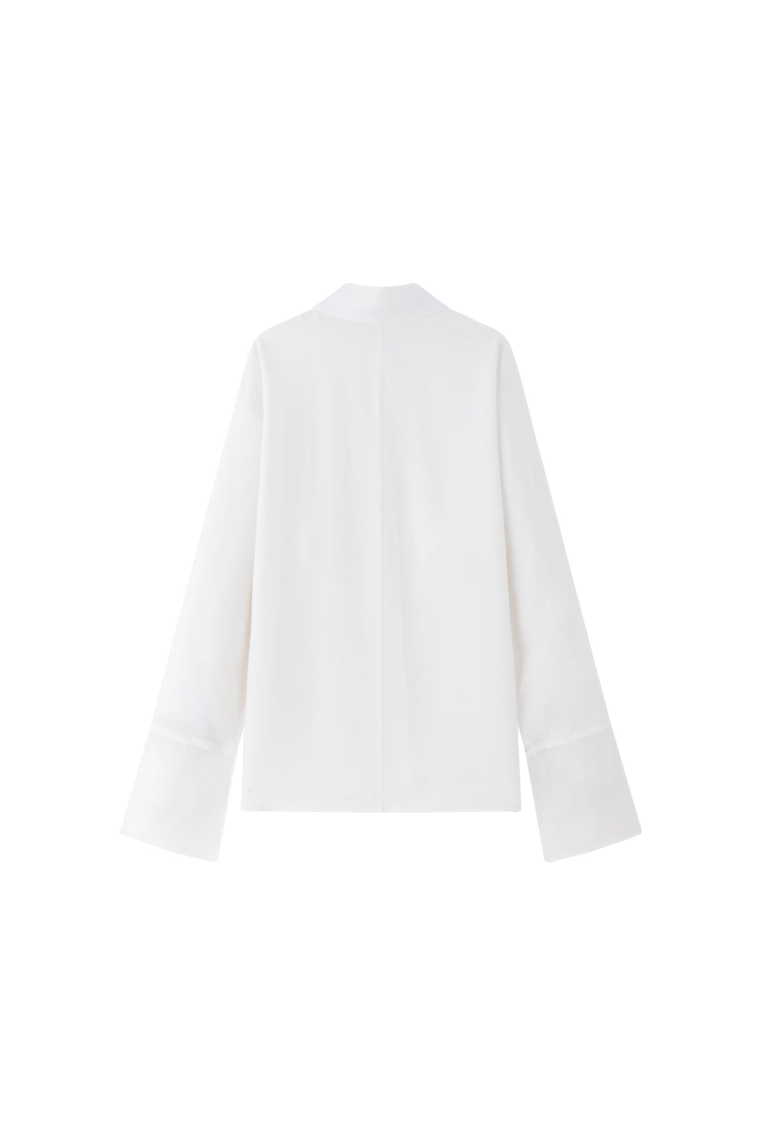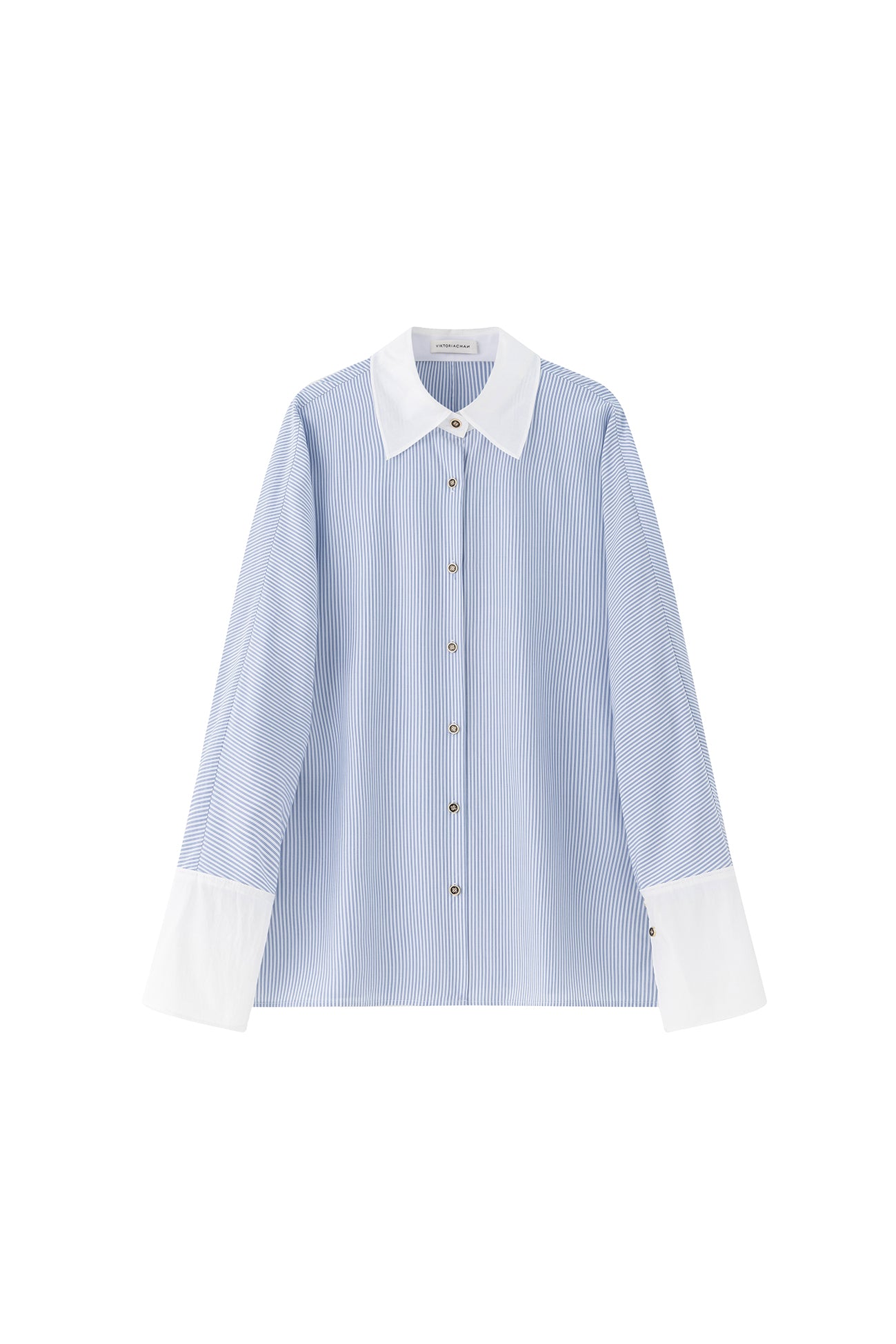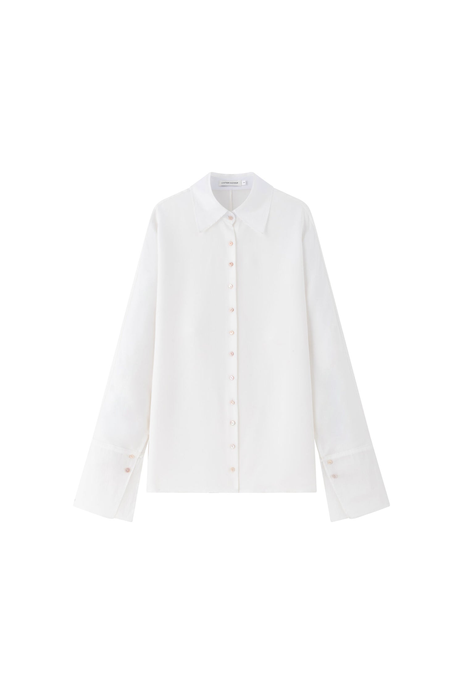 Flowy shirt with rounded cut cuffs. Poplin material in the cuff and collar that creates a great mix of effortless coolness. Small shell buttons and dropping shoulder in style. Oversized ...