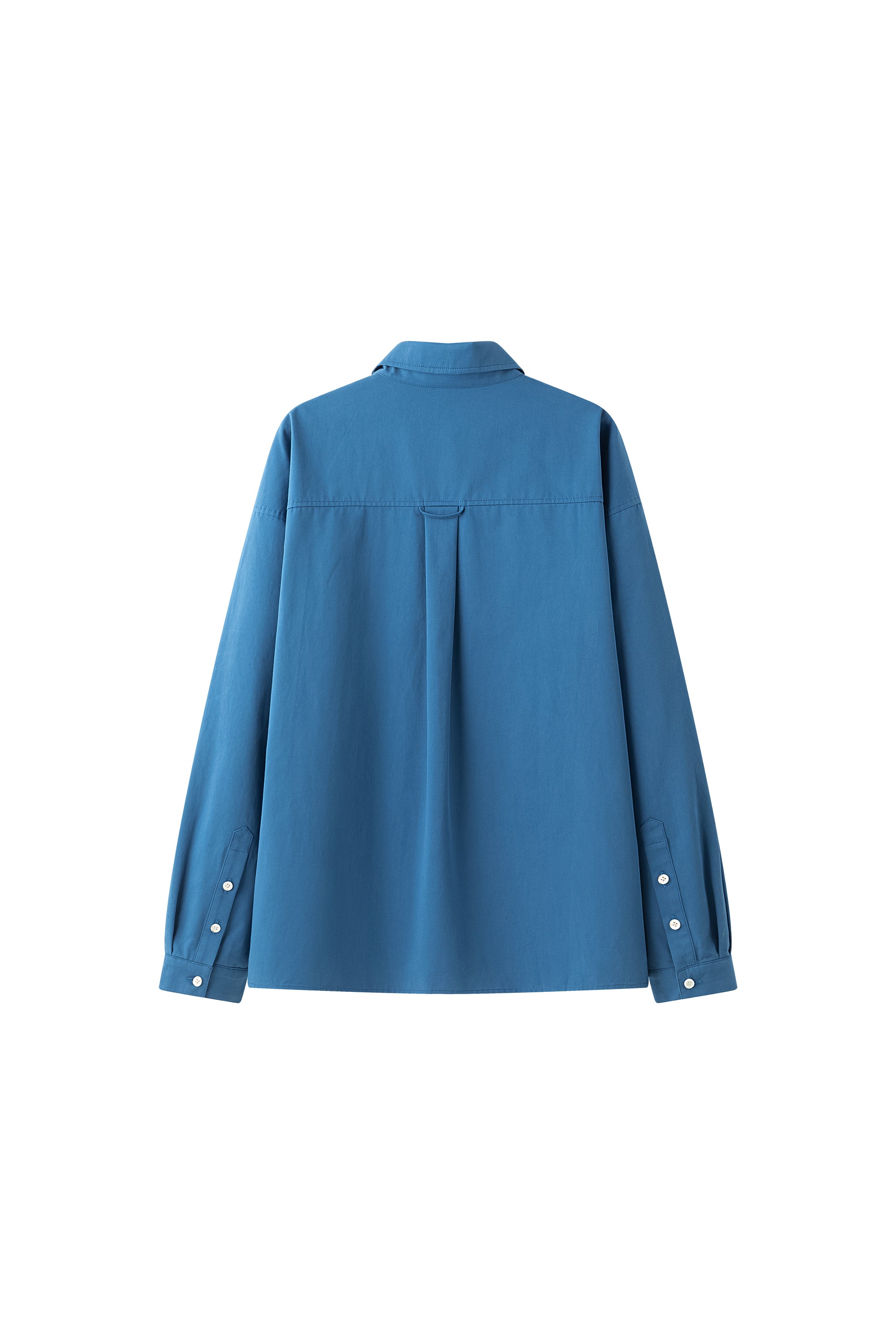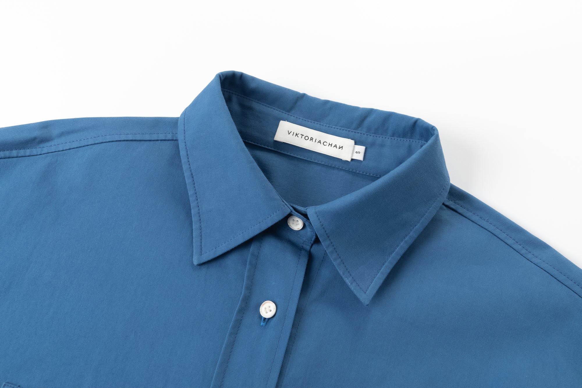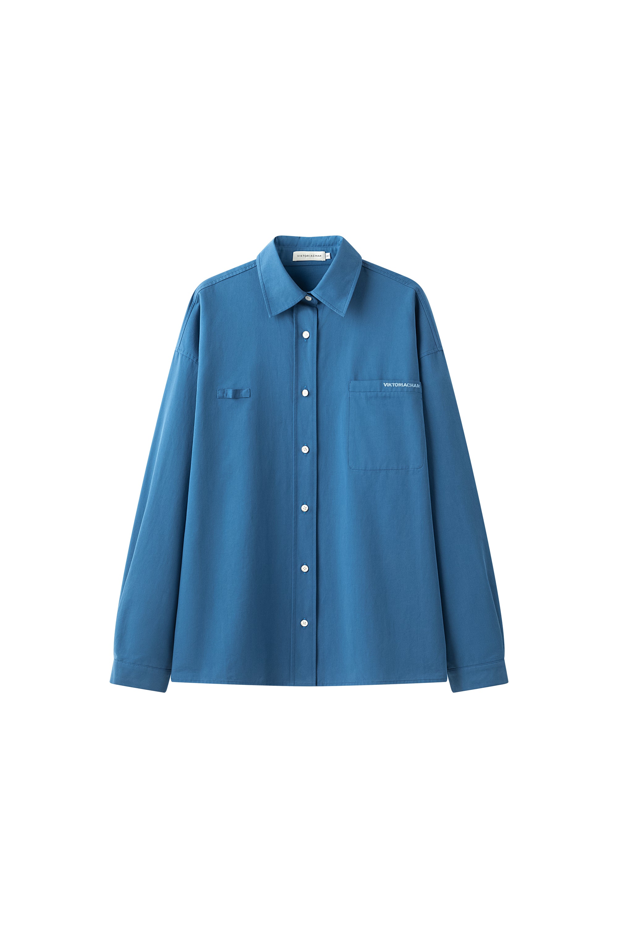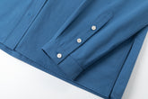 Shirt with pointed collar, long sleeves with buttoned cuffs, and small white buttons running down the placket for subtle contrast. A chest pocket on the left side is accented with the br...