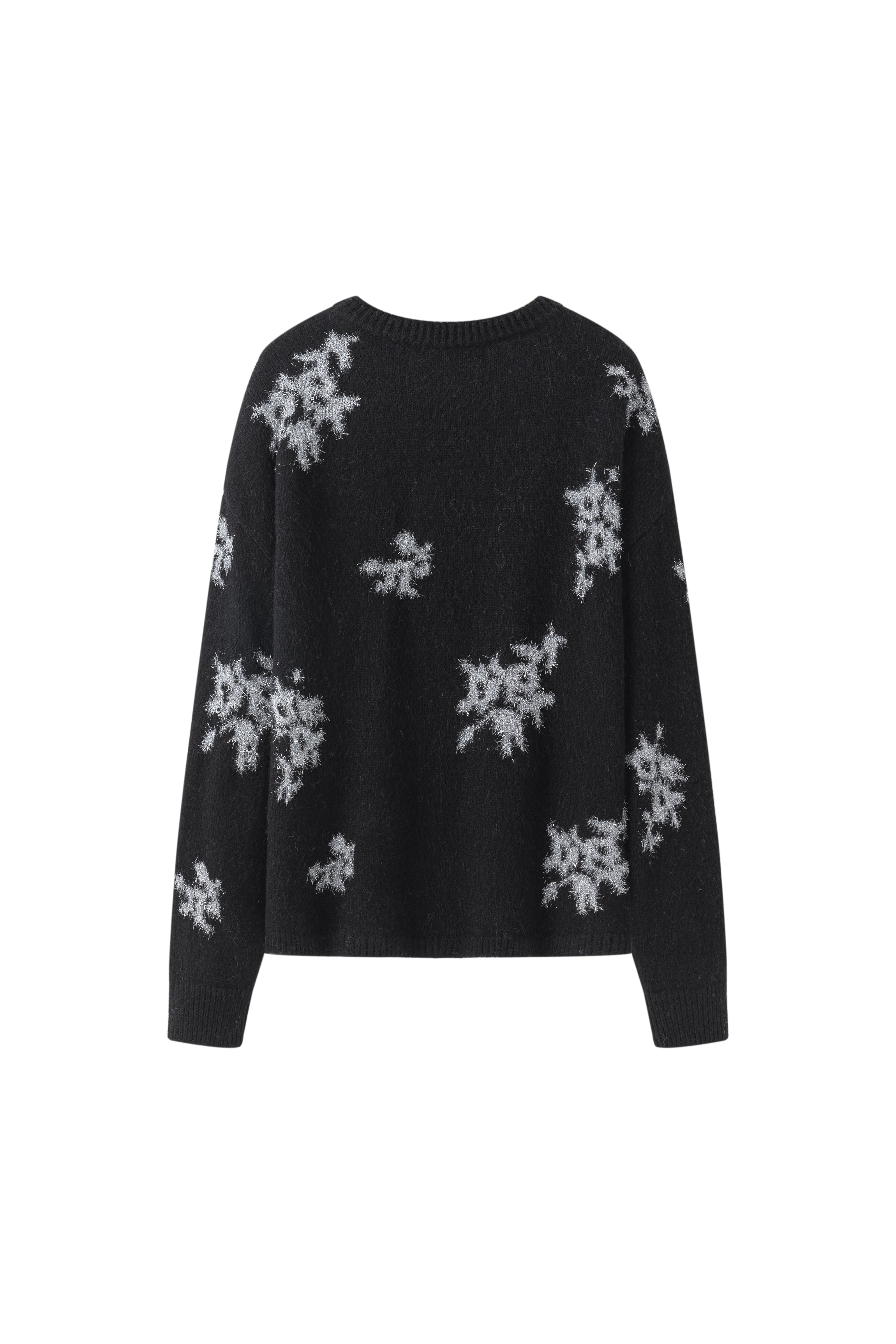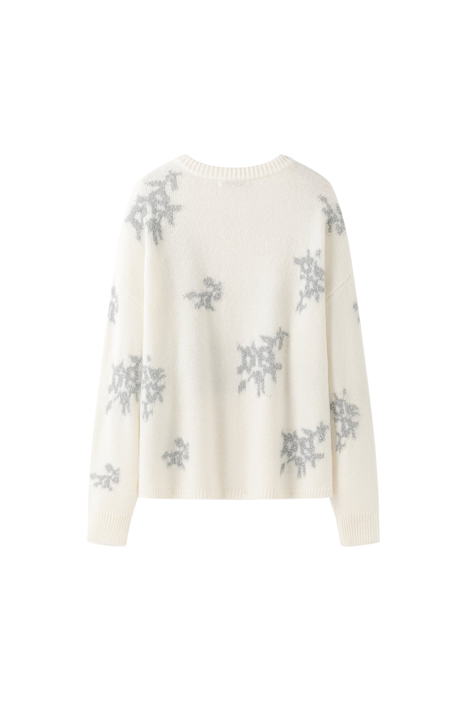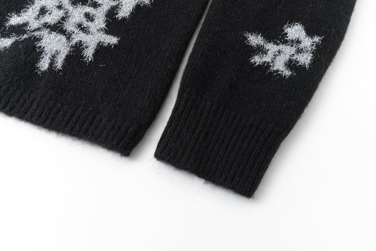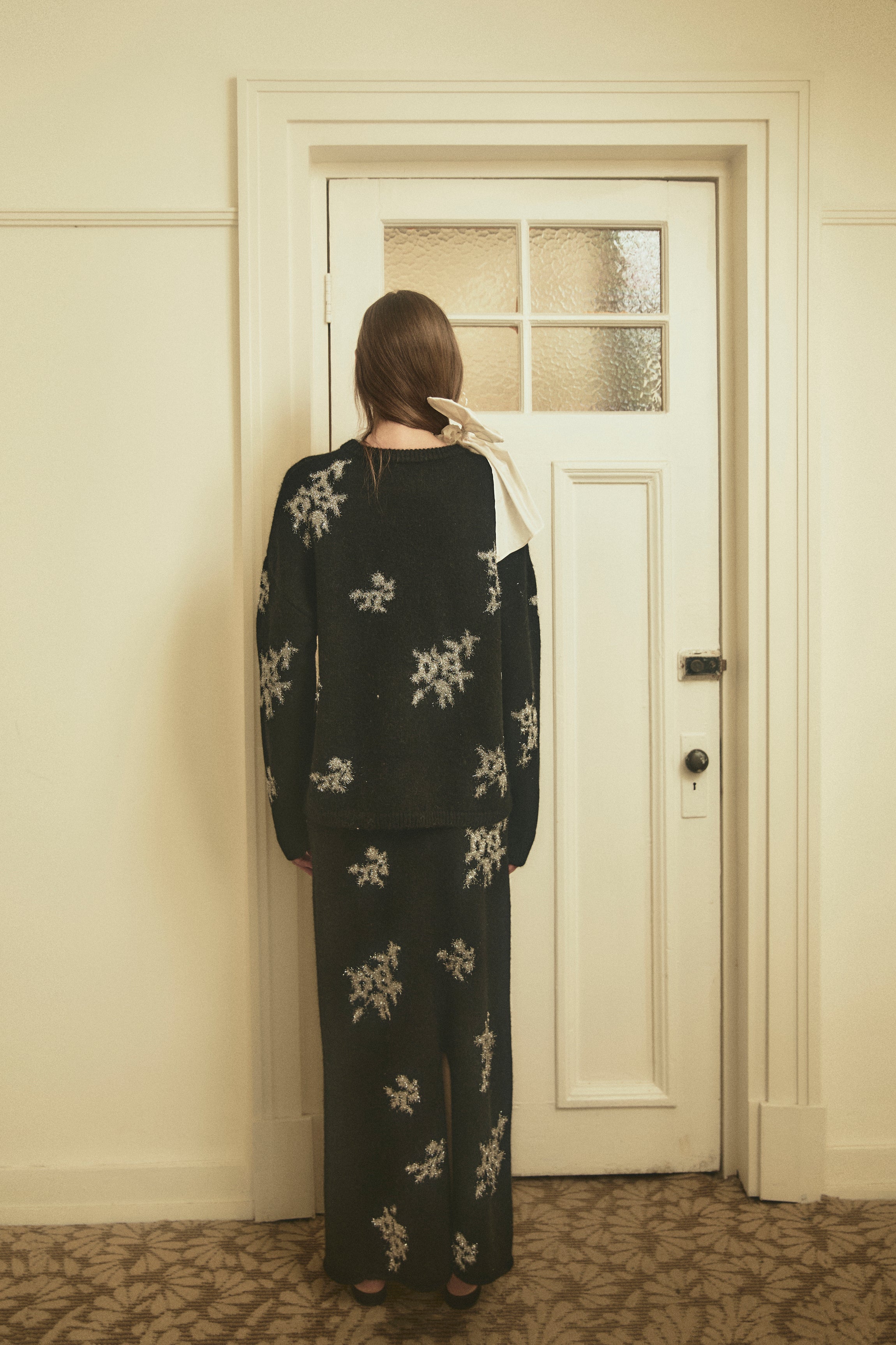 Oversized wool and cashmere sweater featuring a glittery snowflake pattern throughout. Part of a coordinated set for a complete festive look.