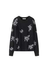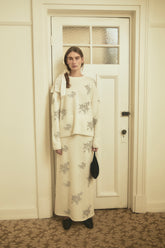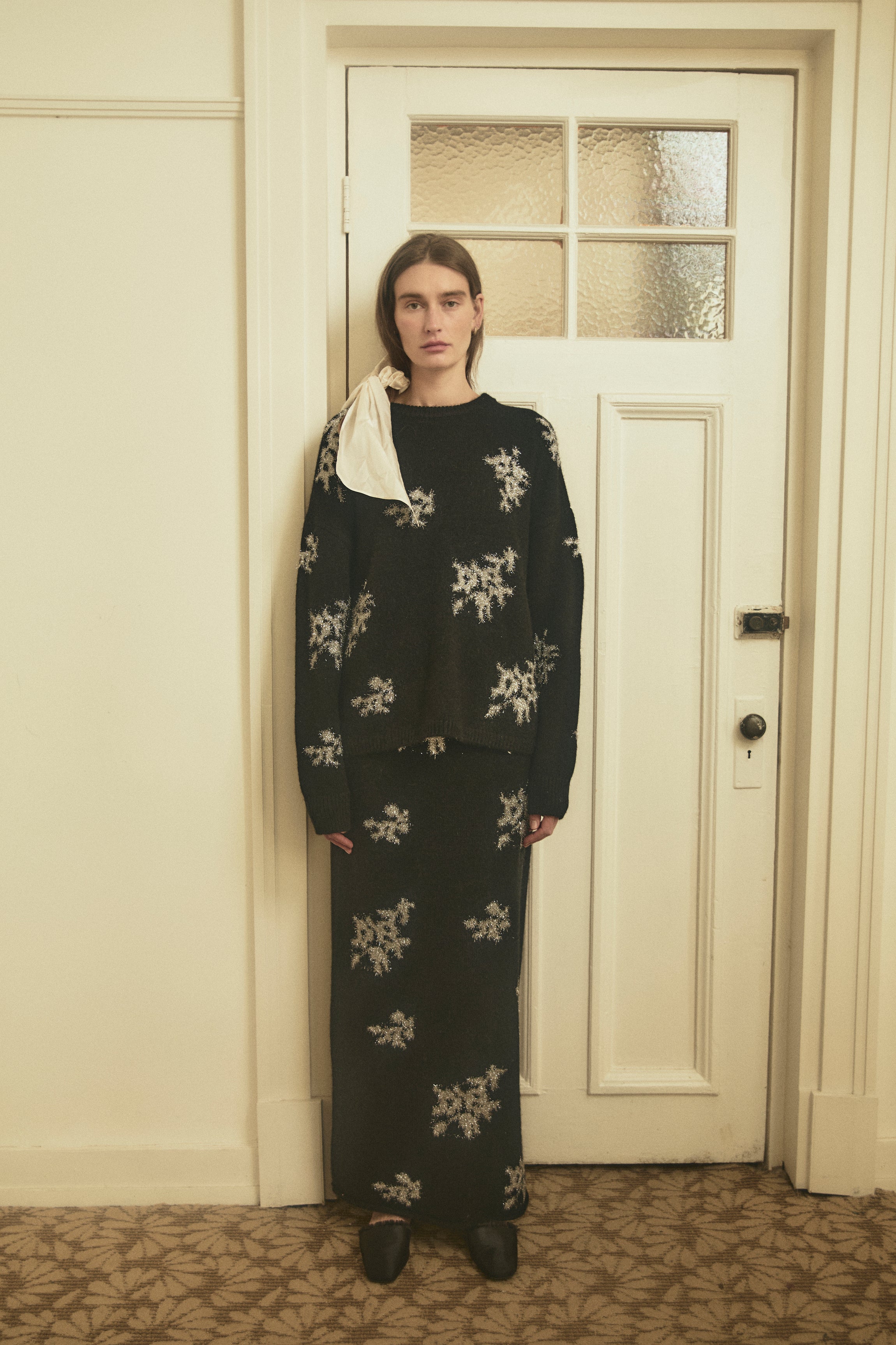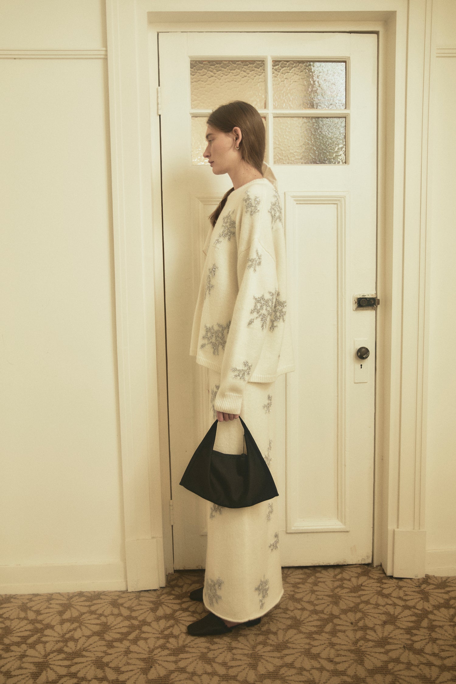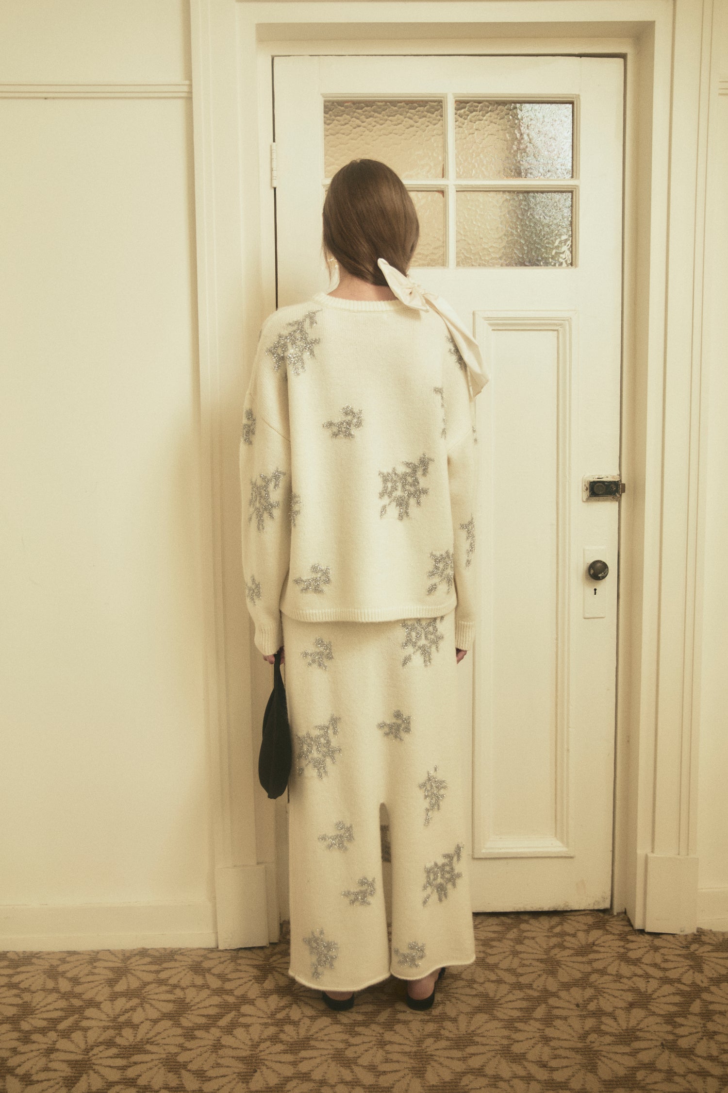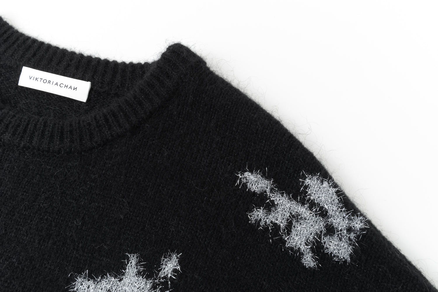 Oversized wool and cashmere sweater featuring a glittery snowflake pattern throughout. Part of a coordinated set for a complete festive look.