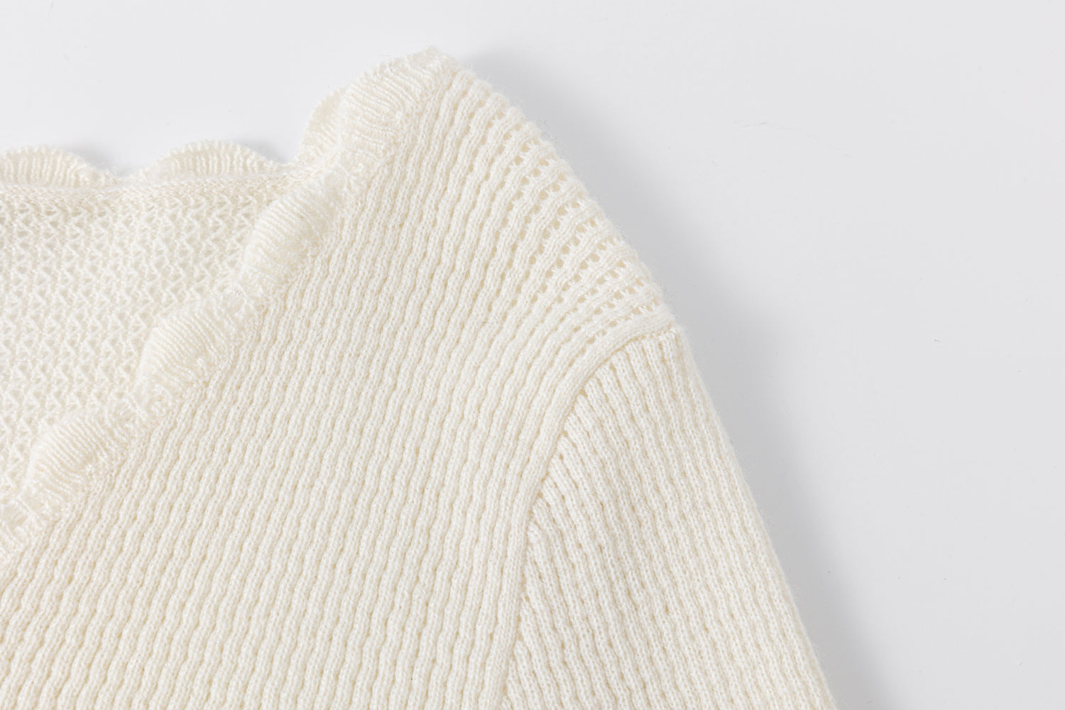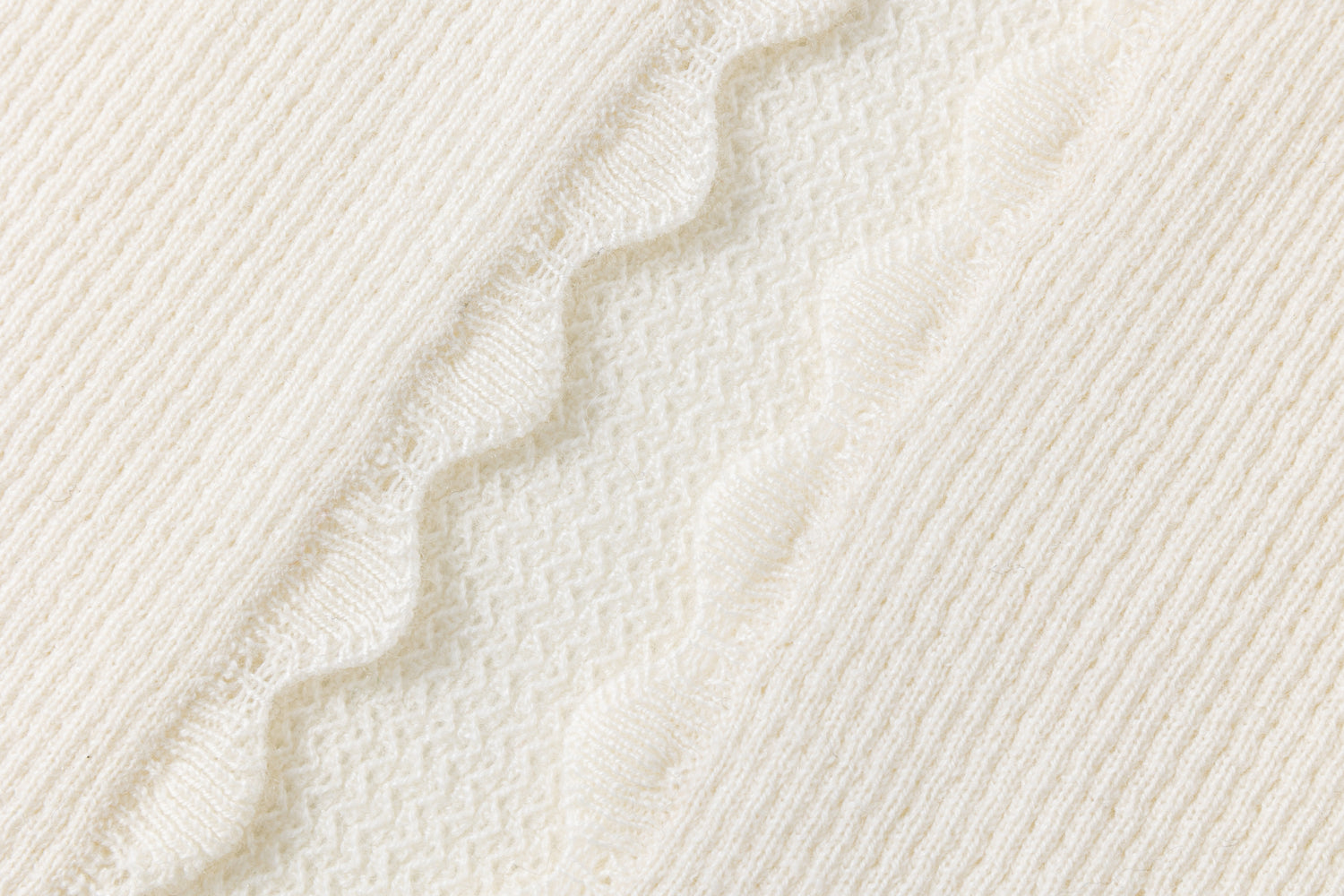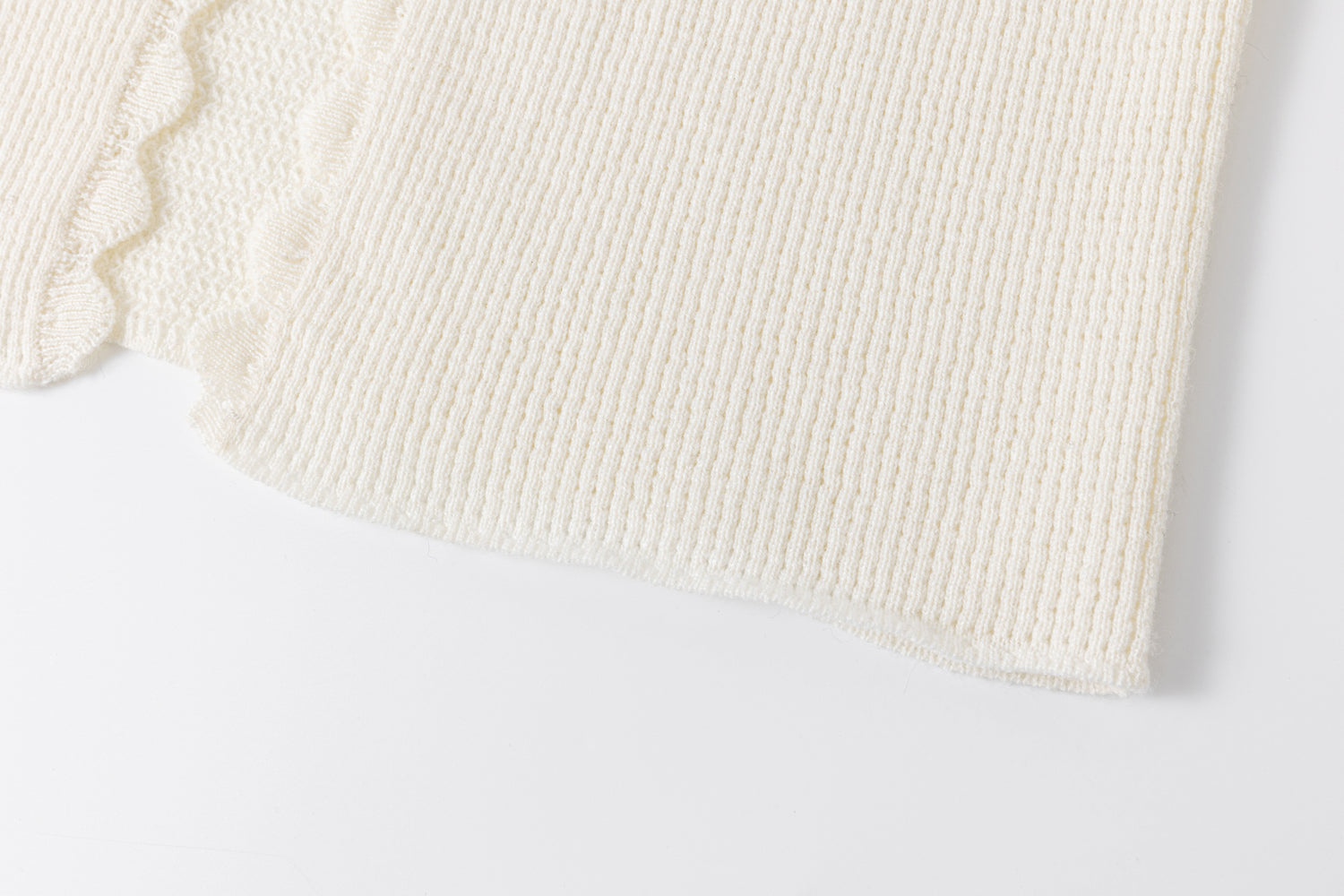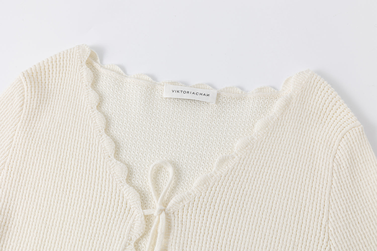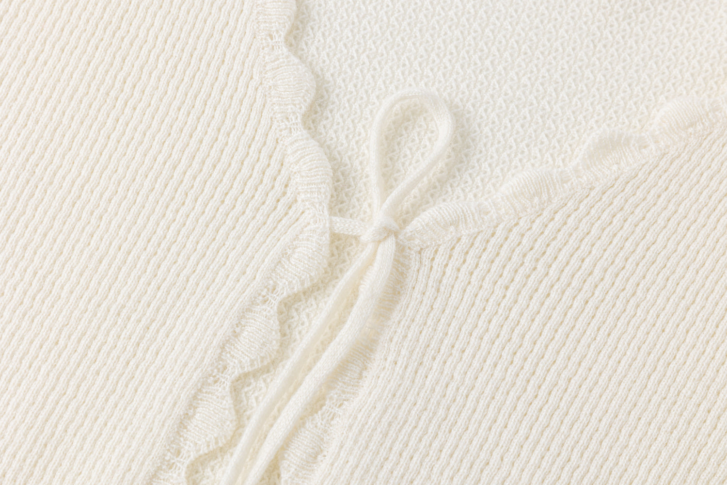 A delicate, ivory-colored cardigan featuring soft wavy edges along the neckline and front. Made from a lightweight knit, it has a slightly sheer texture, perfect for layering. The open f...
