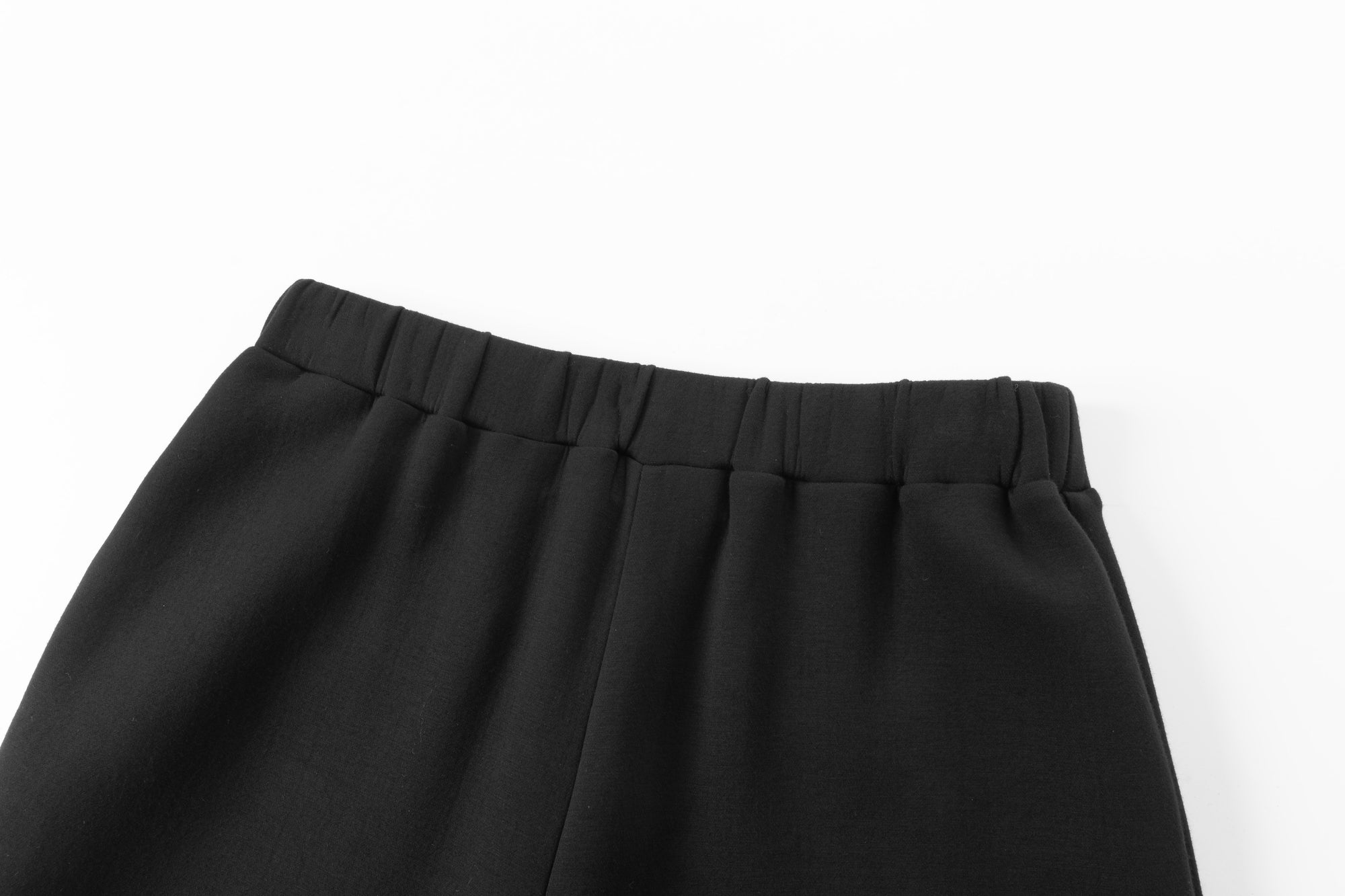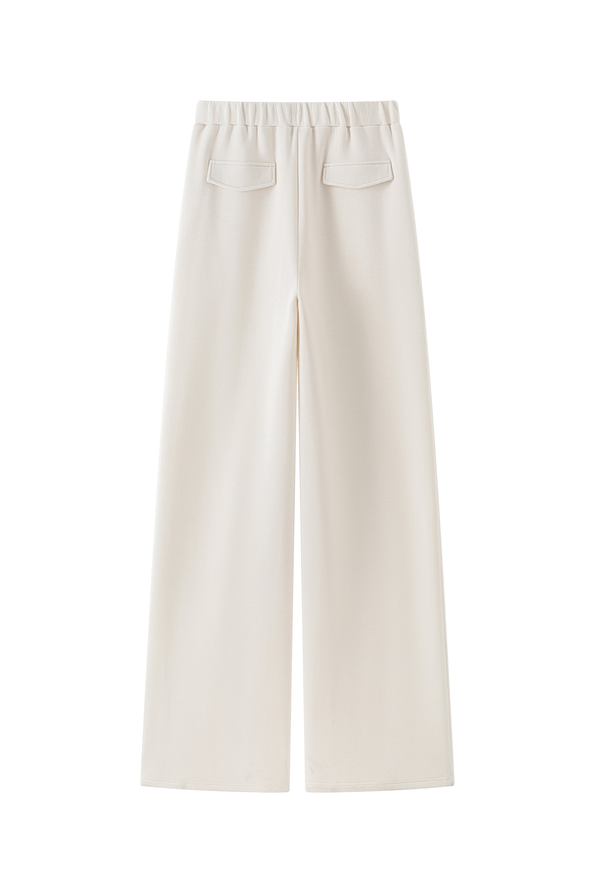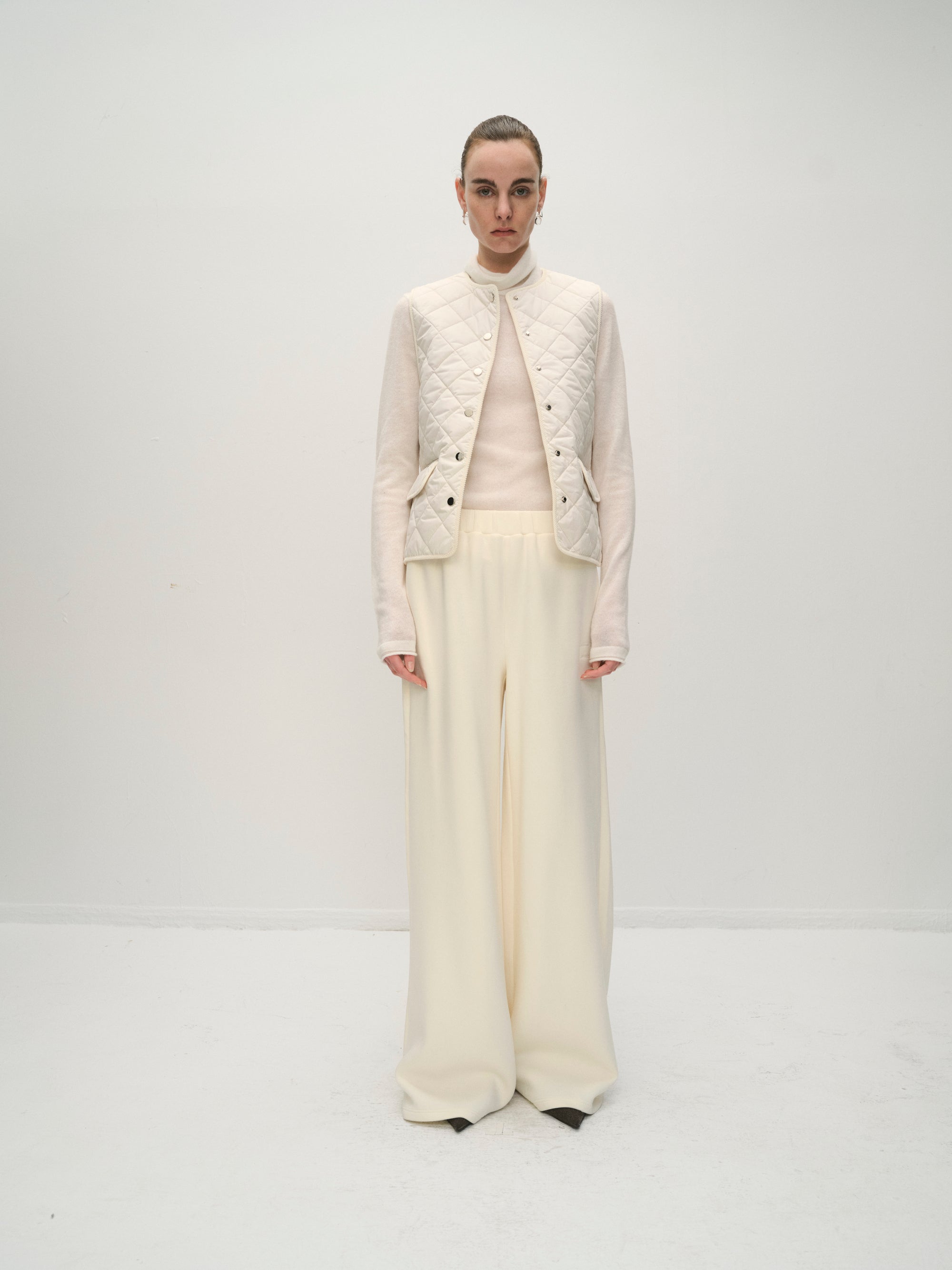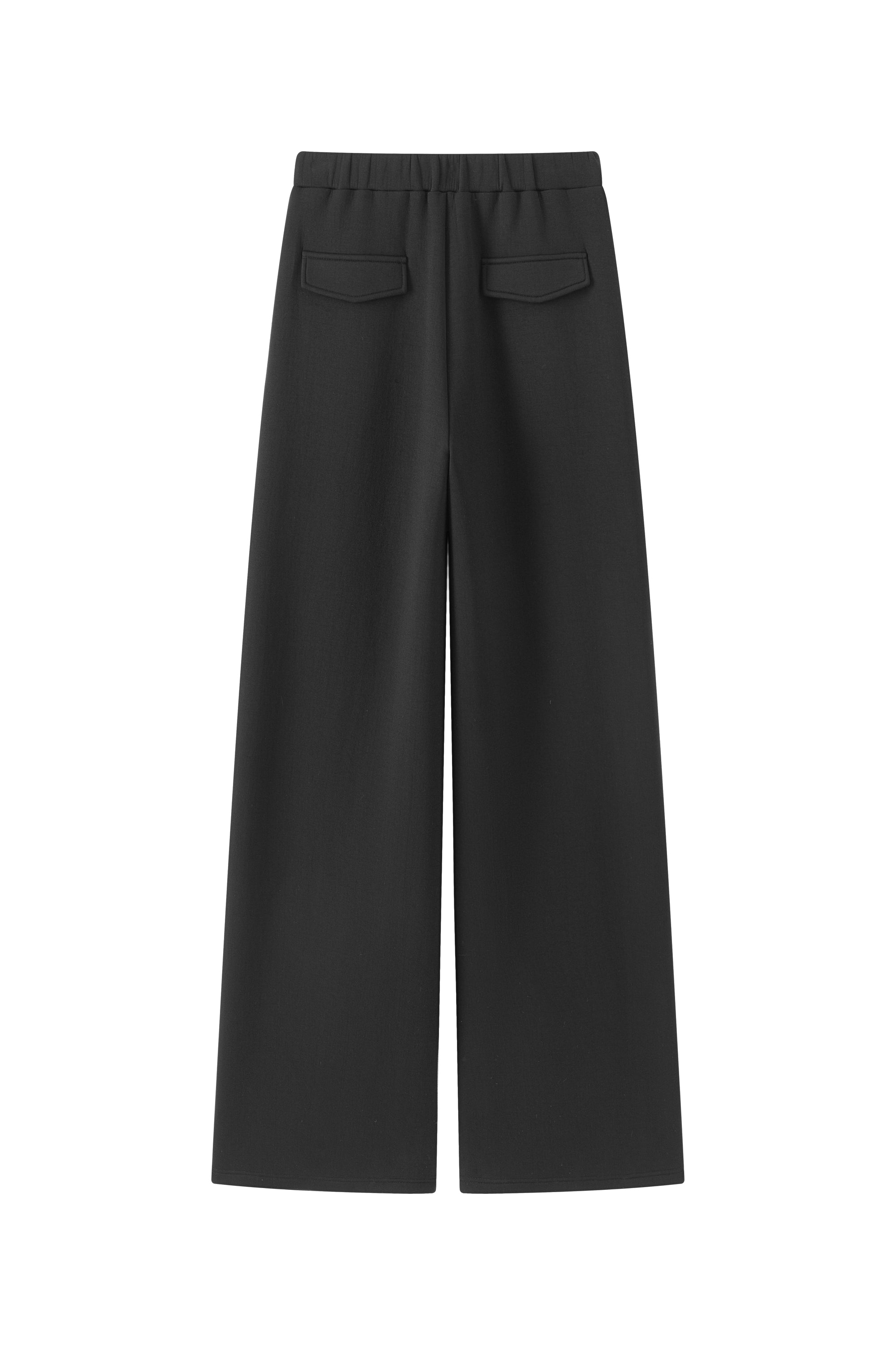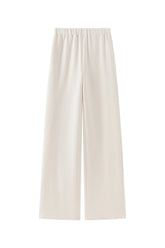 Wide trousers with elastic waistband, side seam pockets. Wide fluid fit.