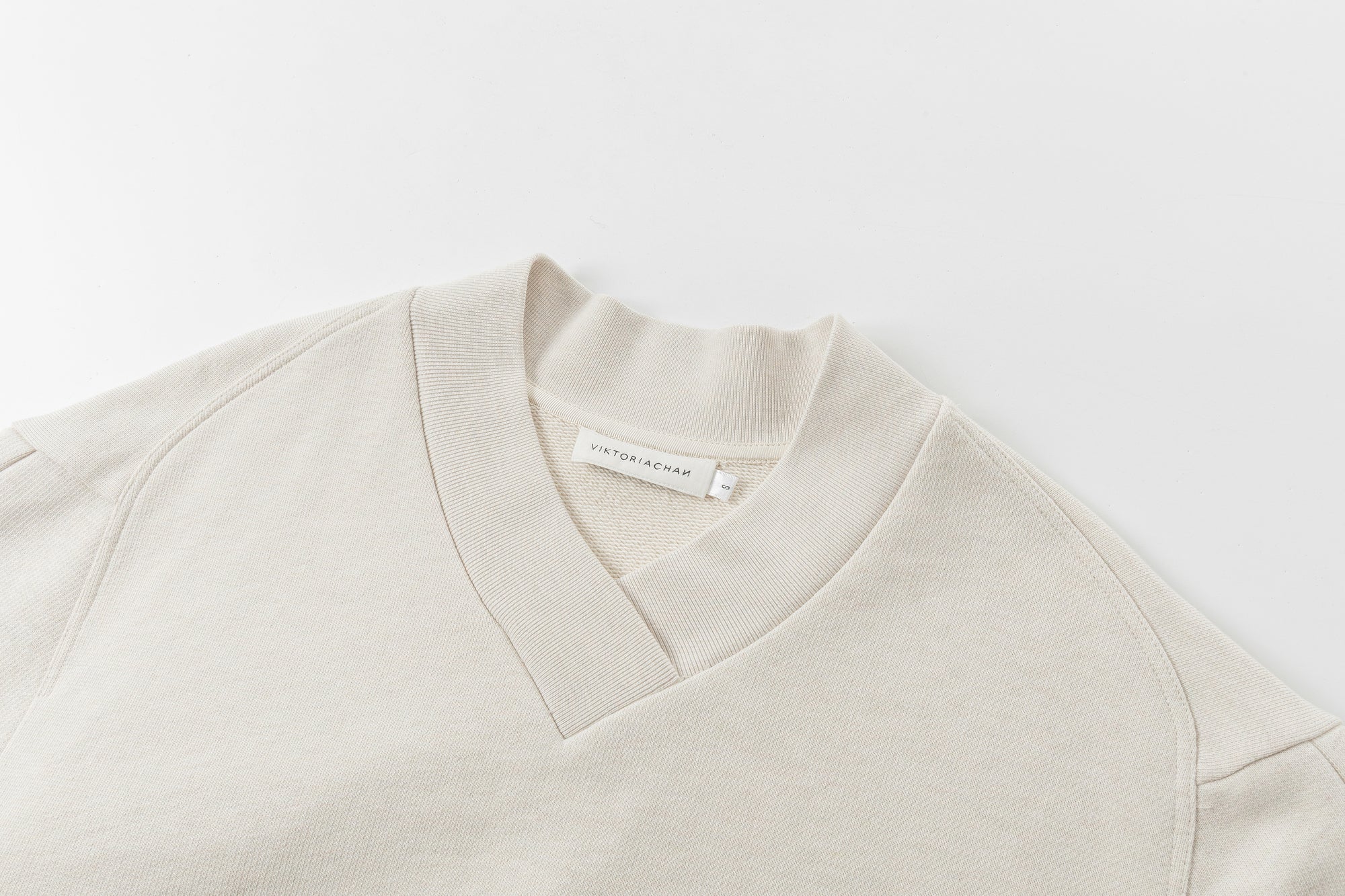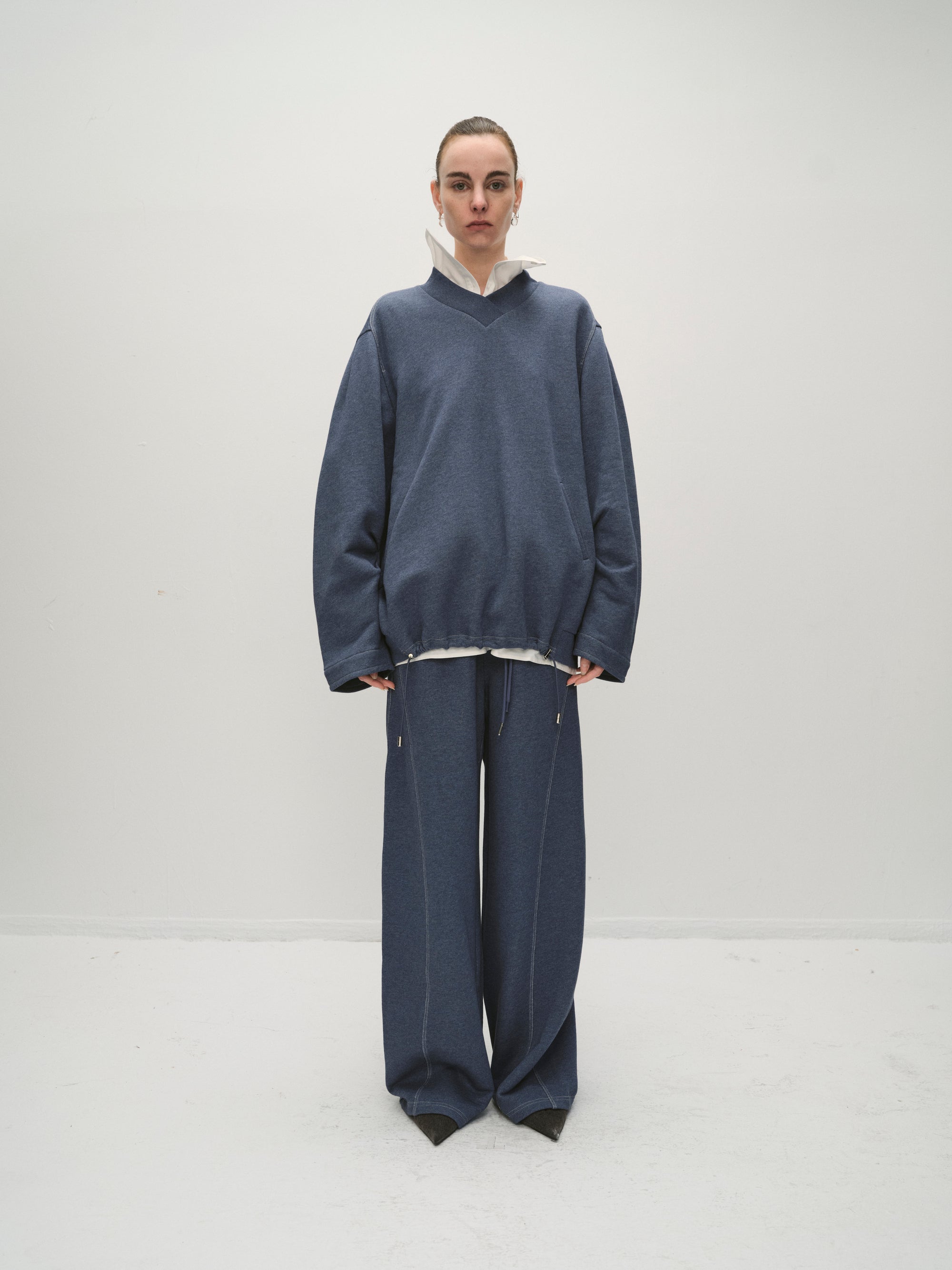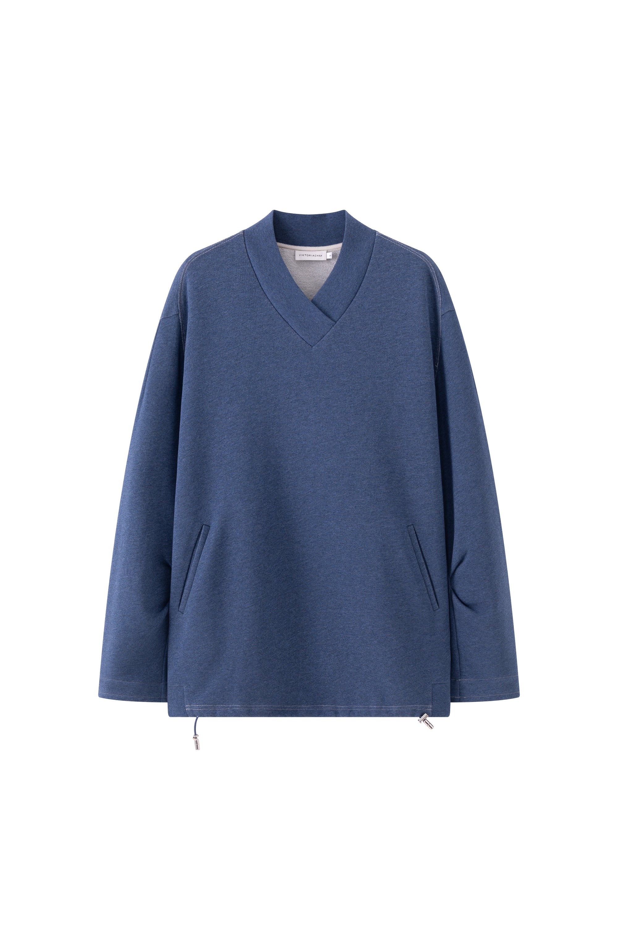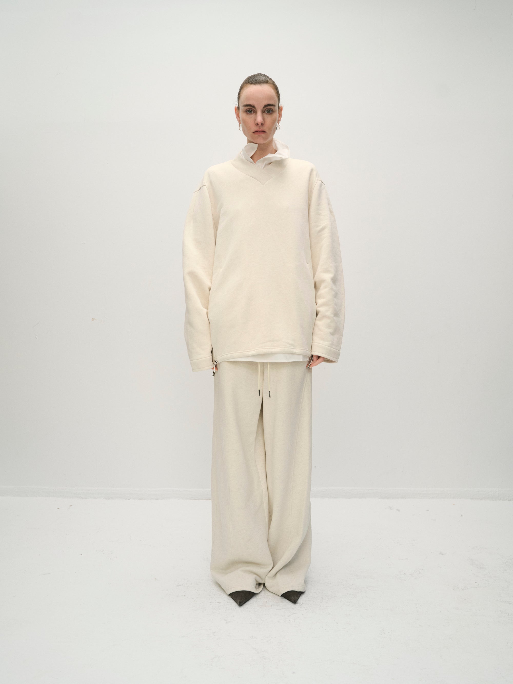 Oversized high V neck collar sweater. Pockets in the front and gathered sleeve details. Drawstring in the front part.