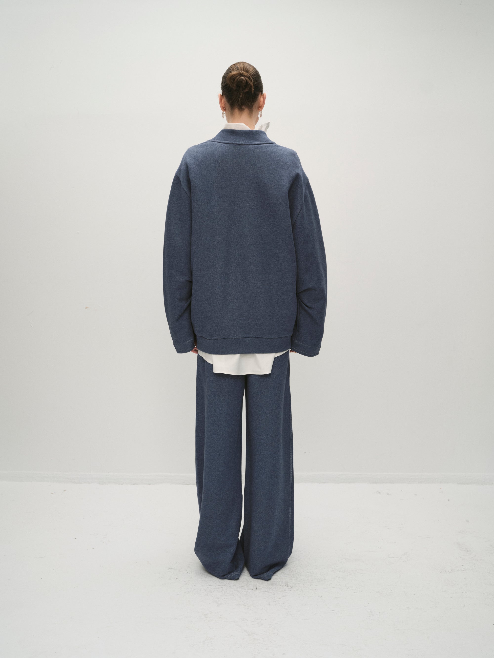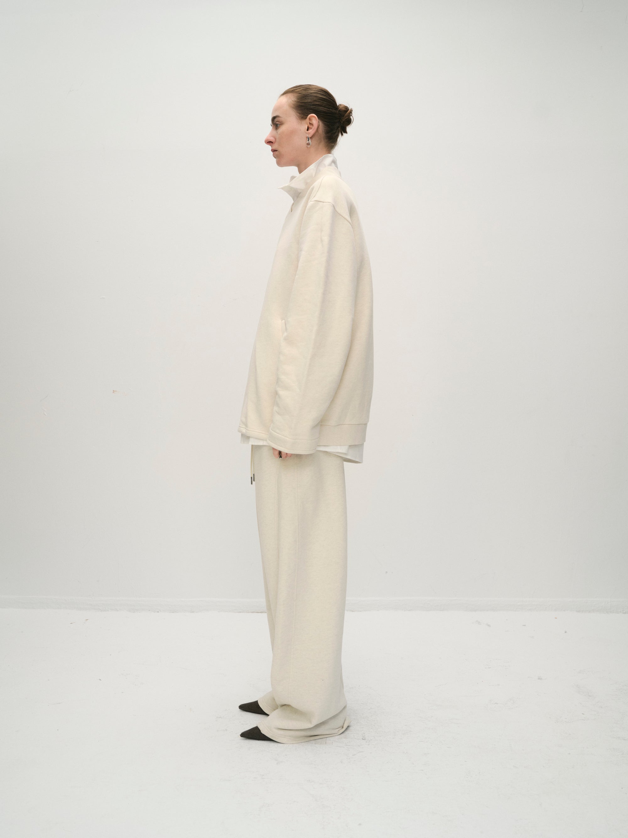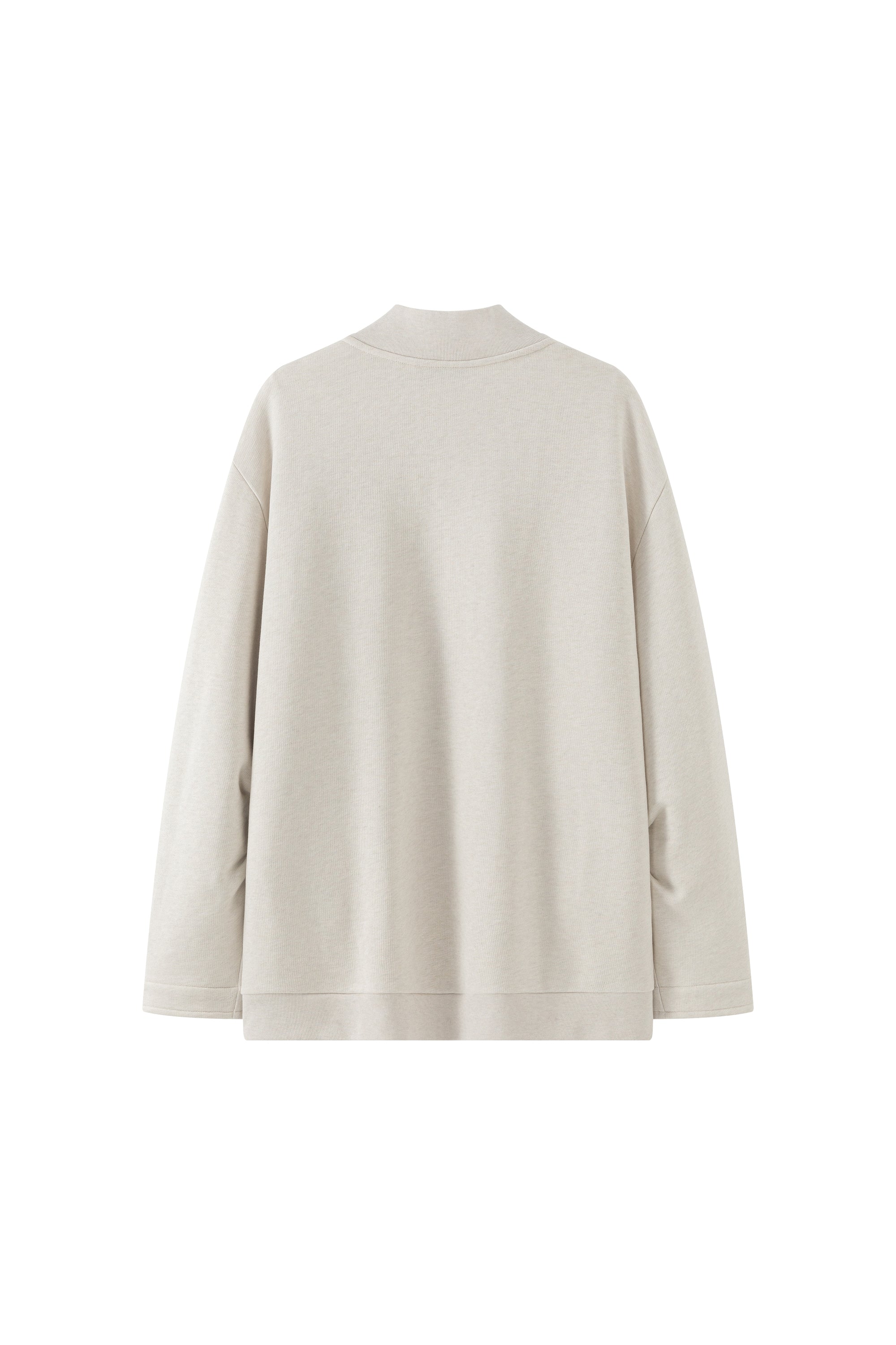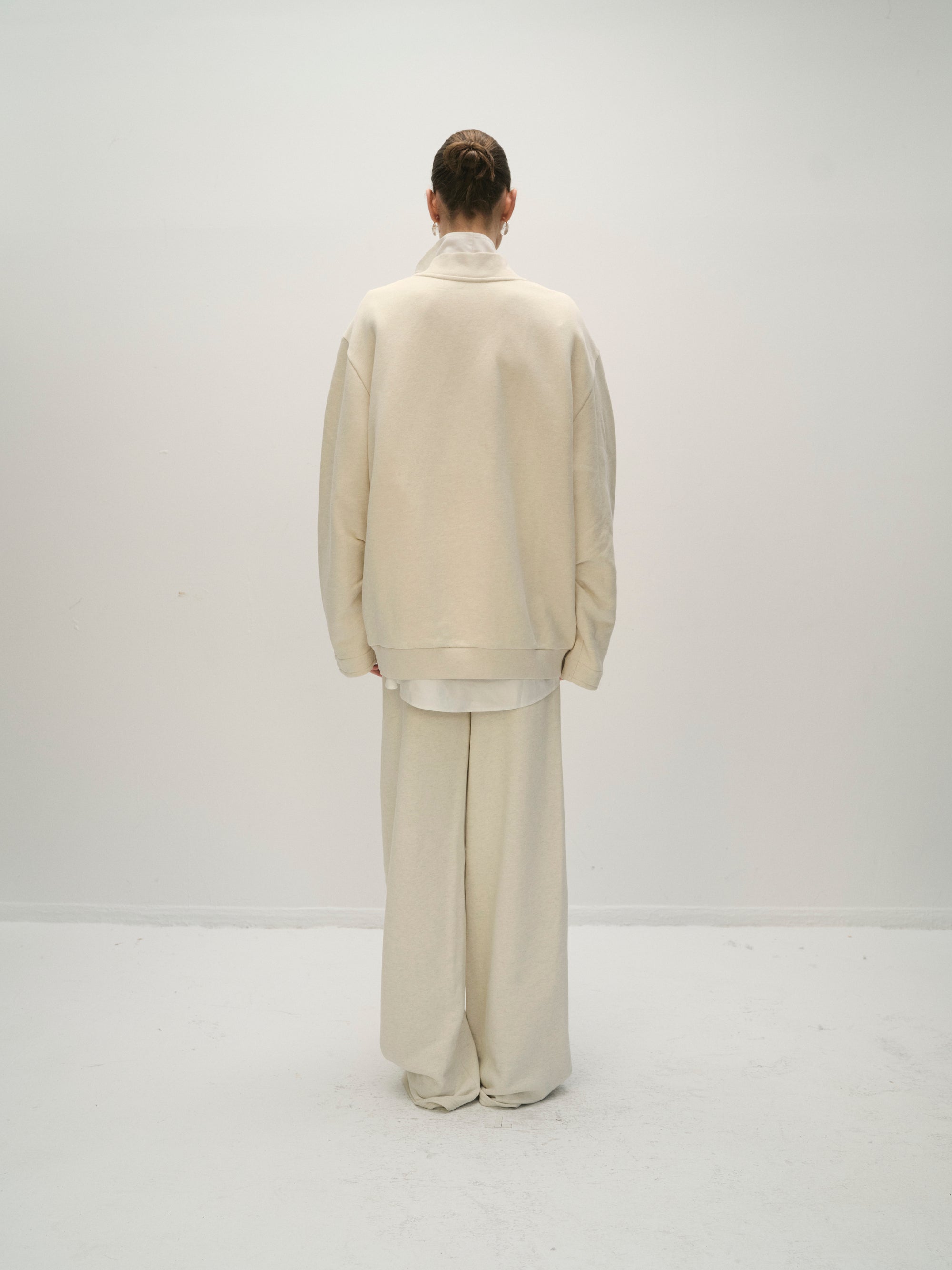 Oversized high V neck collar sweater. Pockets in the front and gathered sleeve details. Drawstring in the front part.