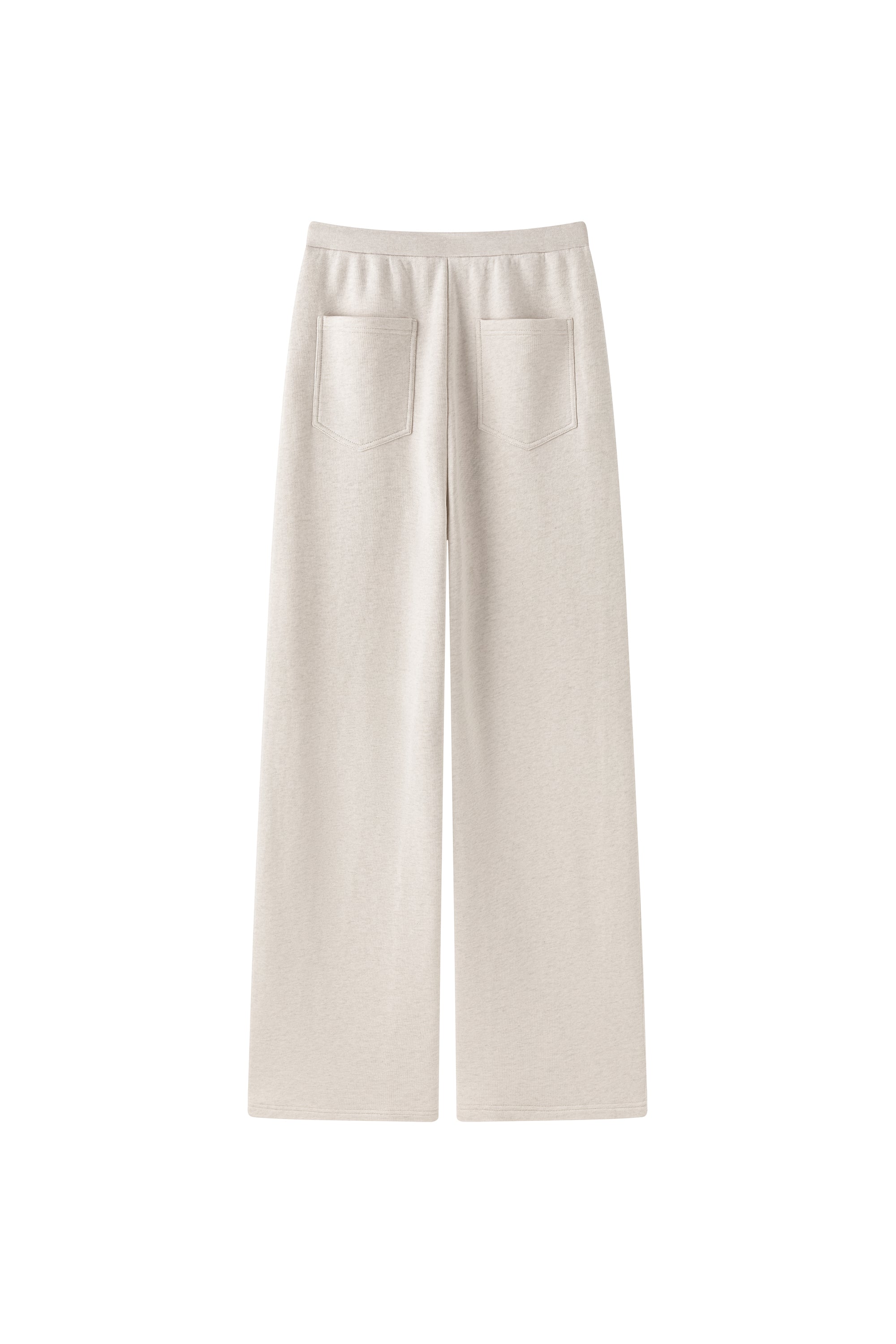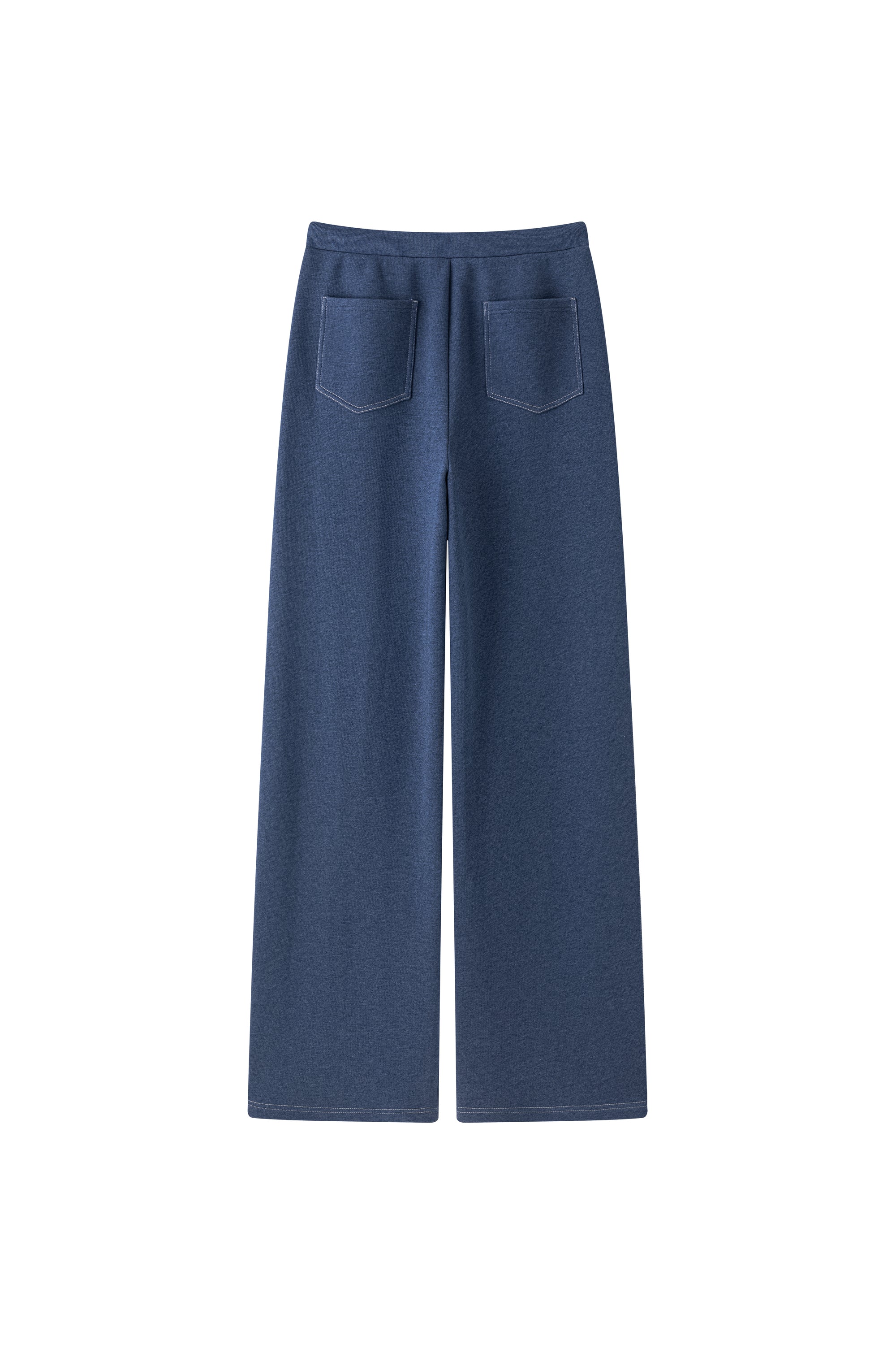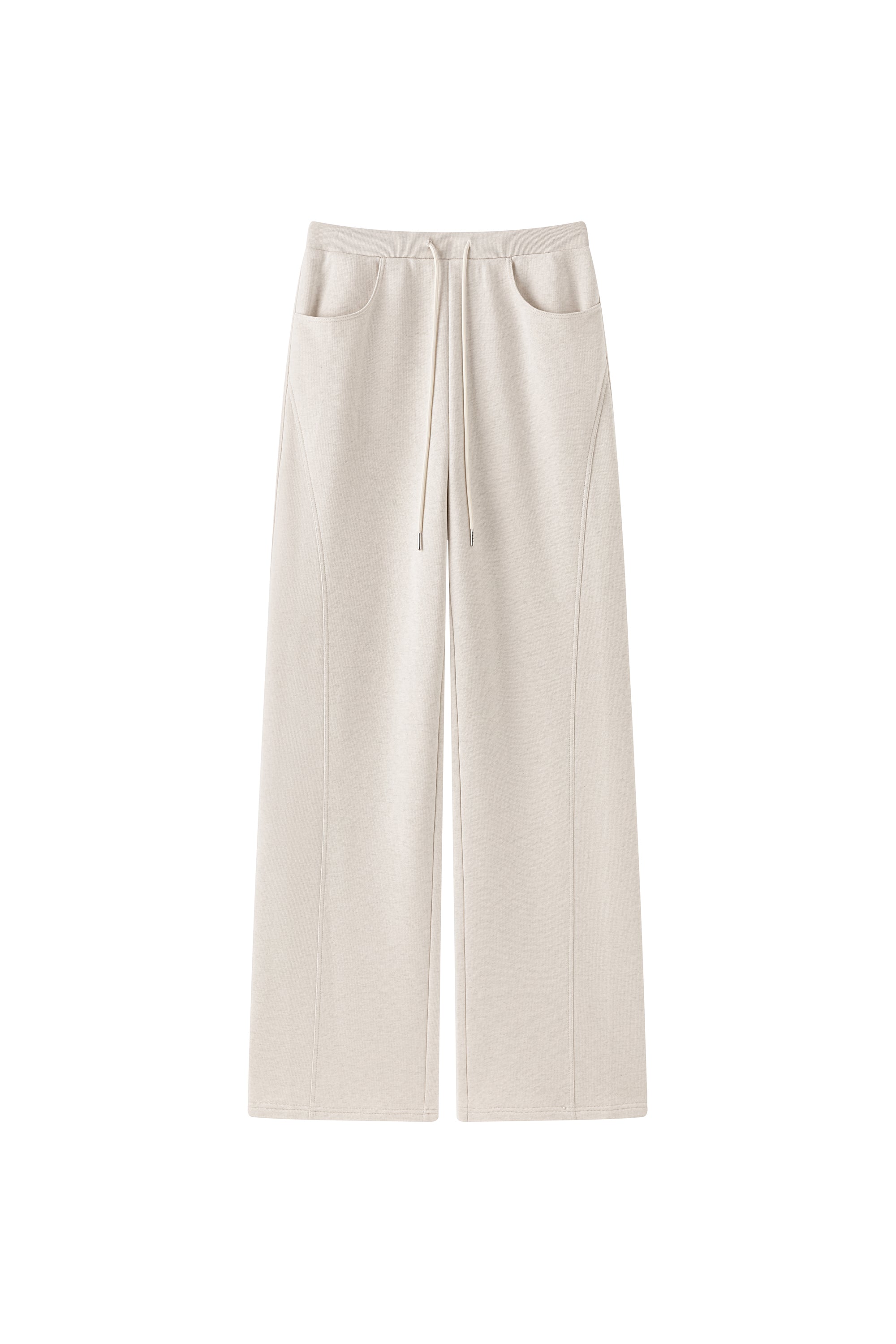 Slightly bold leg cut sweatpants with pockets in the side and front. Elastic waist. Round cut pockets.