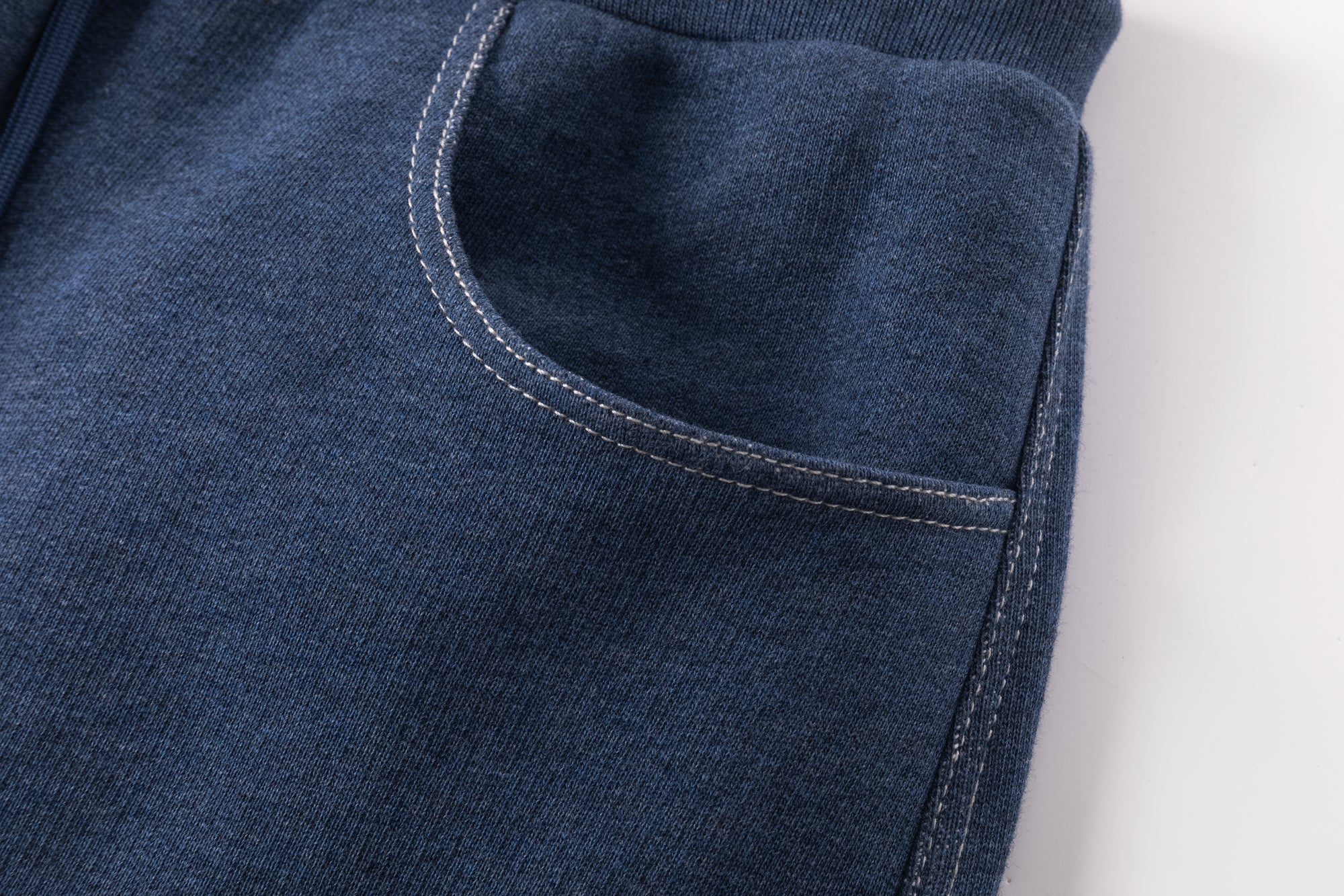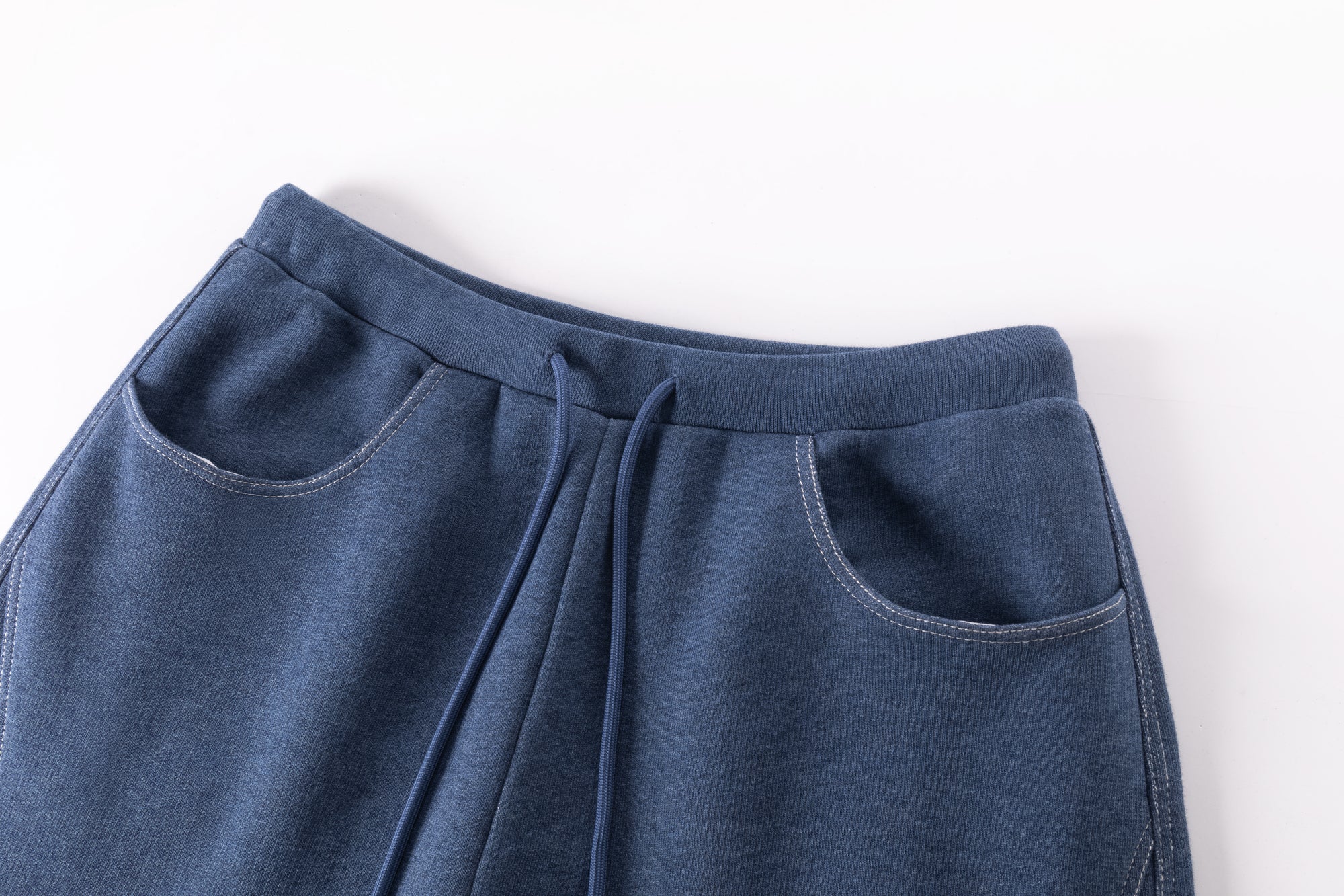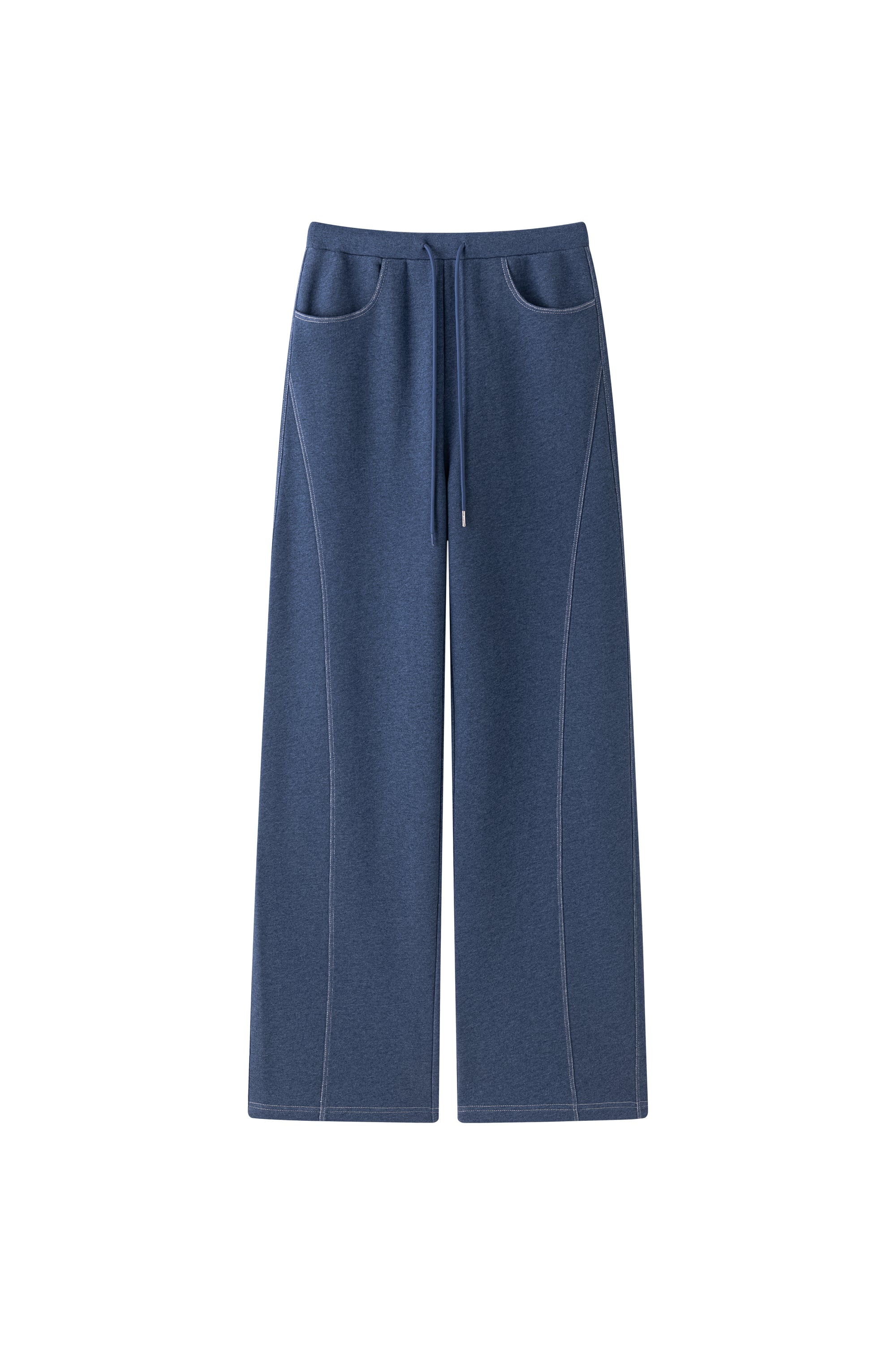 Slightly bold leg cut sweatpants with pockets in the side and front. Elastic waist. Round cut pockets.