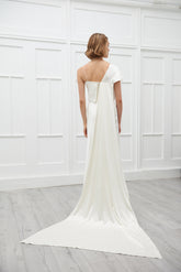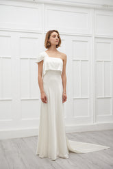 Clara wedding gown Clara dress is structured and sleek playing with asymmetr and drapings. The add on veil attached from the back is made in straight edges. One shoulder is covered with...