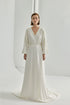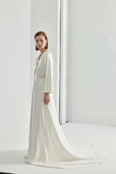 Oversized top in shiny silk and deep open back. Felicia wedding gown is perfect for the bride who wants something oversized, minimalistic and classic. The deep V neck in front and back m...
