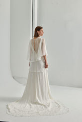 Iris wedding gown is the most dreamy and angel like gown of all VC dresses. The sheer wrinkled silk chiffon are layered from top to bottom. Starting with a sheer cape covering the deep V...
