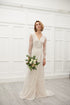 Embedded pearl lace with nude color lining. The wrap style with deep V creates a modern and elegant look for the bride who's seeking something romantic but st...