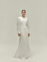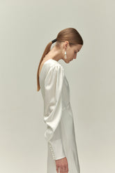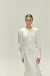 Leia wedding gown is made in shiny 19mm stretch silk. The draped puff sleeves and covered buttons gives the dress a vintage yet modern look perfect for the modern bride and classic bride...