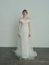 This romantic gown features an off-shoulder silhouette crafted from layered lace and airy tulle, creating a delicate, ethereal effect. The fitted corset bodice is complemented by long sl...