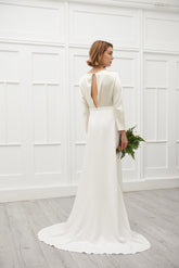 The upper part is made in glossy stretch silk and the bottom part in the thick silk crepe. The back is open with embedded pearl details. It's one of our more e...