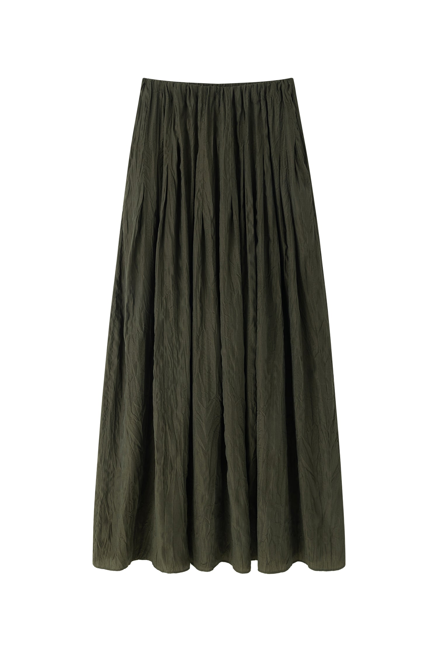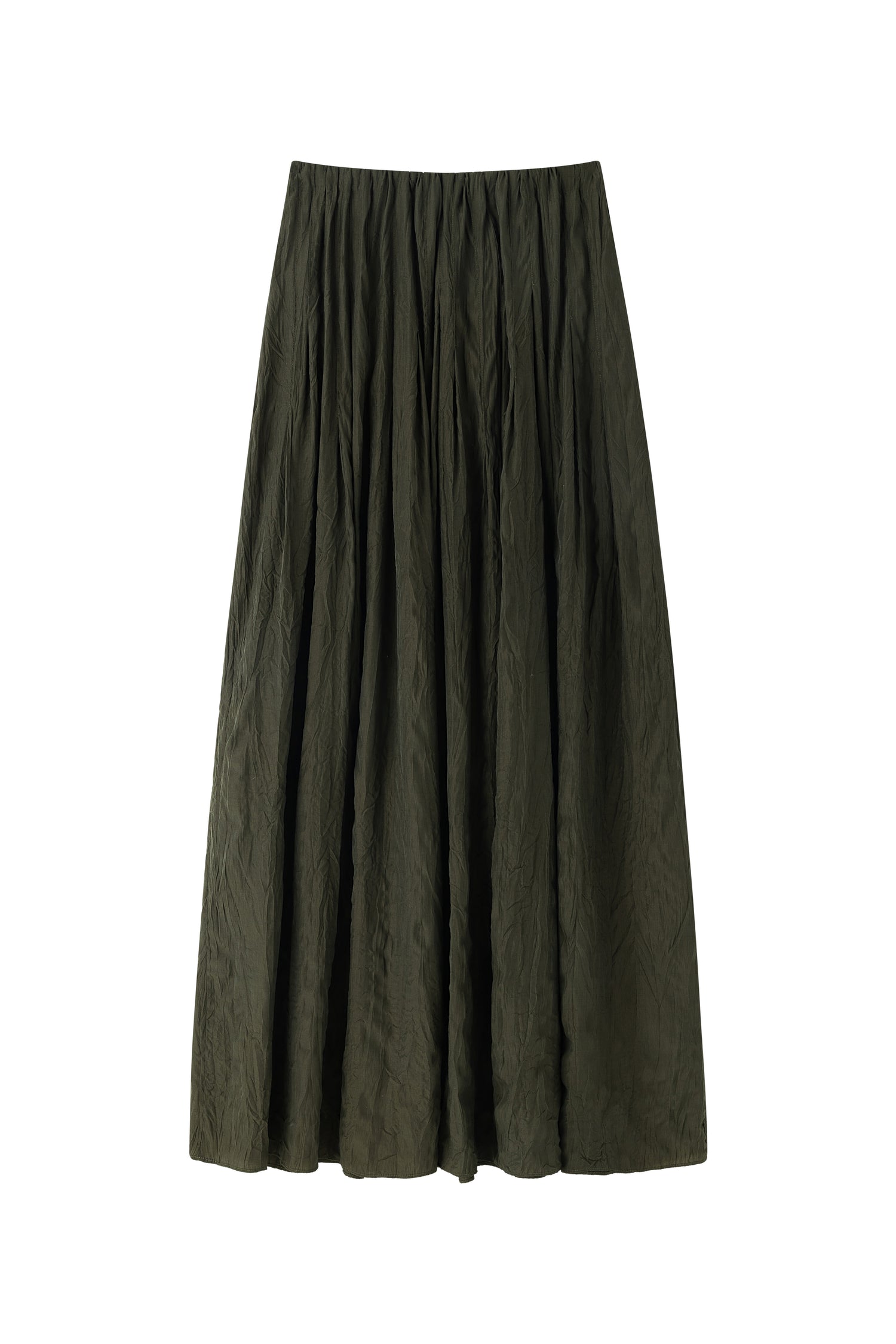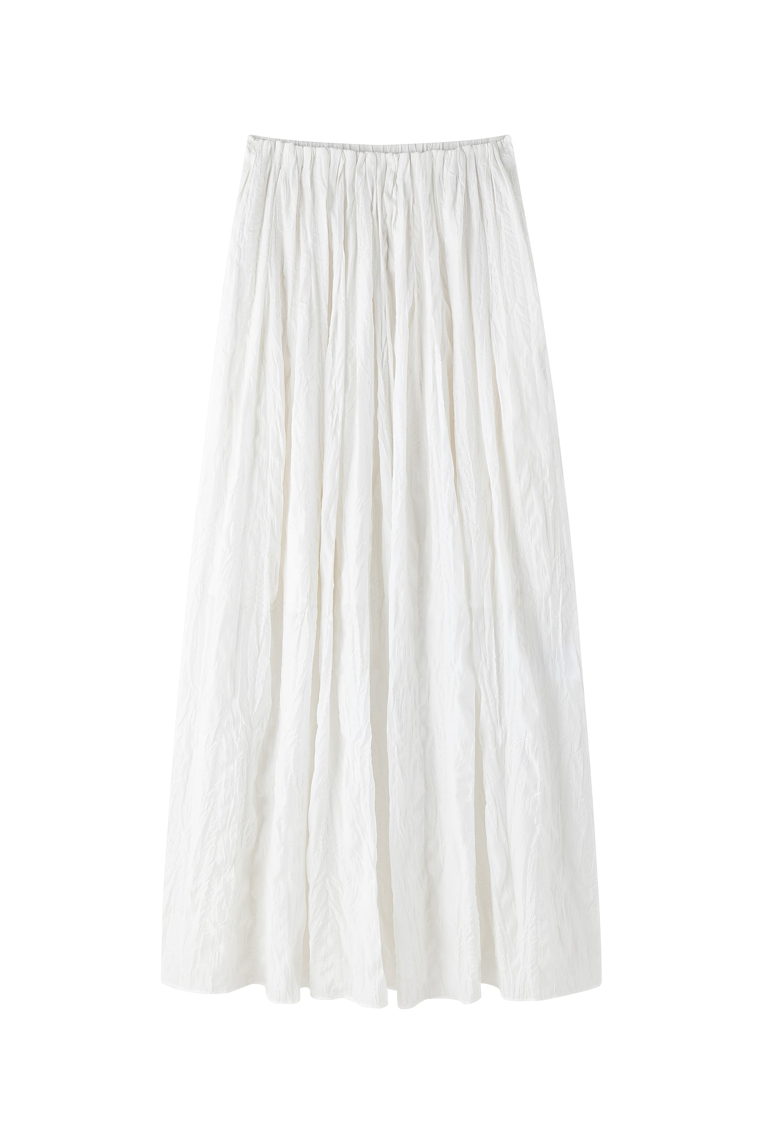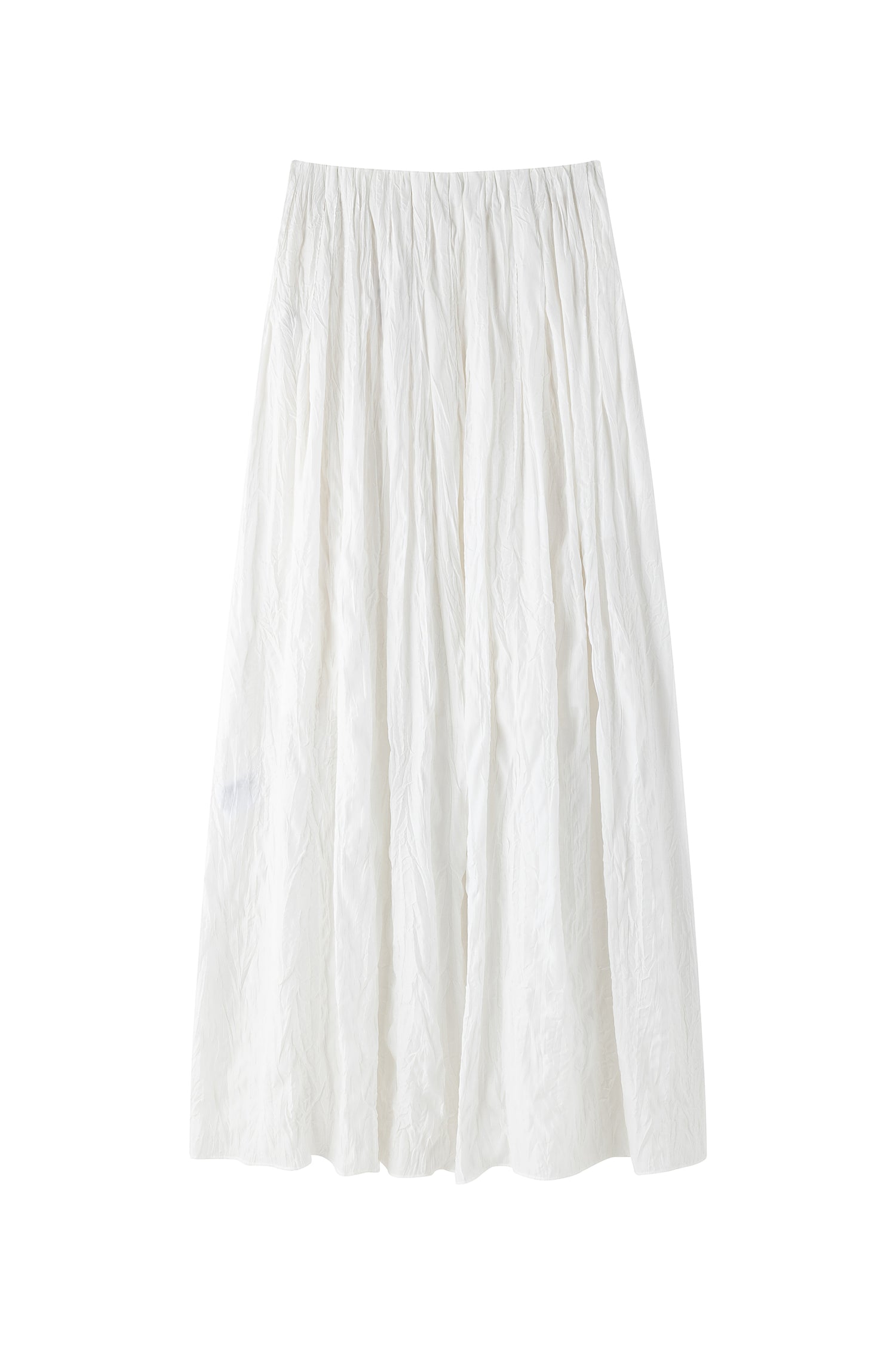 Crafted from an airy crinkled fabric, this long skirt offers a light, breathable feel with natural texture. Designed for ease and fluidity, it drapes softly along the body