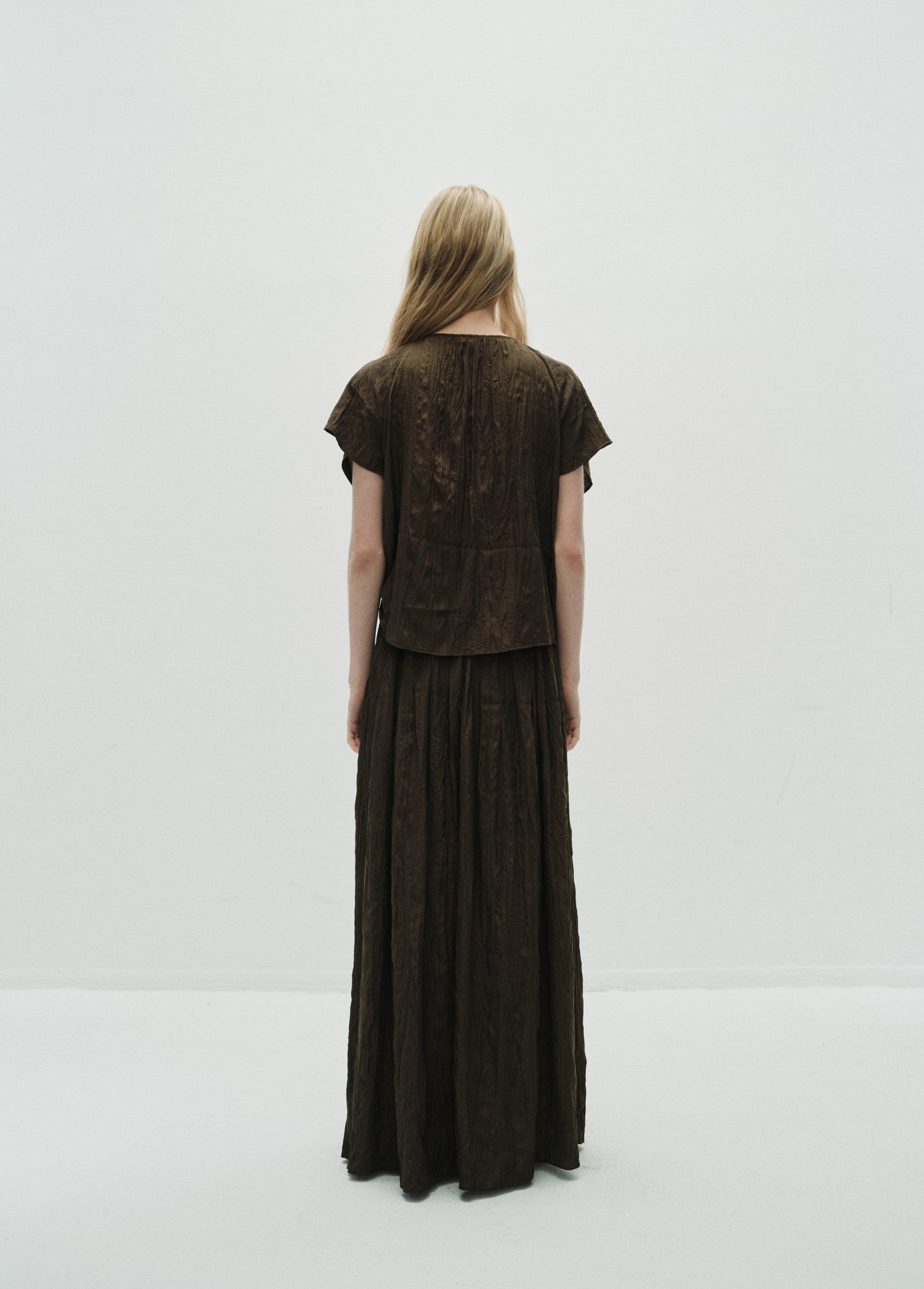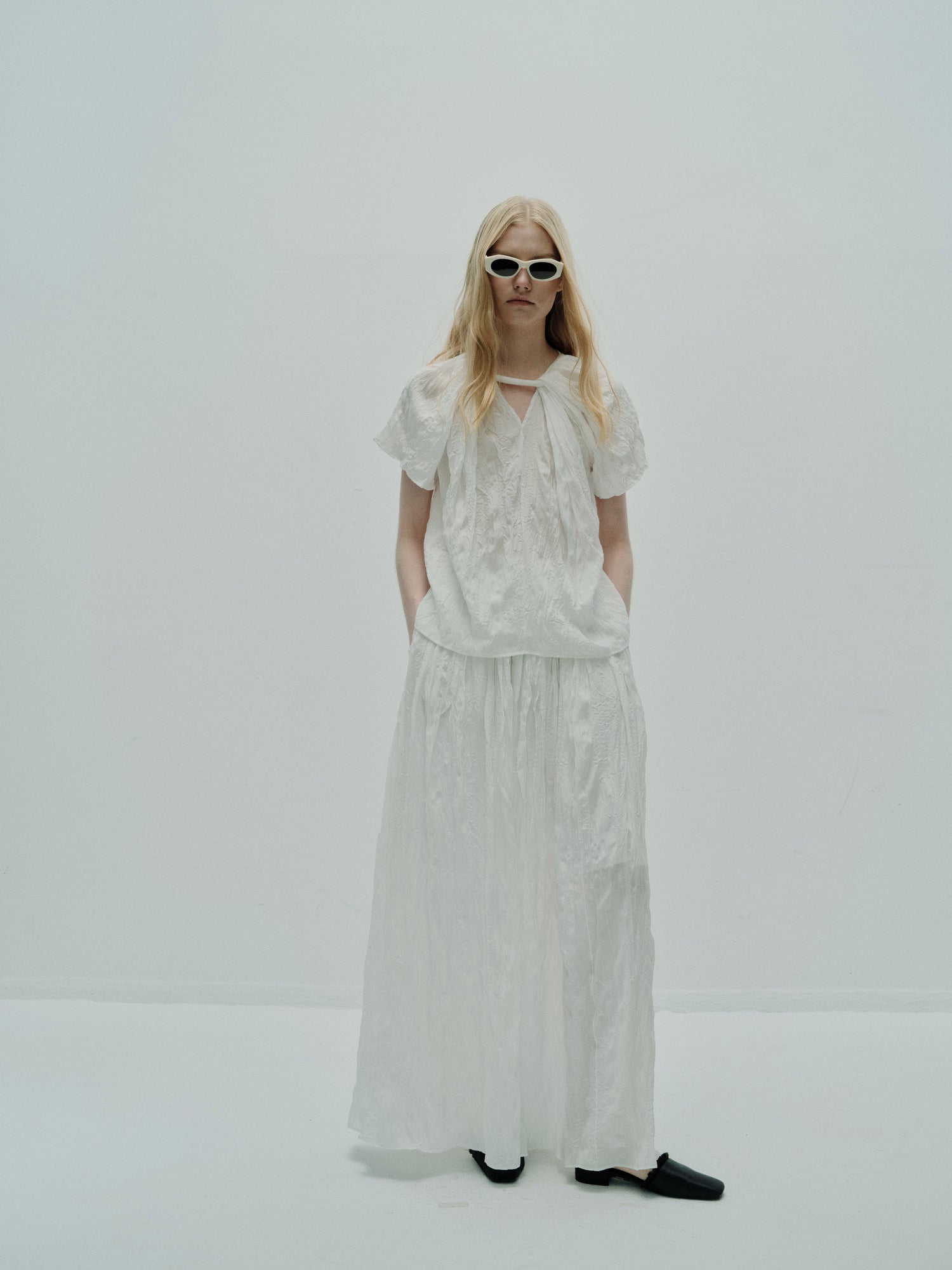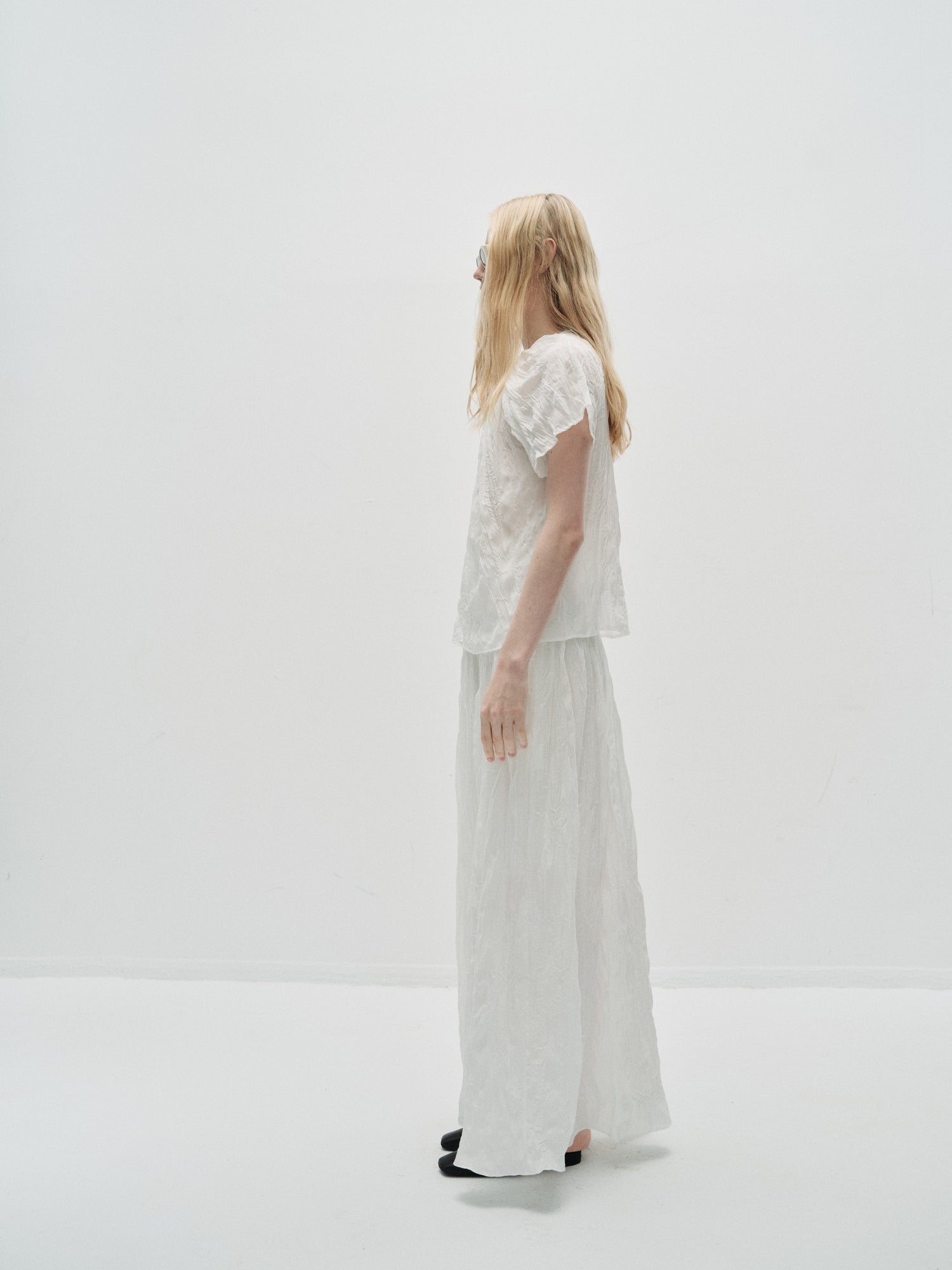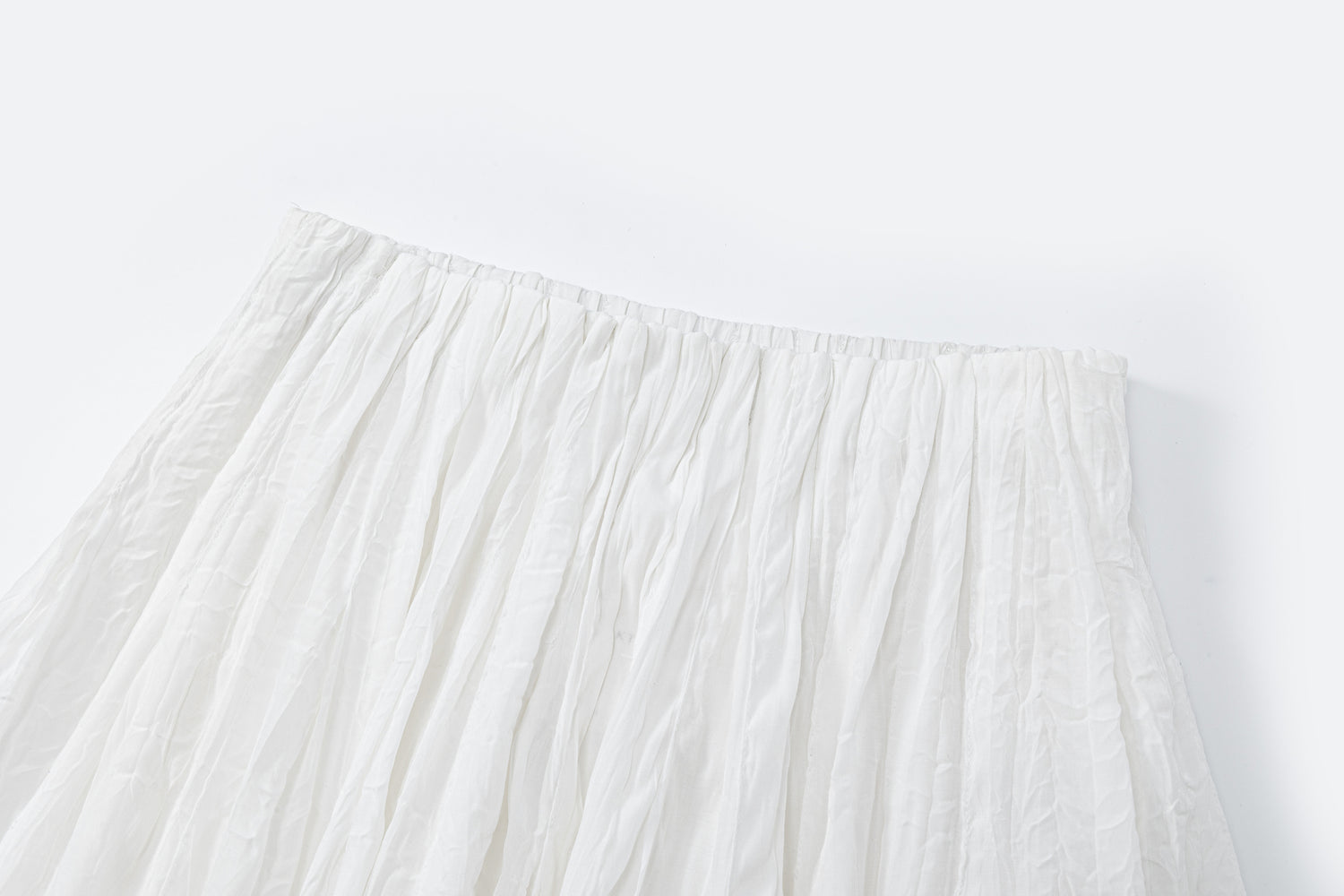 Crafted from an airy crinkled fabric, this long skirt offers a light, breathable feel with natural texture. Designed for ease and fluidity, it drapes softly along the body