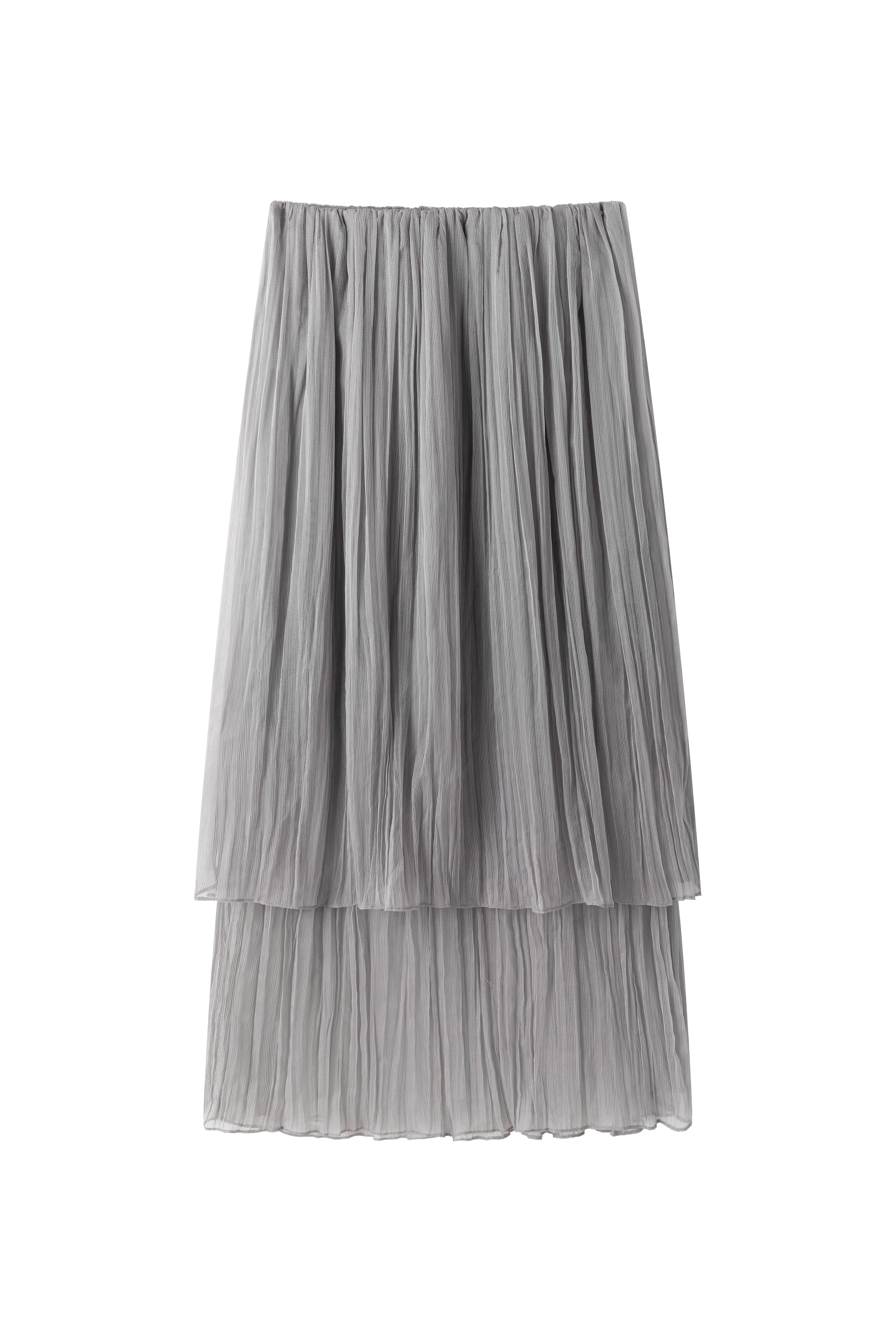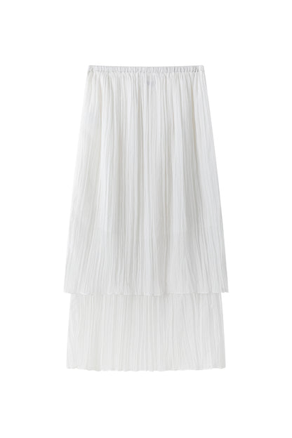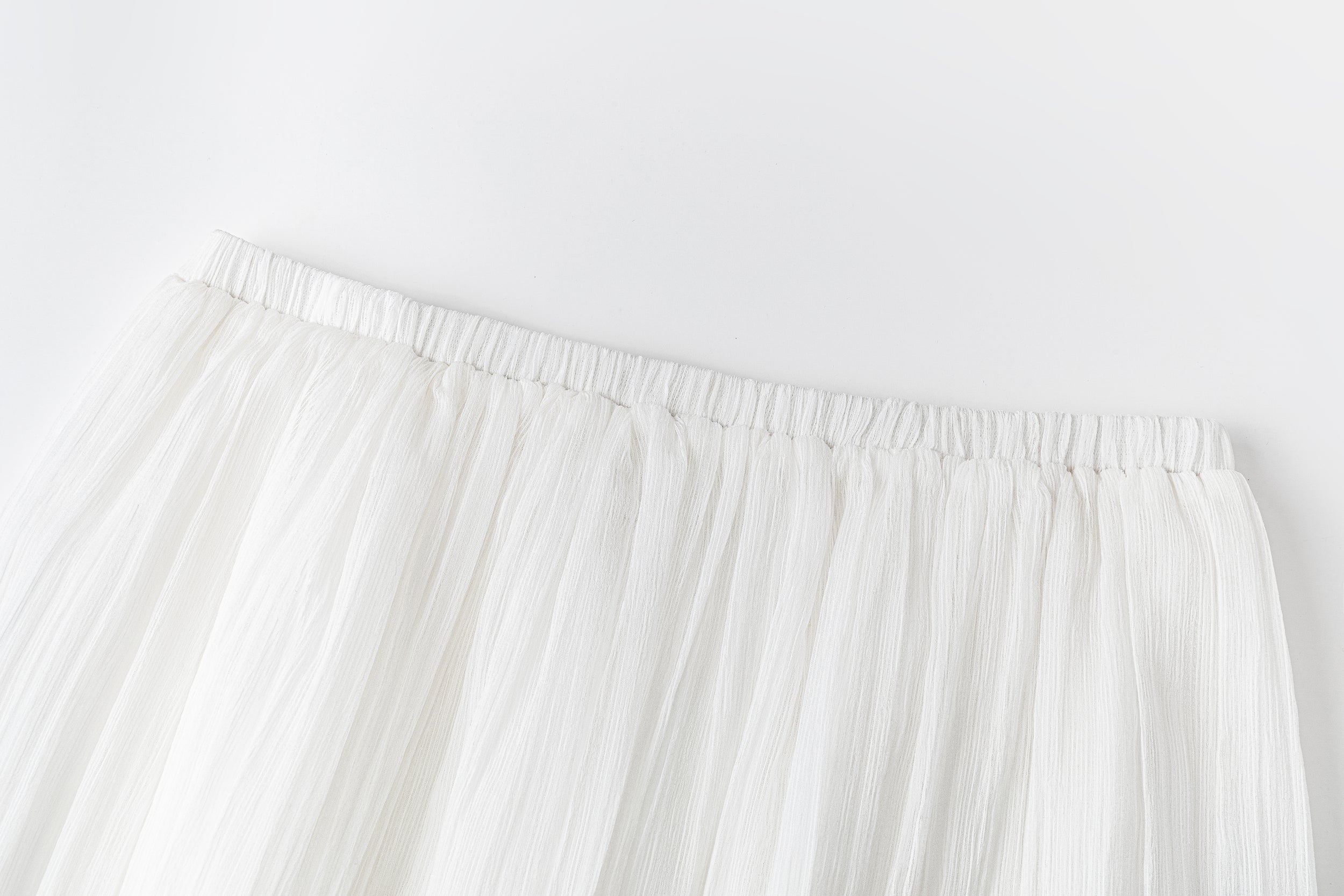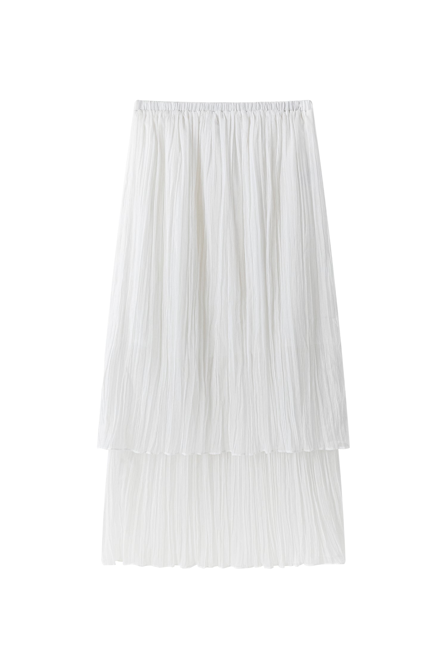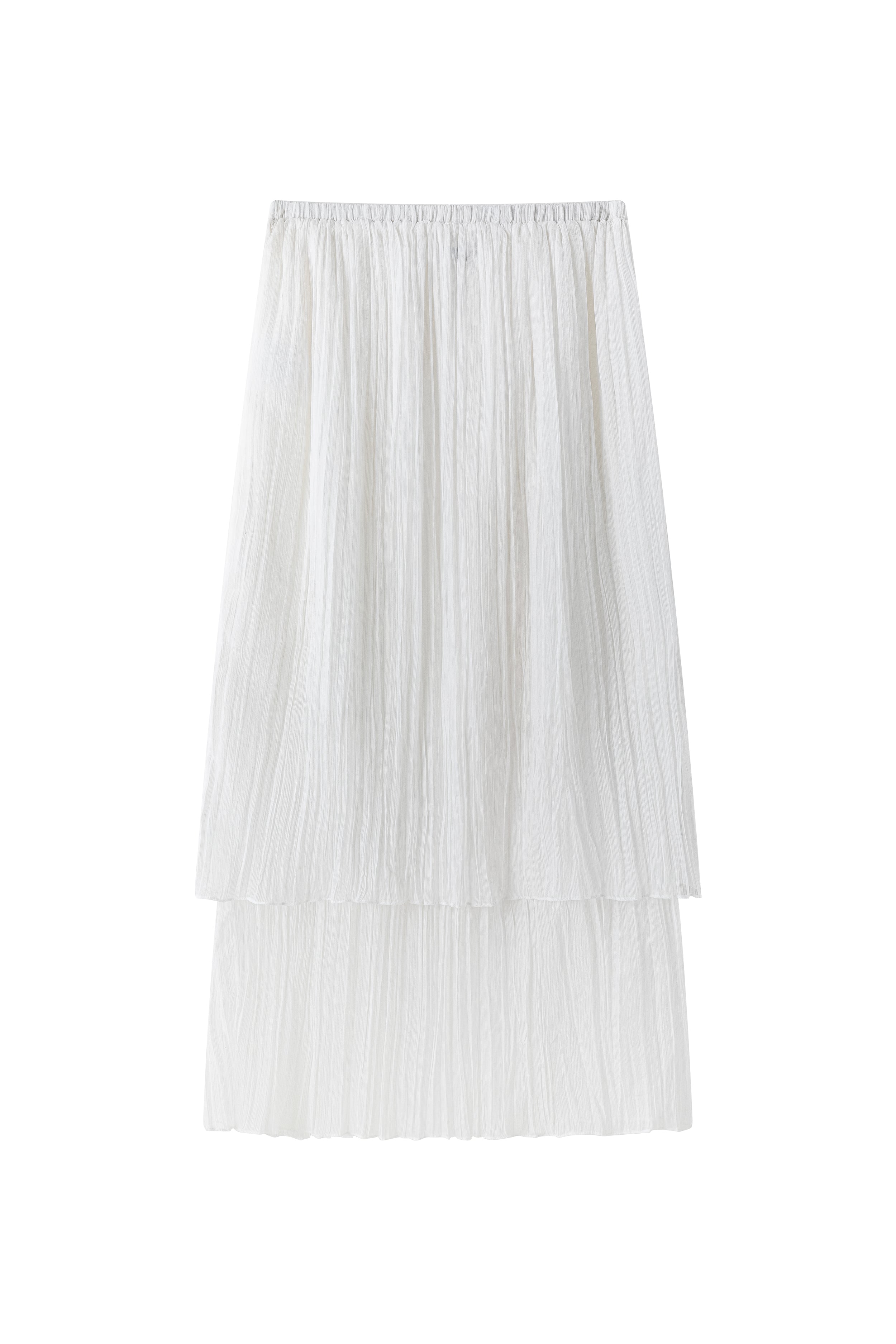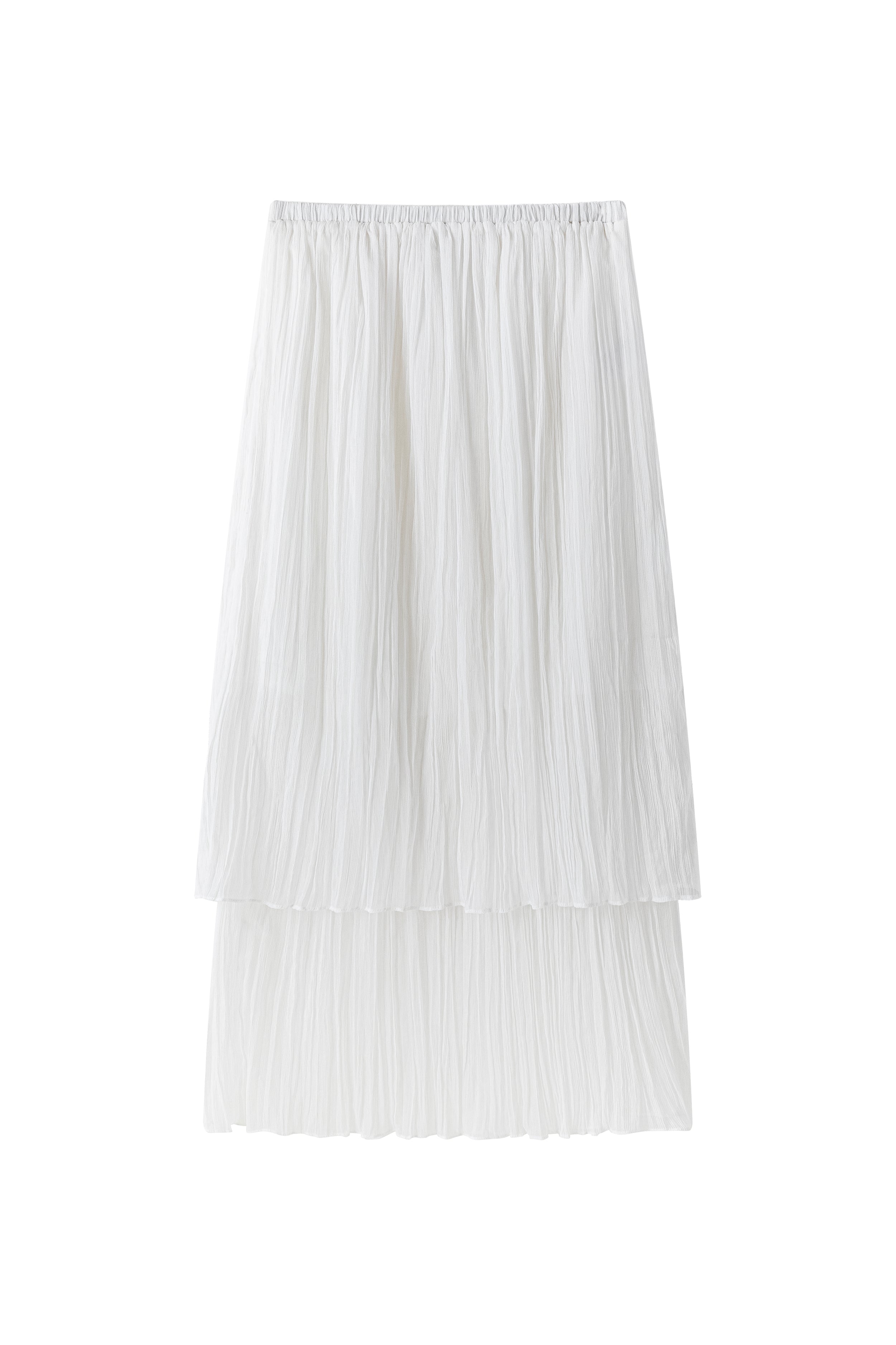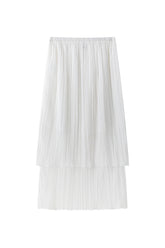 Double-layered sheer skirt with a soft pleated texture. Designed with a scalloped hem and elastic waistband for comfort. Lightweight and fluid, pairs with the matching blouse