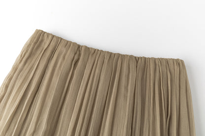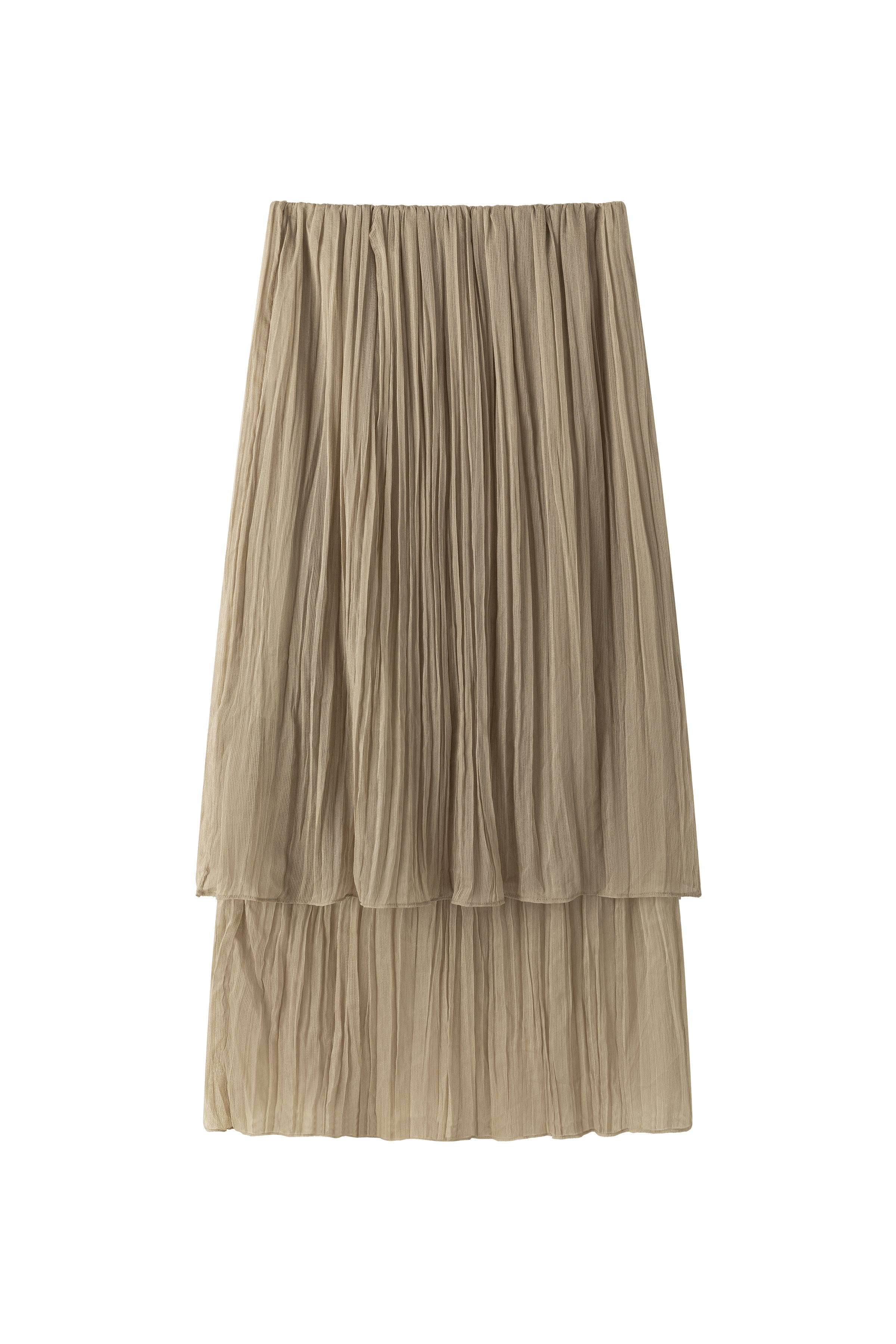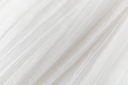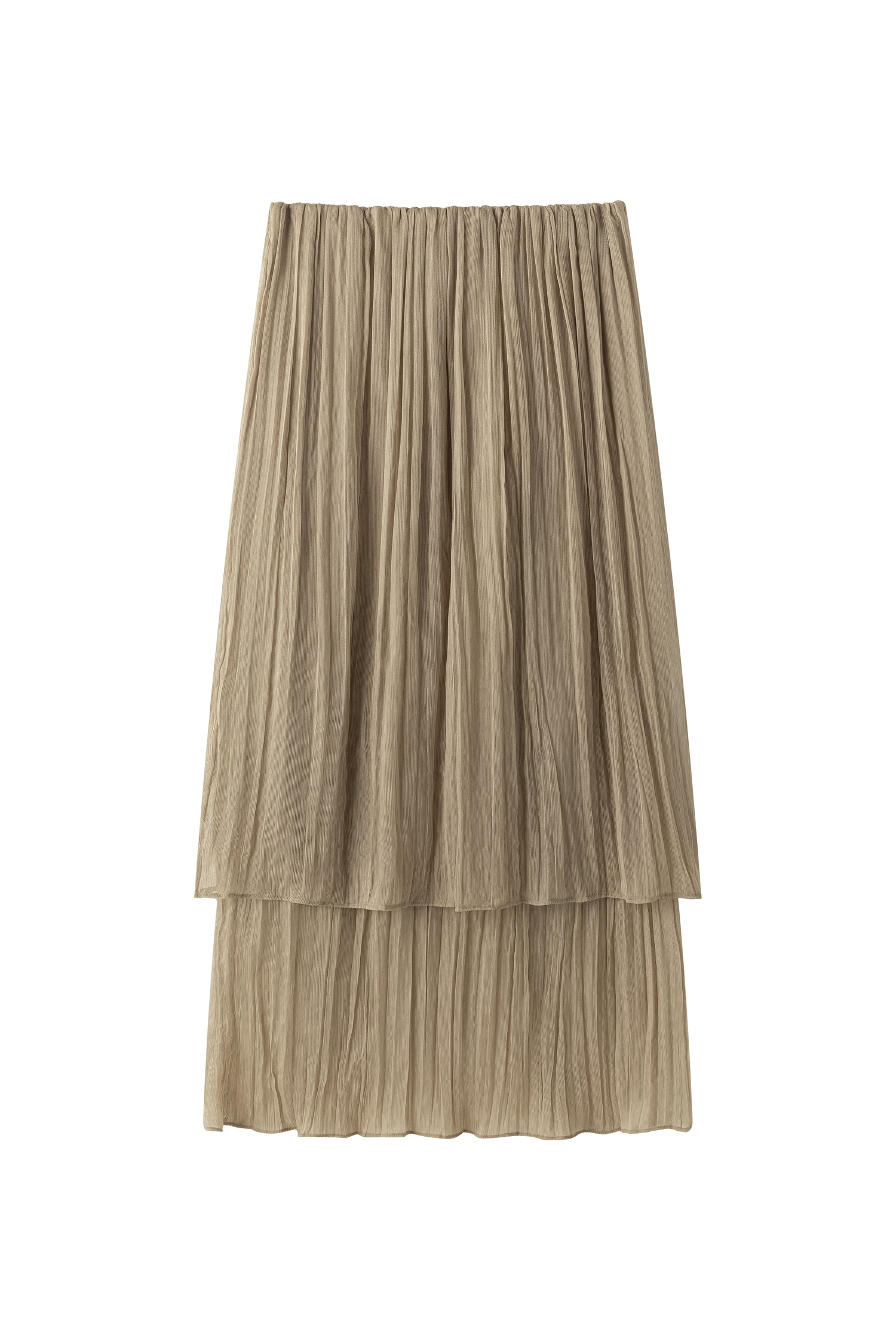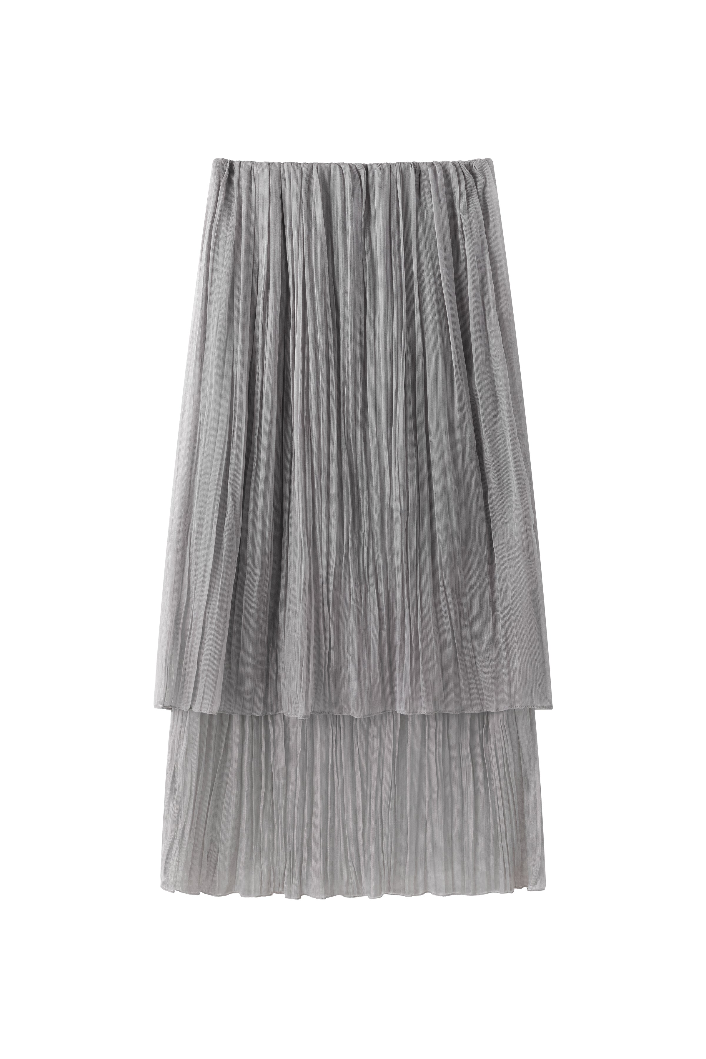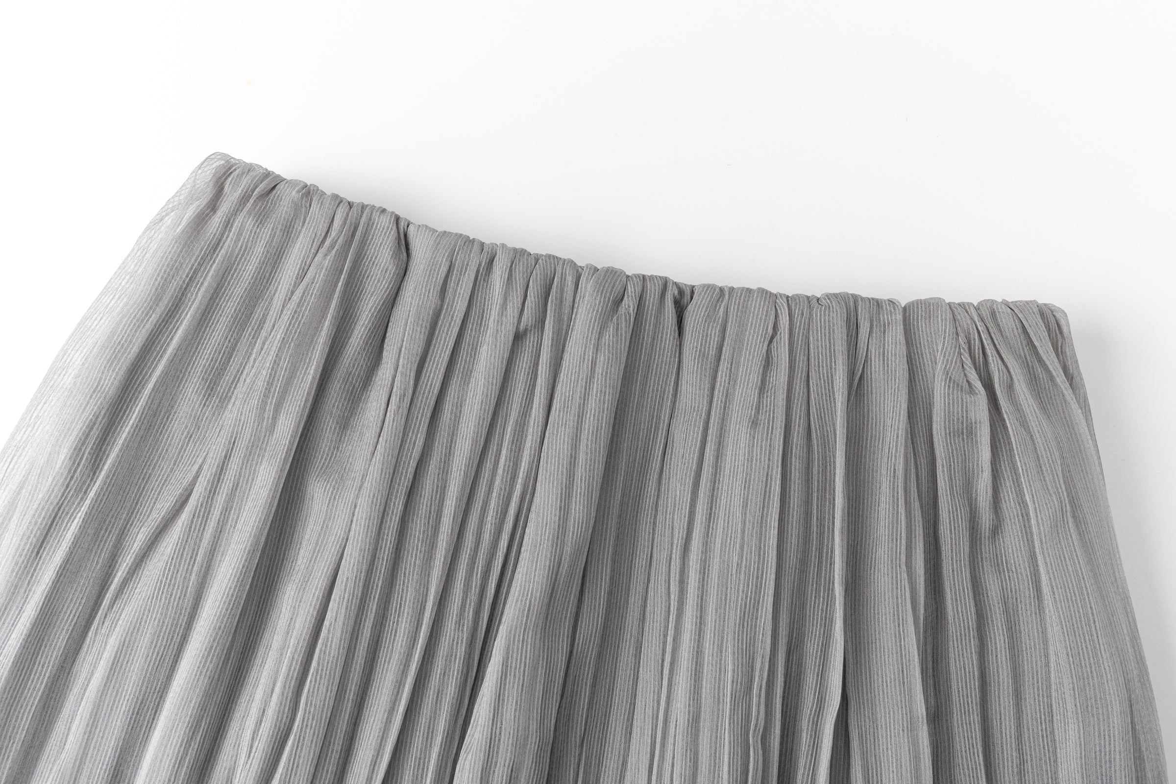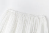 Double-layered sheer skirt with a soft pleated texture. Designed with a scalloped hem and elastic waistband for comfort. Lightweight and fluid, pairs with the matching blouse