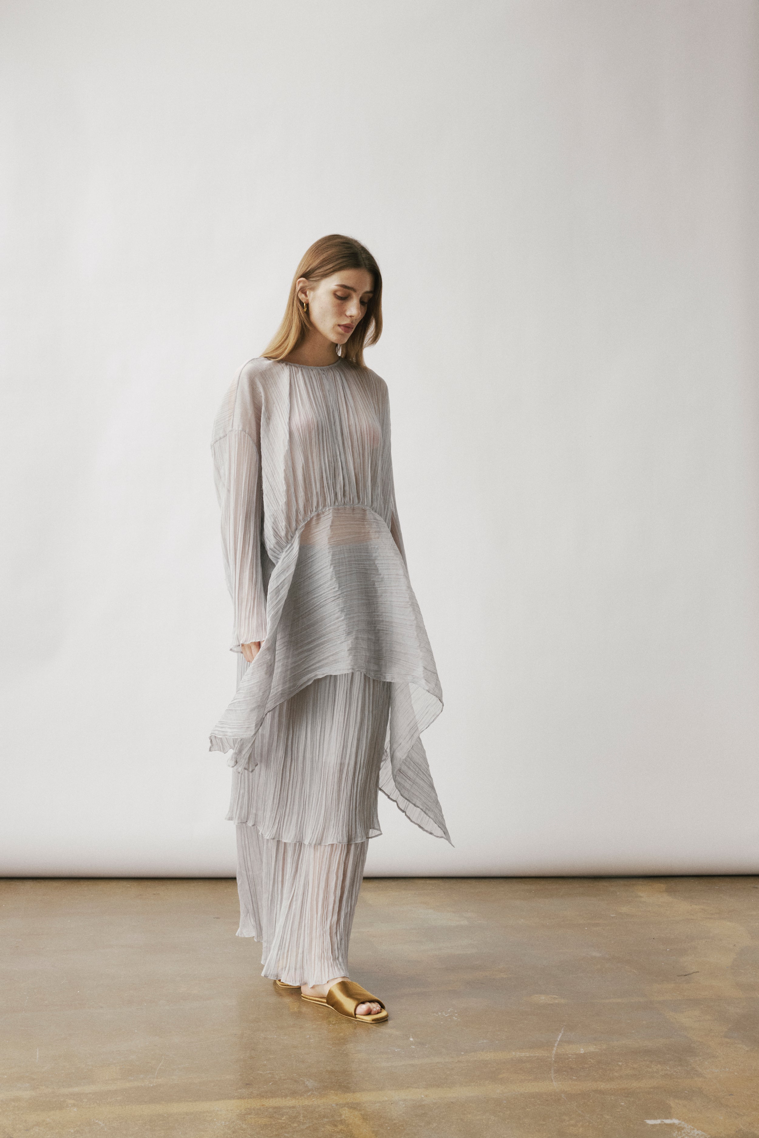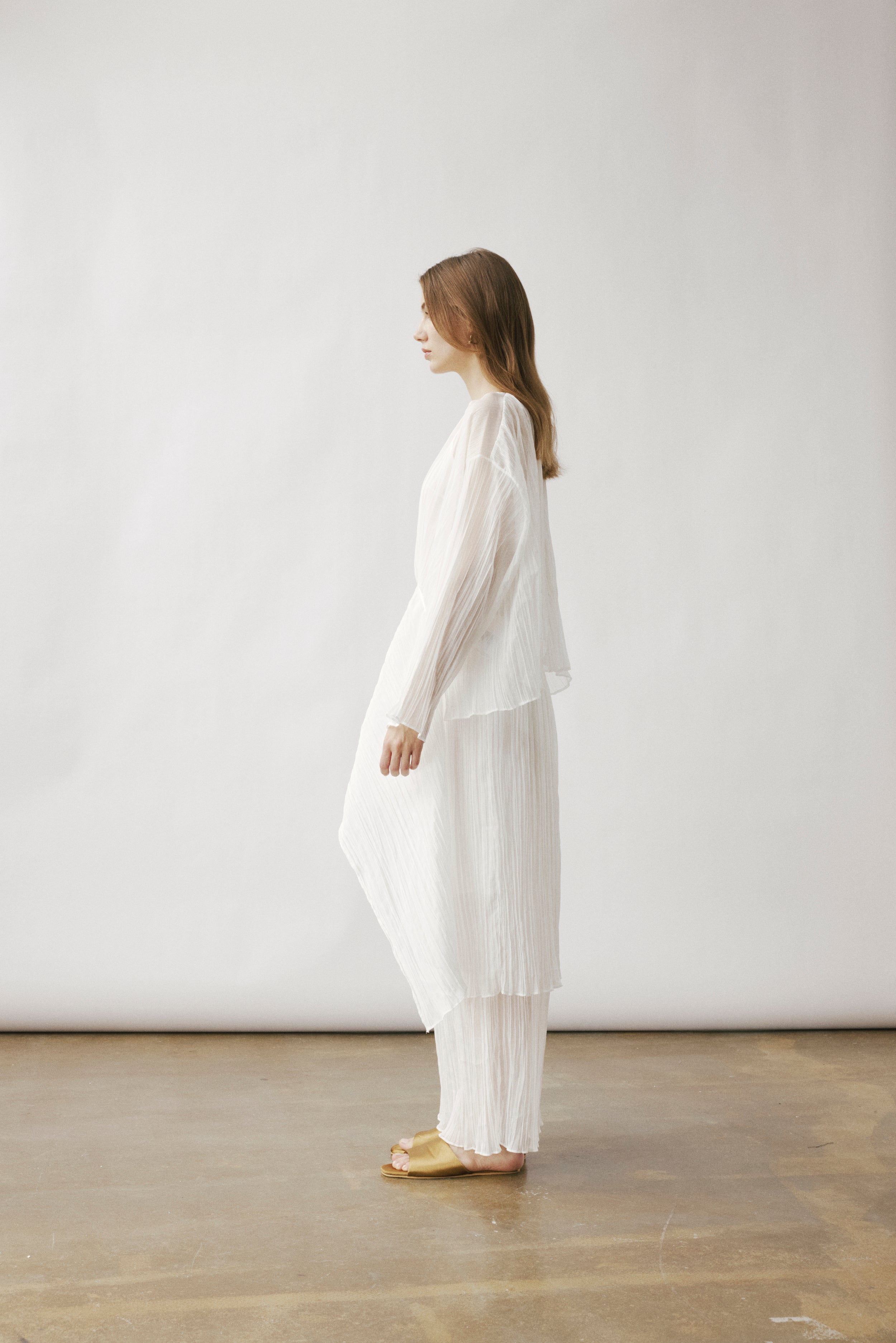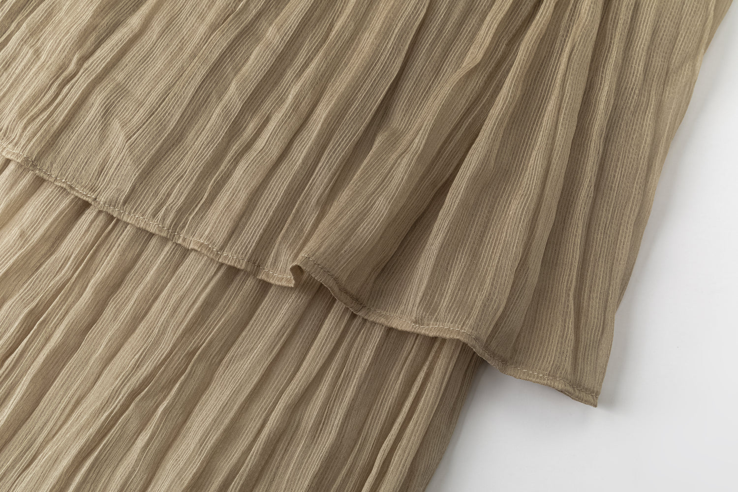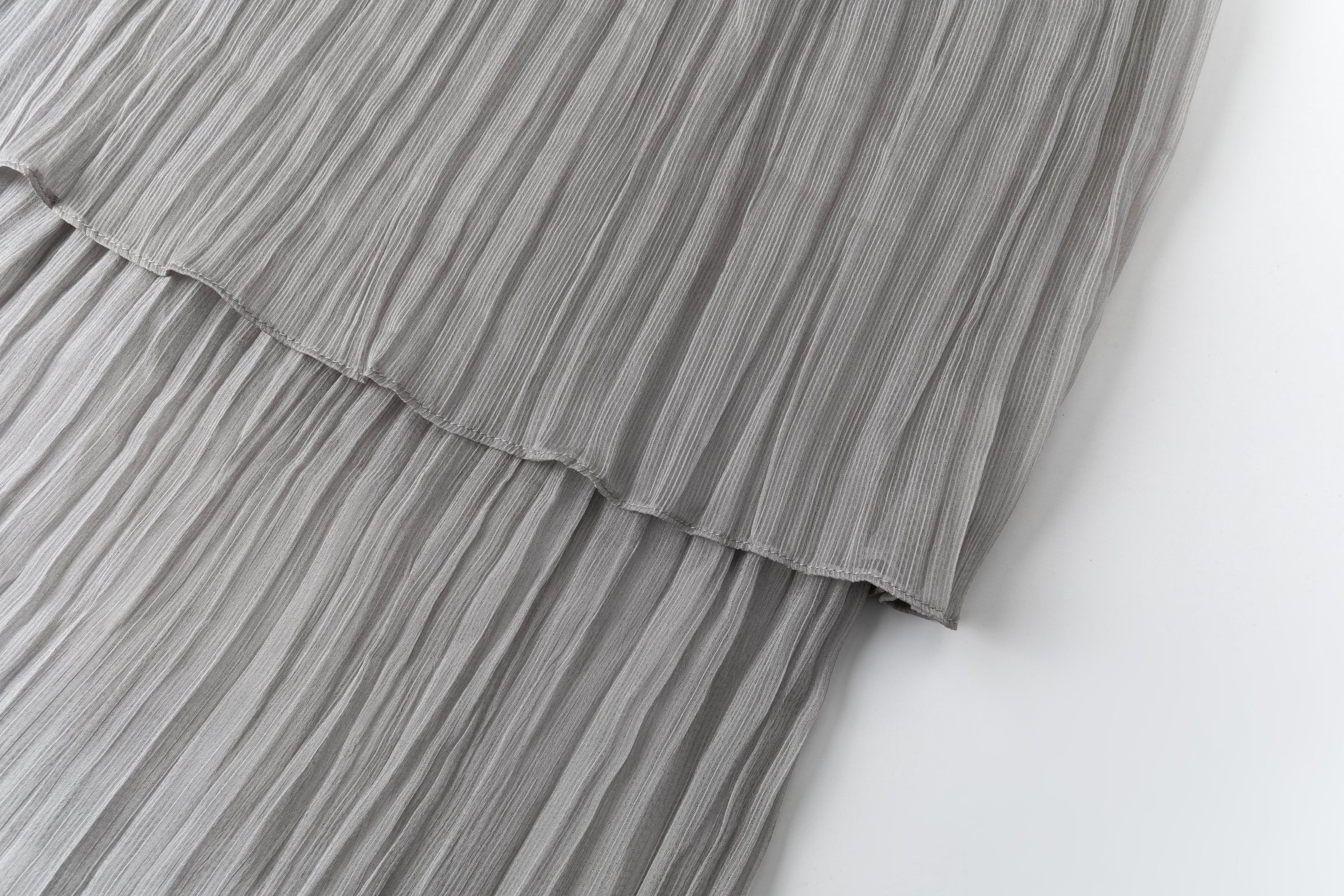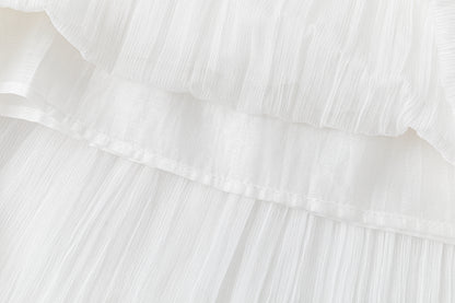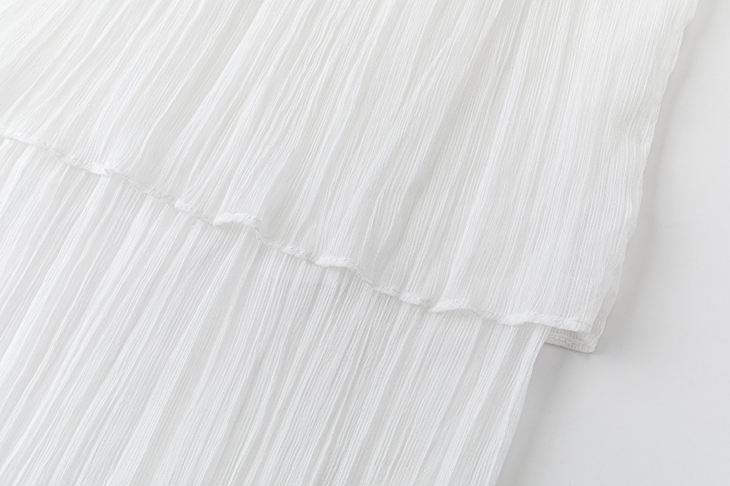 Double-layered sheer skirt with a soft pleated texture. Designed with a scalloped hem and elastic waistband for comfort. Lightweight and fluid, pairs with the matching blouse