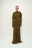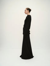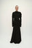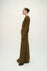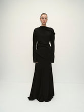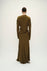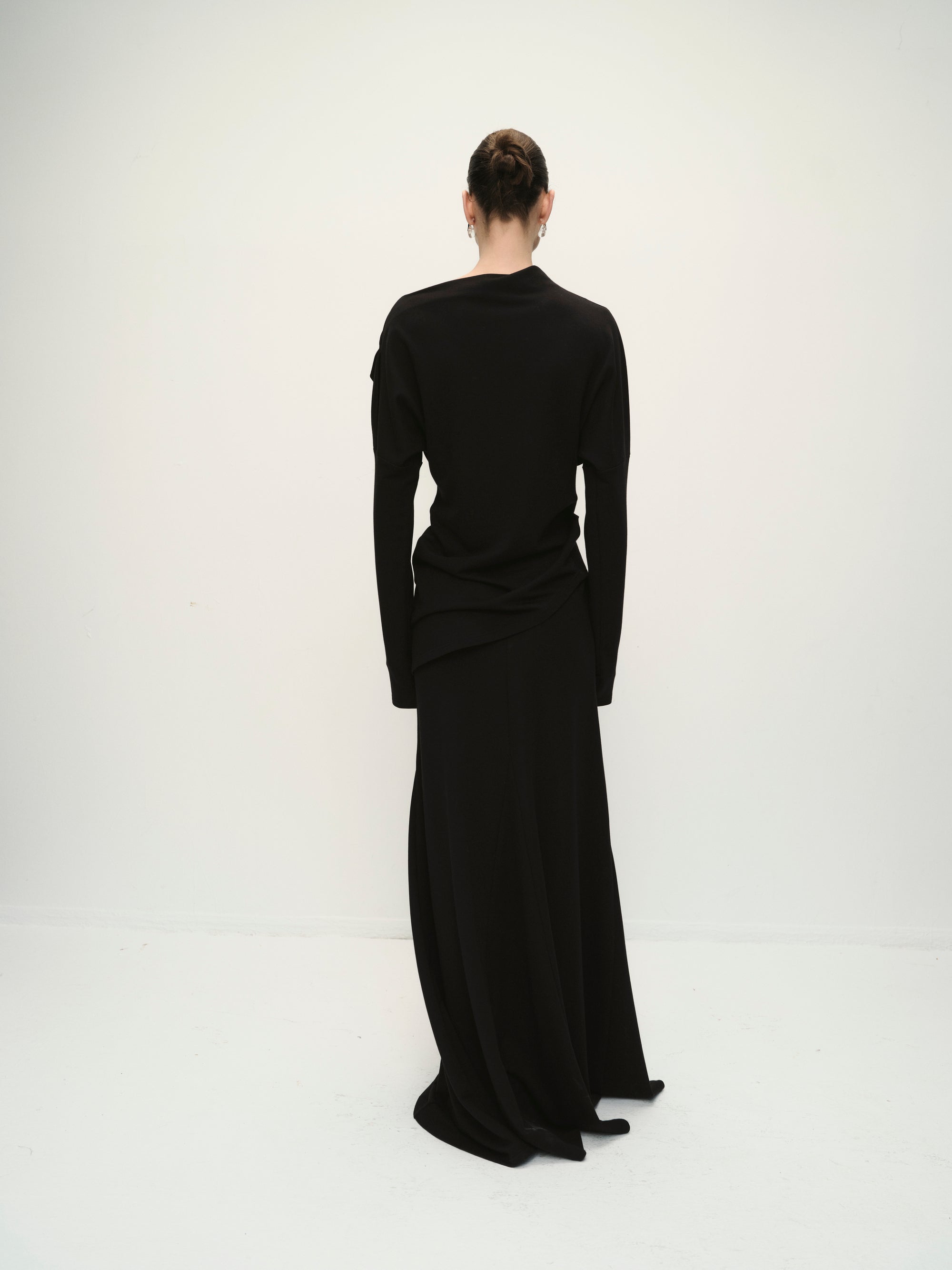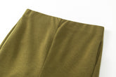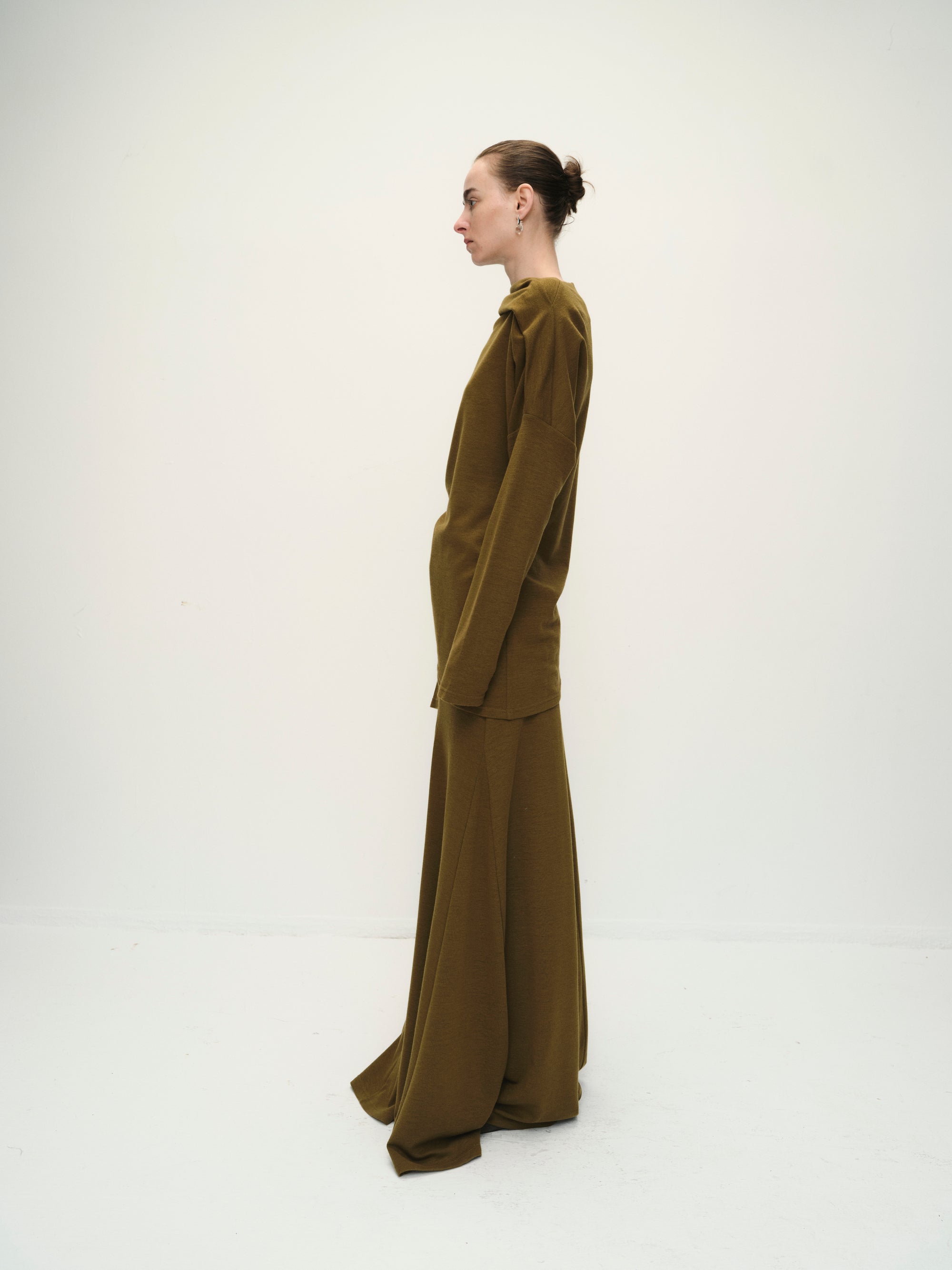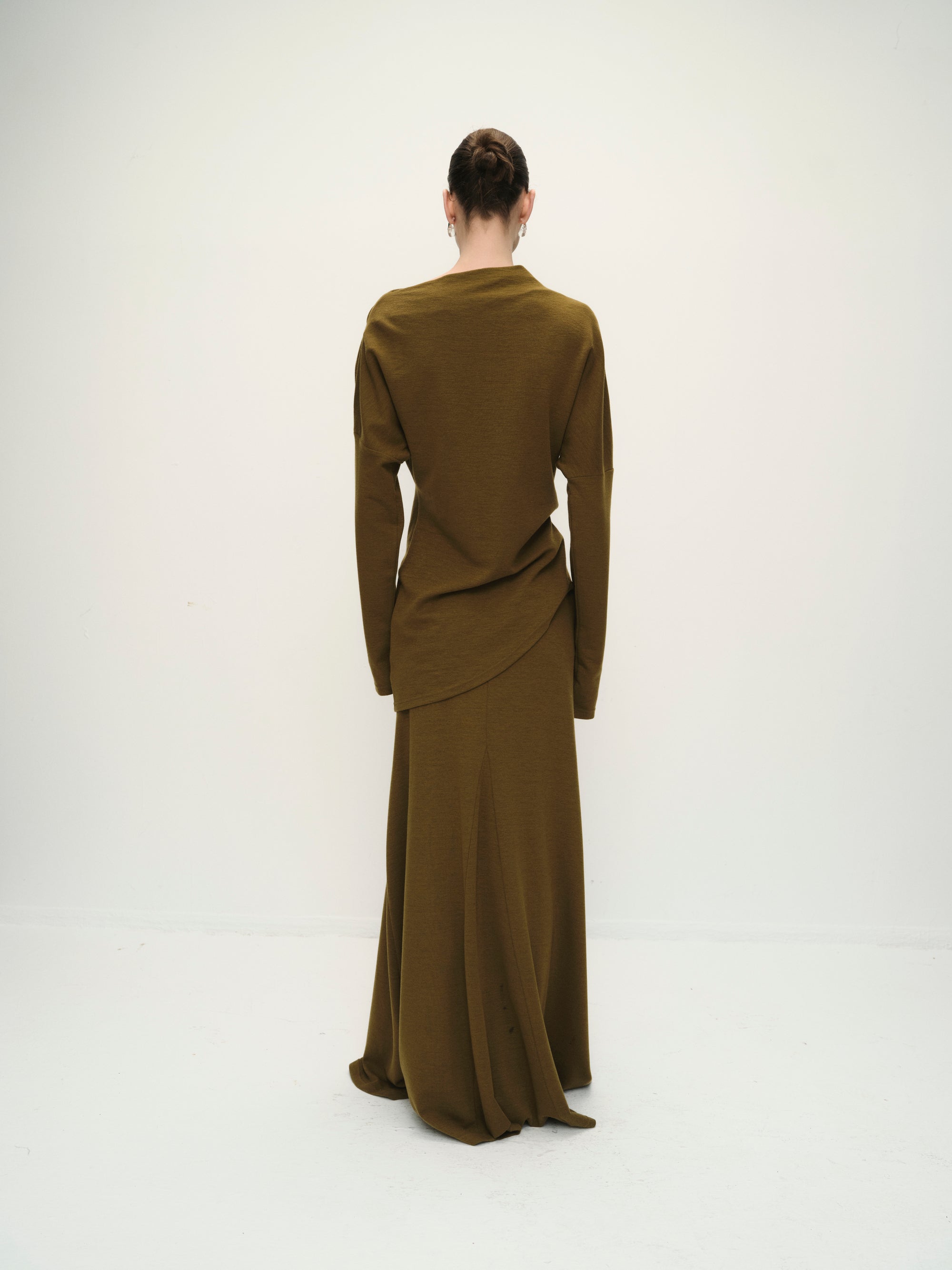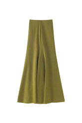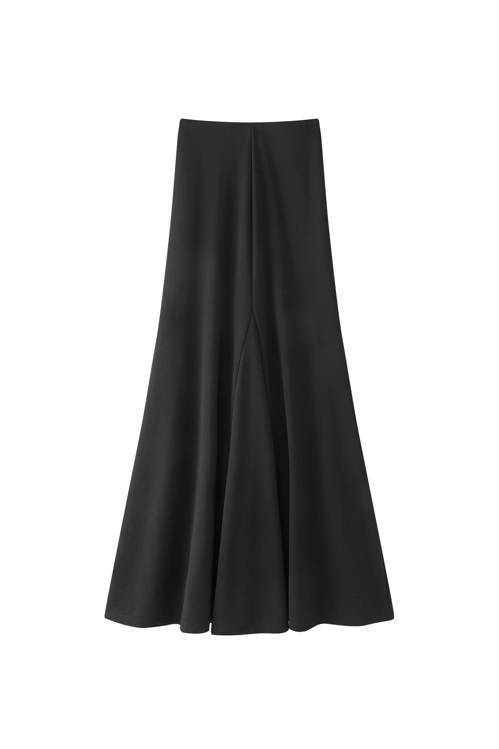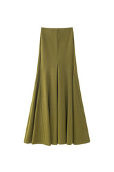 High-waisted A-line skirt that drapes elegantly and flares out gently from the hips. The front seam detail adds subtle structure and a modern touch to the overall look.