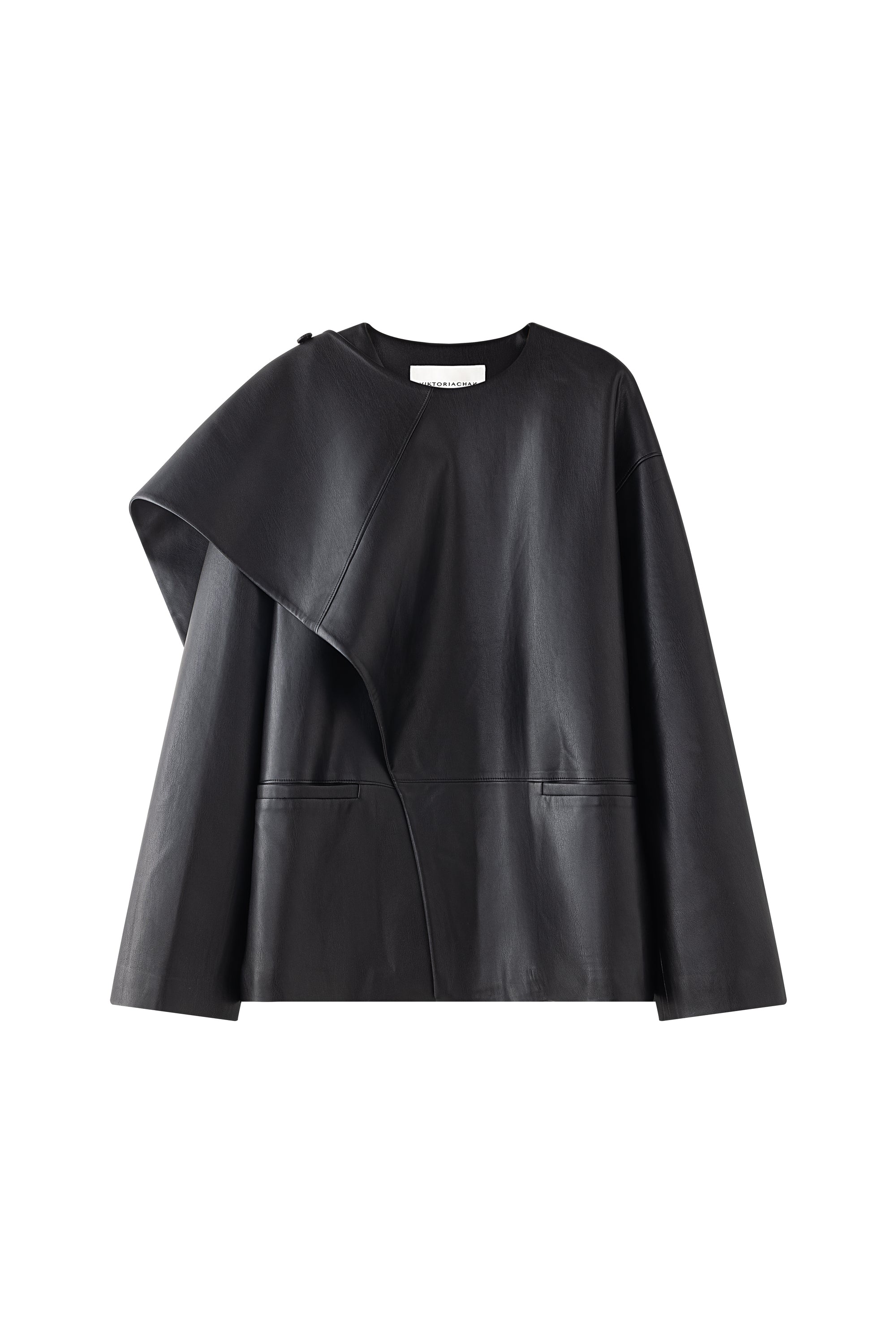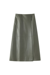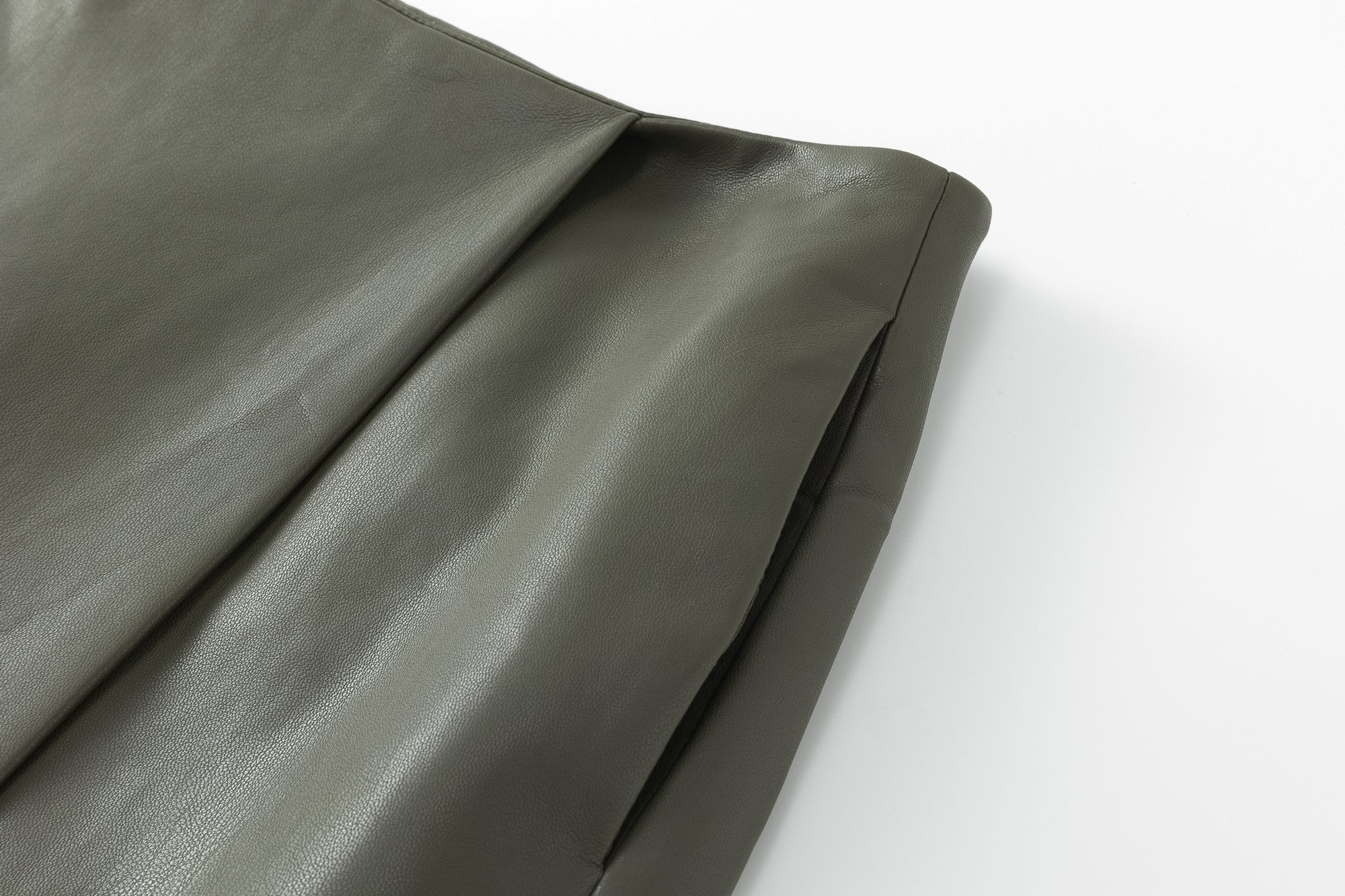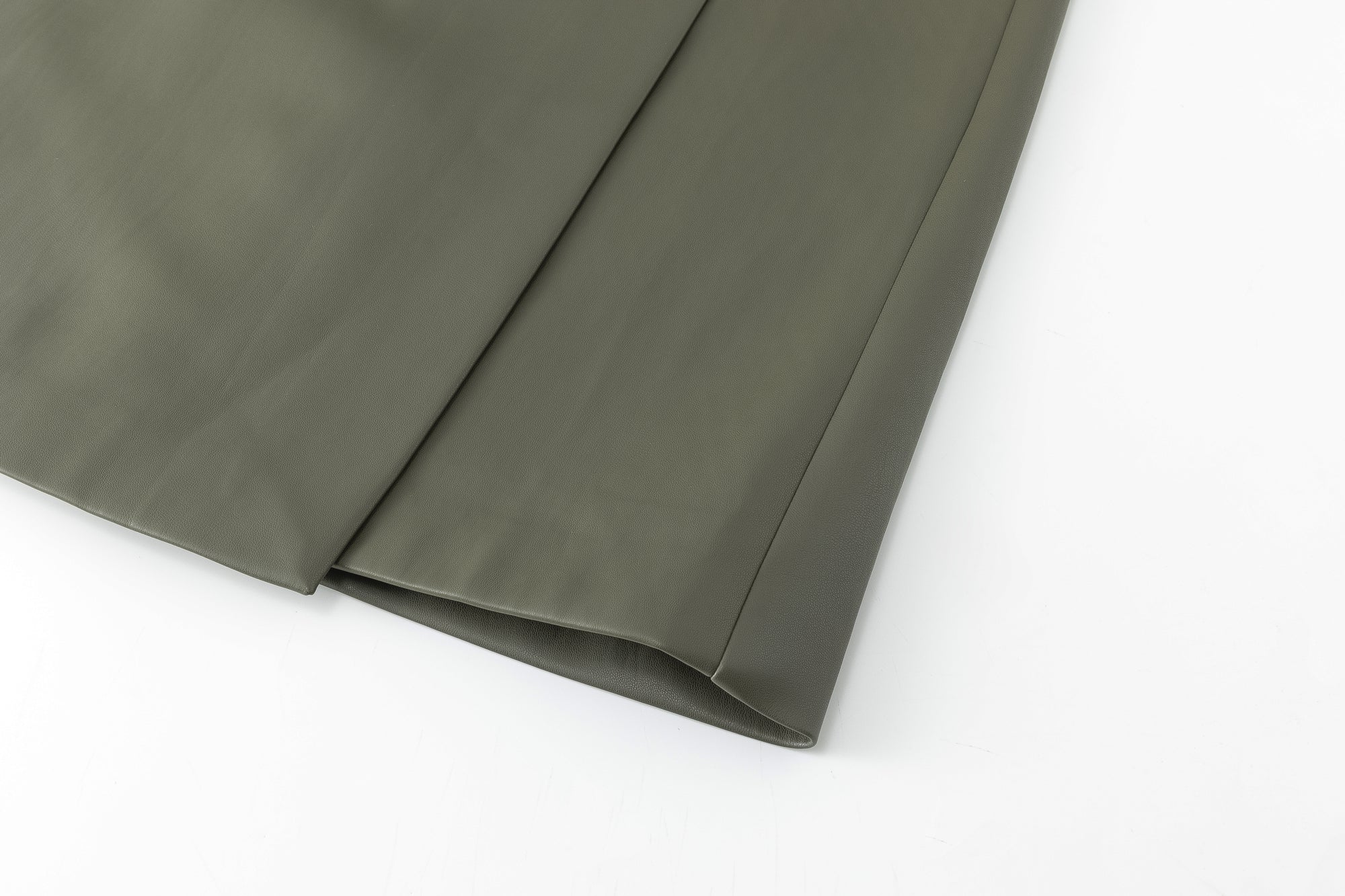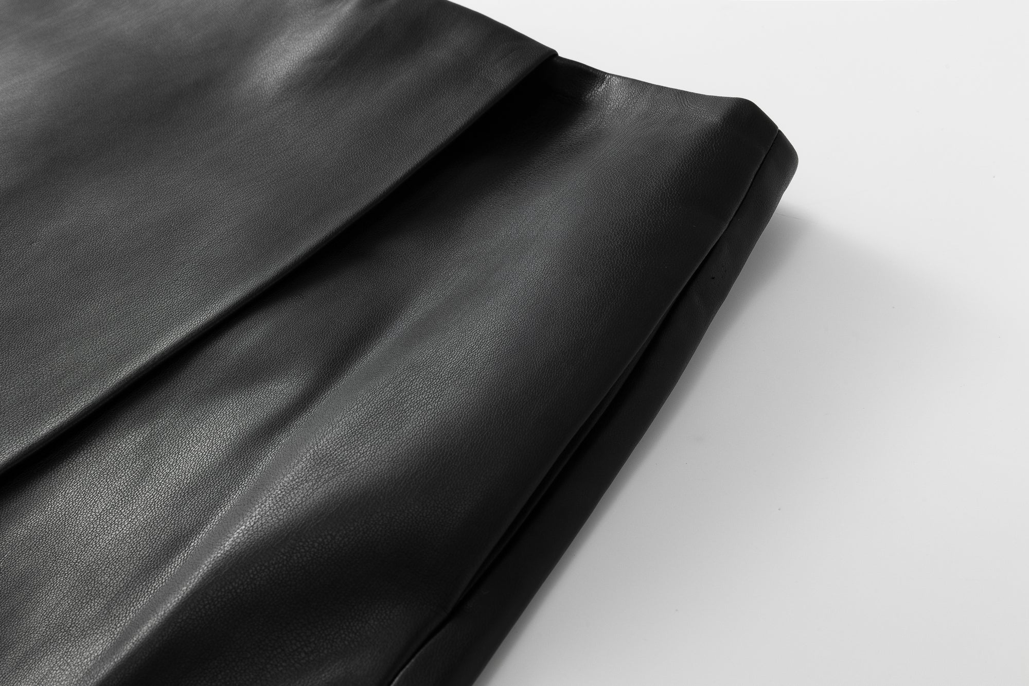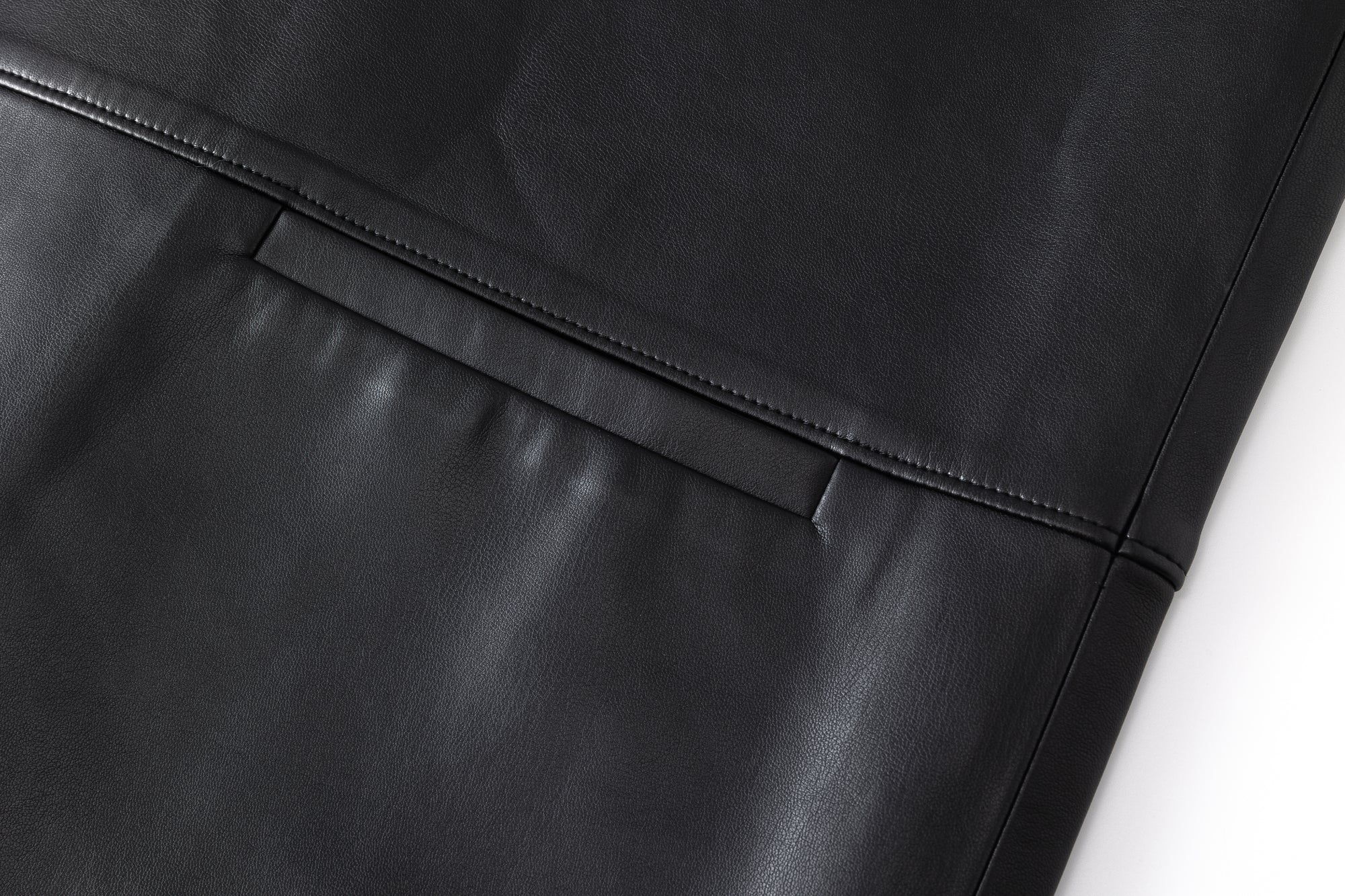 Soft PU leather with overlap front. A line cut and pockets on the side.