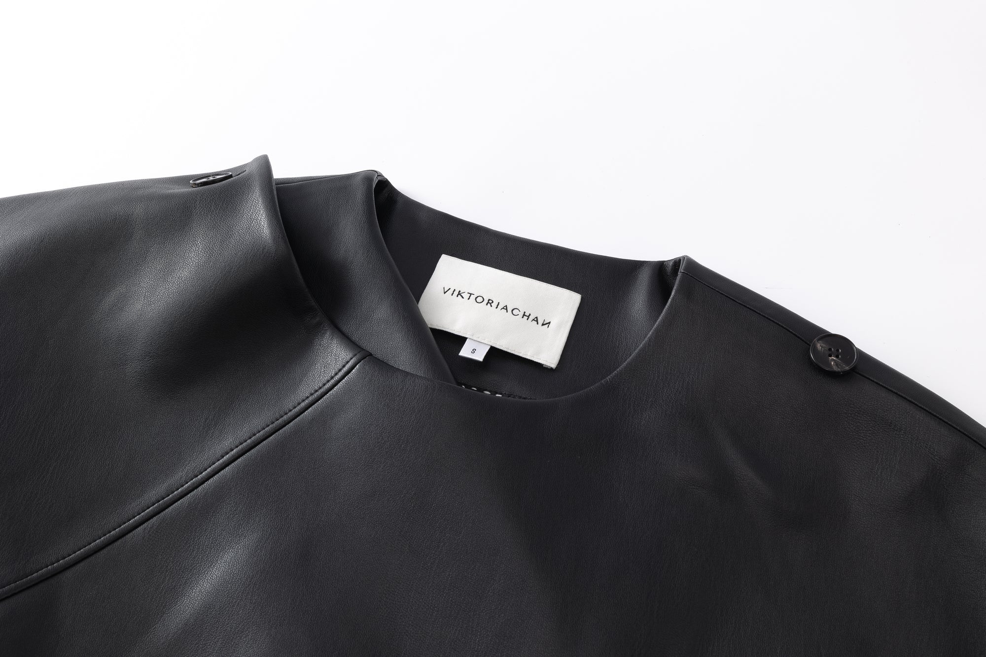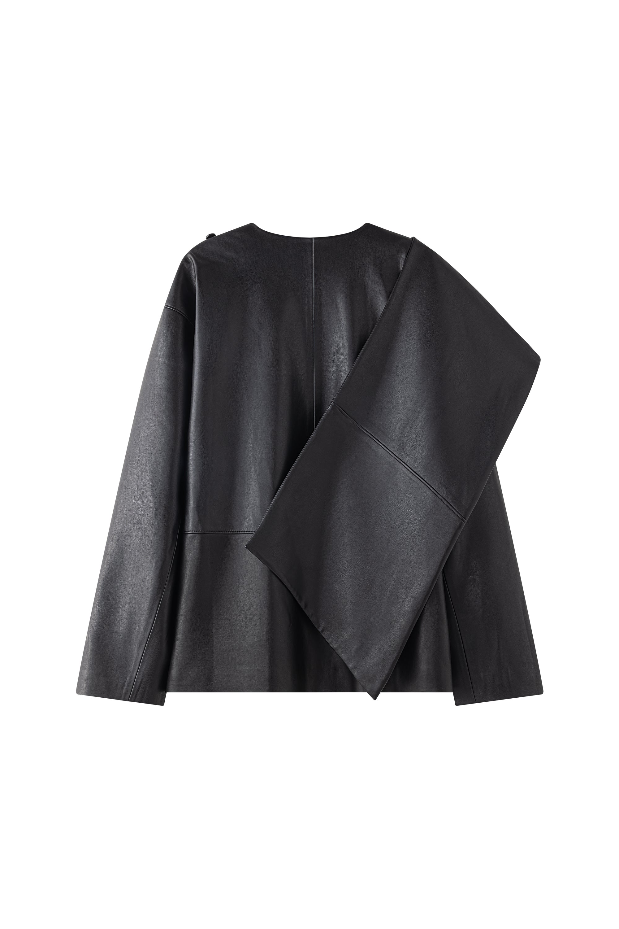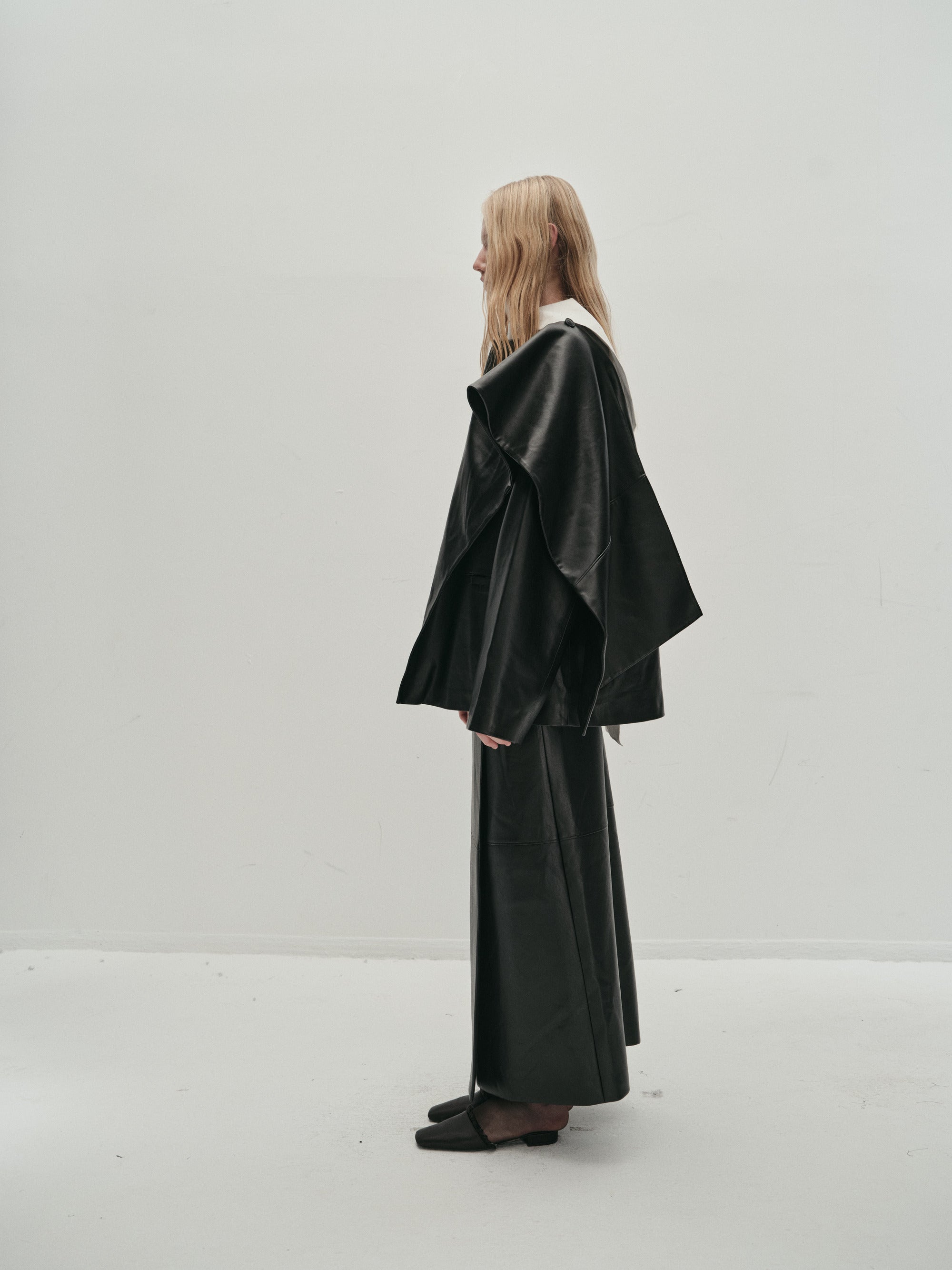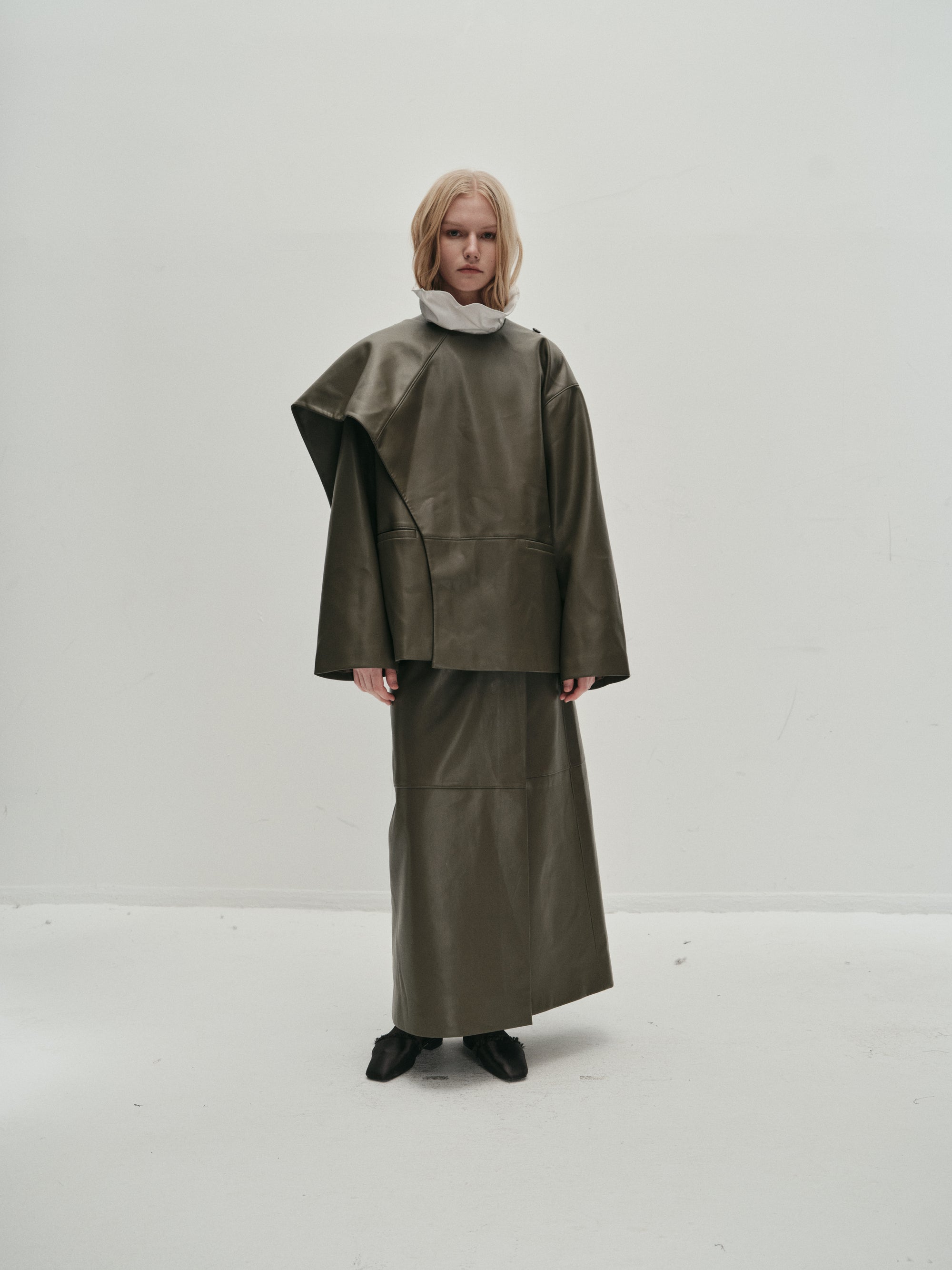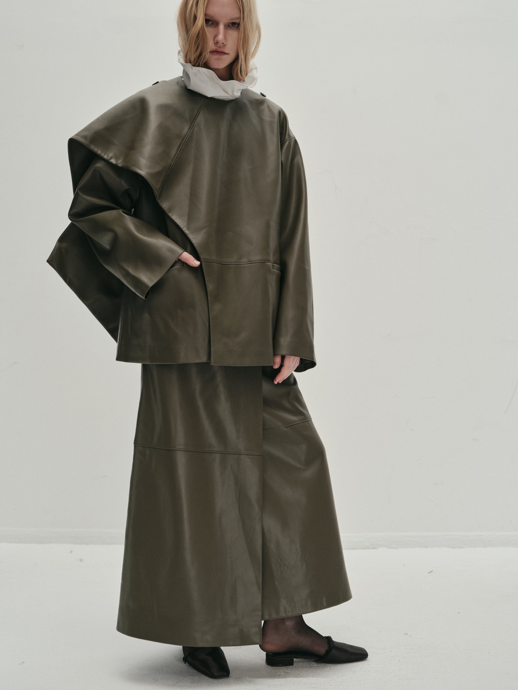 Soft PU leather with overlap front. A line cut and pockets on the side.