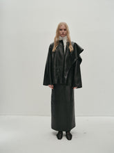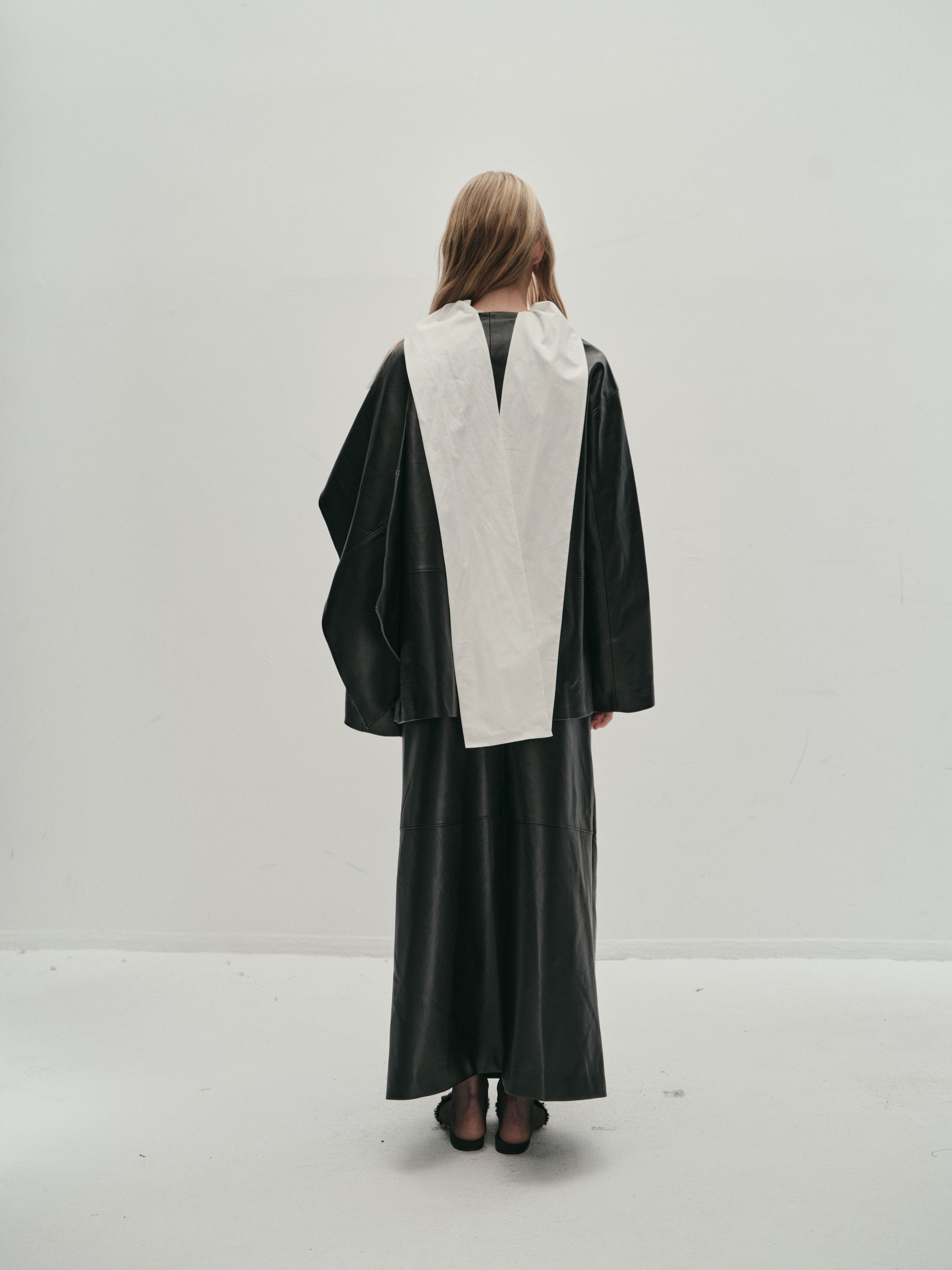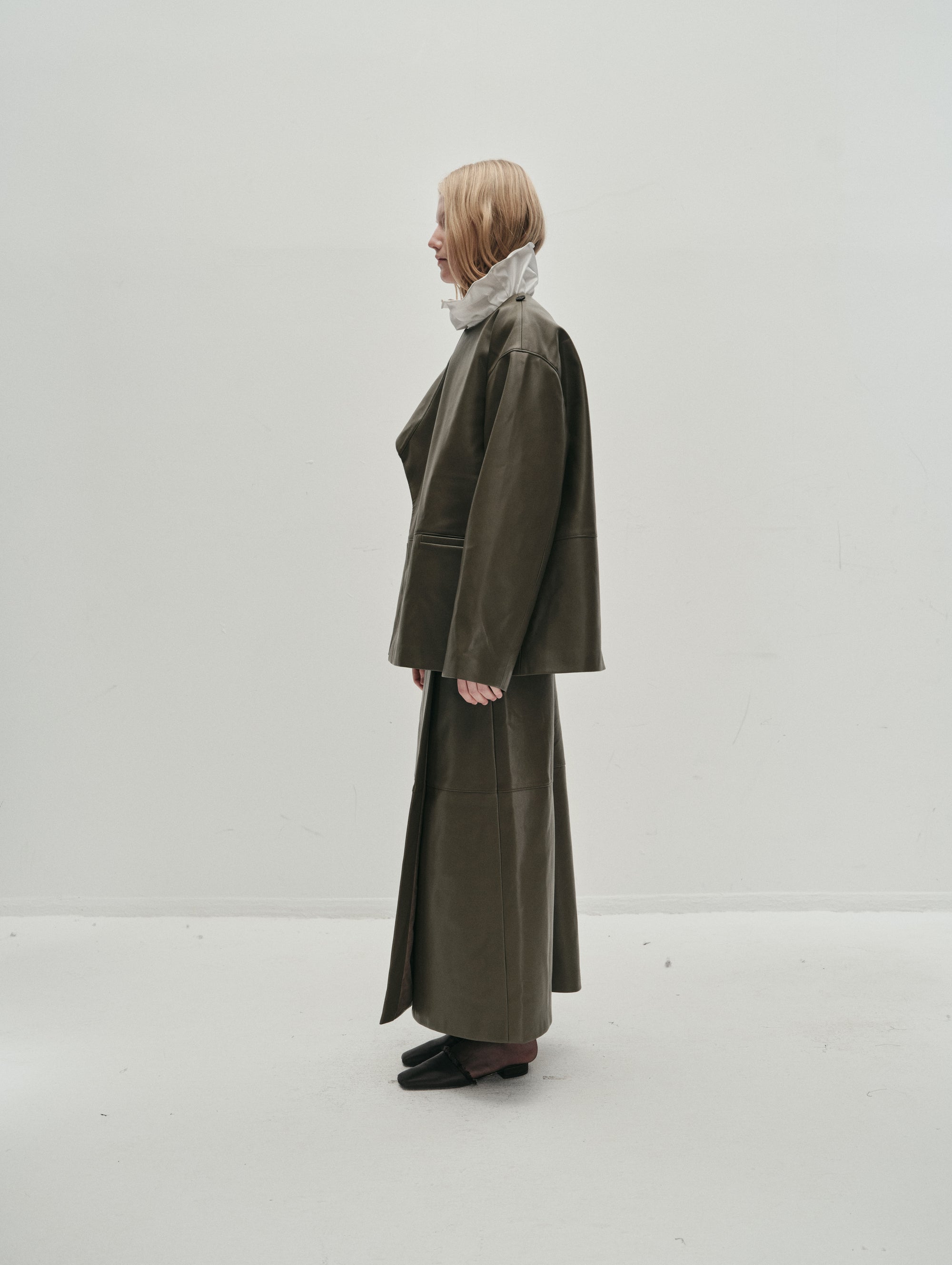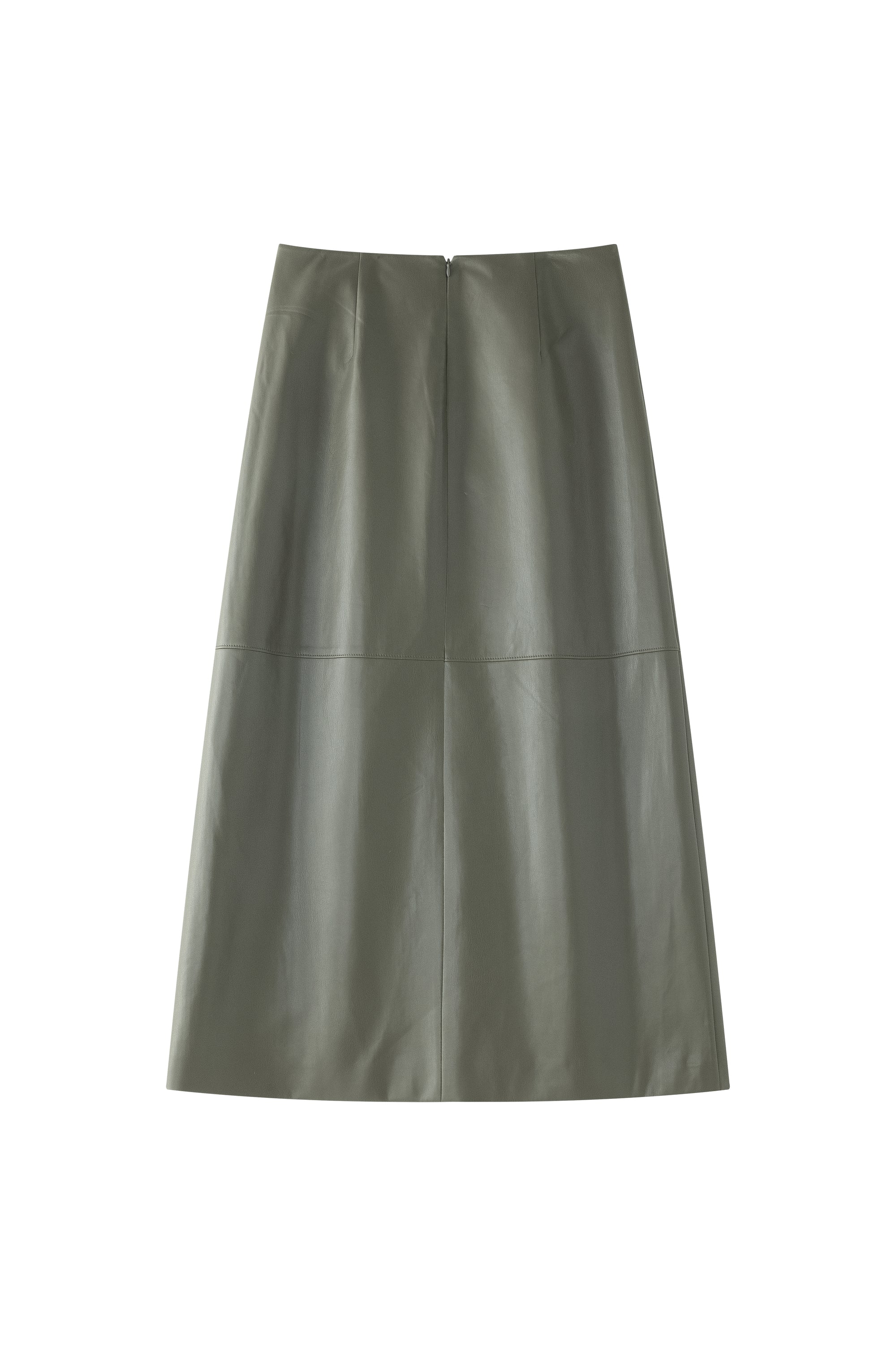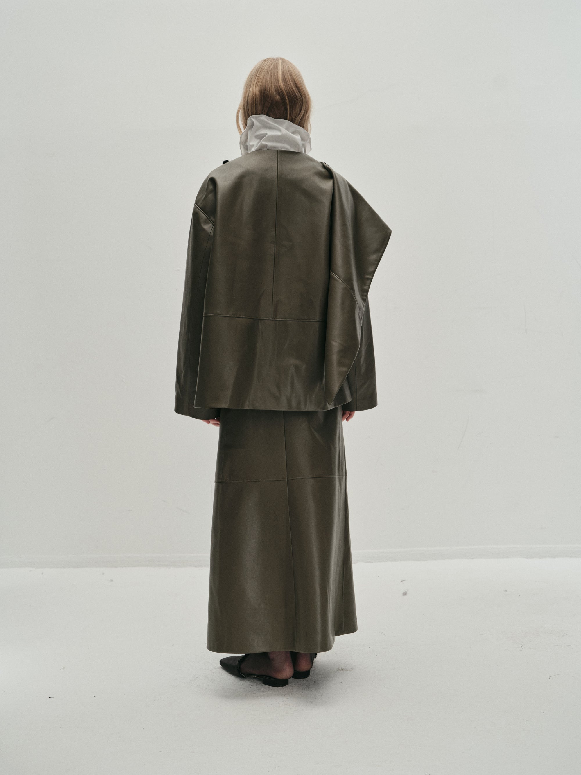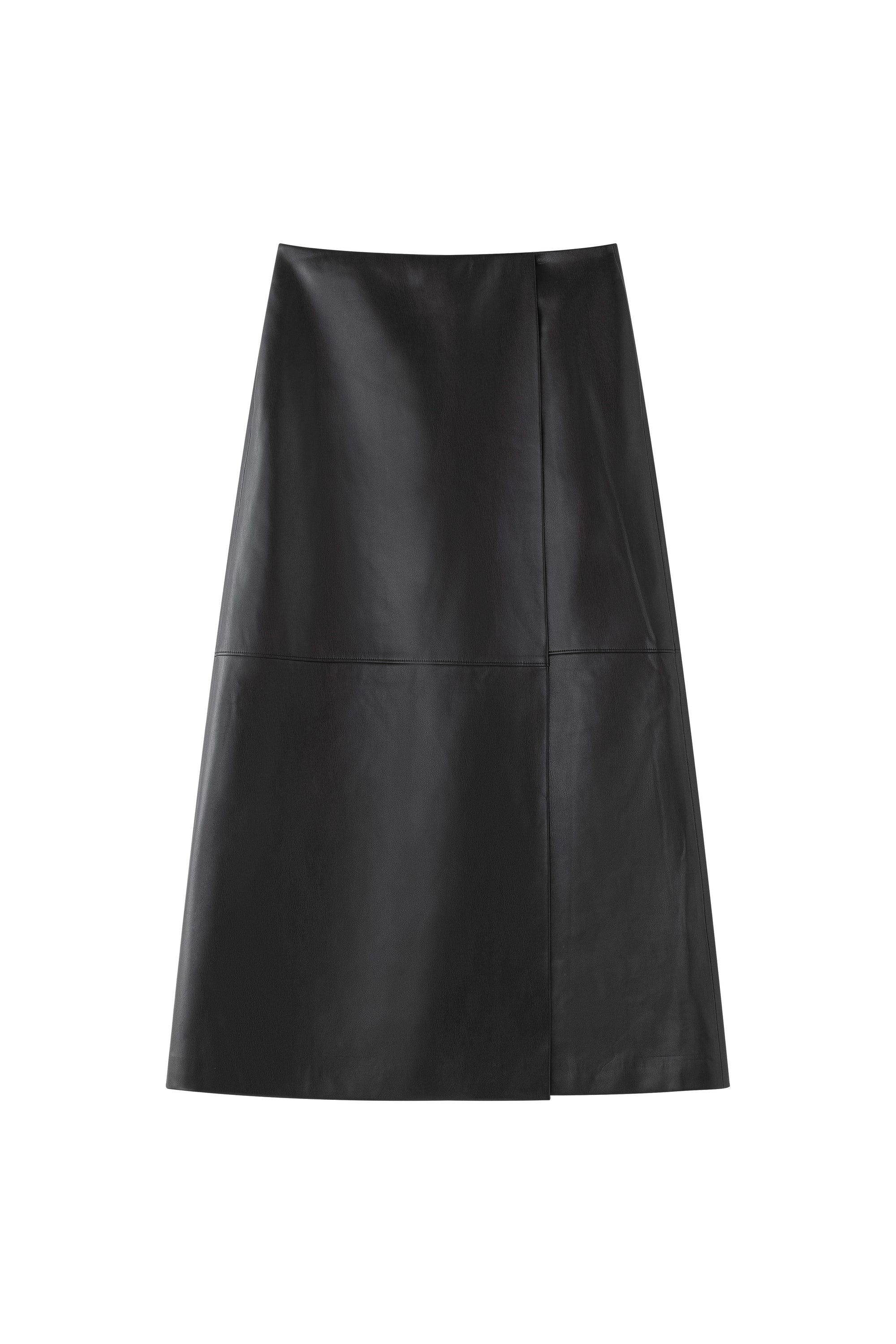 Soft PU leather with overlap front. A line cut and pockets on the side.