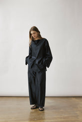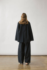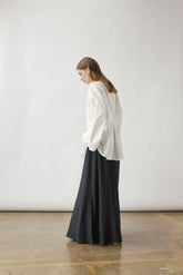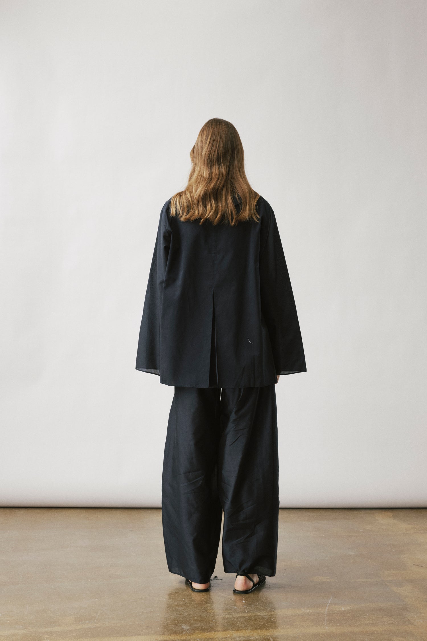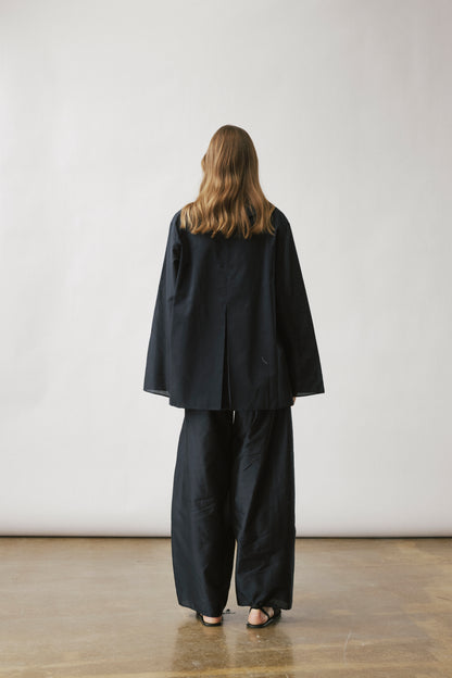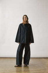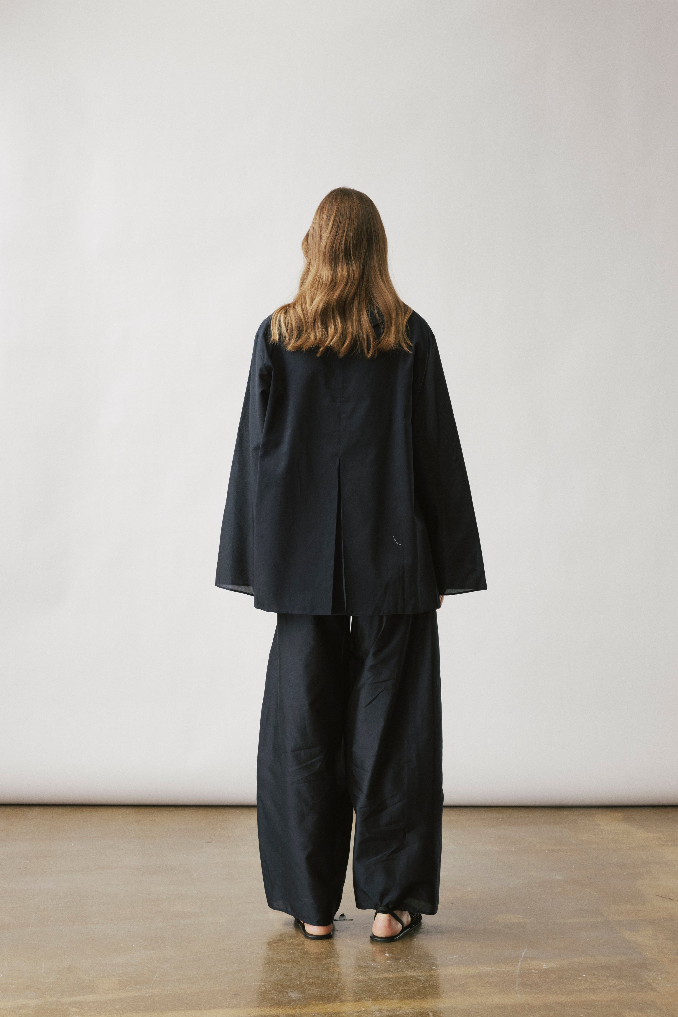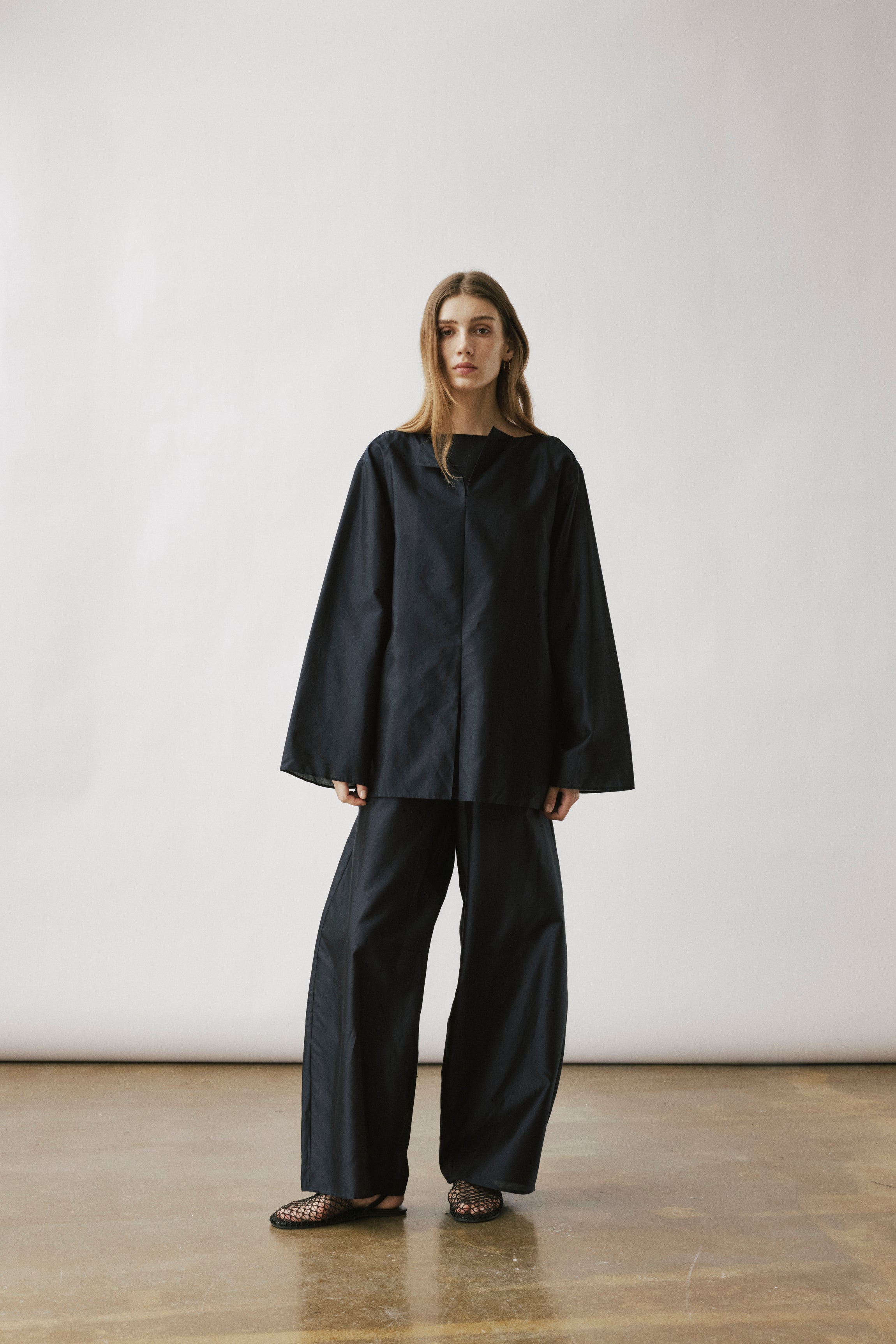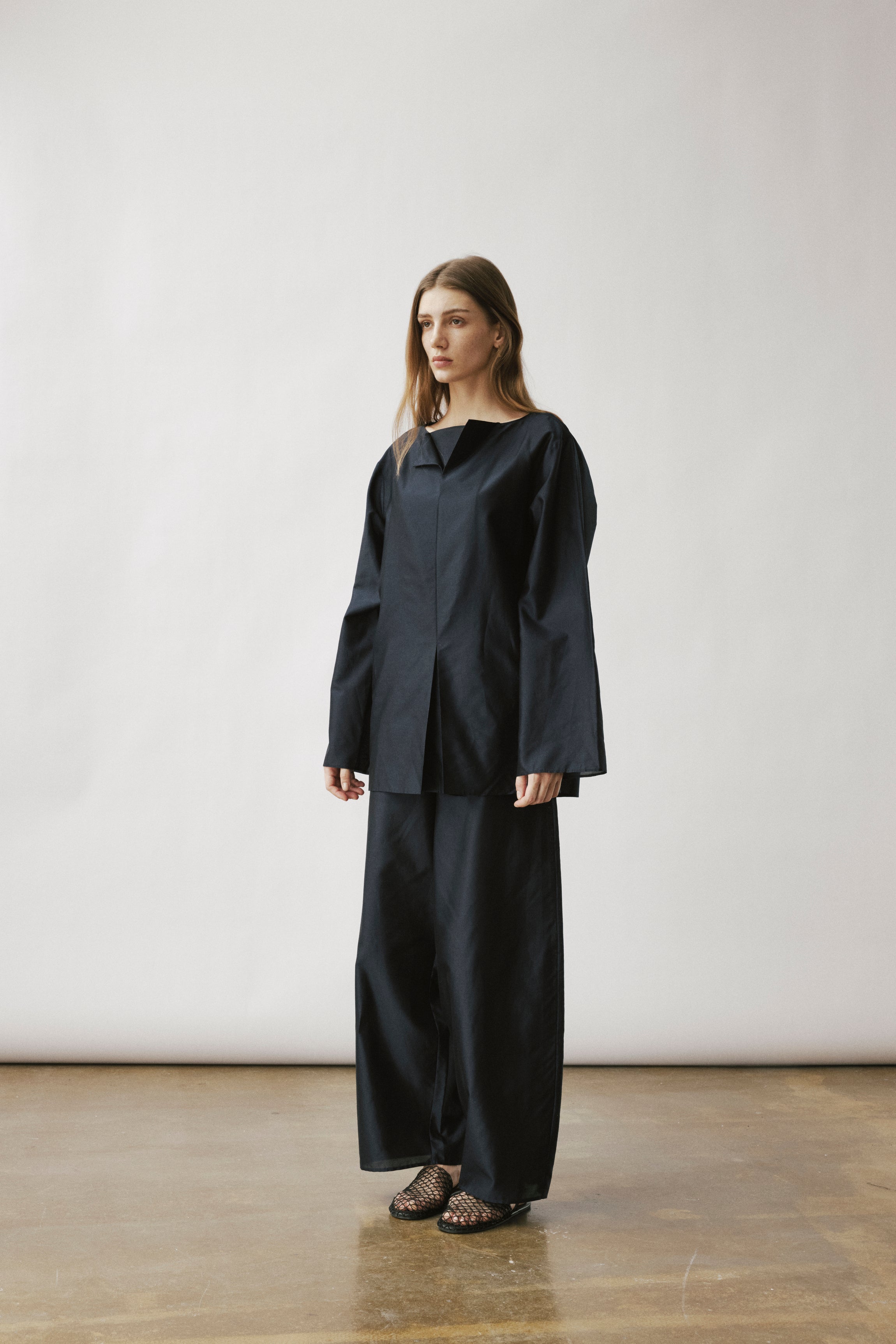An oversized shirt with a thick, textured silk and cotton blend and a structured silhouette. The neckline shows an opening from the front revealing an inner layer of still fabric. A matc...