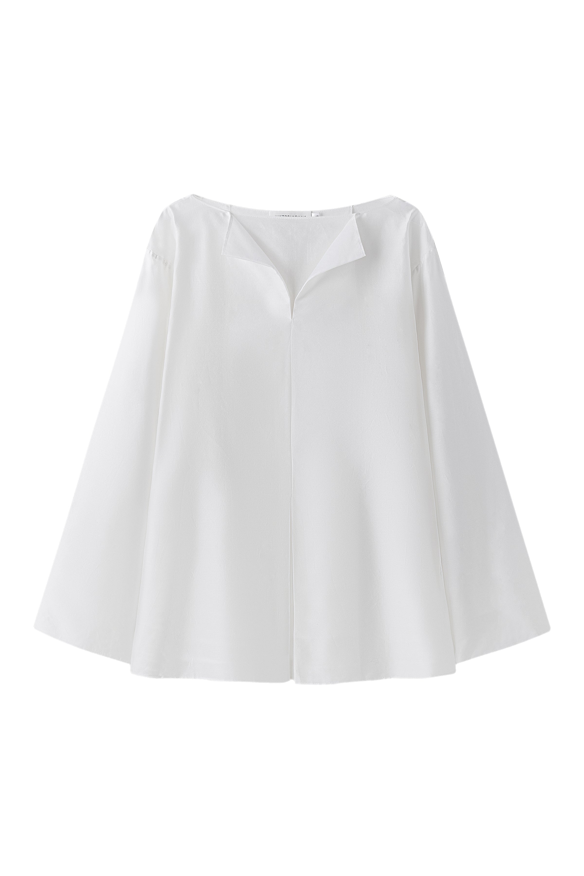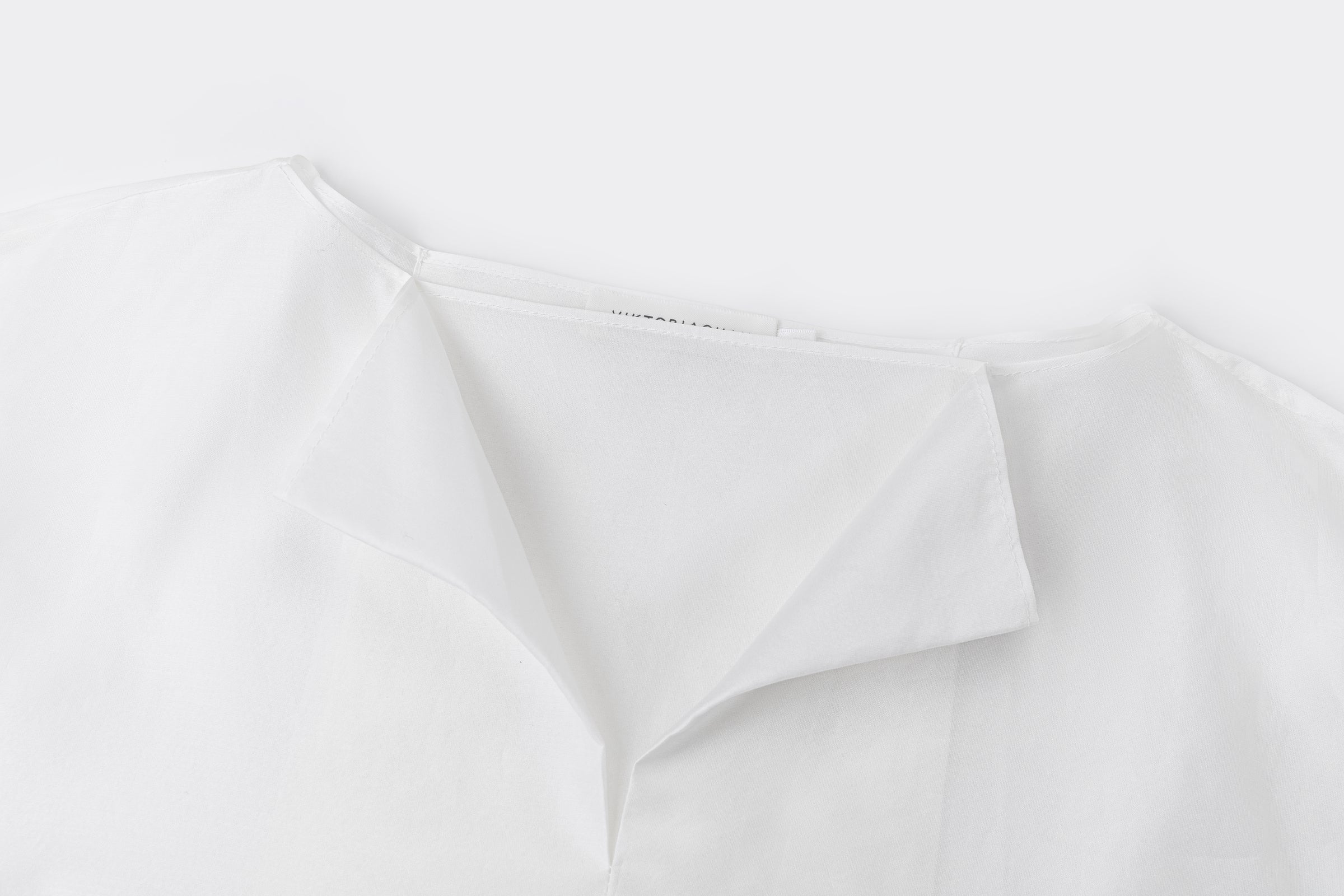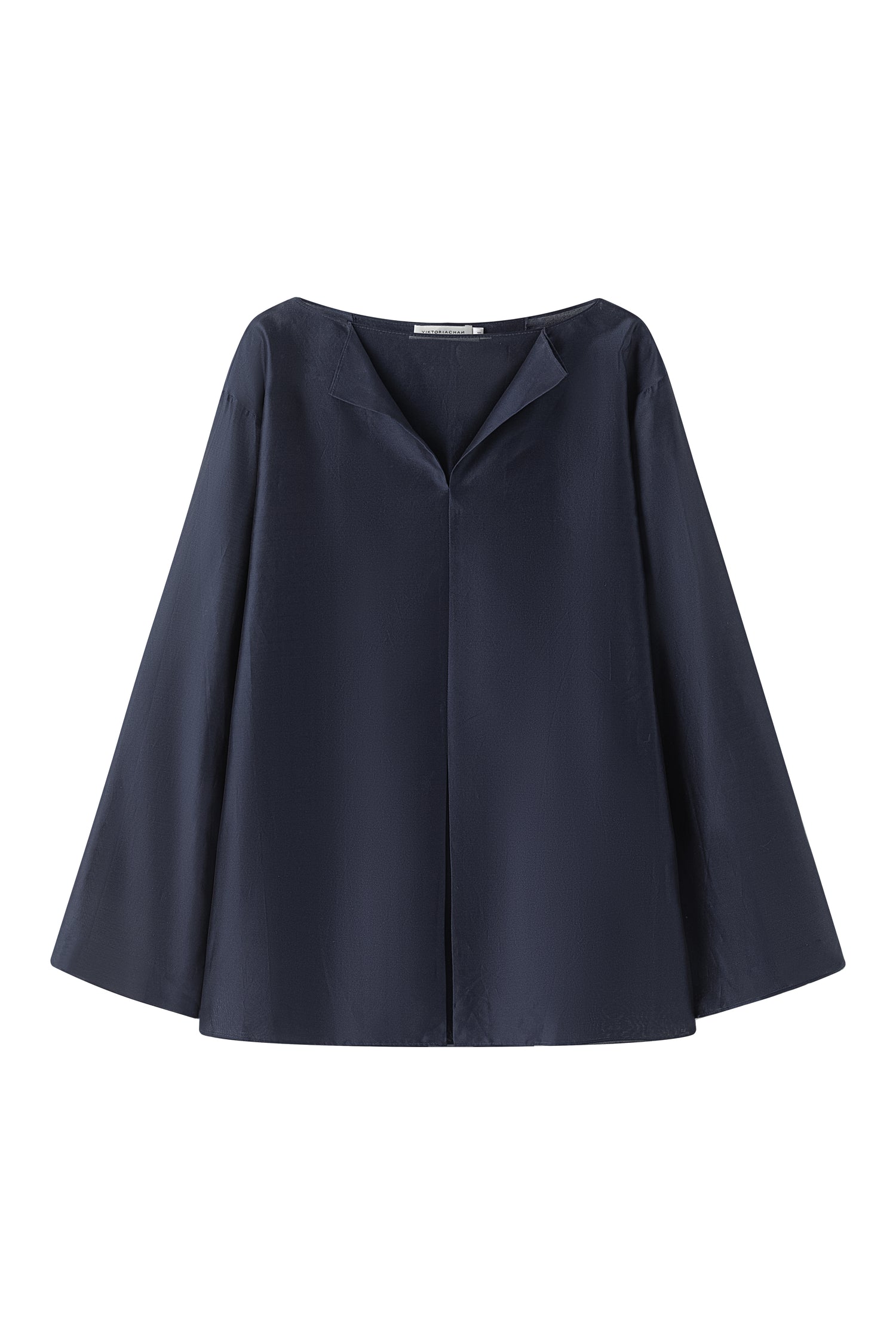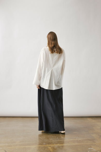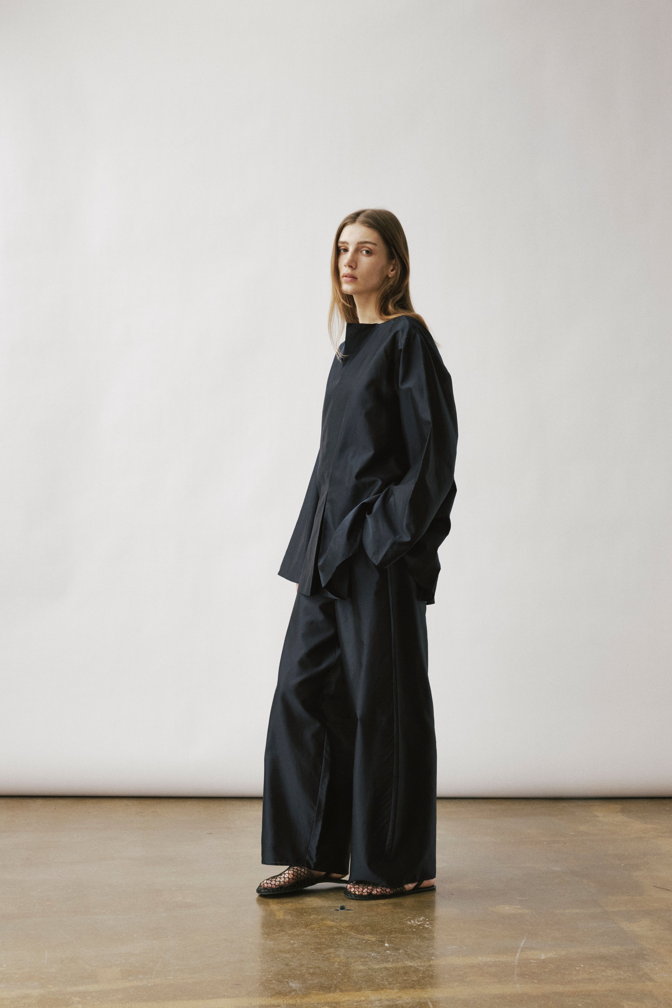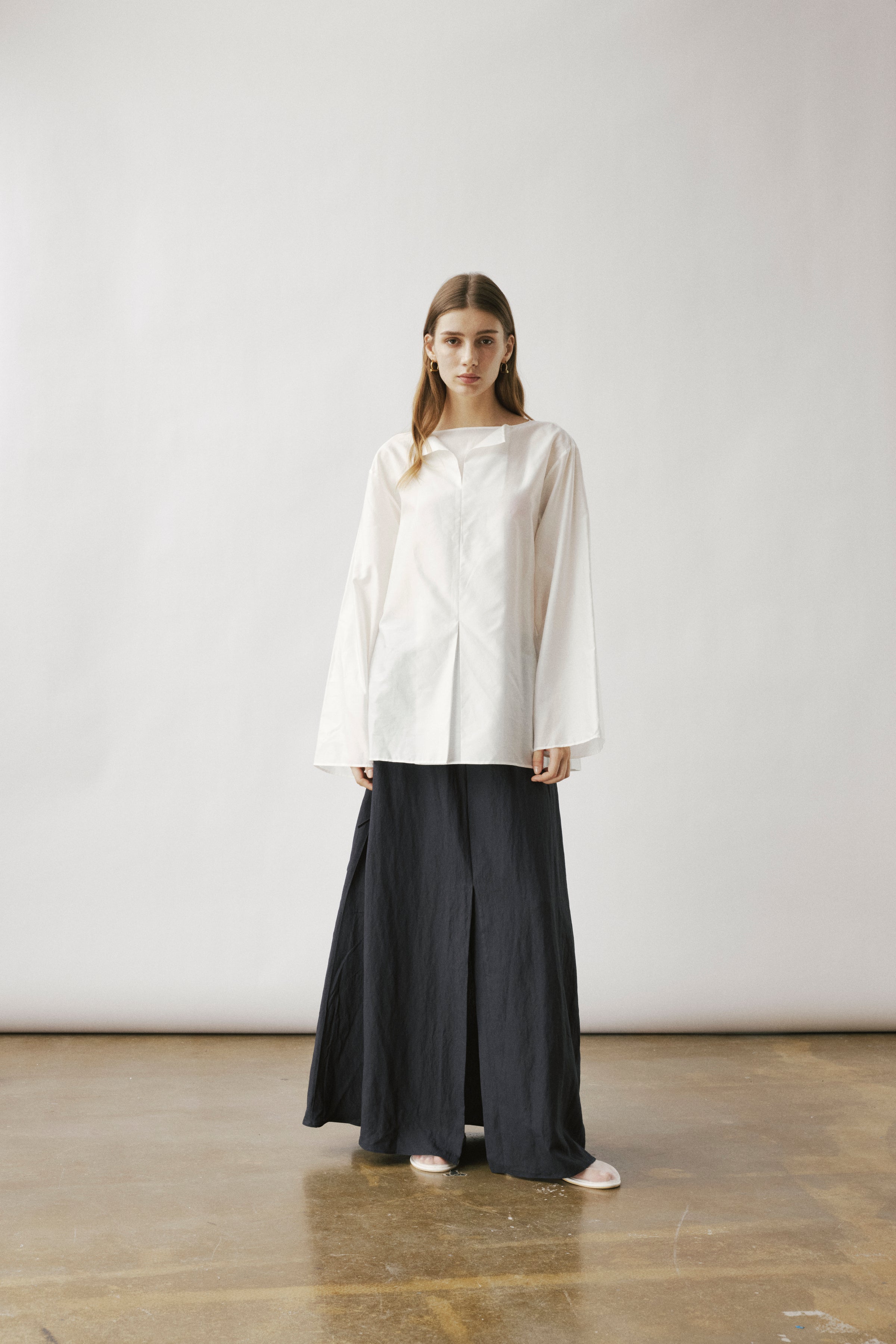 An oversized shirt with a thick, textured silk and cotton blend and a structured silhouette. The neckline shows an opening from the front revealing an inner layer of still fabric. A matc...