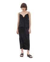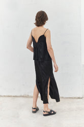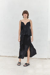 stretch skirt with asymmetric draping in the front. It's hold up in the waist with the adjustable strap. Falls below the knees. Style it casually with this seaons Tshirt or with an overs...