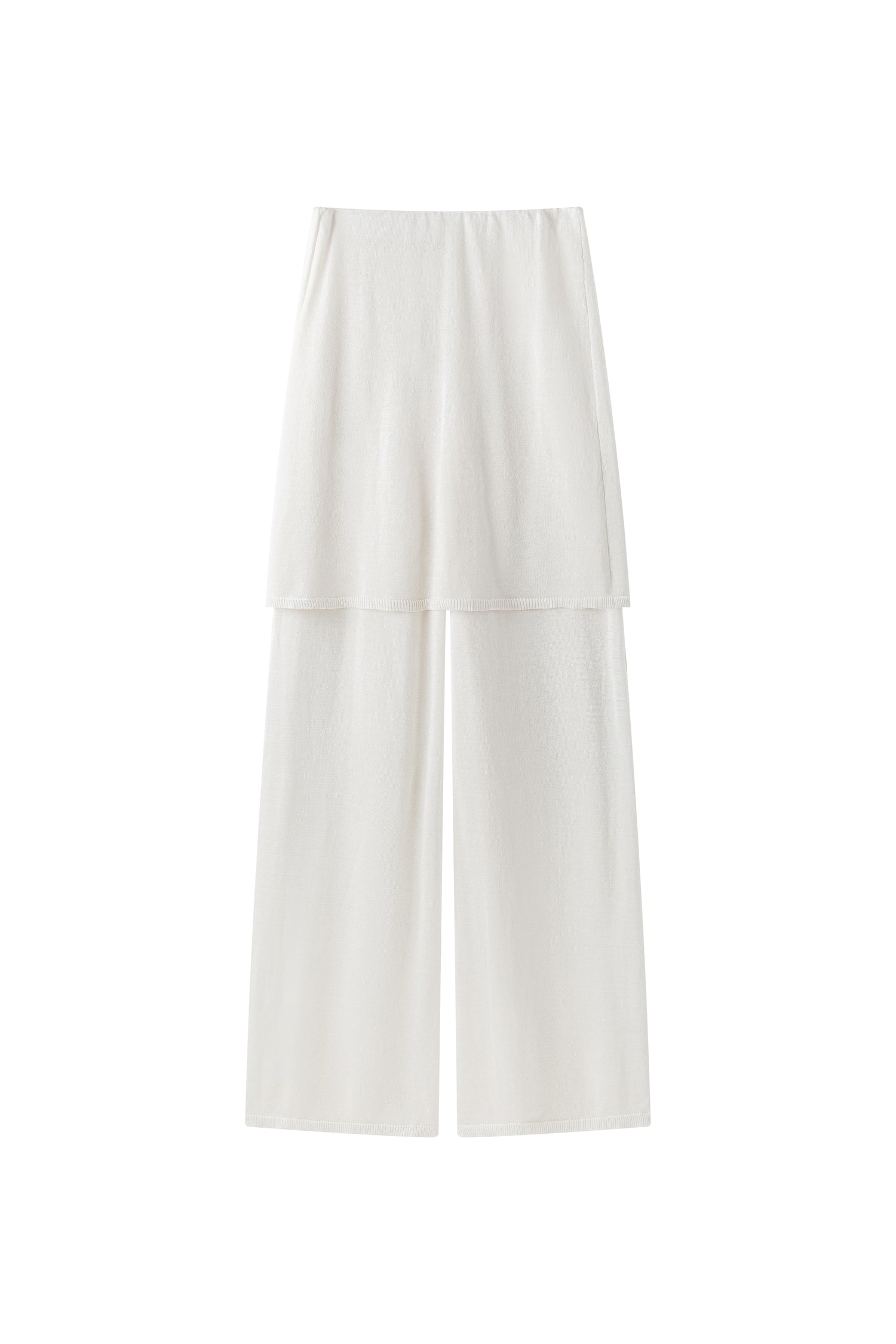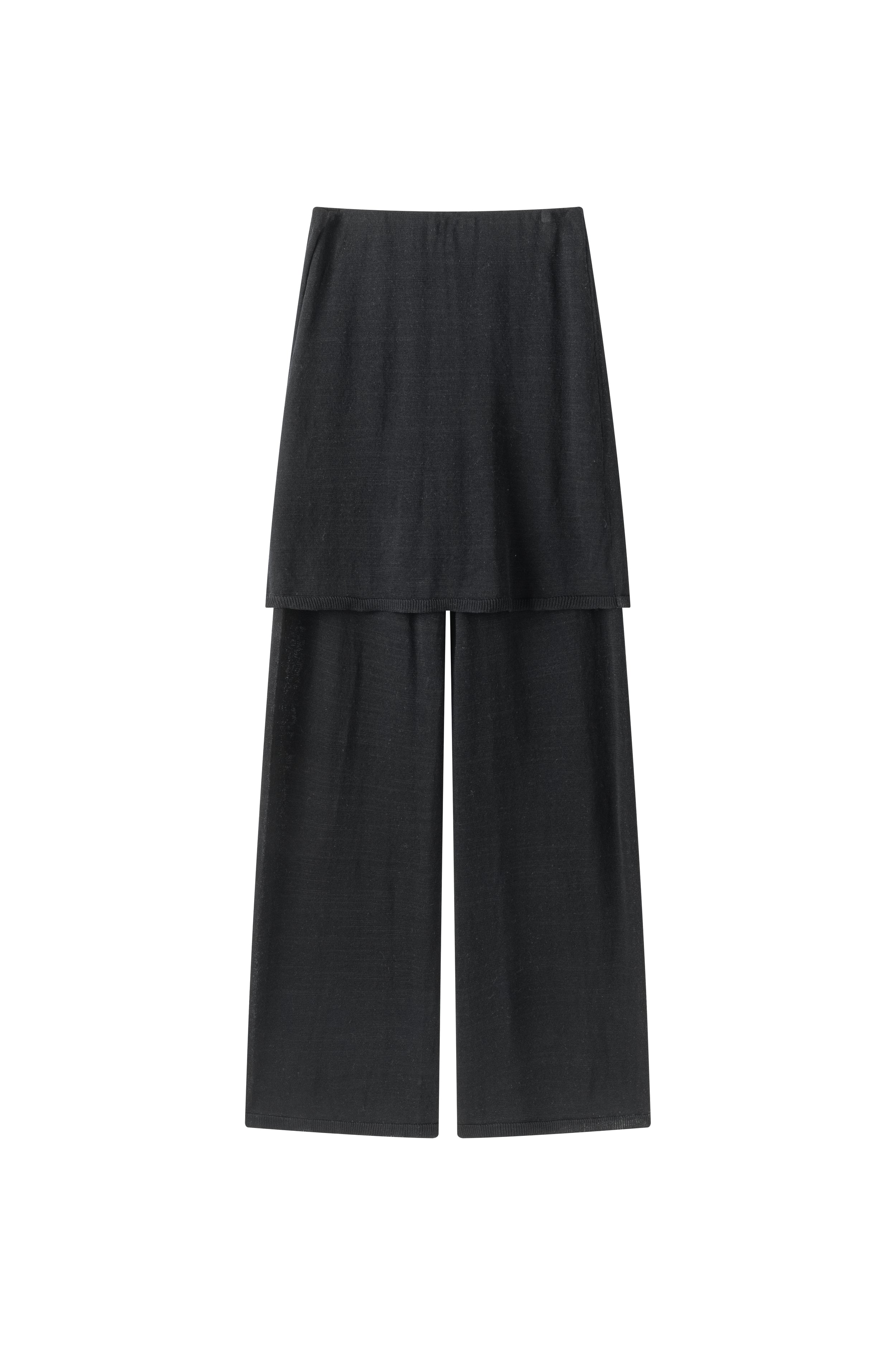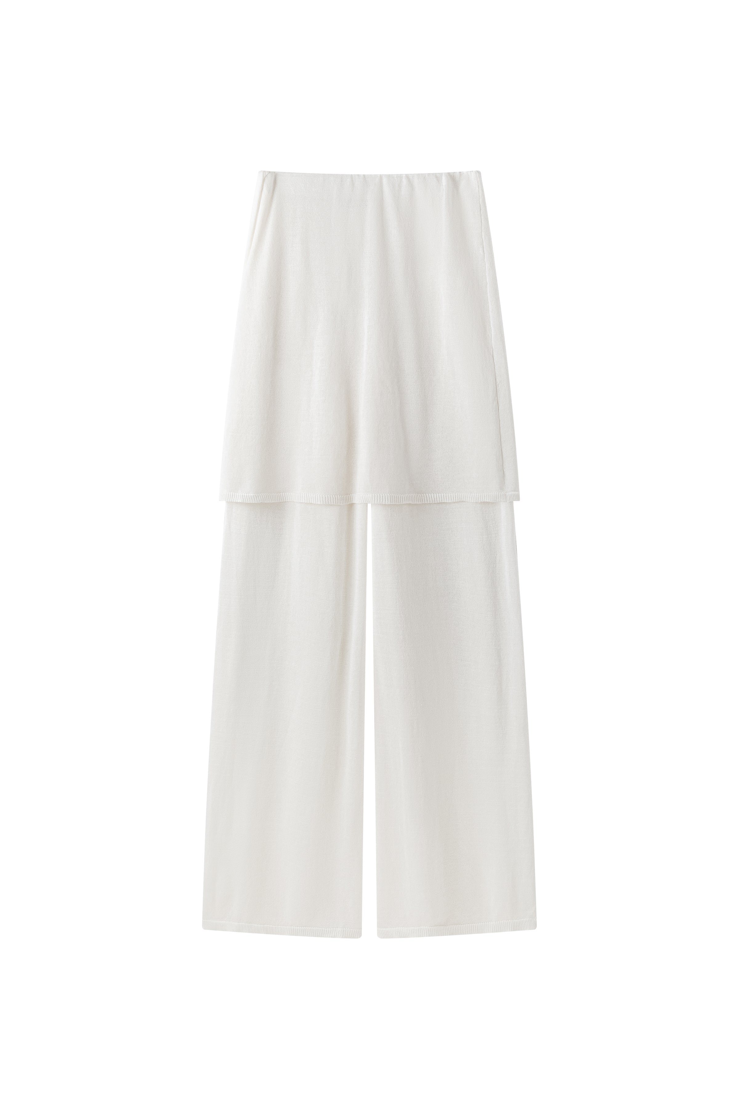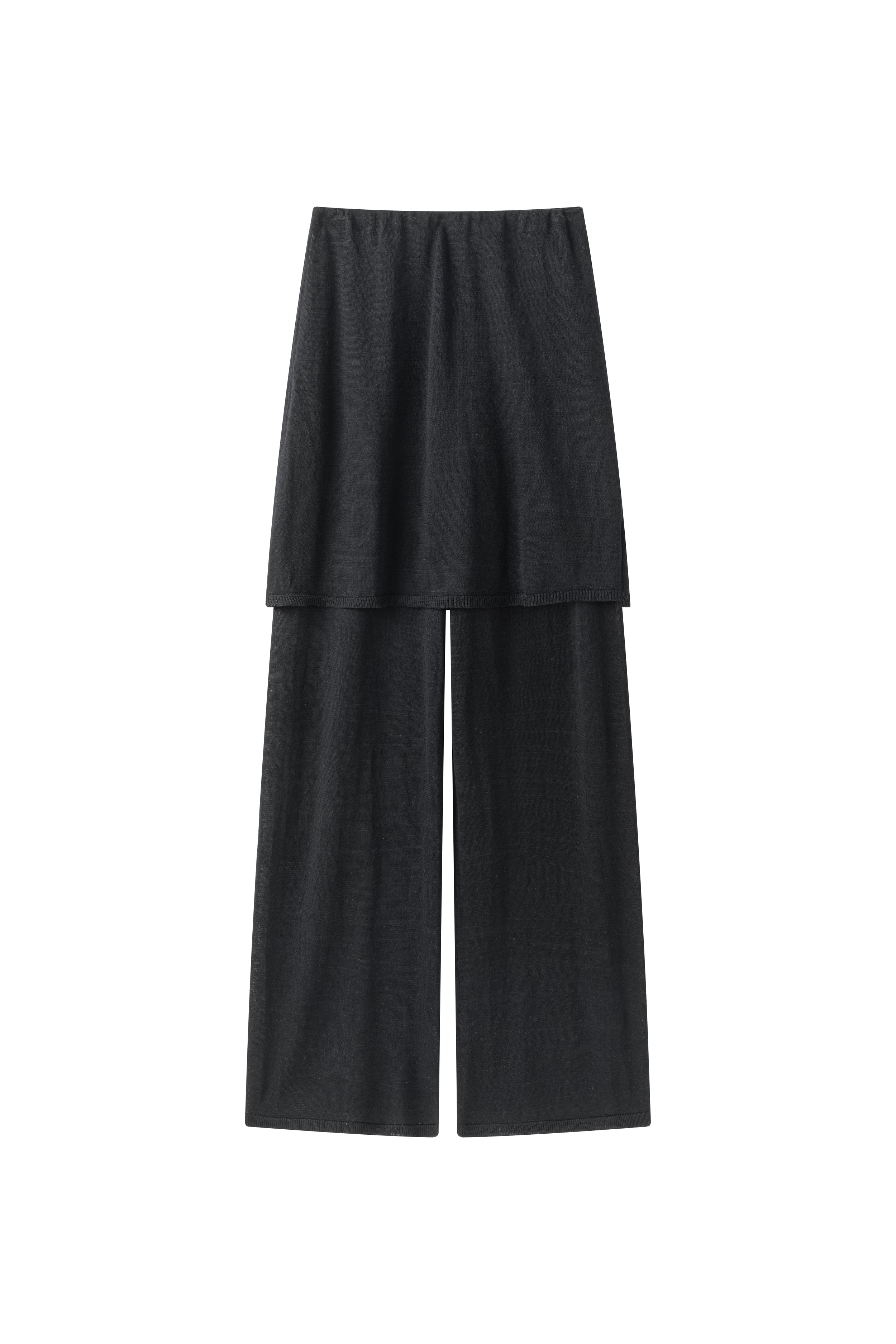 Two-layer knit trousers designed with a clean, pocketless silhouette. The top layer drapes like an outer skirt.