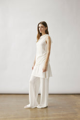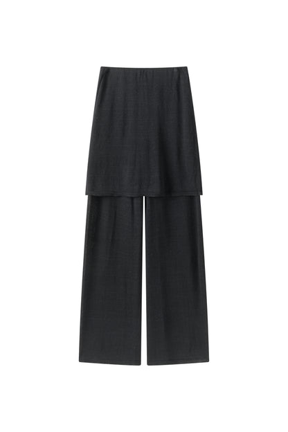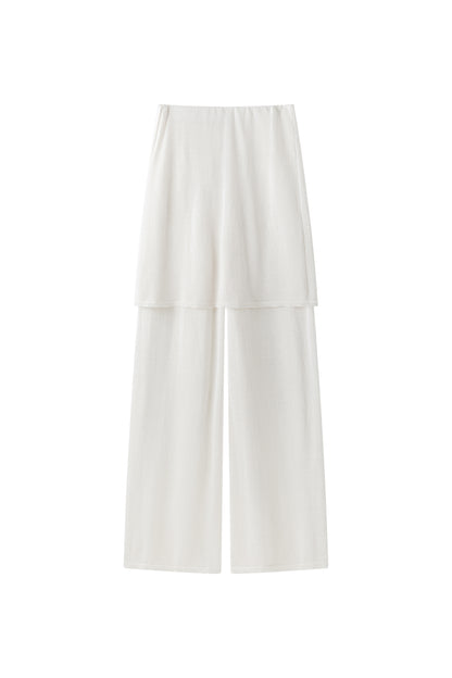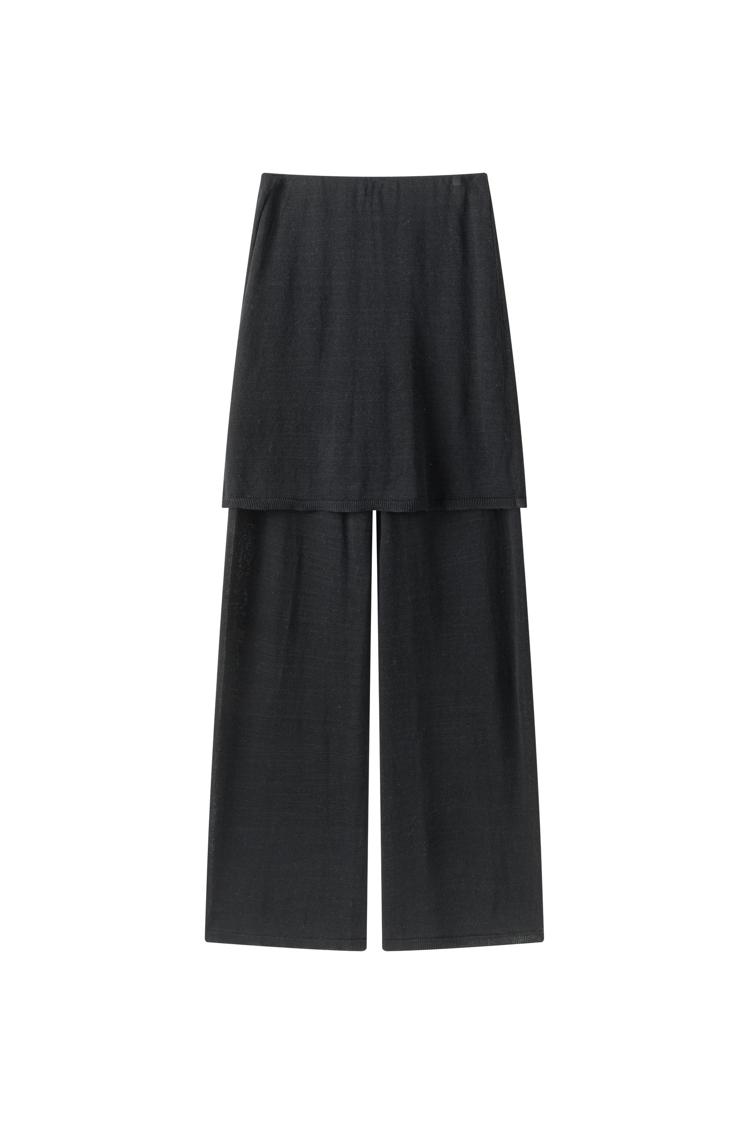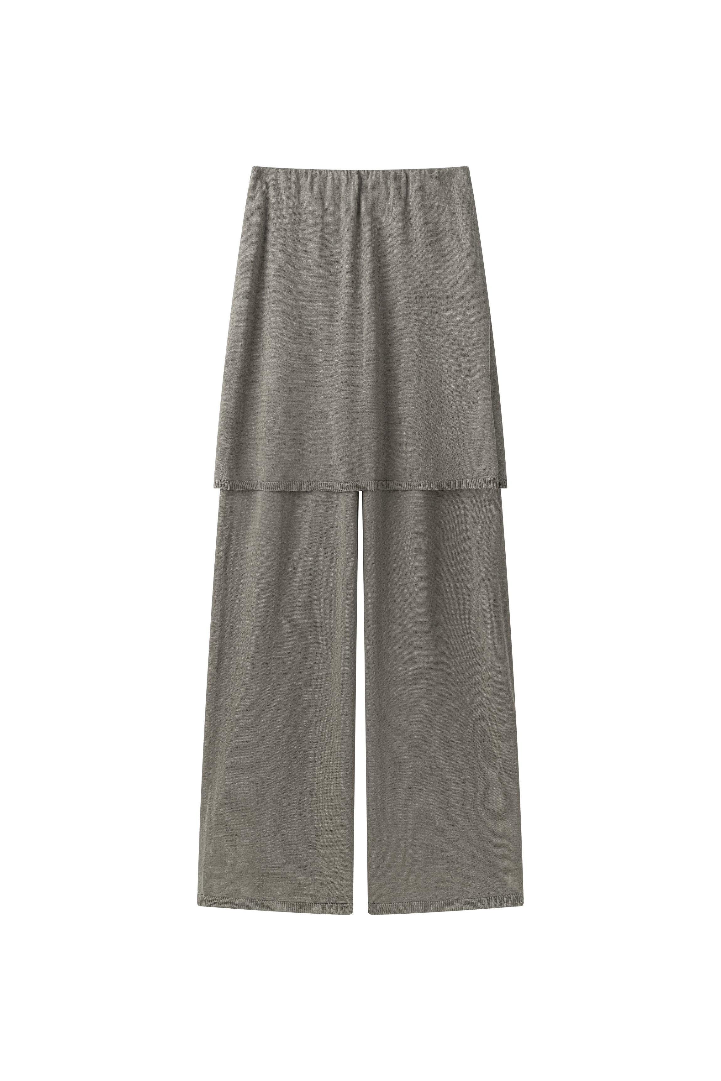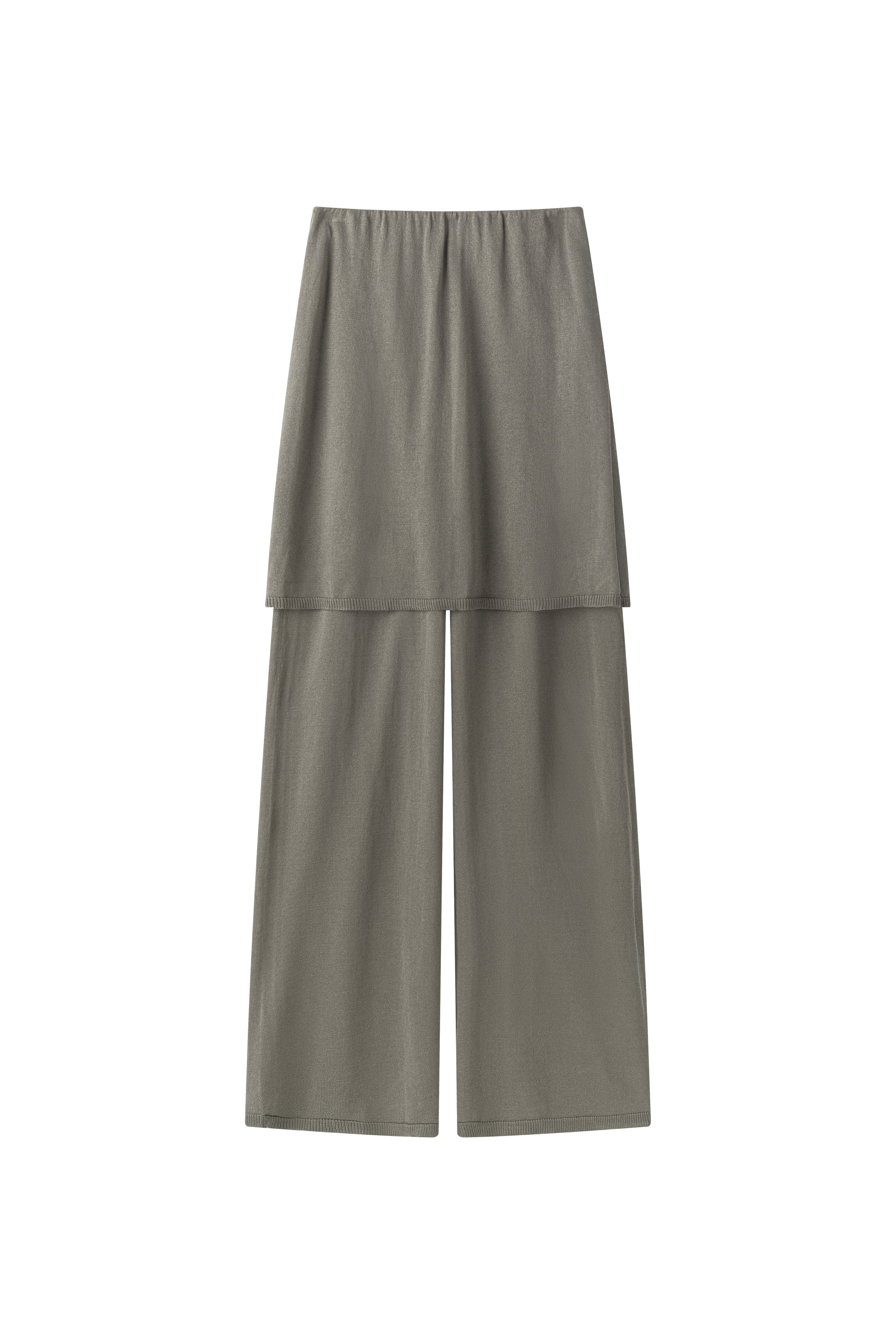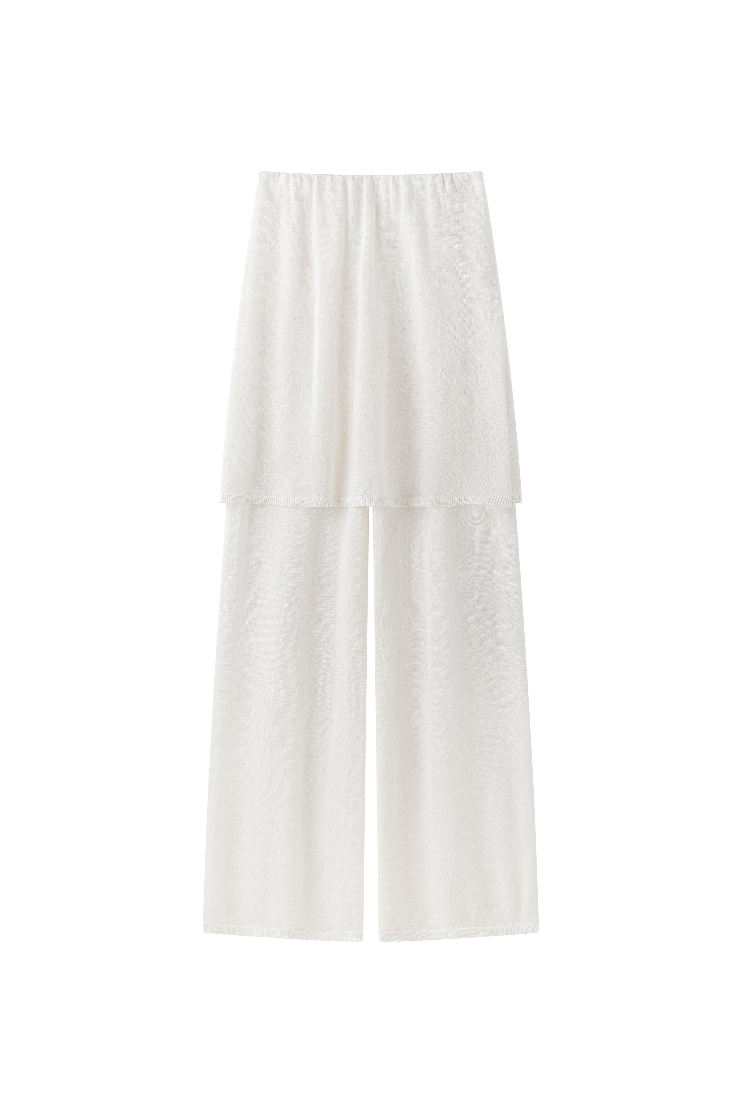 Two-layer knit trousers designed with a clean, pocketless silhouette. The top layer drapes like an outer skirt.