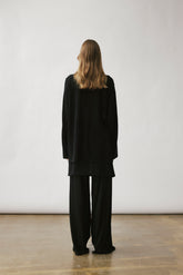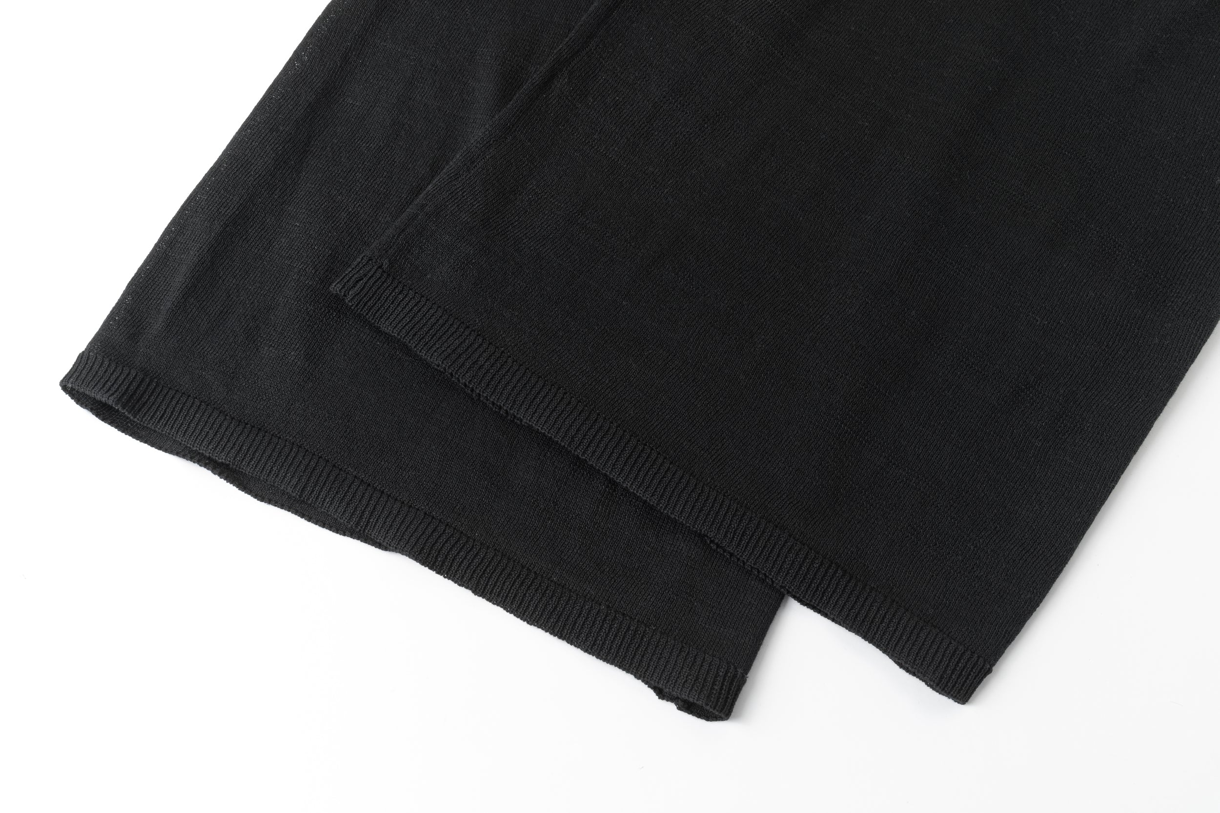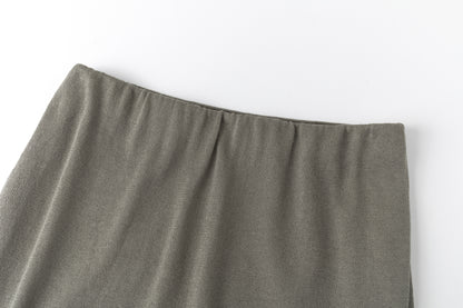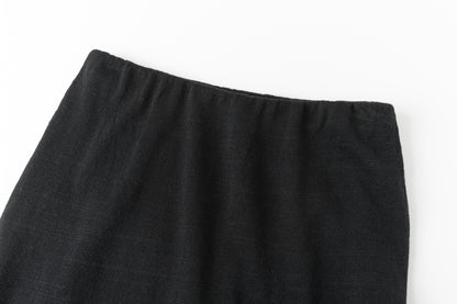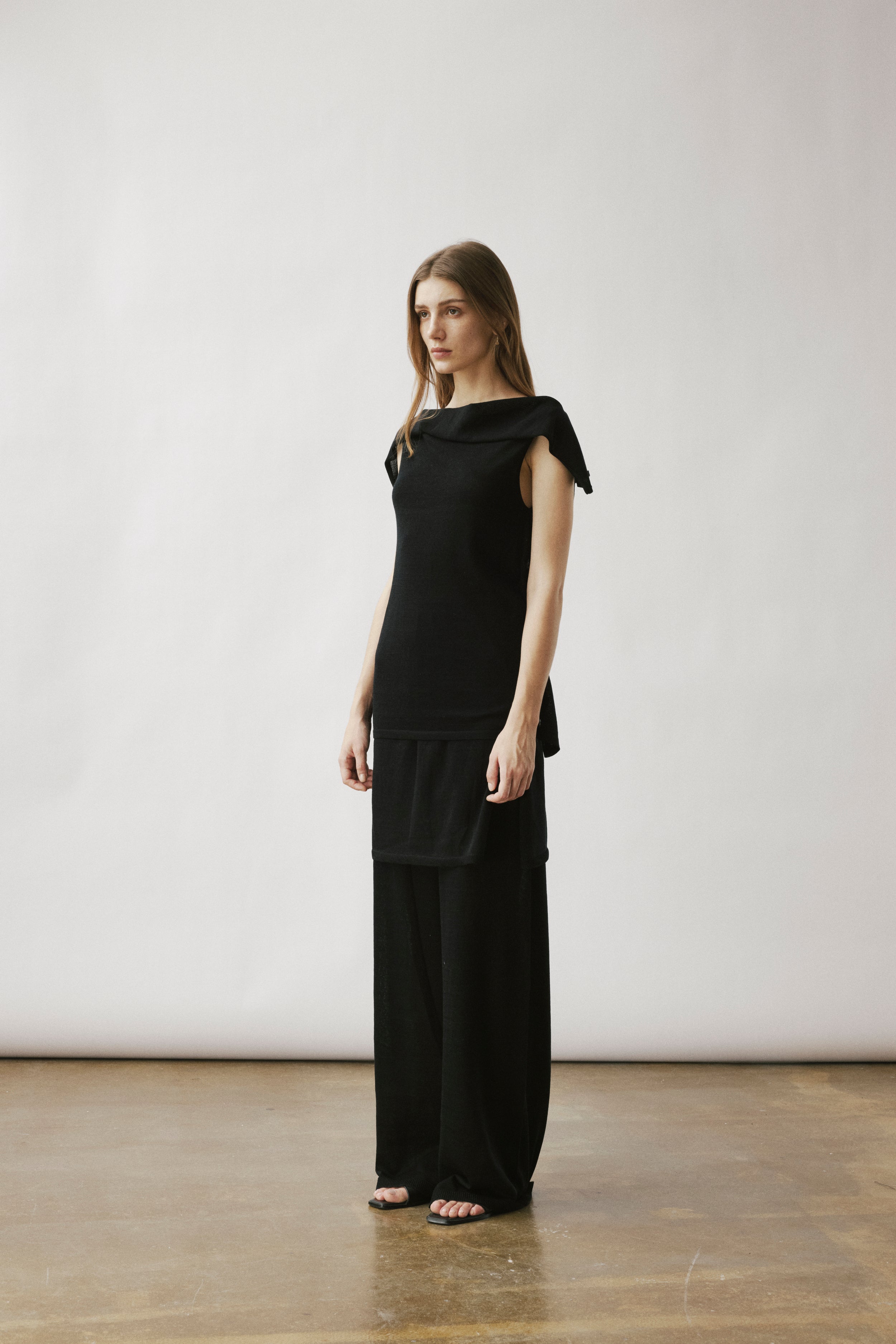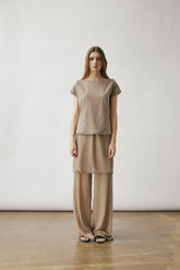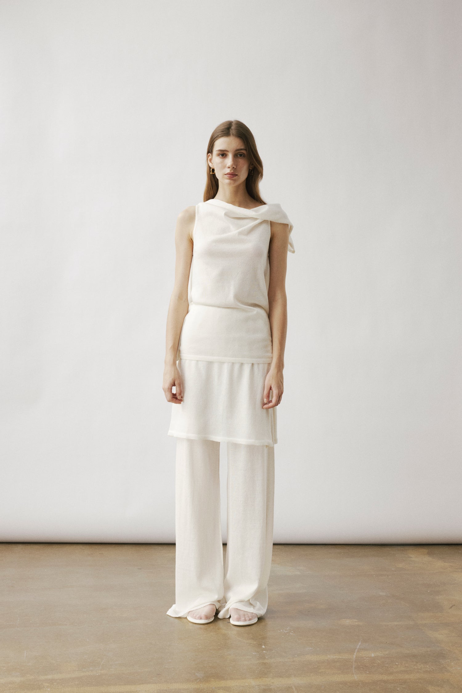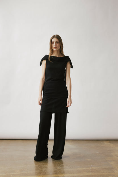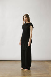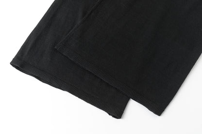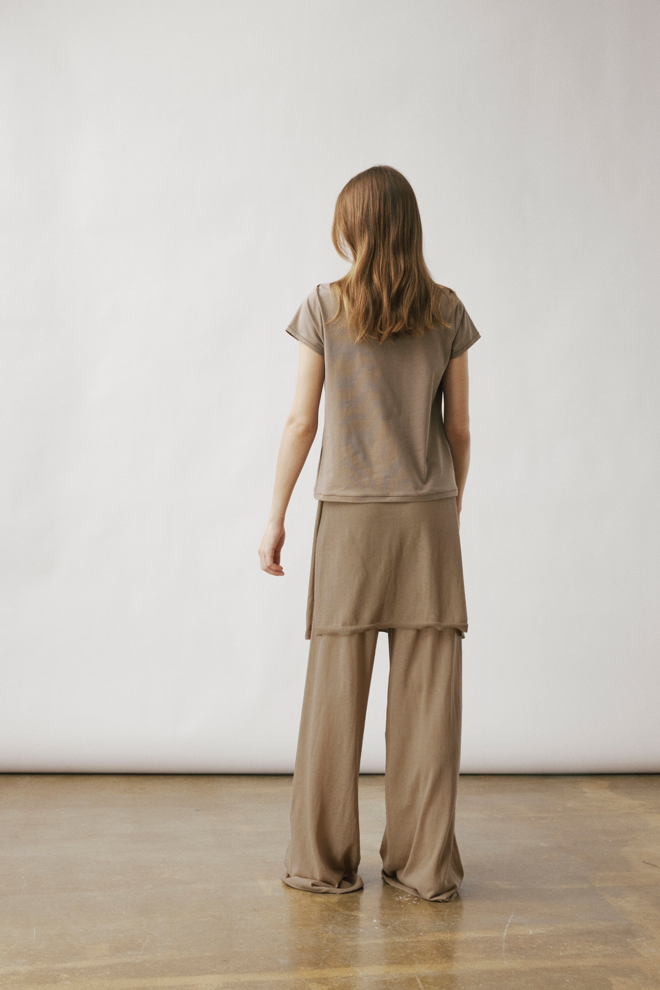 Two-layer knit trousers designed with a clean, pocketless silhouette. The top layer drapes like an outer skirt.