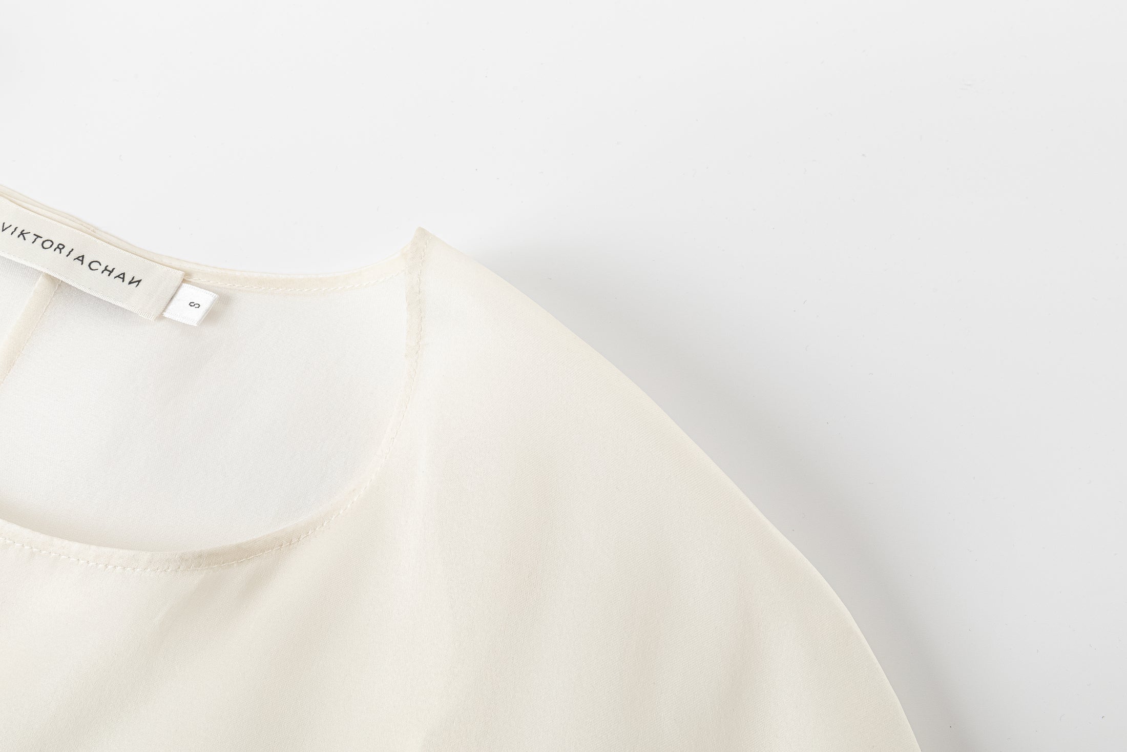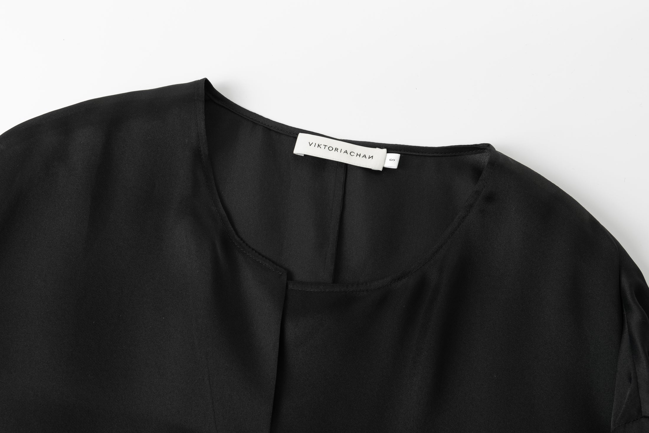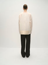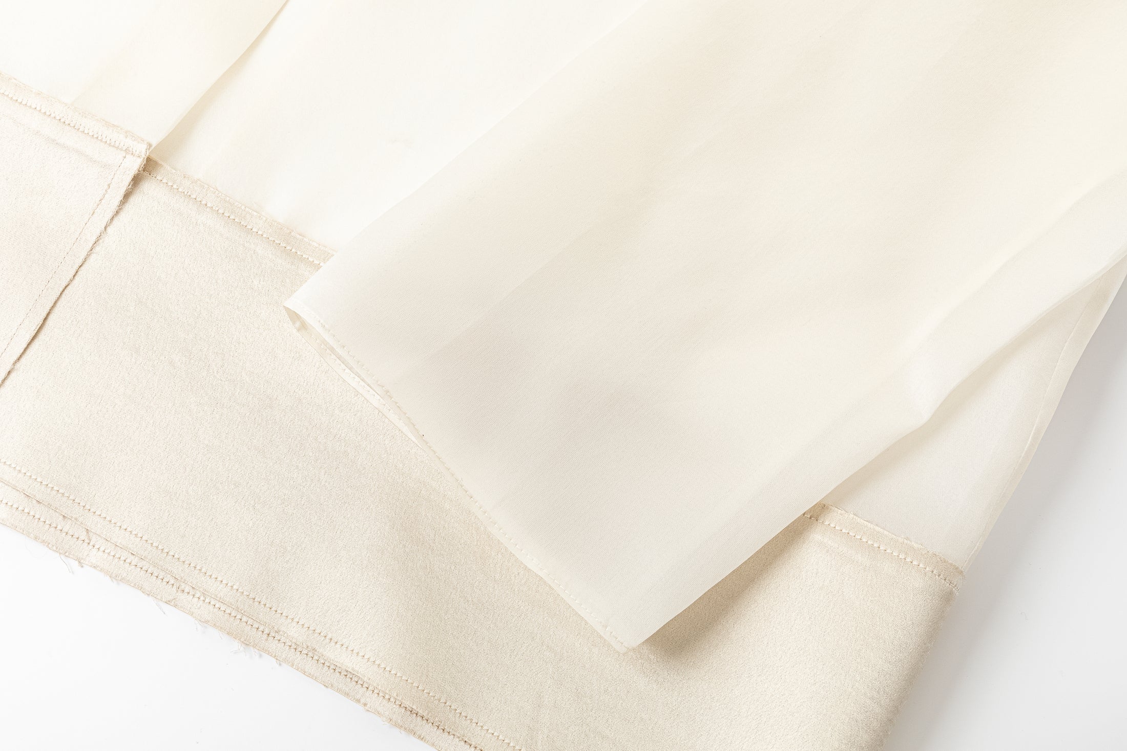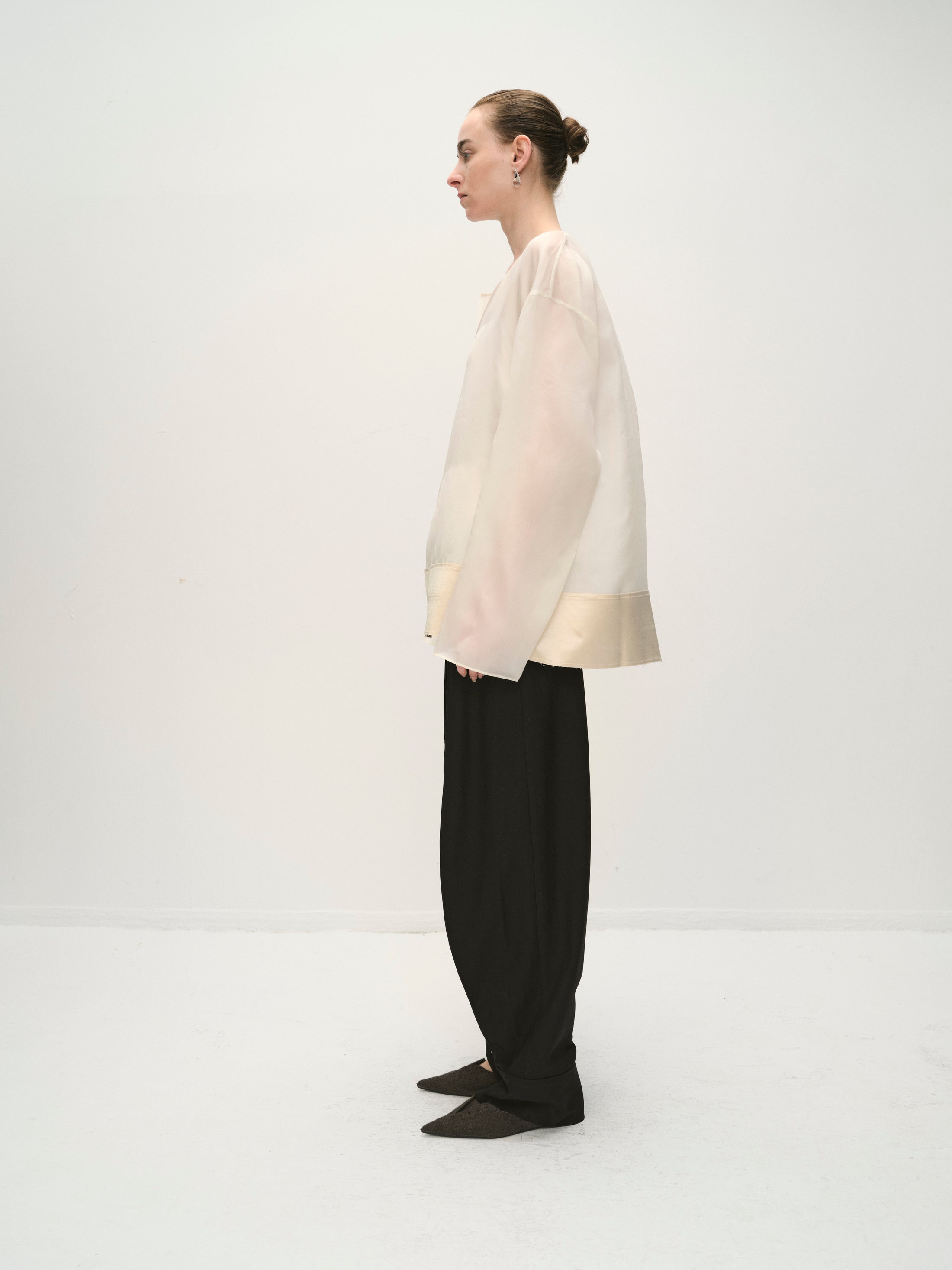 Sheer silk blouse featuring a slit V-neckline, a wide banded hem with a central slit, and a back seam running down the middle
