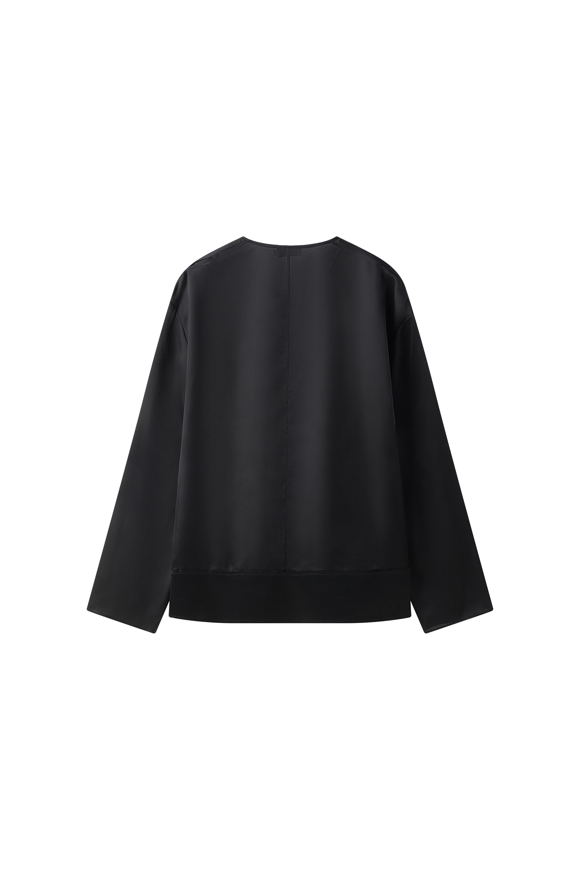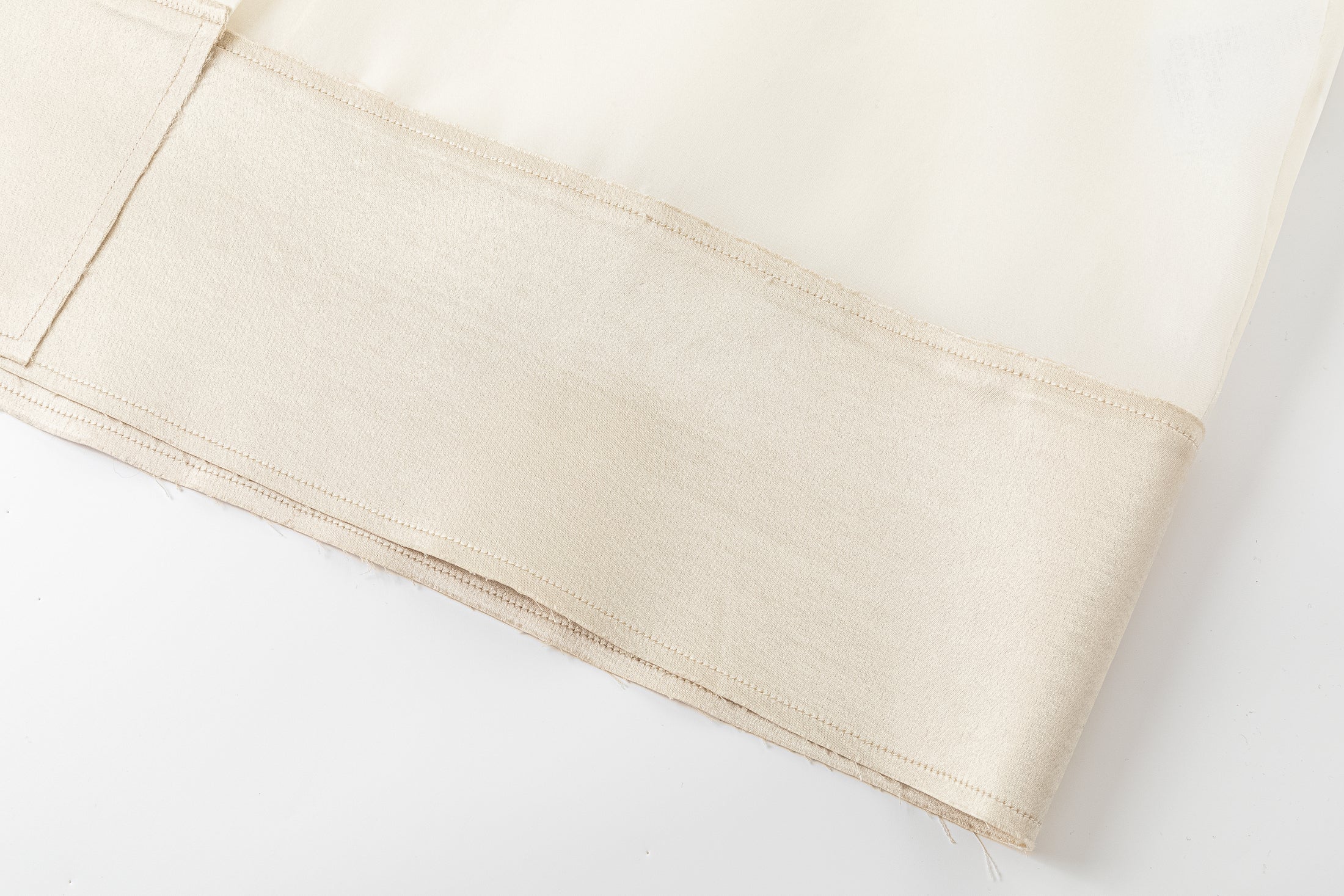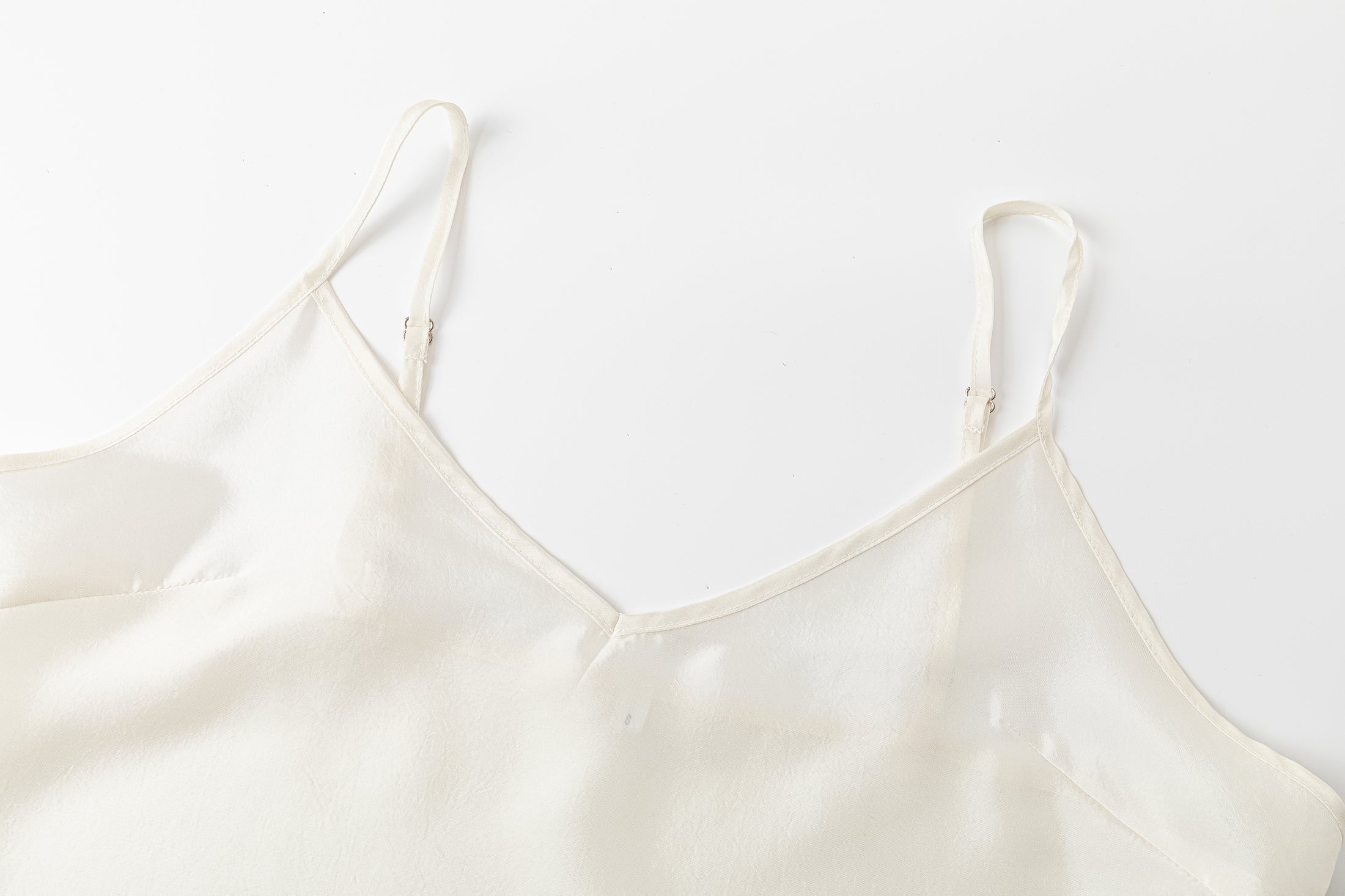 Sheer silk blouse featuring a slit V-neckline, a wide banded hem with a central slit, and a back seam running down the middle