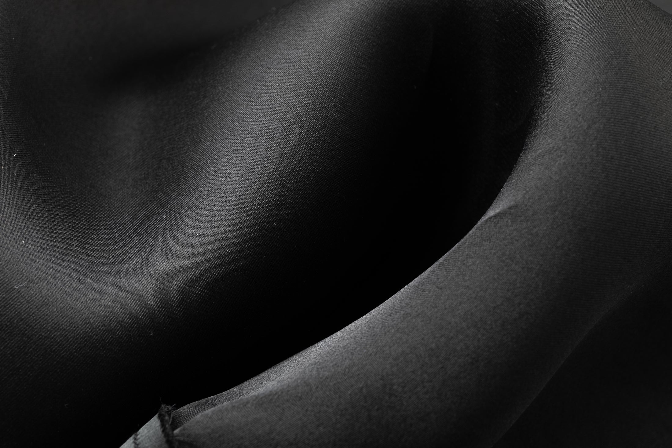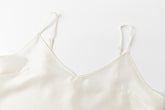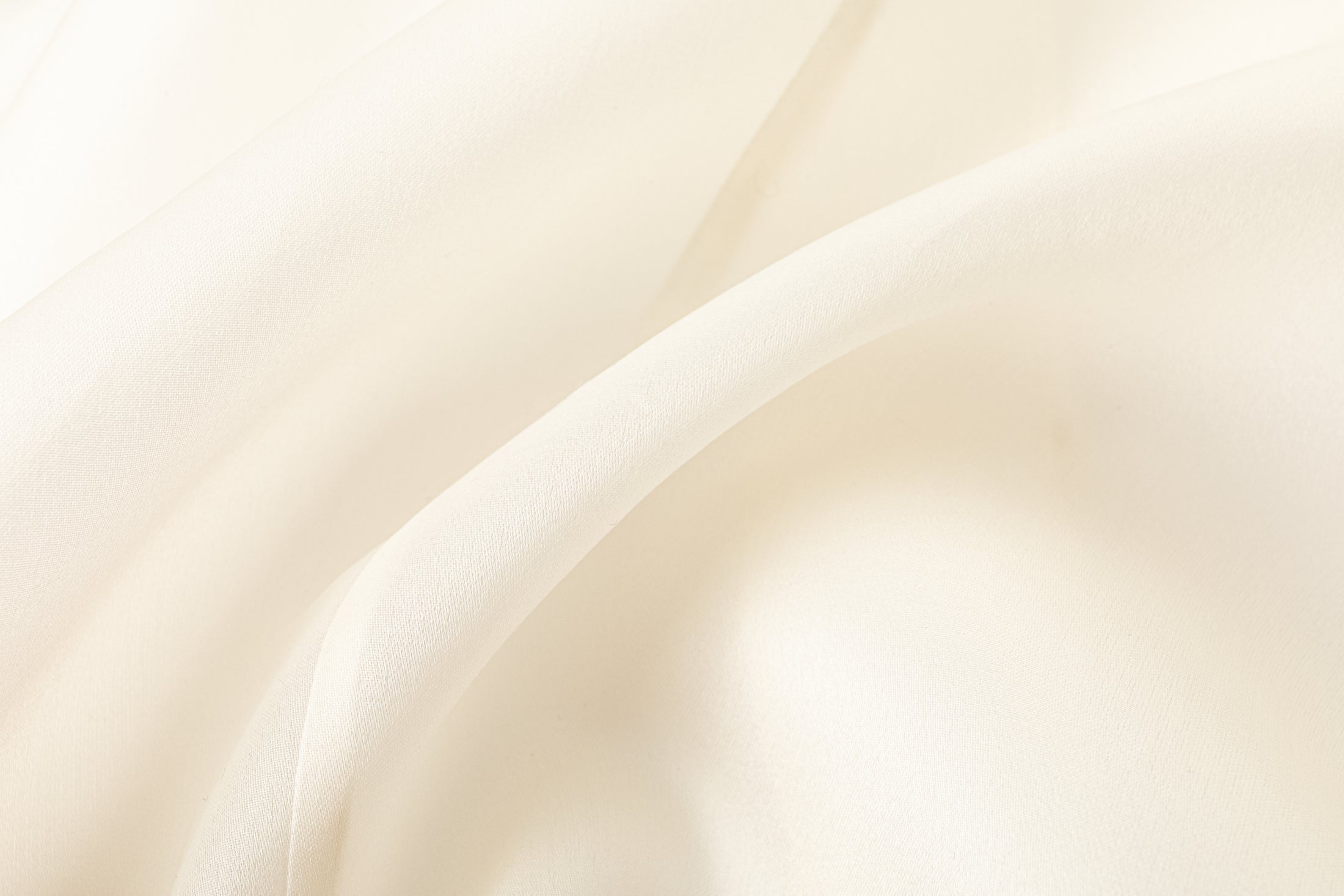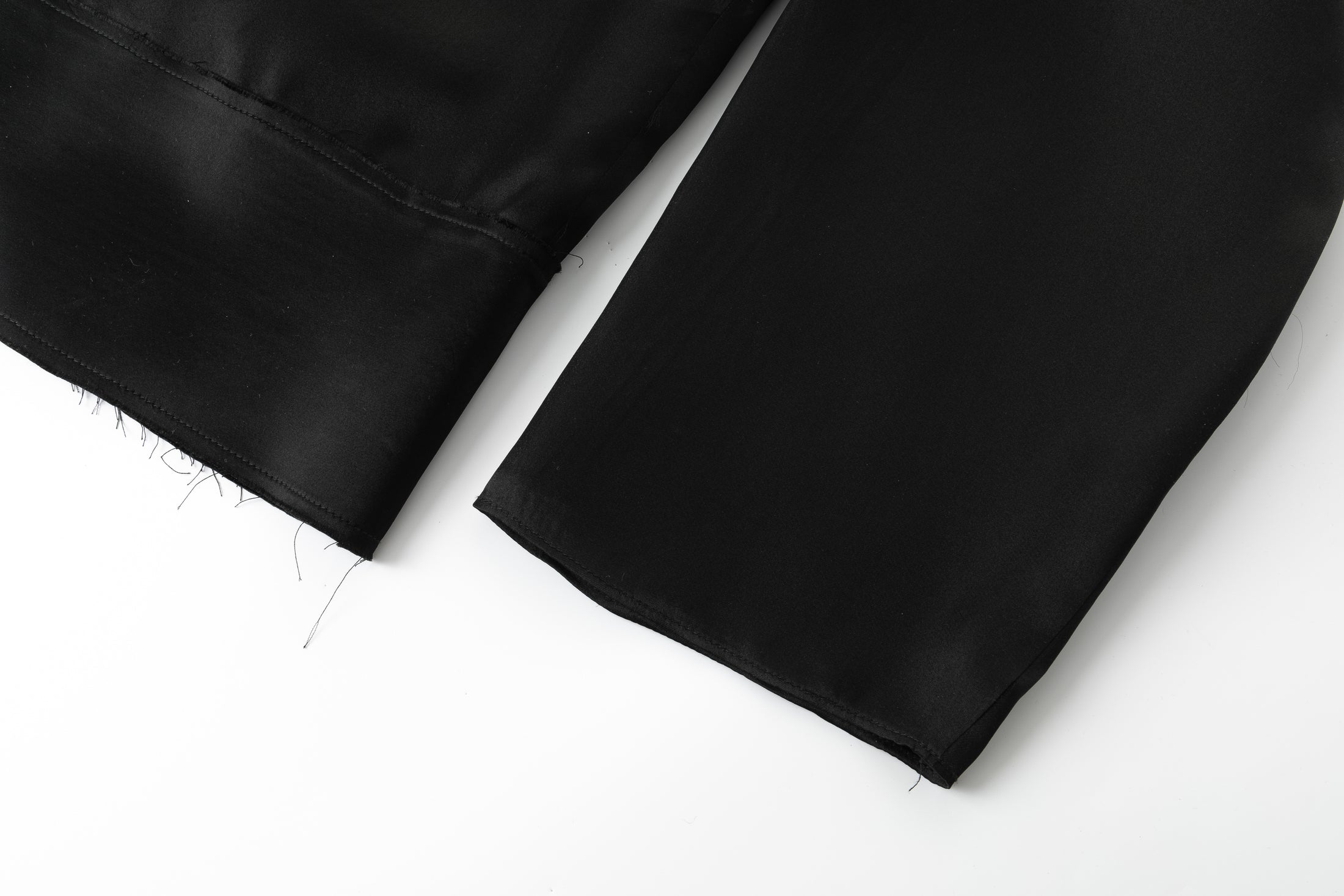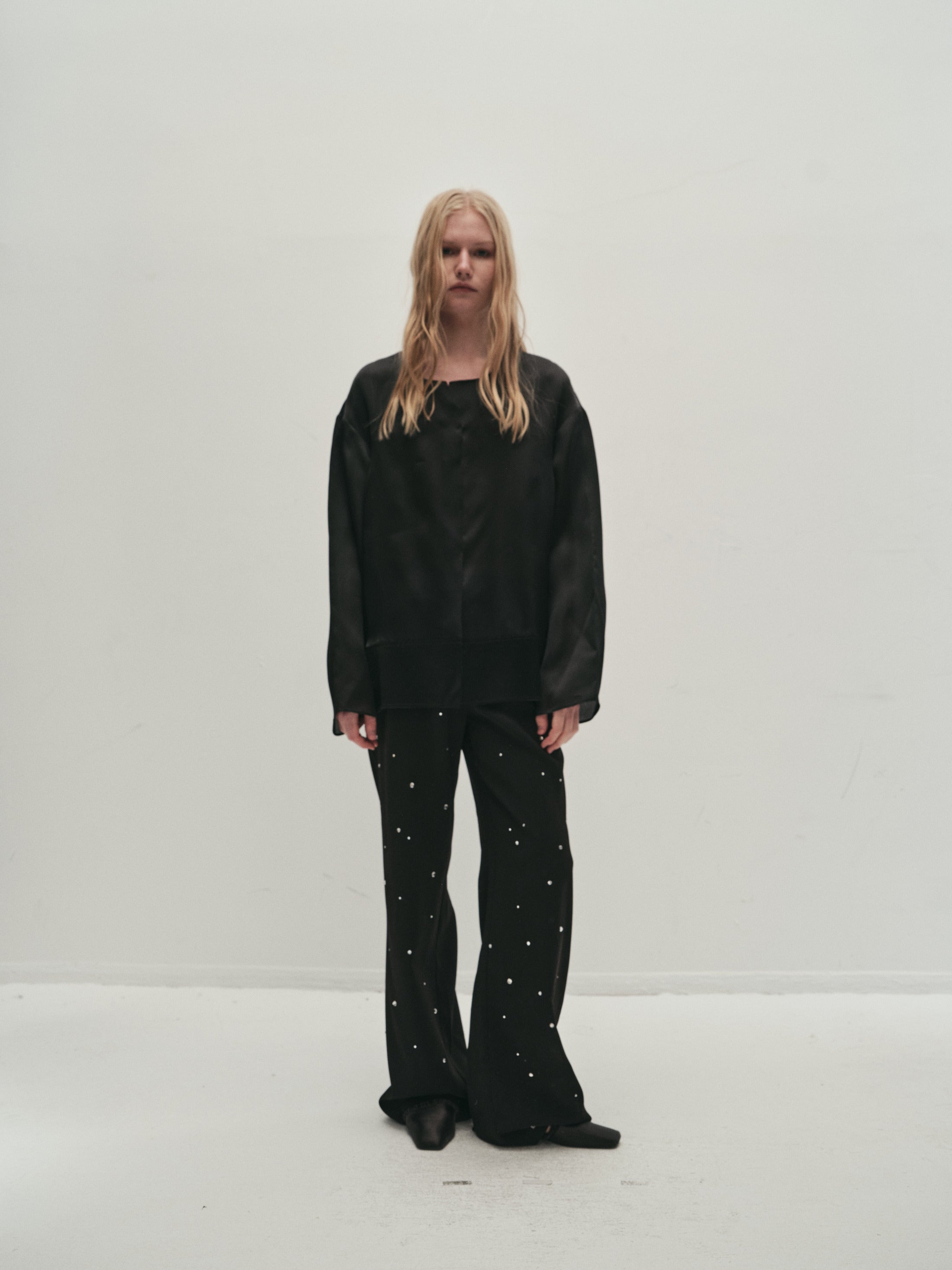 Sheer silk blouse featuring a slit V-neckline, a wide banded hem with a central slit, and a back seam running down the middle