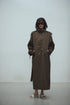 Trench coat featuring a double-breasted design with prominent silver buttons. The shoulders have wide flaps. The sleeves are detailed with buckles at the hems for an adjustable fit, matc...