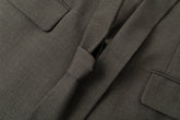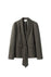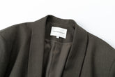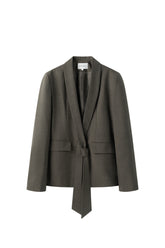 Wide shoulder blazer with tie detail and rounded pocket details. Tuck one side of the collar into the hole on the otherside to close the blazer