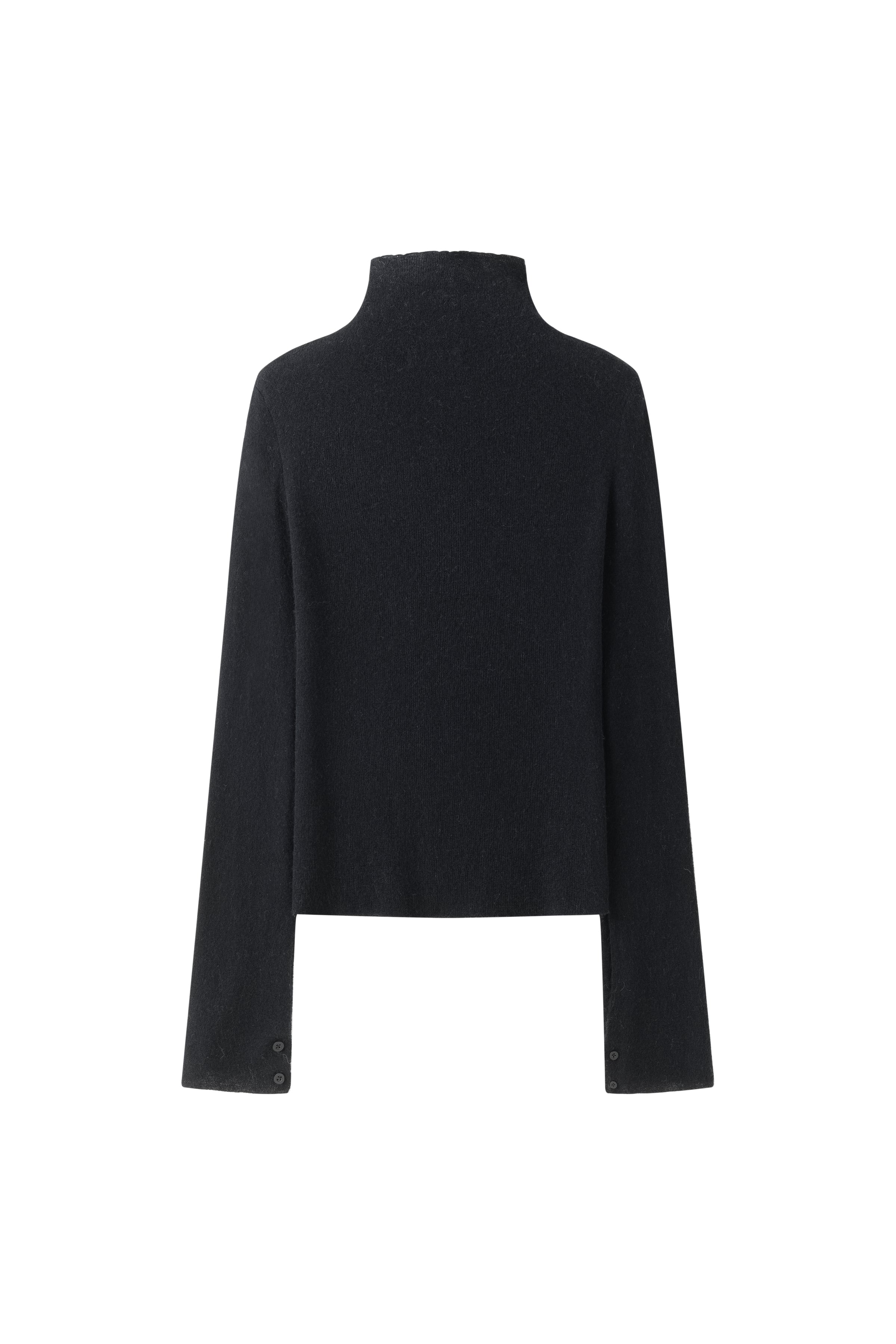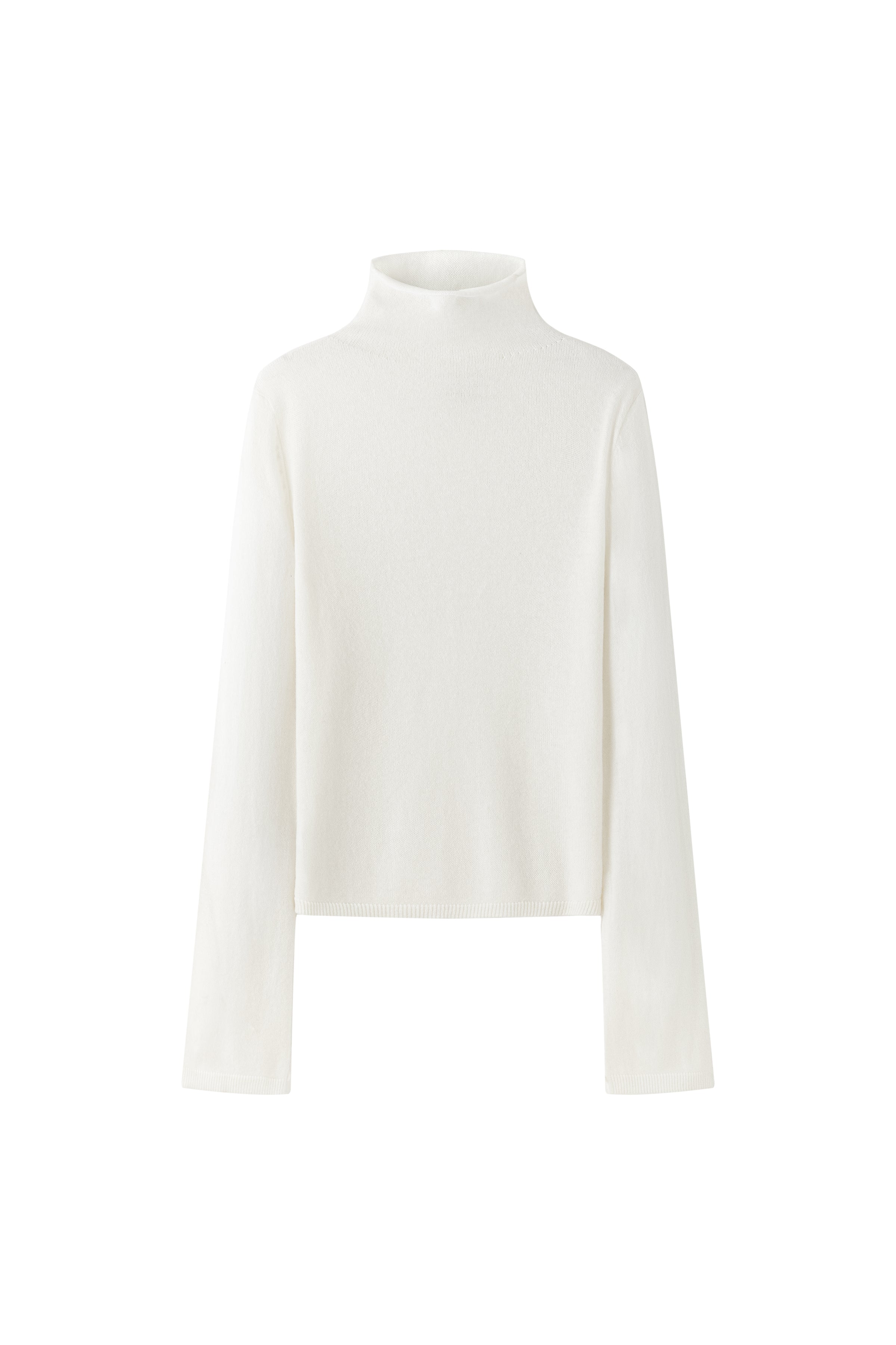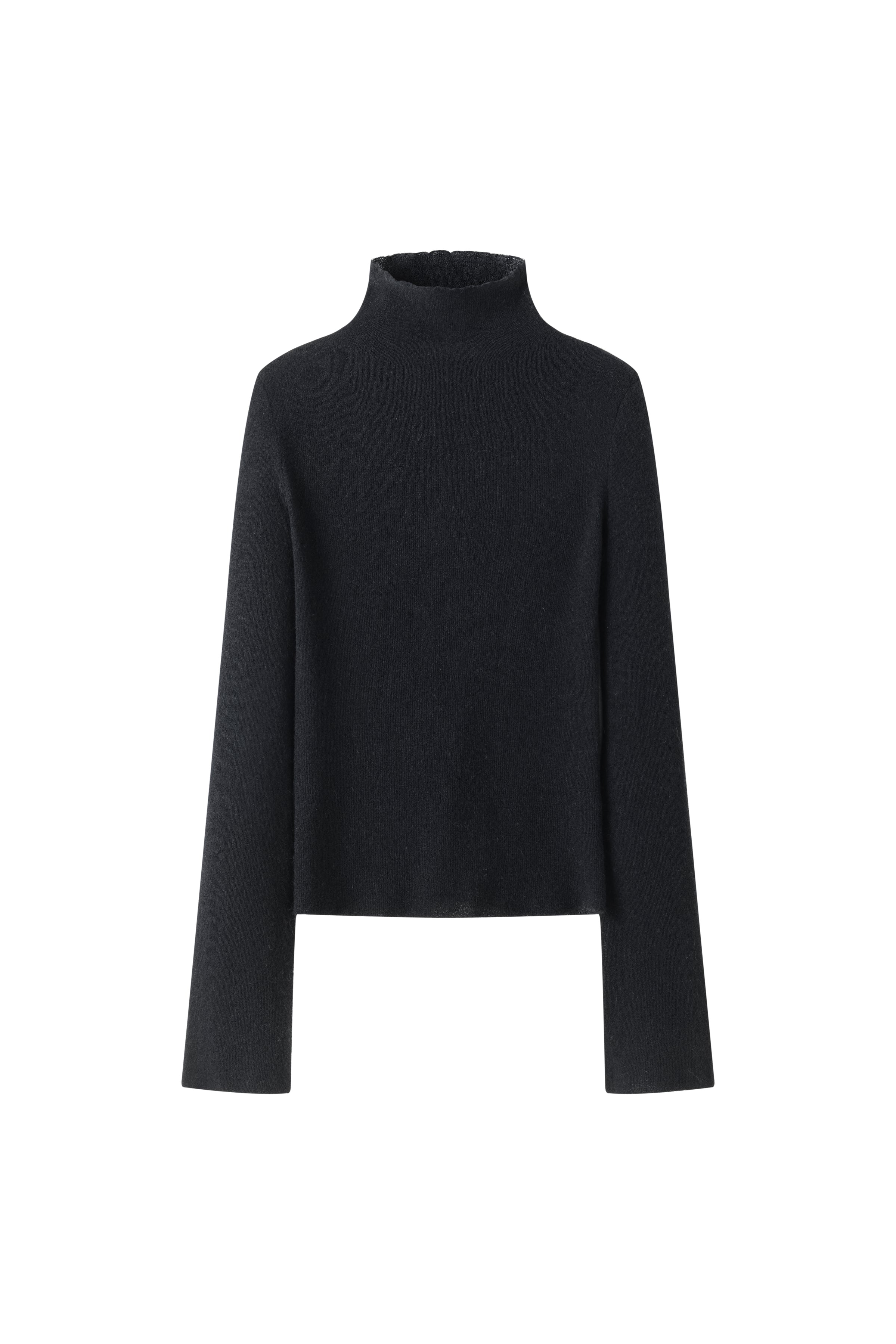 Fitted knit sweater made from a blend of alpaca and wool with a slightly rolled turtleneck that softly curves for a cozy yet polished finish. Sleek silhouette.
