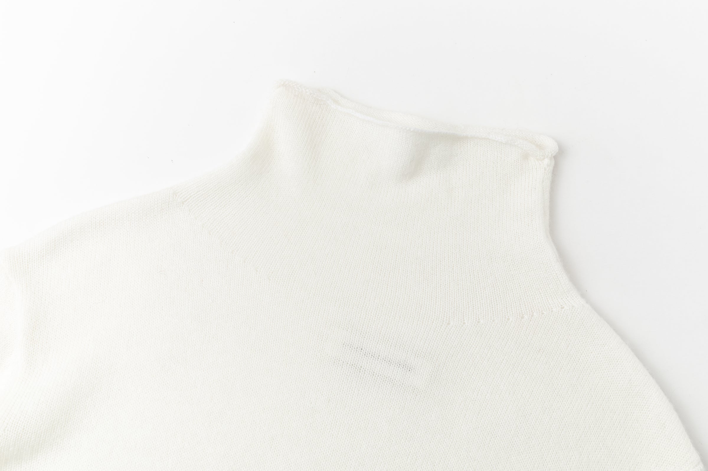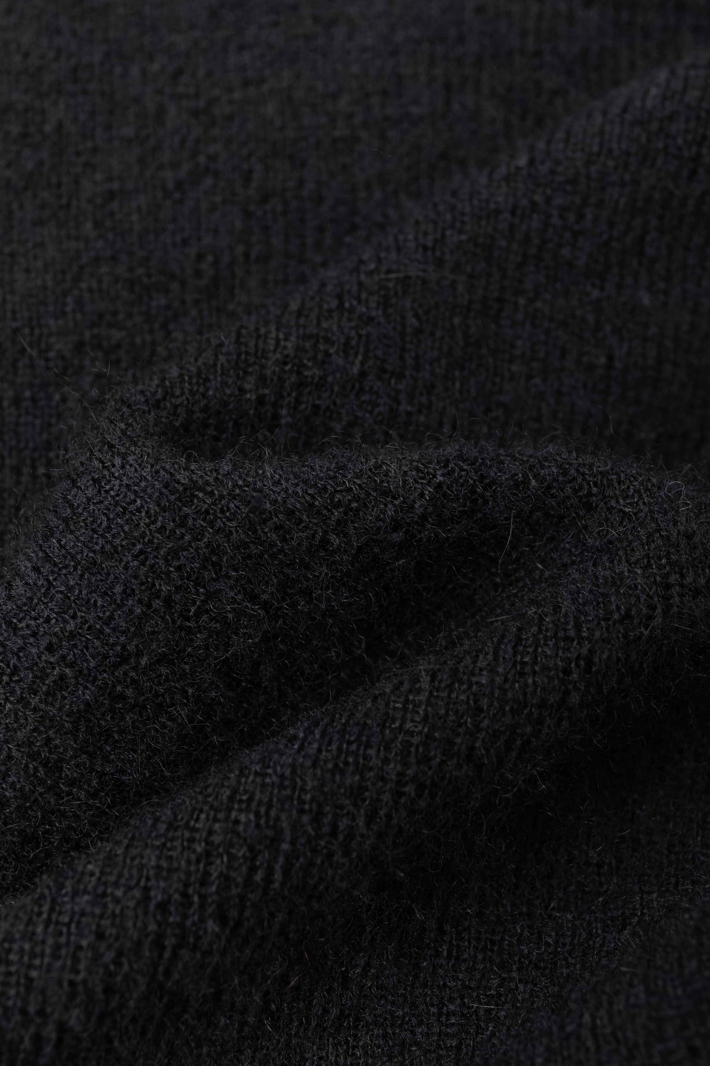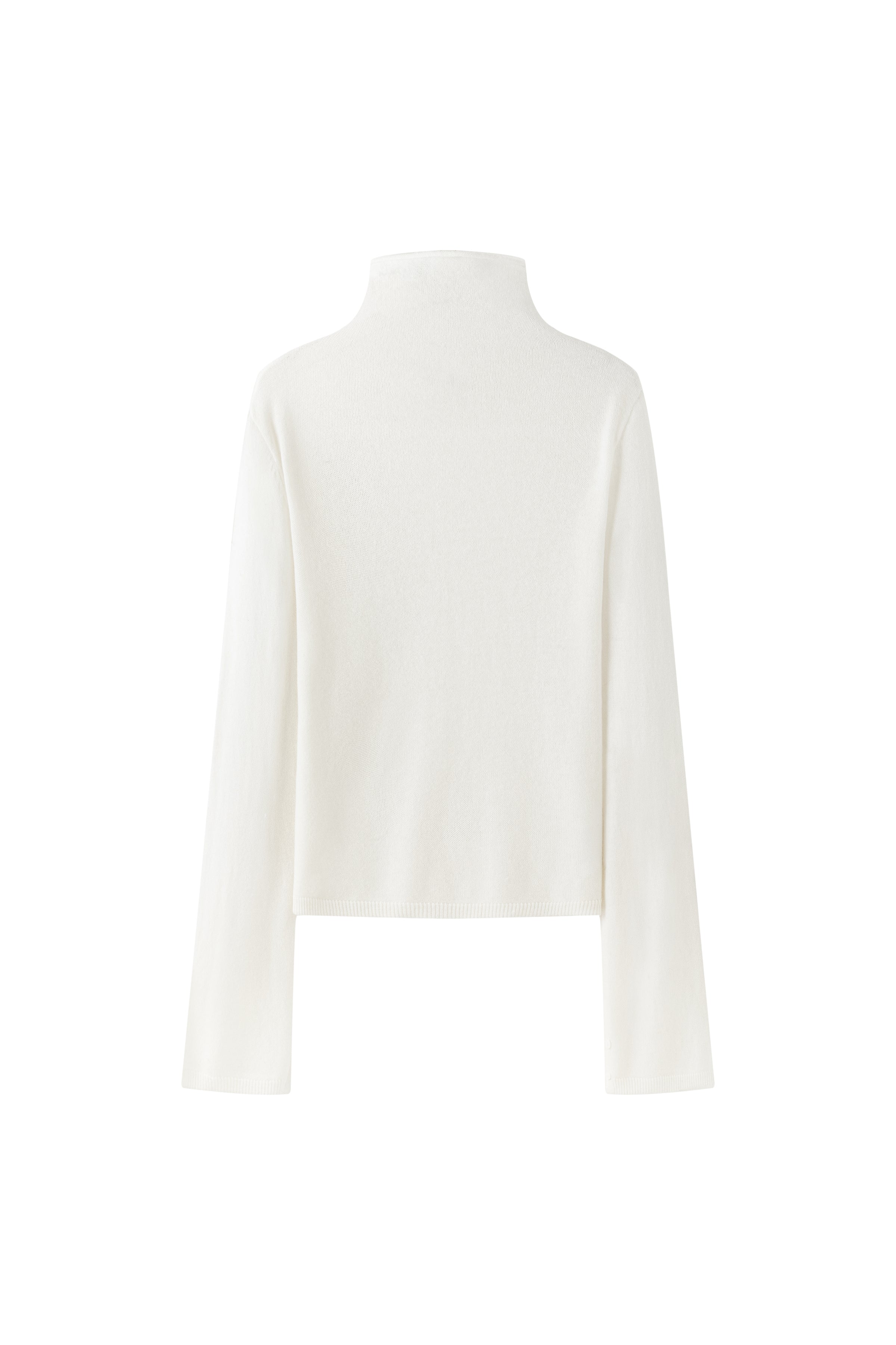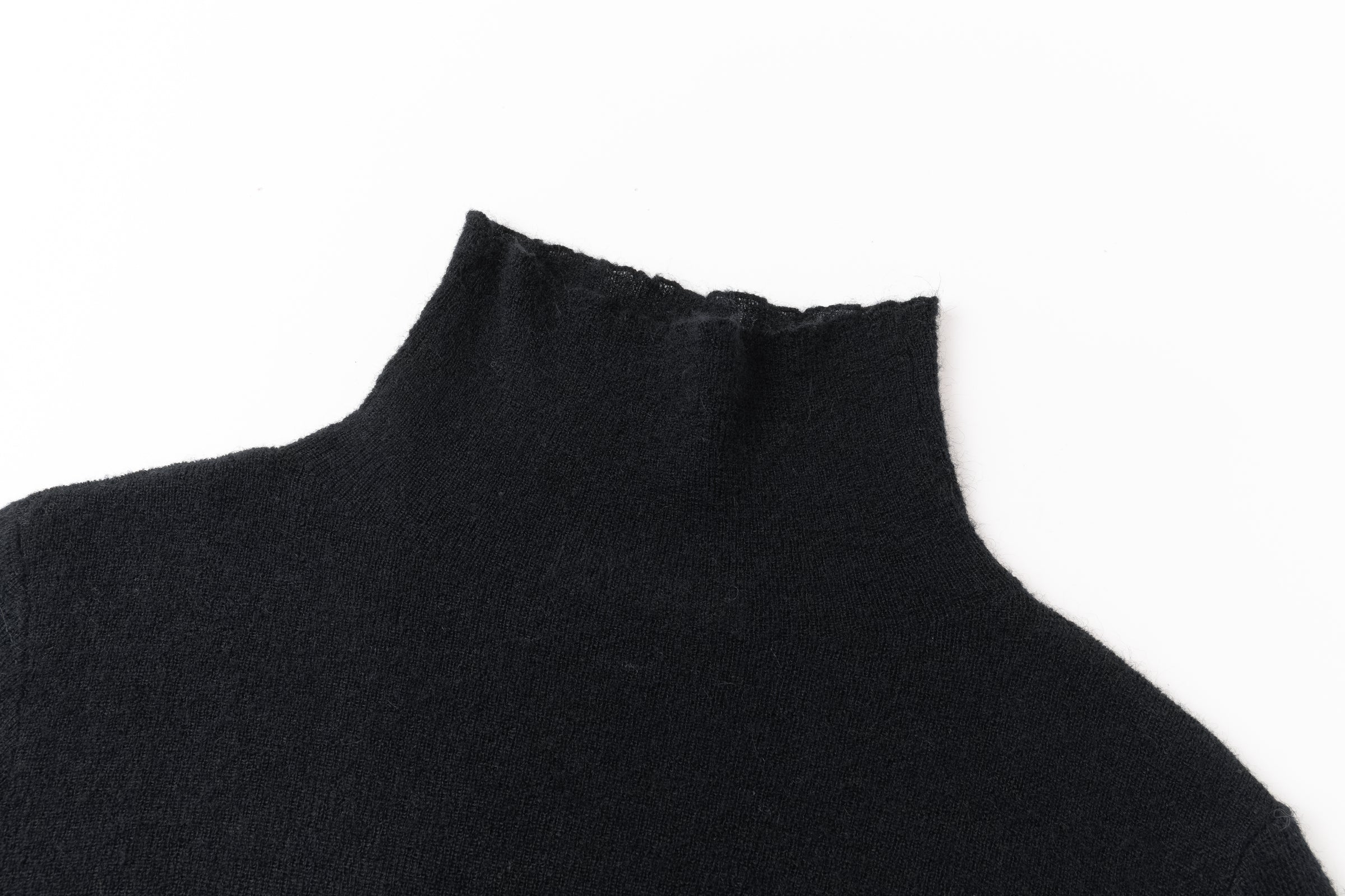 Fitted knit sweater made from a blend of alpaca and wool with a slightly rolled turtleneck that softly curves for a cozy yet polished finish. Sleek silhouette.