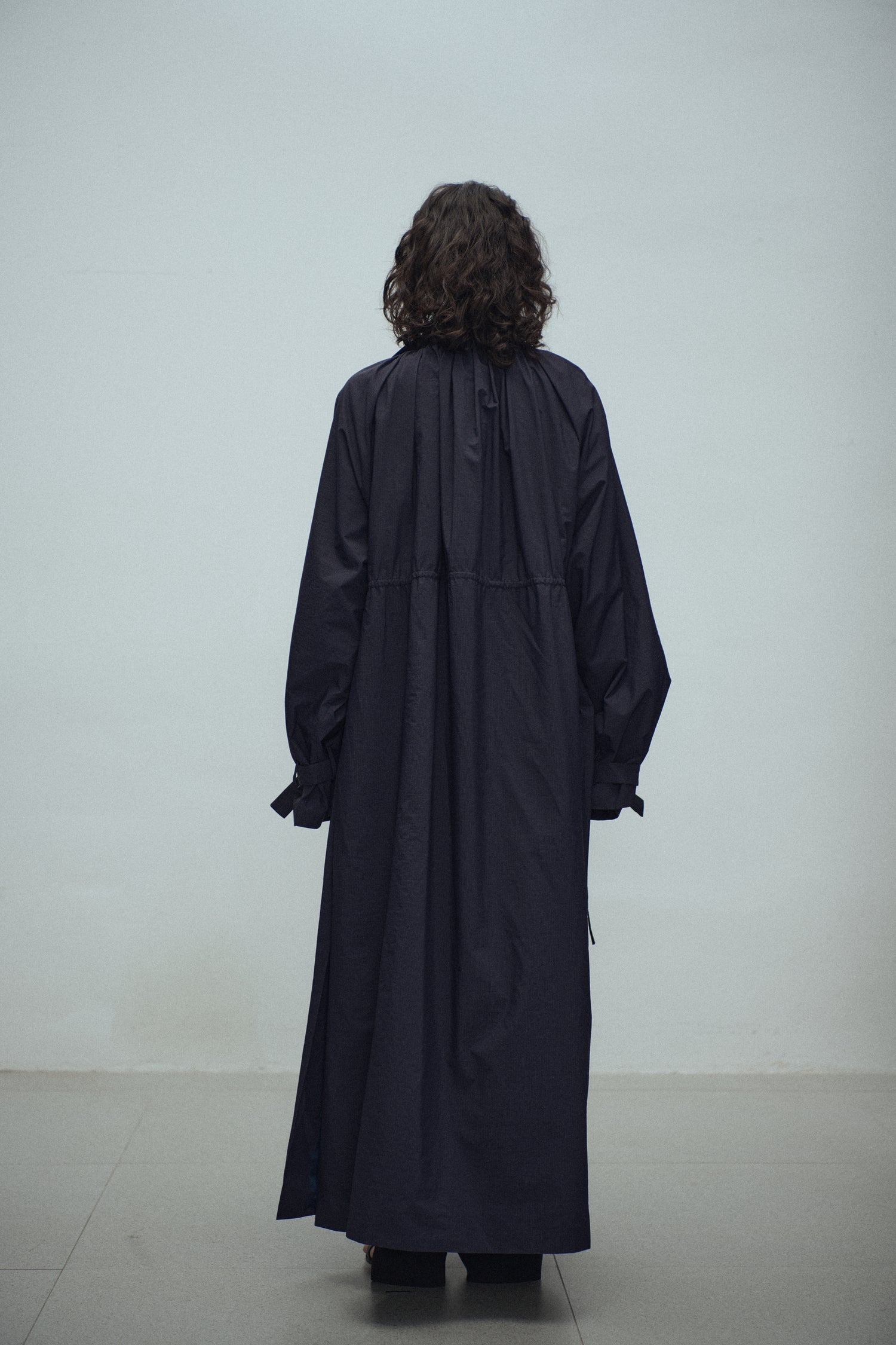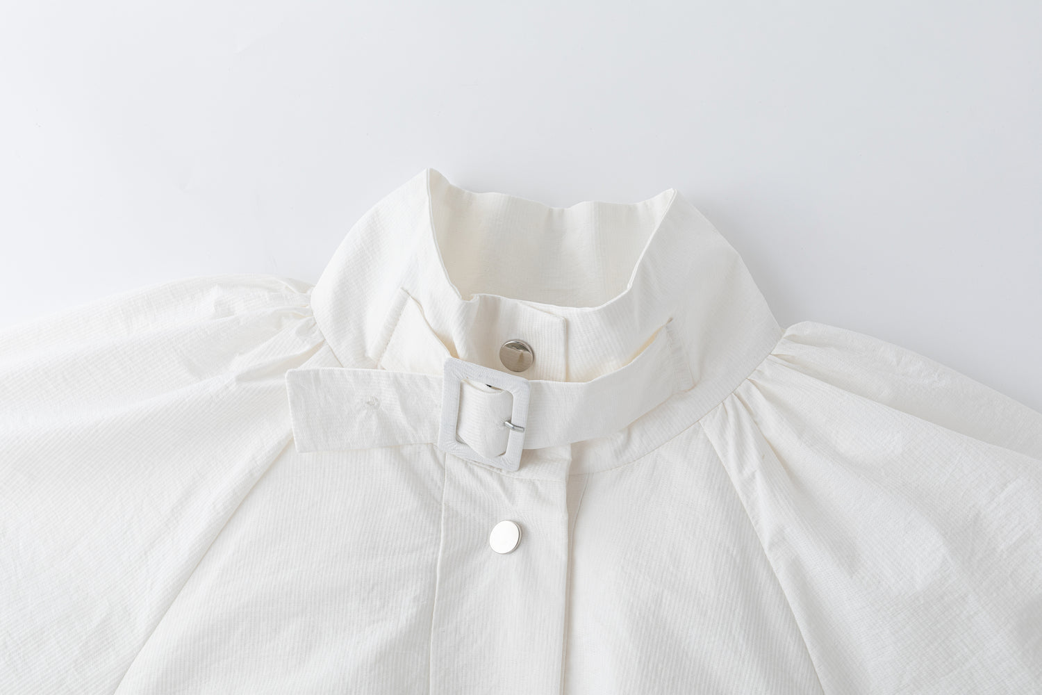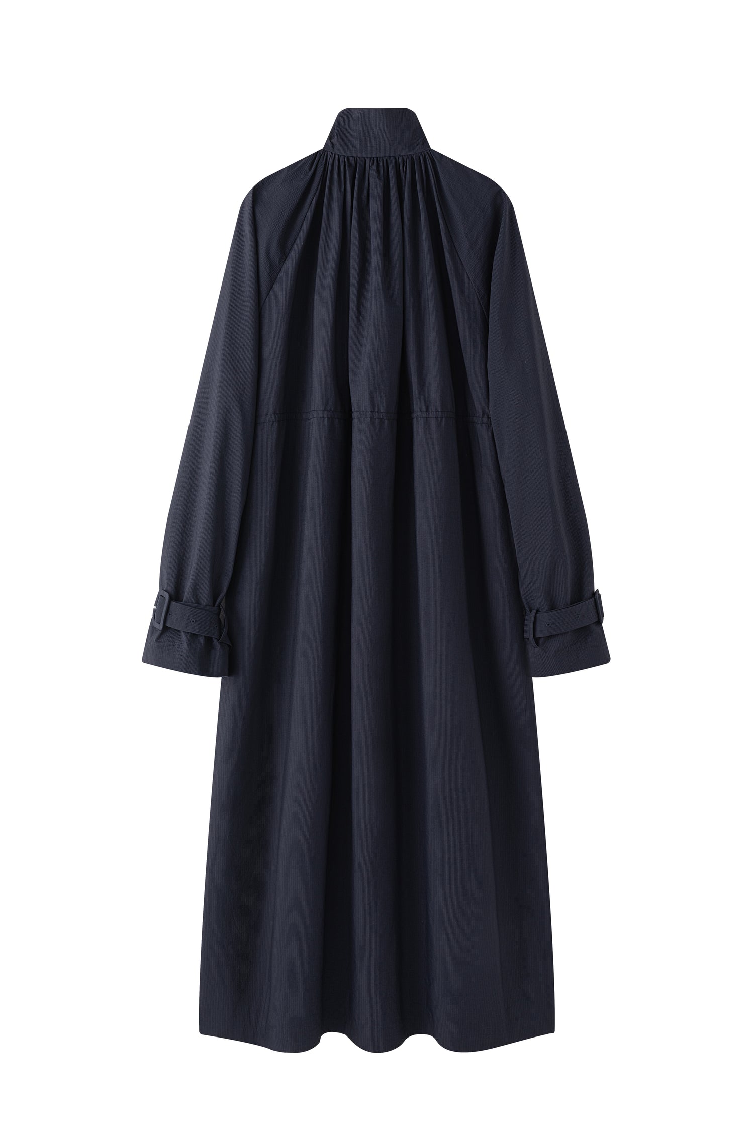 Gathered trench coat with a high neck and a neck buckle. Features sleeves buckles at the hems, open side slits and a drawstring at the waist for adjustable fit. Lightweight, textured mat...