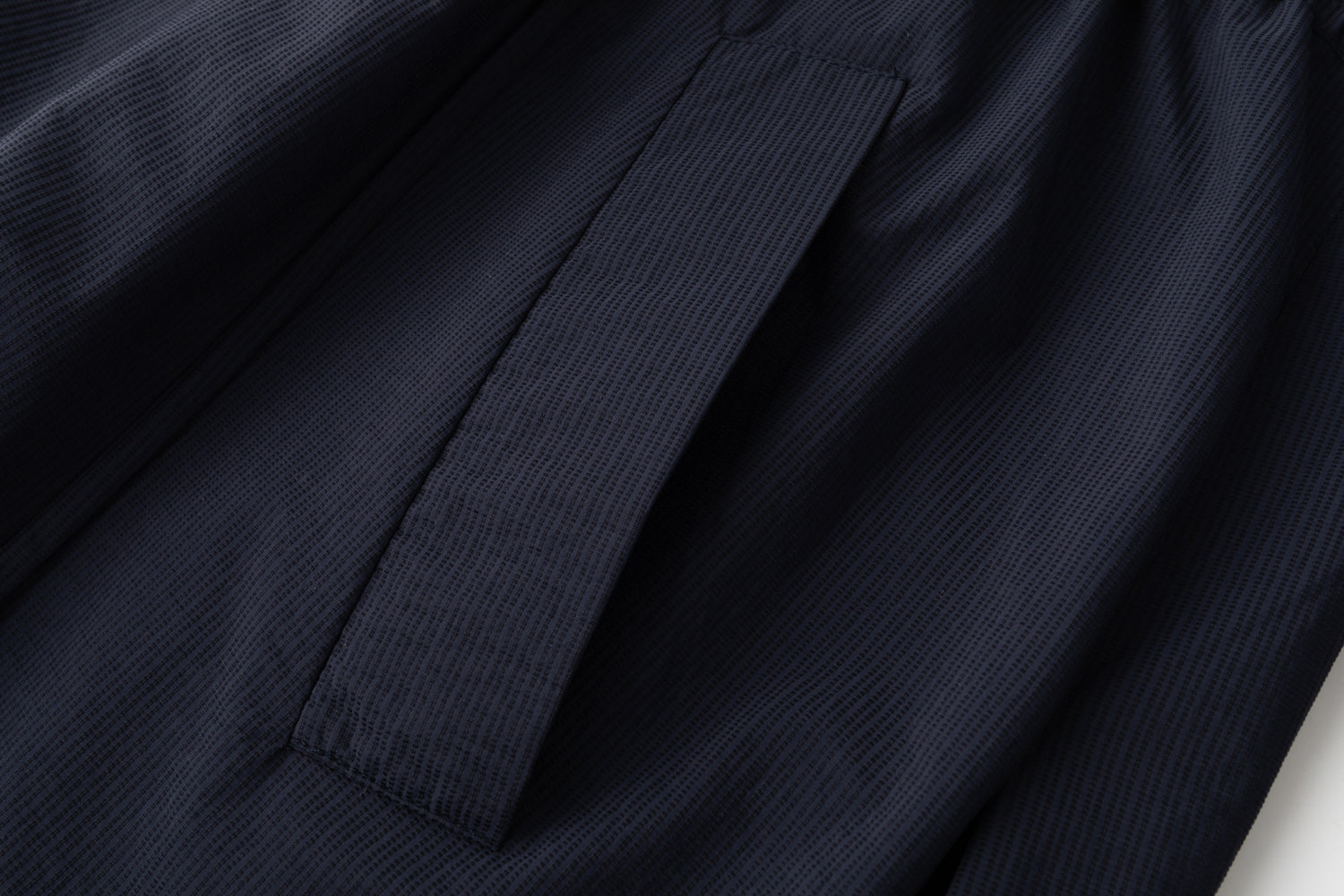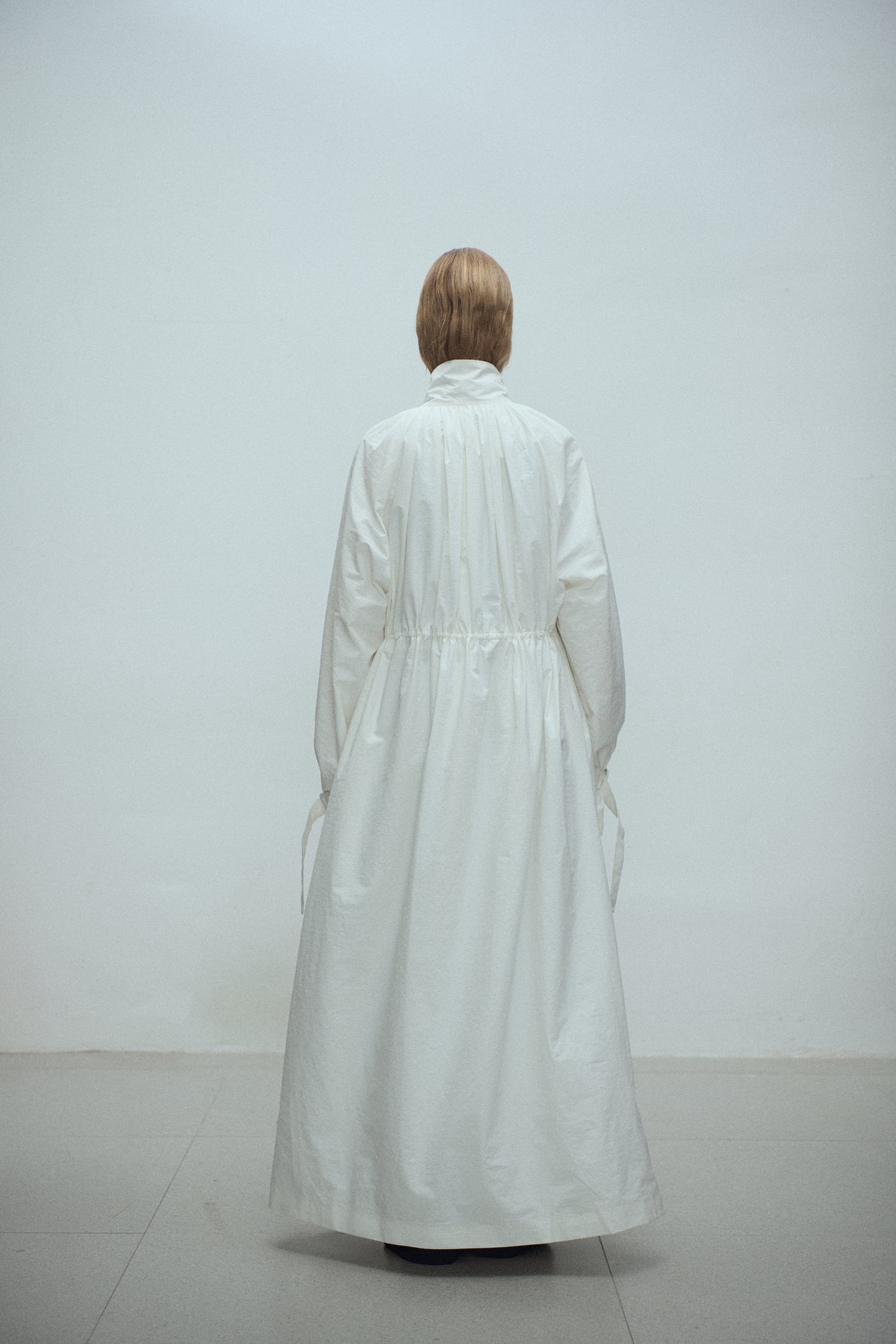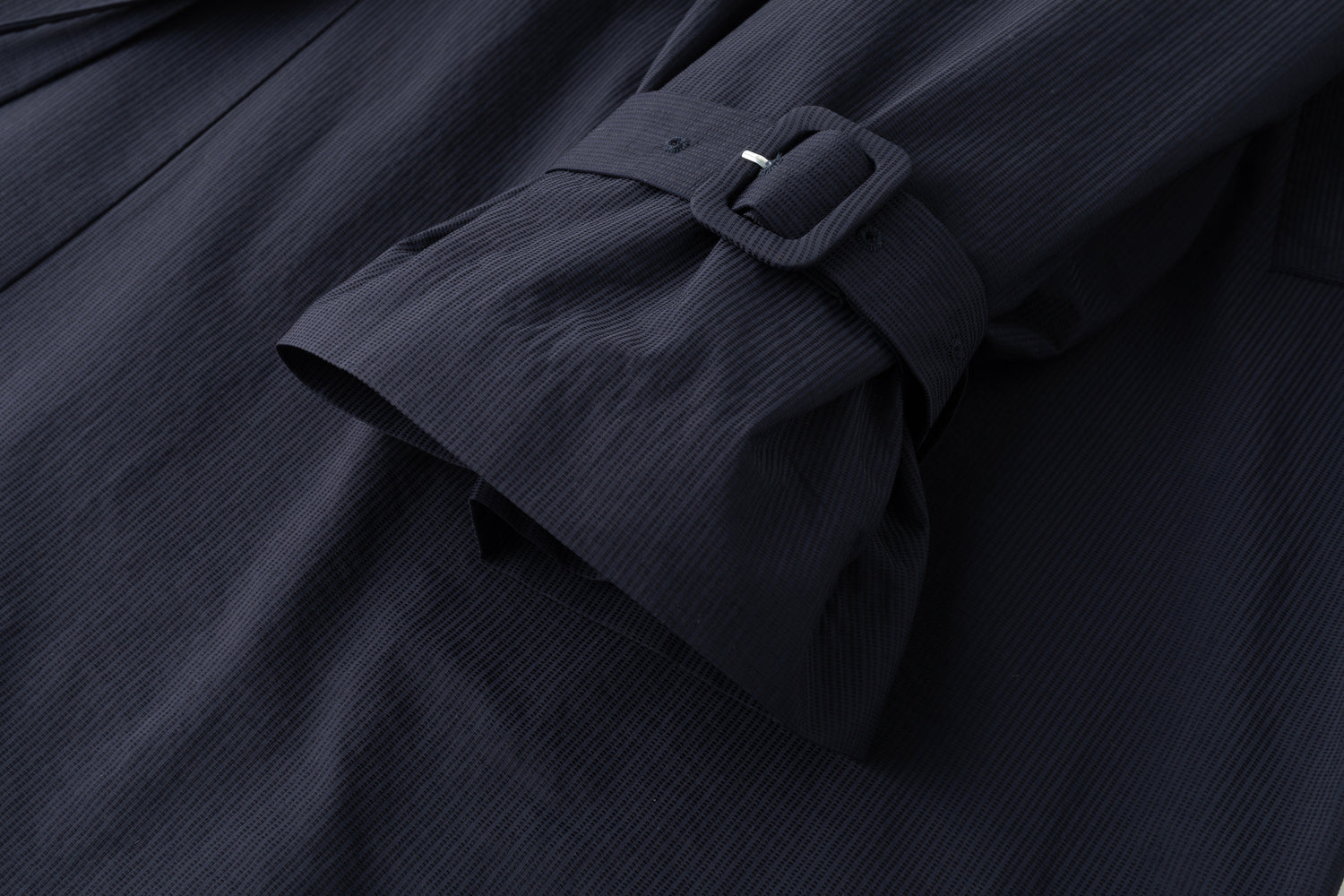 Gathered trench coat with a high neck and a neck buckle. Features sleeves buckles at the hems, open side slits and a drawstring at the waist for adjustable fit. Lightweight, textured mat...