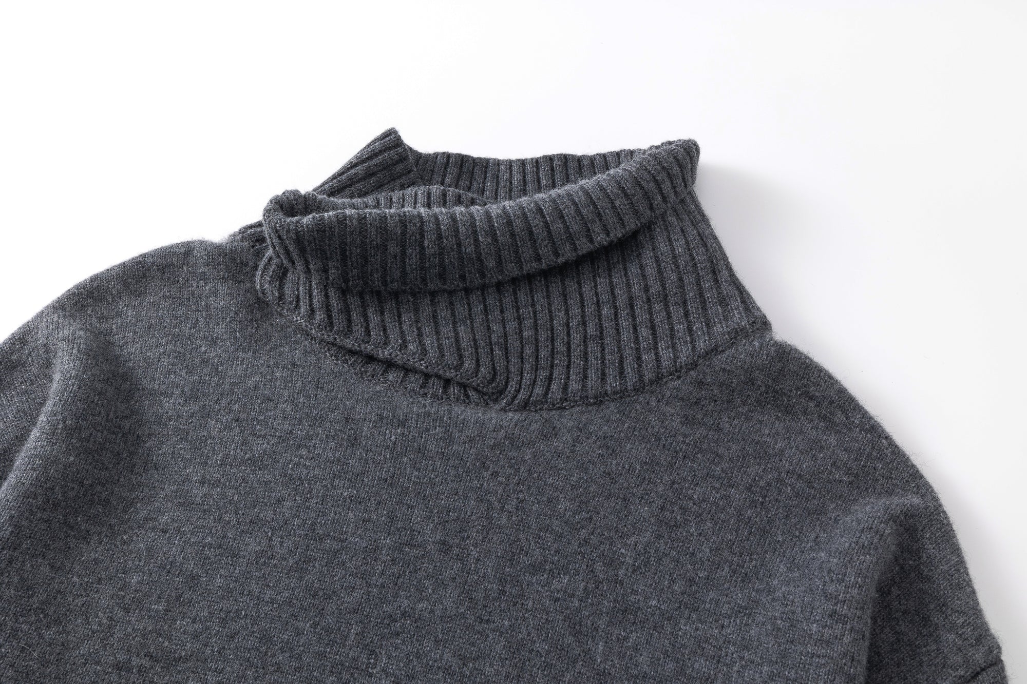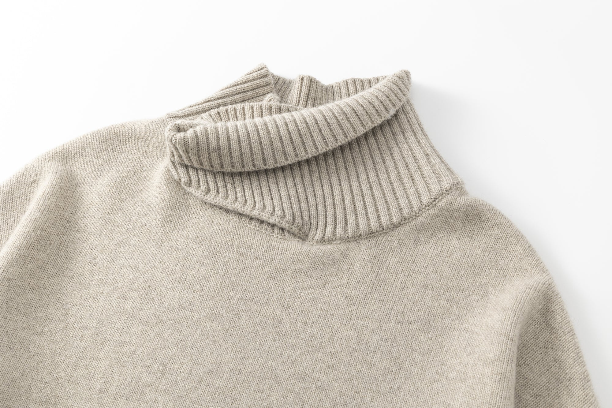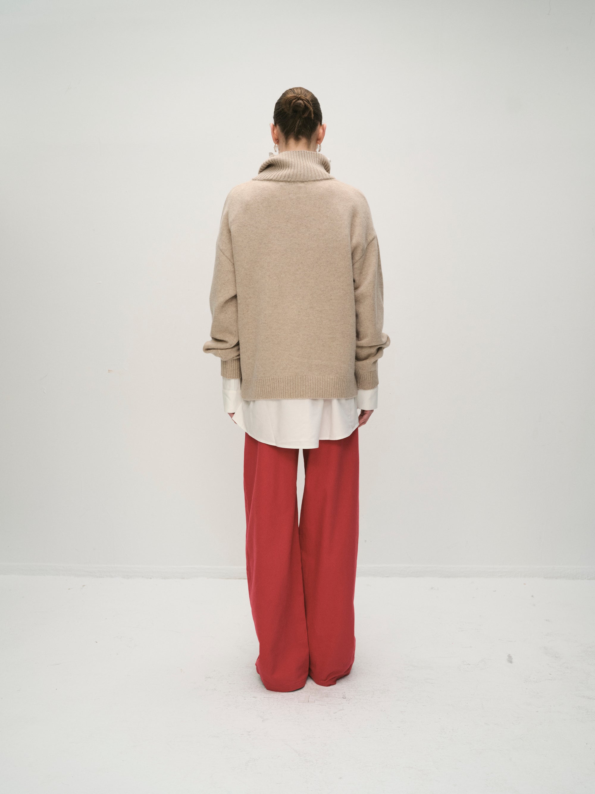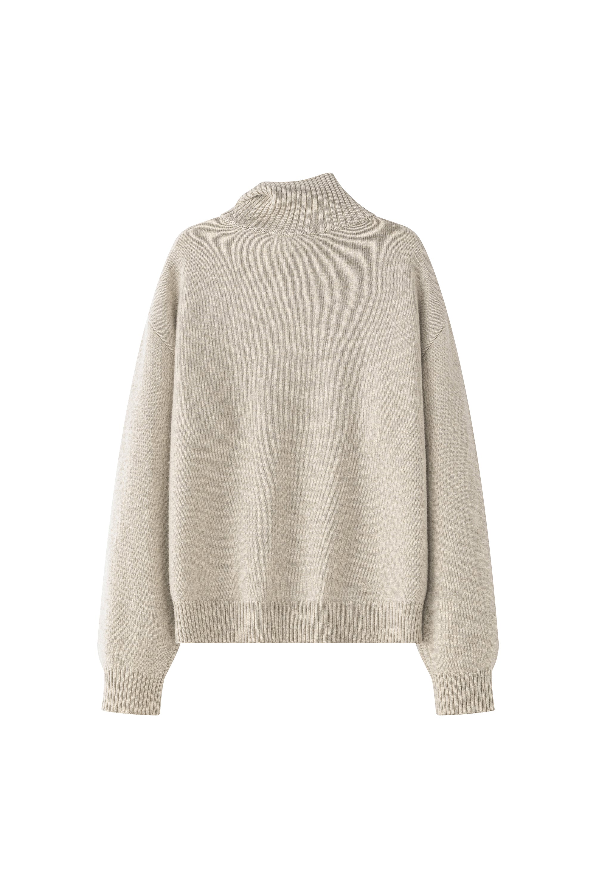 Relaxed, oversized knit sweater with extra ribbed turteneck. Ribbed accents at the neckline, cuffs and bottom hem.