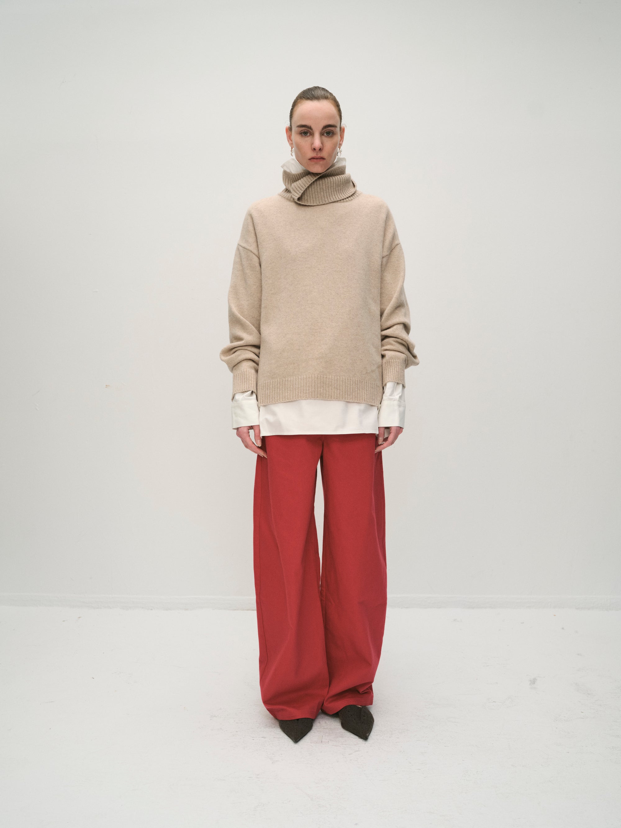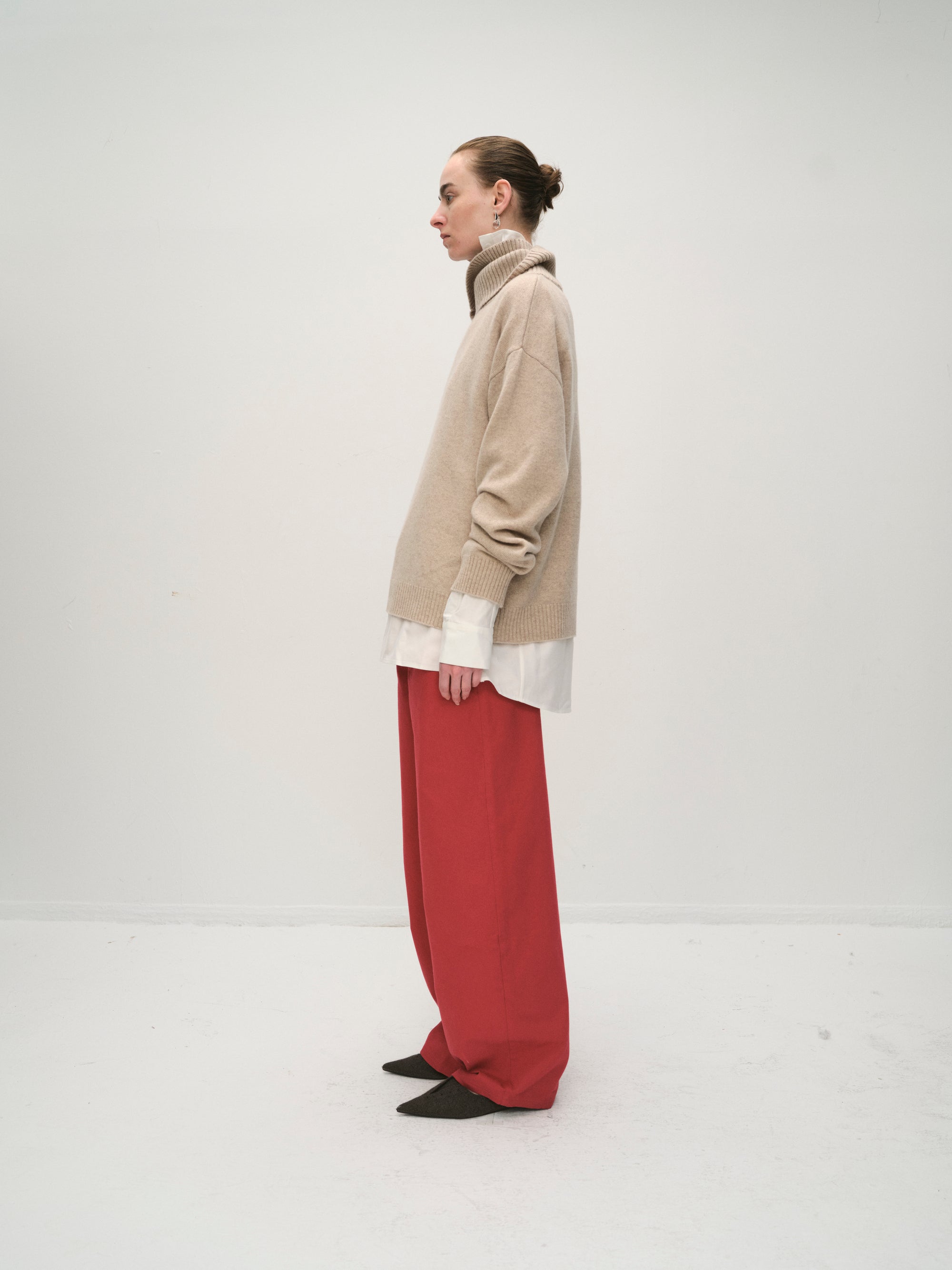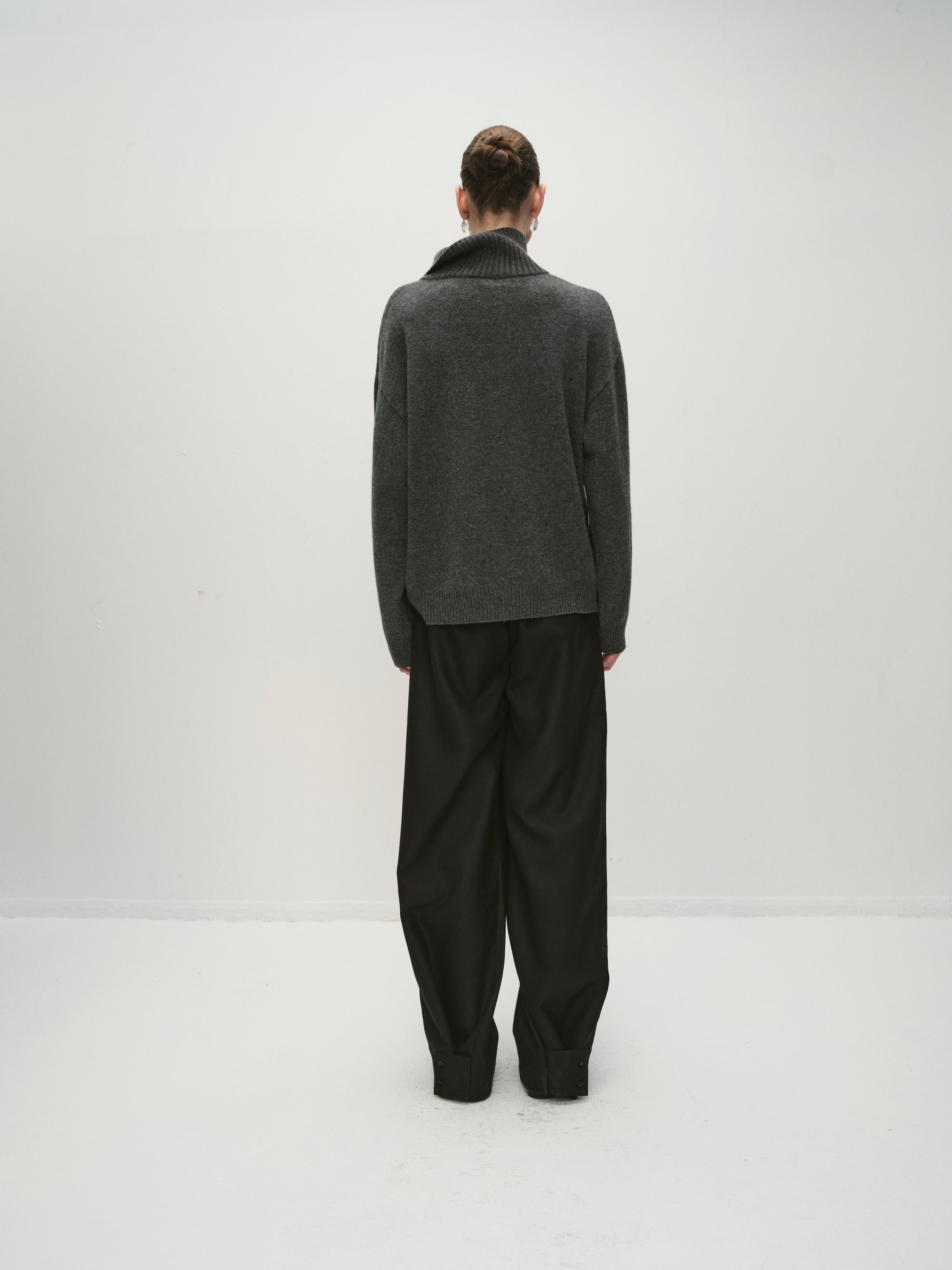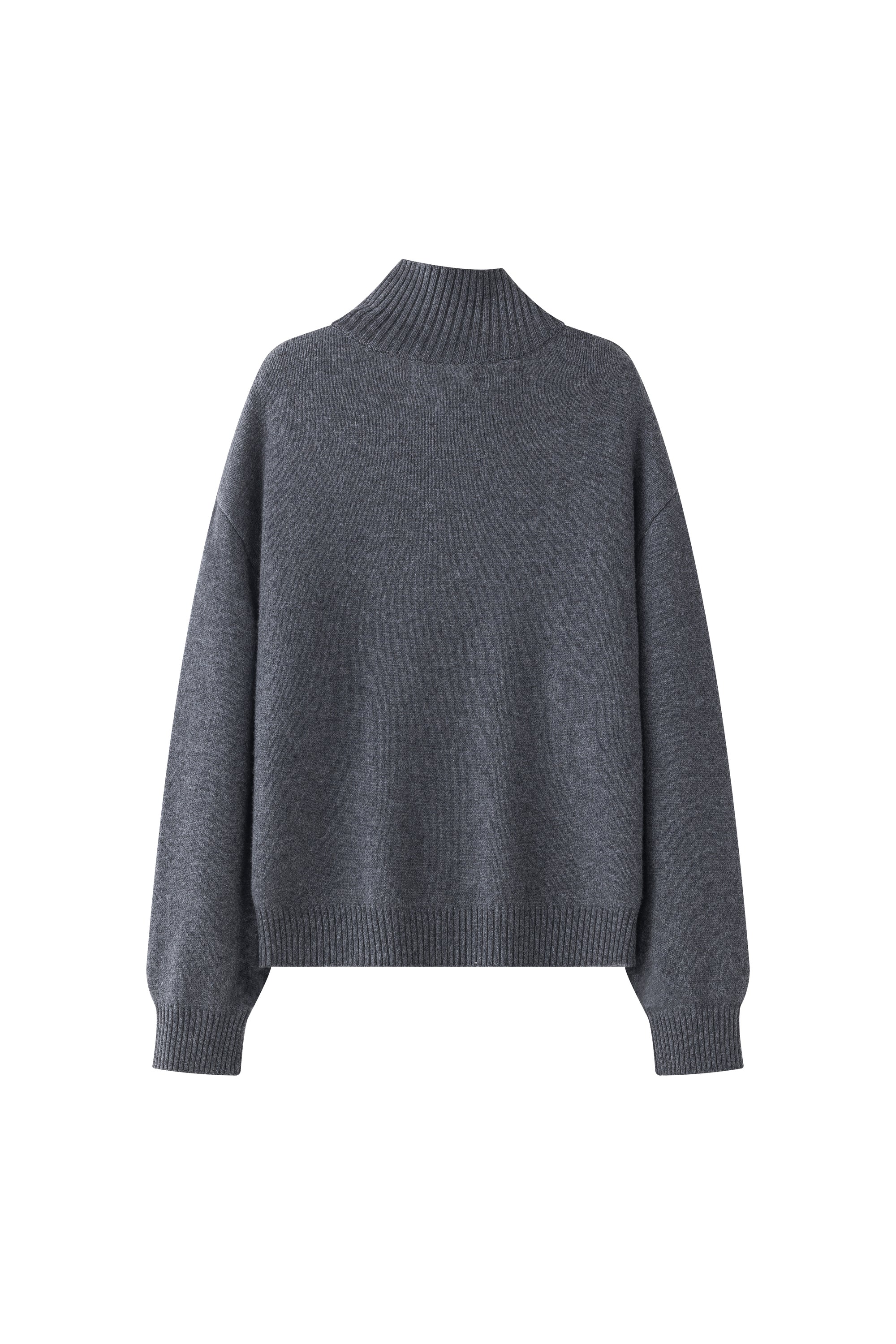 Relaxed, oversized knit sweater with extra ribbed turteneck. Ribbed accents at the neckline, cuffs and bottom hem.