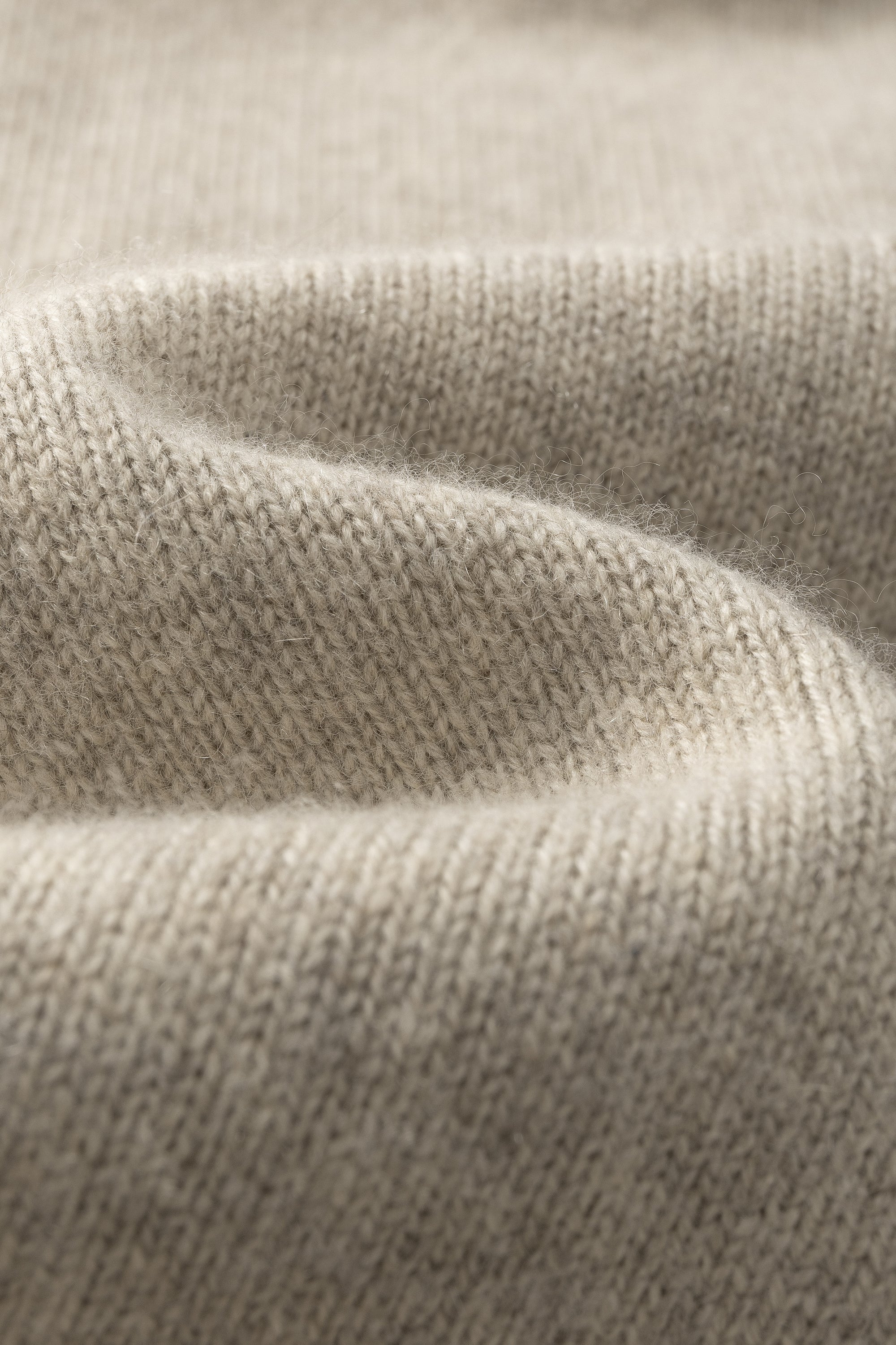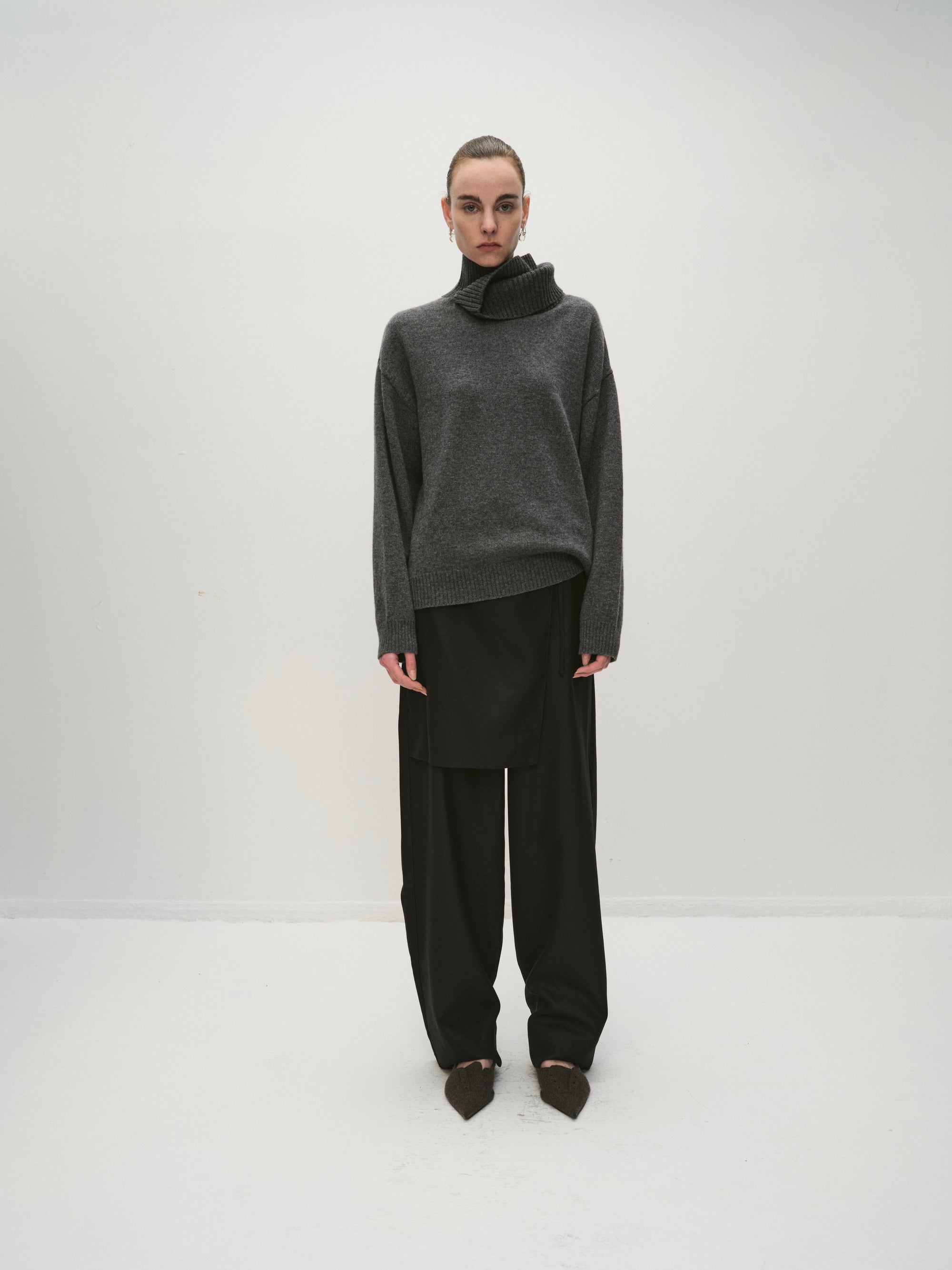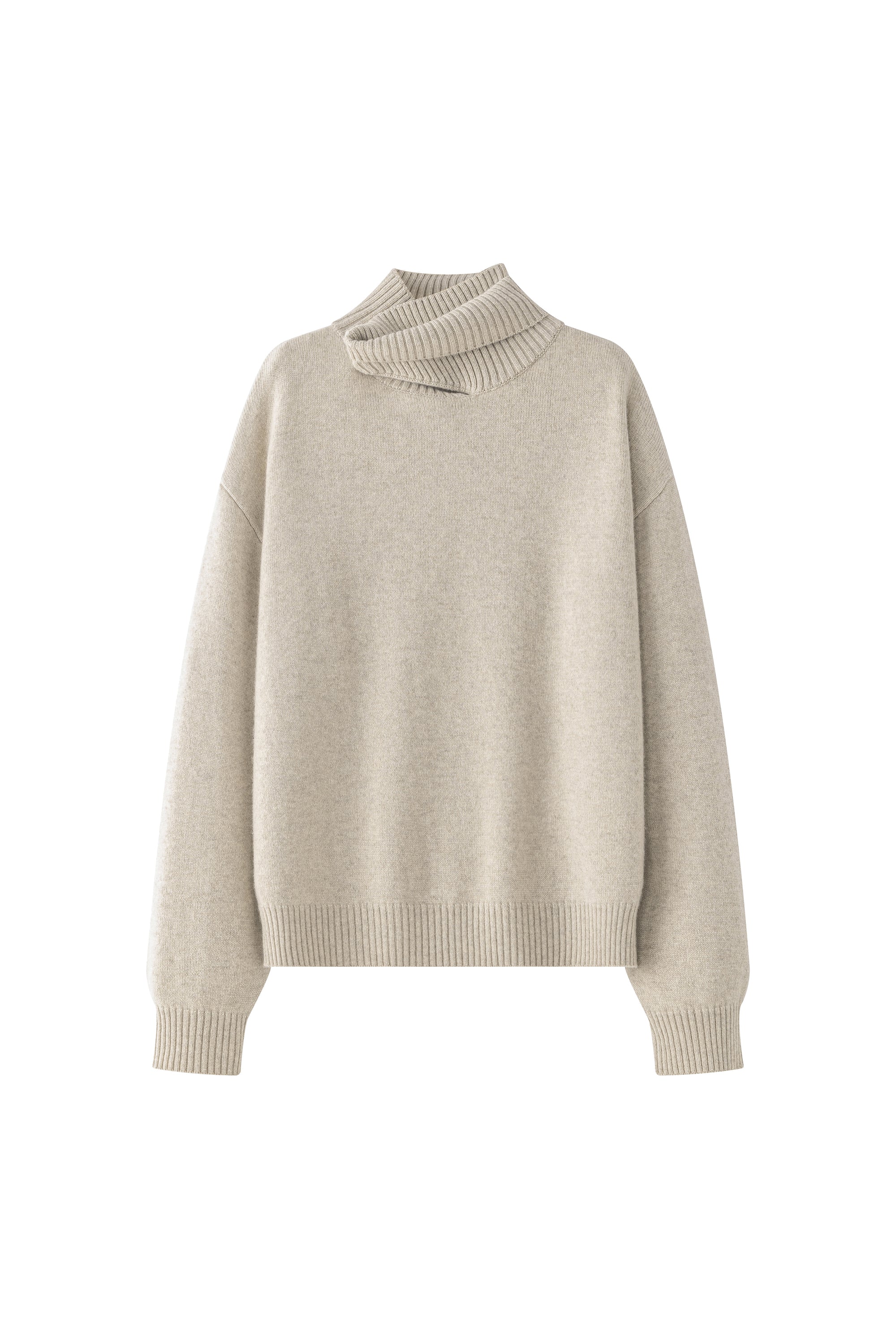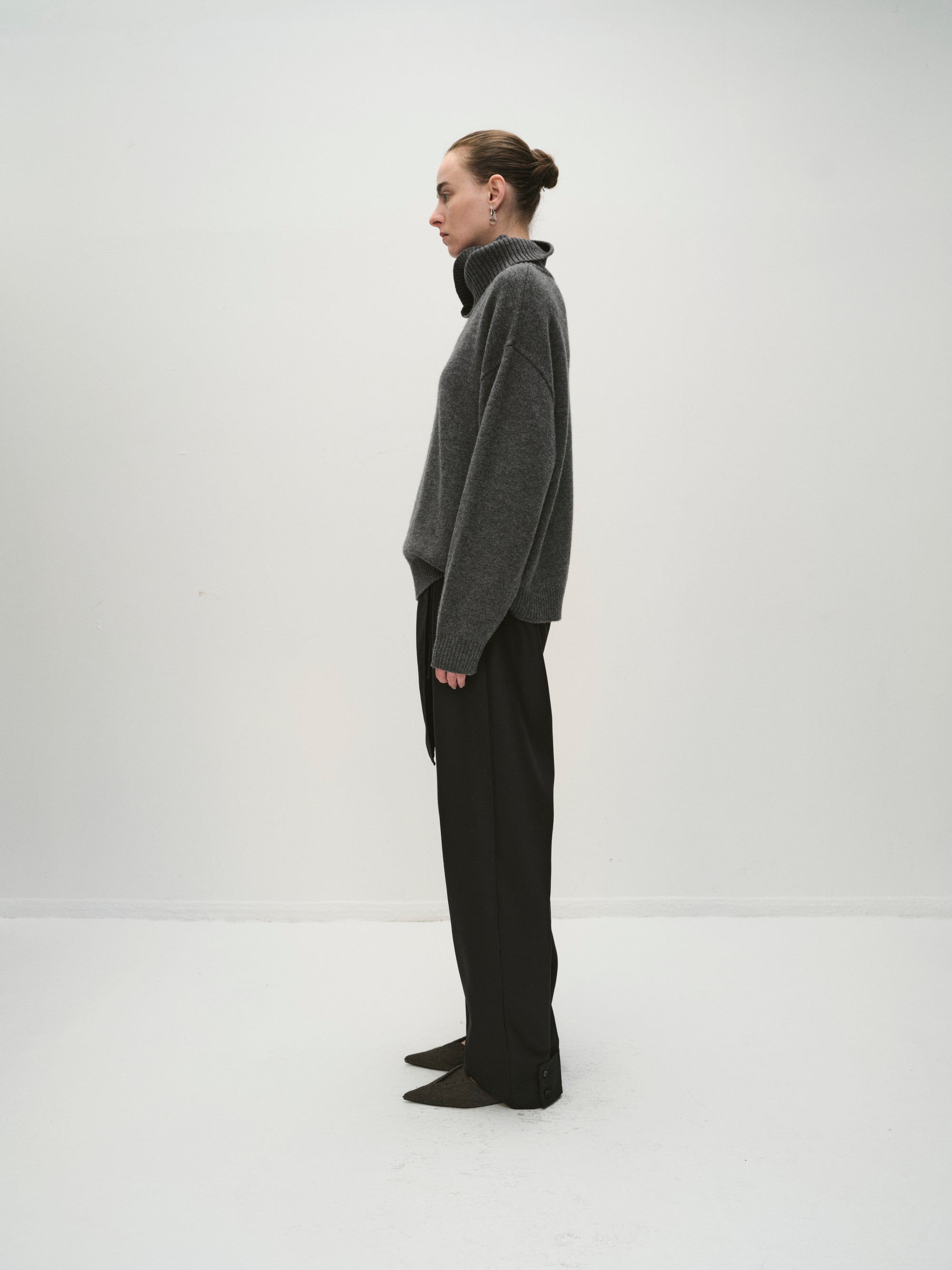 Relaxed, oversized knit sweater with extra ribbed turteneck. Ribbed accents at the neckline, cuffs and bottom hem.