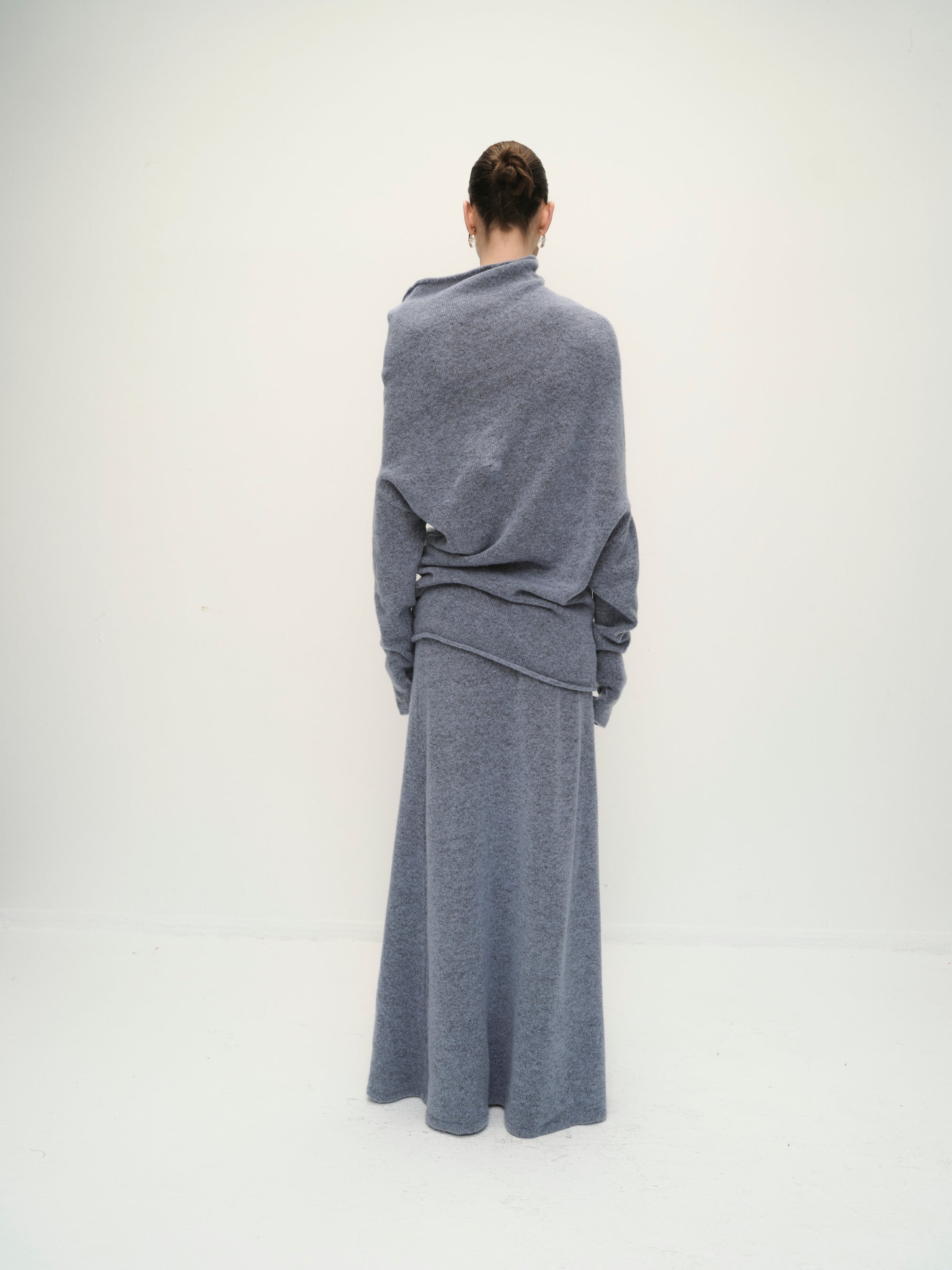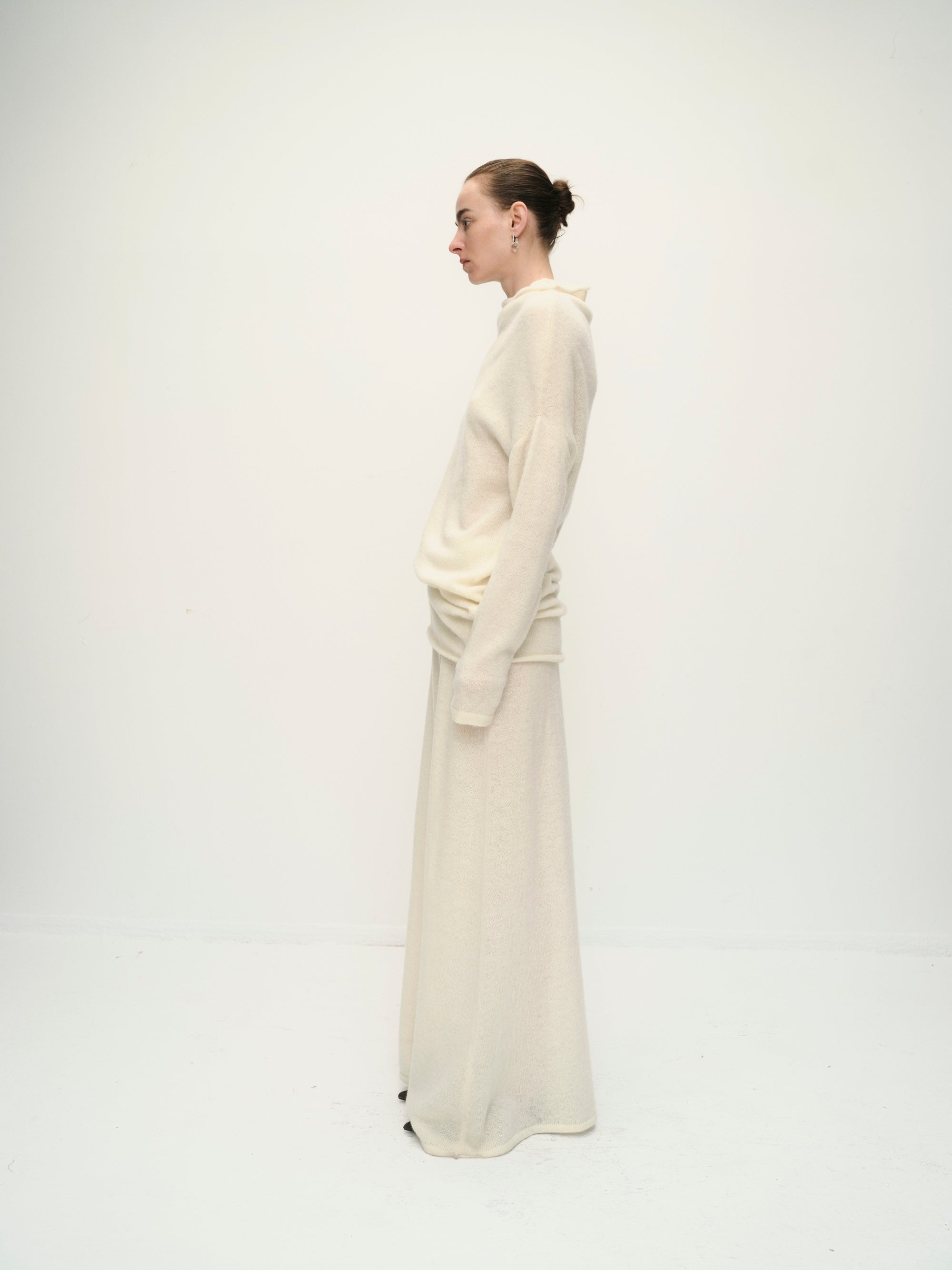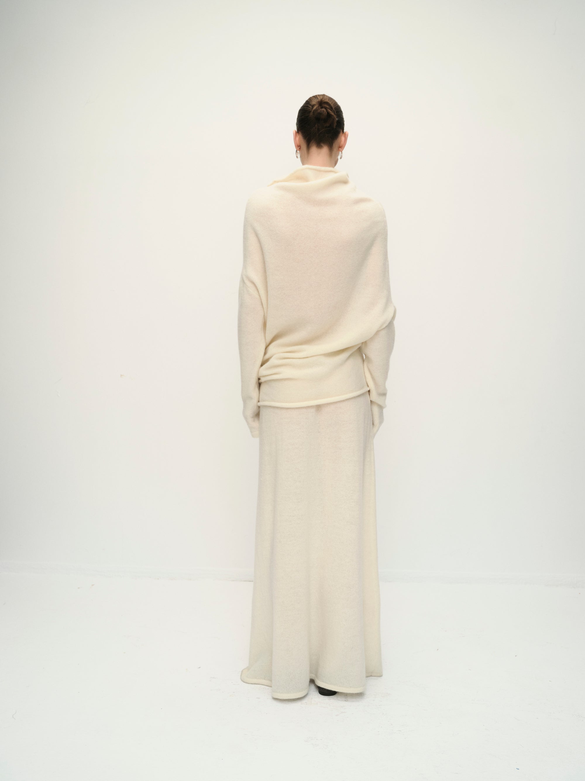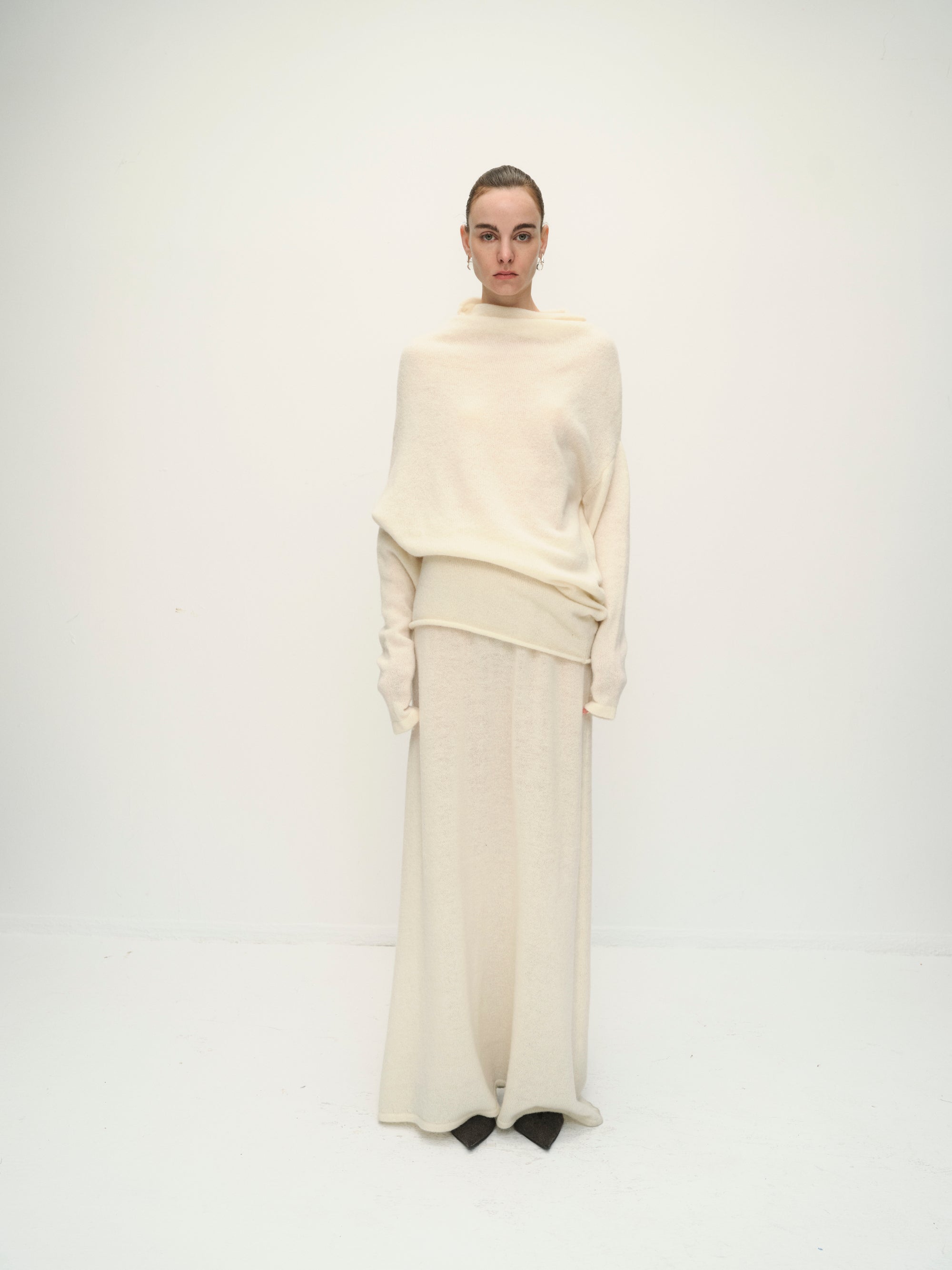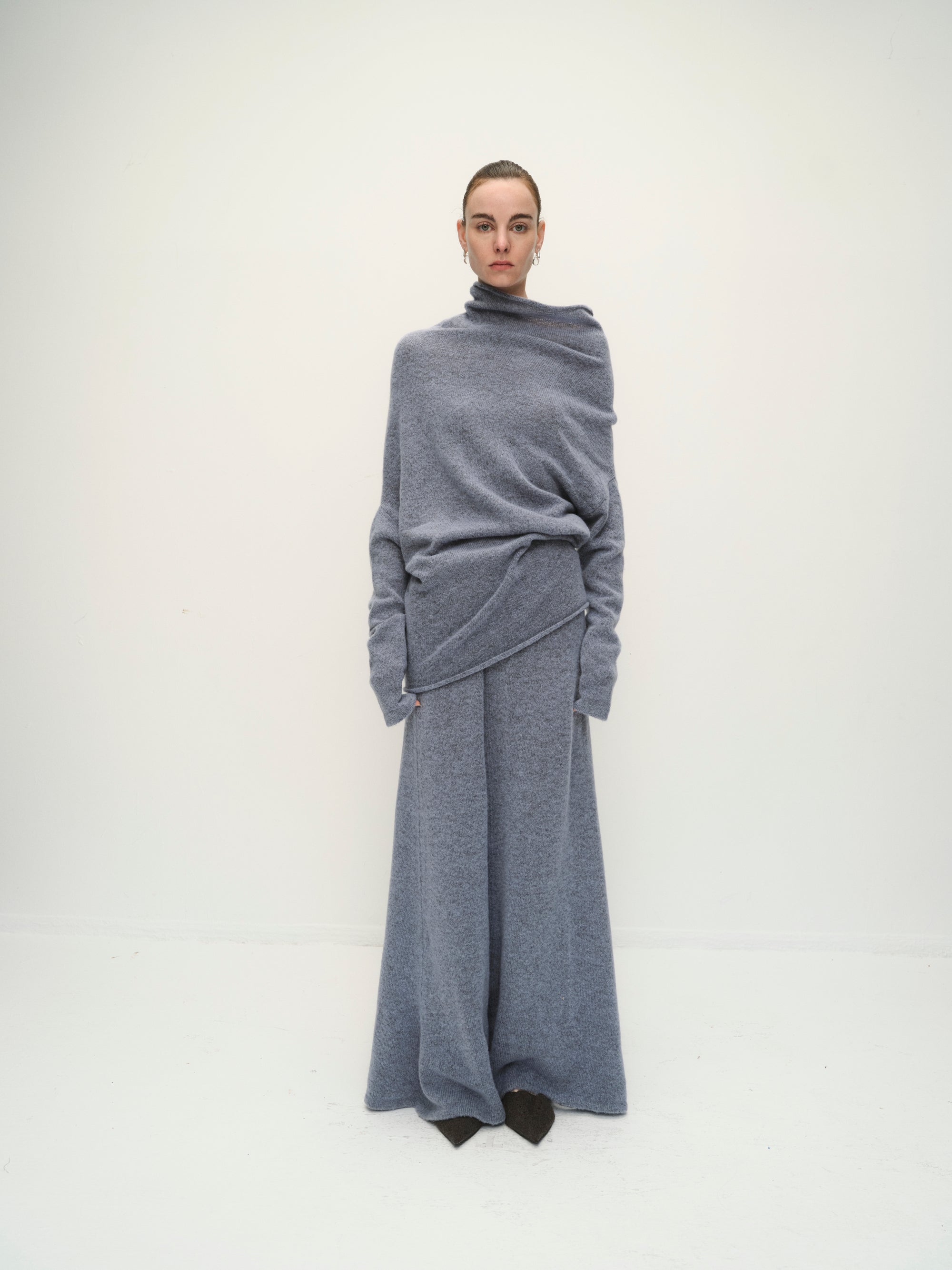 A soft wool knit with a relaxed, flowy silhouette, designed for comfort and elegance. The collar is slightly oversized and is worn skewed, adding subtle structure without losing its refi...