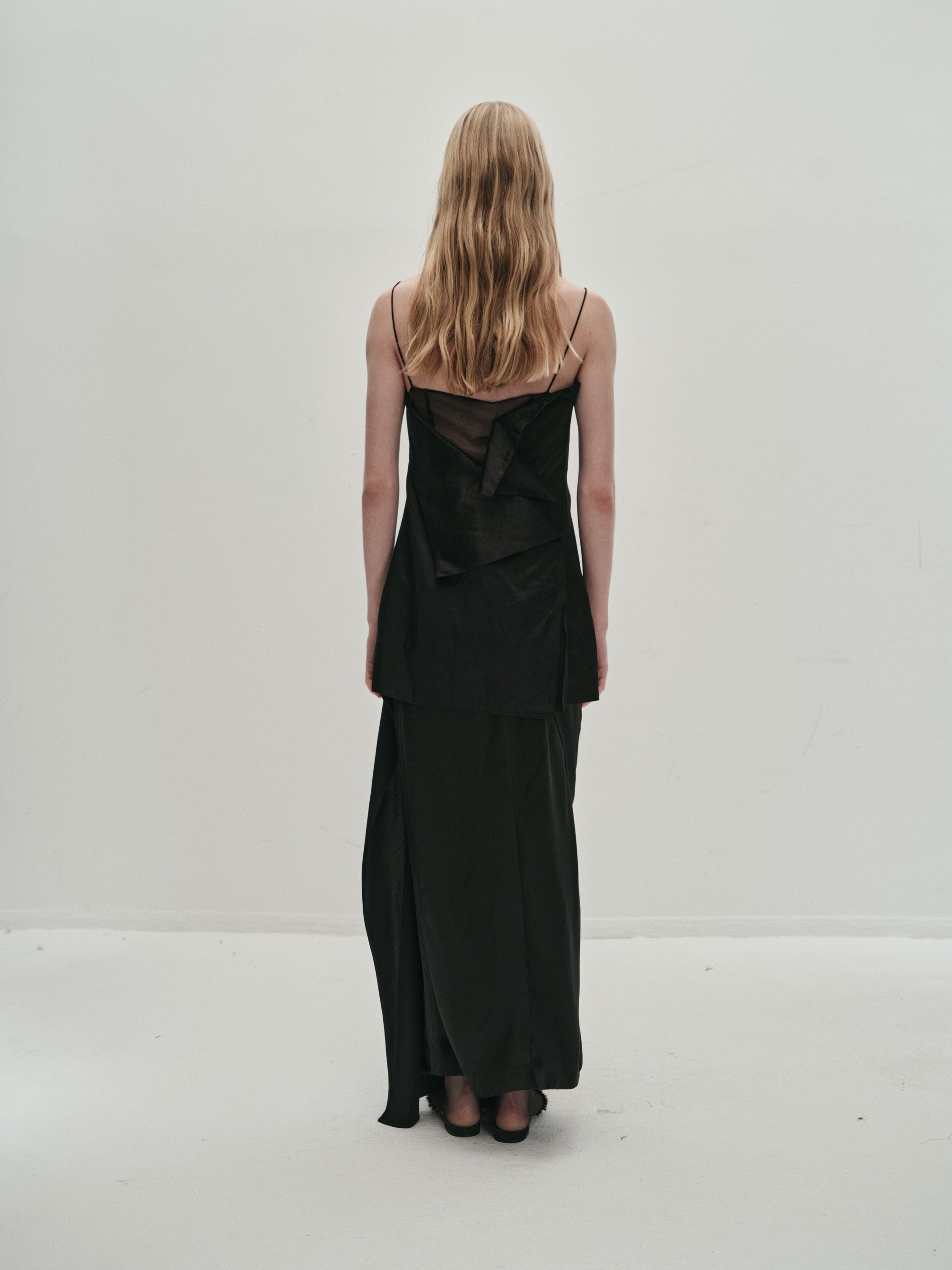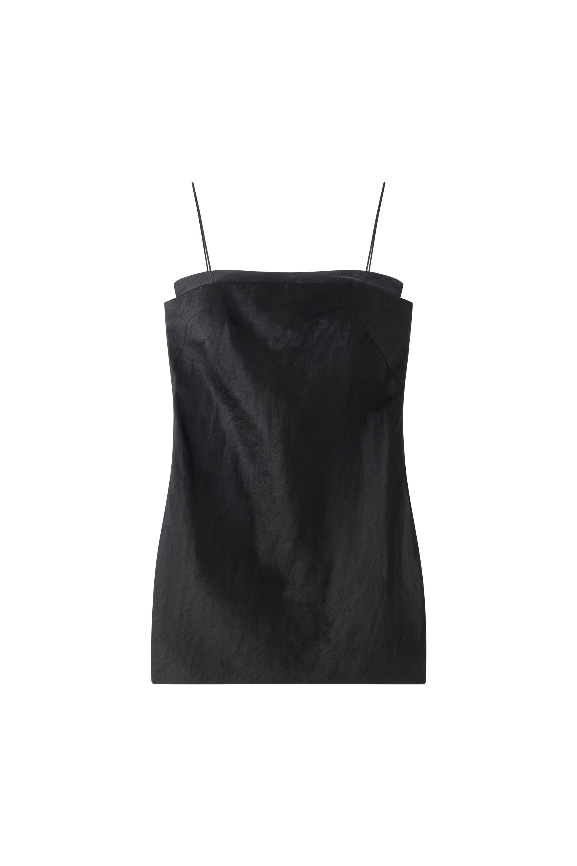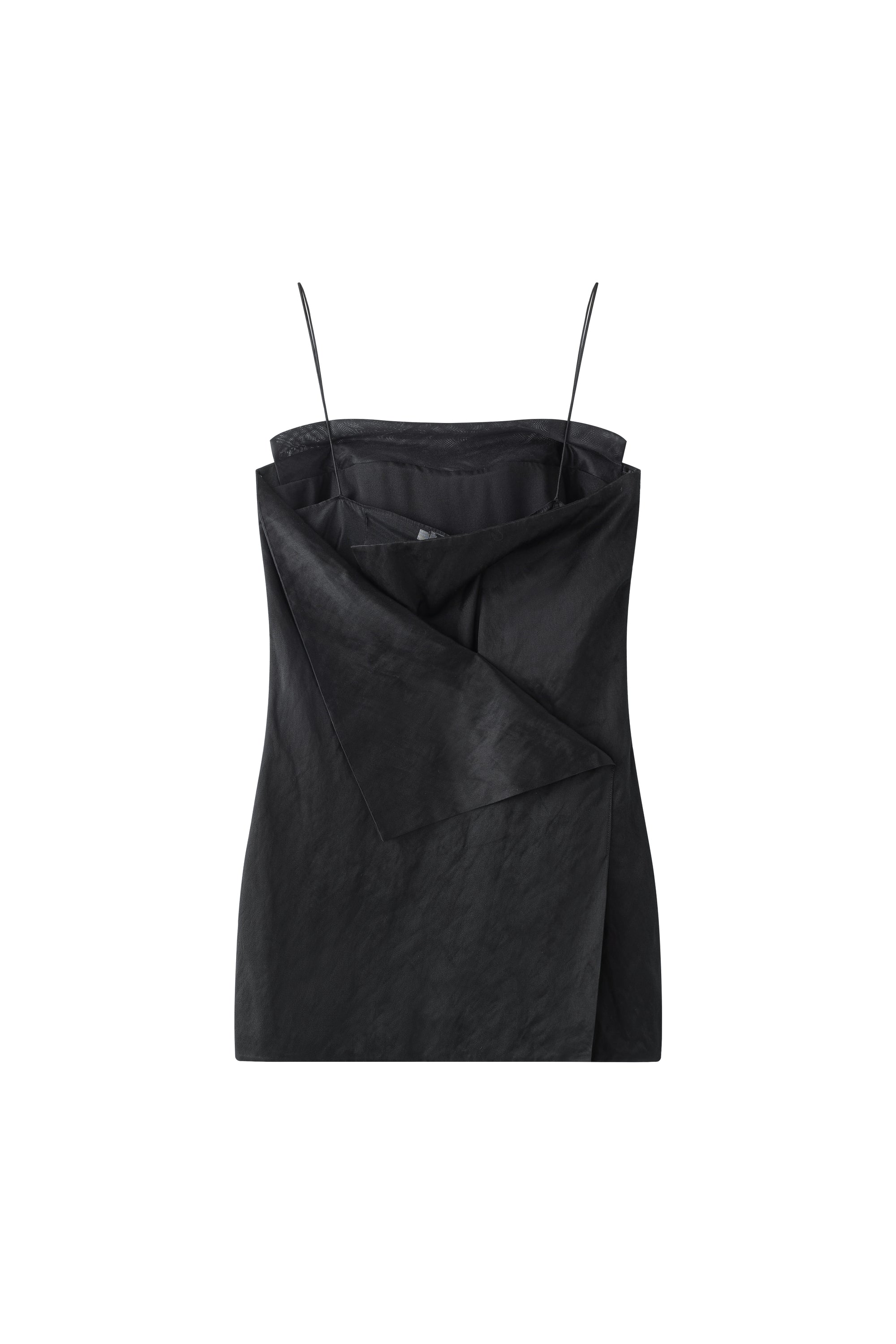 Satin-finish crinkled top with spaghetti straps. Two large flaps at the bottom center. Sheer upper back.