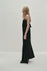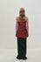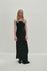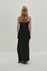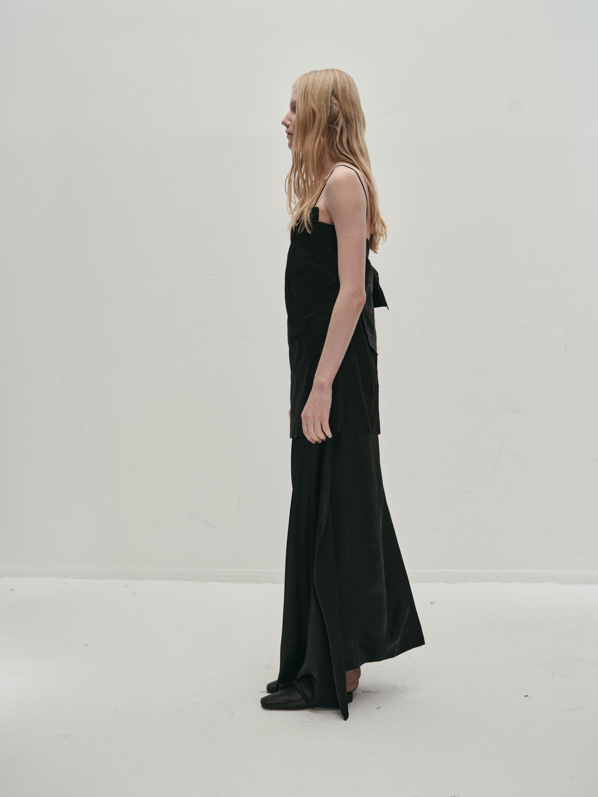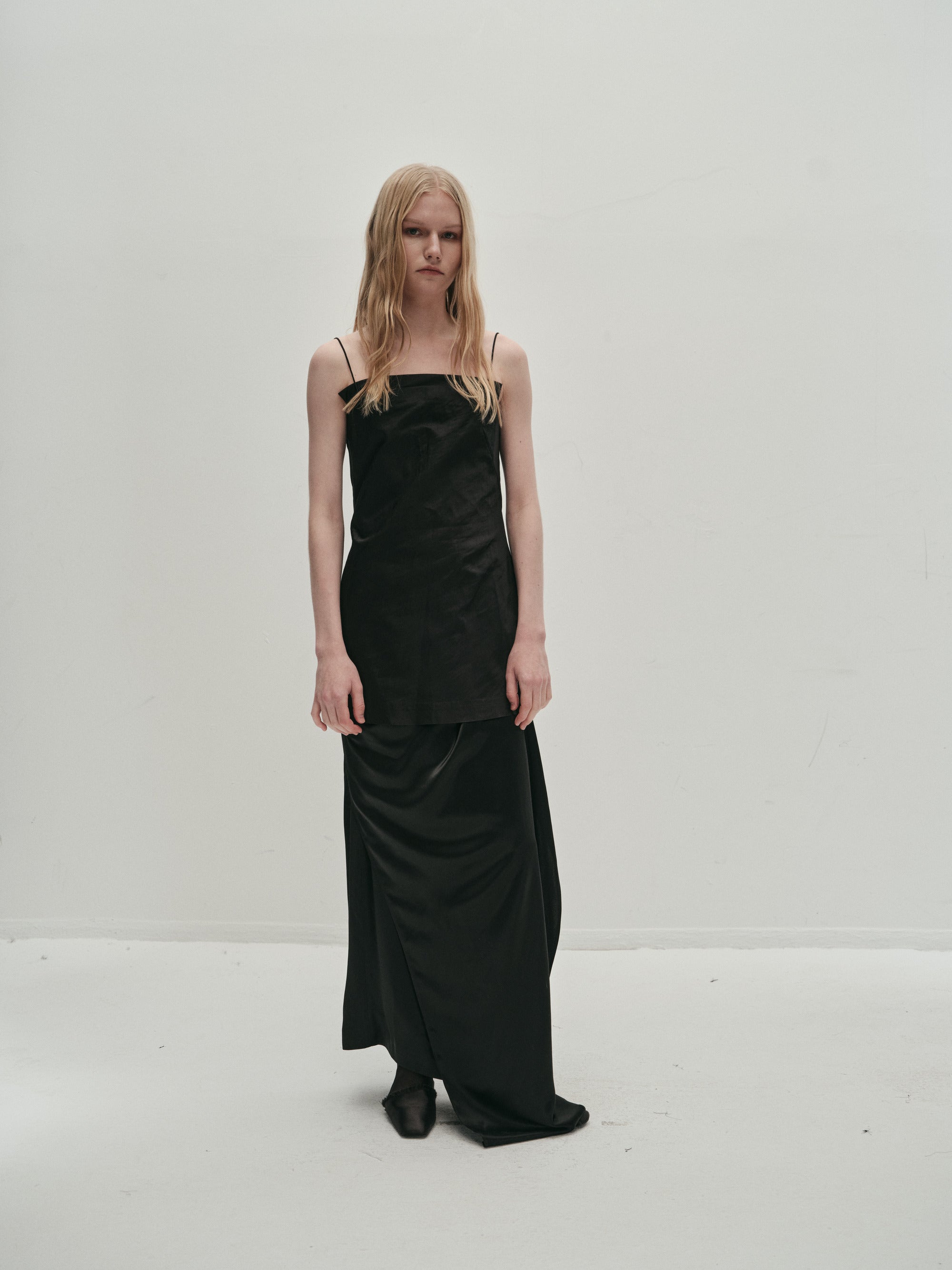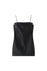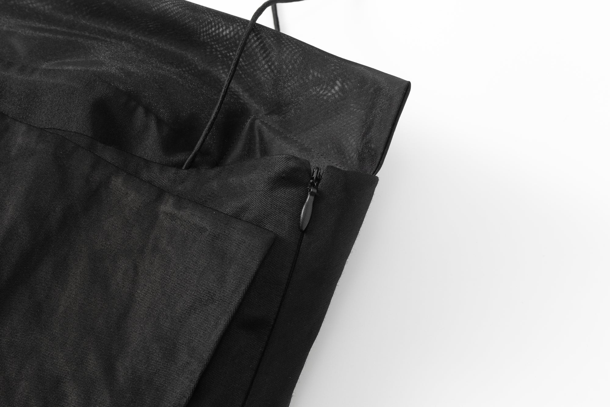 Satin-finish crinkled top with spaghetti straps. Two large flaps at the bottom center. Sheer upper back.
